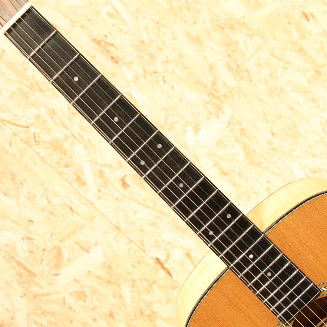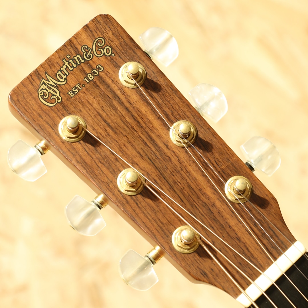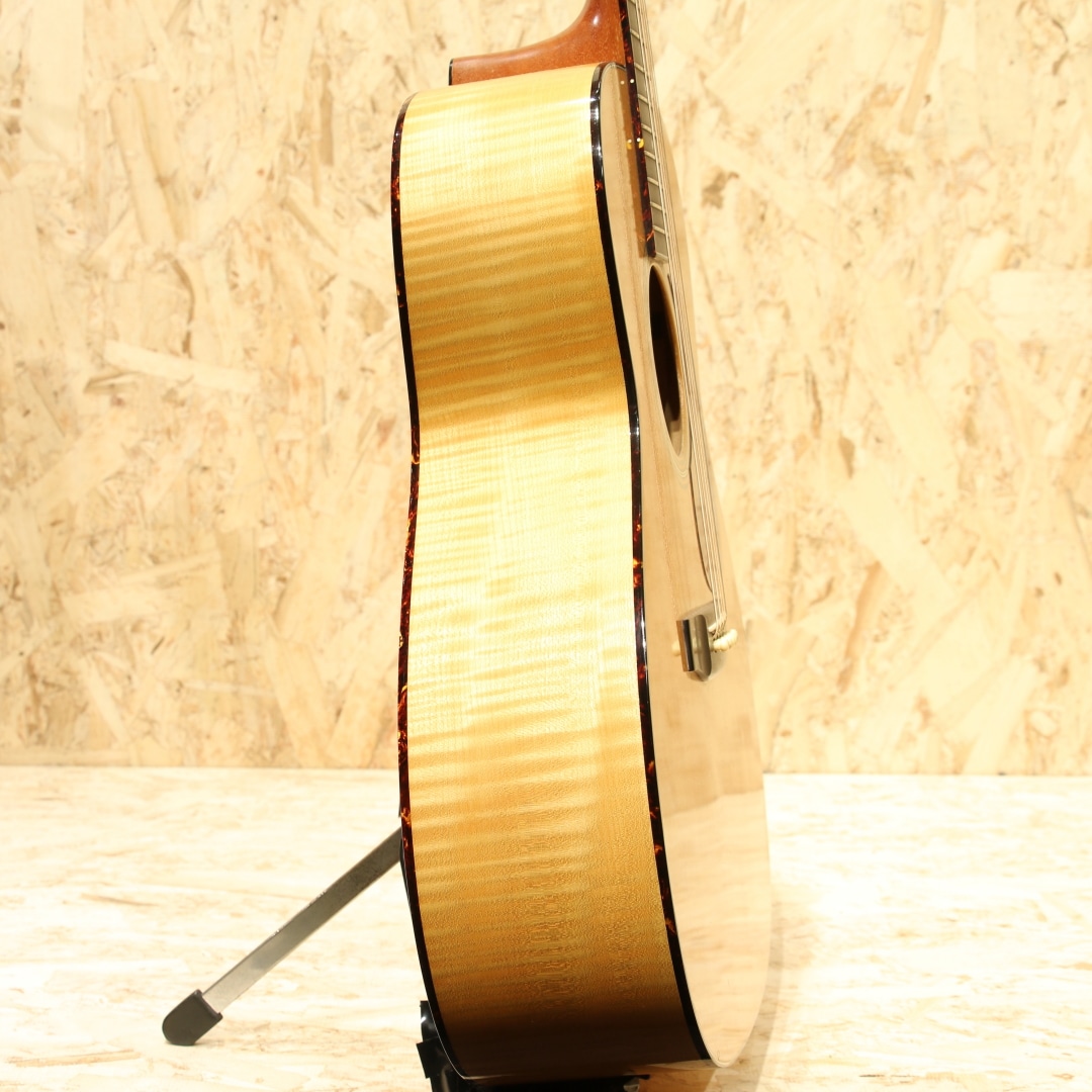 1985年に発表された、マーチン社の中では比較的新しいボディシェイプ"J(ジャンボ)"。本器はメイプルをサイドバックに使用した”J-65M”。1988年製USED品です。シトカスプルーストップ、フレイムメイプルサイド&バック、マホガニーネック、エボニー指板&ブリッジ、べっ甲柄ボディ&指板バインディング、シャーラーゴールドペグパーロイドつまみ、ドット指板インレイ、べっ甲柄ピックガード、モザイクバックストリップ、スキャロップドXブレイシング。1977年に発売された”M(OOOO)”サイズ、OOOを一回り大きくしたようなシェイプ。元を辿ると1930年代に作られていたアーチトップモデルのF-7とF-9をフラットトップへコンバージョンし、ロングスケールへとする改造から生まれた経緯を持ちます。その後1985年にMサイズを基にしてボディ厚をDサイズと同等にしたのが”J”です。当時のJサイズのレギュラーラインナップ上の最上位はJ-65M。製造期間はおよそ10年程と少ない本数の製造のみでラインナップから消えてしまったモデルとなります。基となったMシェイプが優秀だったこともあり、本モデルも厚みが増えたとしても抱え易さは健在です。ドレッドに比べてくびれが深く、肩に負荷が掛かりにくい形状。それでも厚みはしっかりとあるので深い響きを生み出してくれます。サウンドもドレッドより若干引き締まったトーン、OOOよりもレンジ感が広く迫力のある低音感を体感することが出来ます。サウンドバランスはOOO寄りで整った響きを感じやすく、DとOOOの特徴をミックスしたかのようなトーン。メイプルのフラットな特性と甘さを感じさせる音色も合わさり、演奏者のタッチに合わせてトーンが変わる1本。ダークに、はたまた快活に、そしてメロウに、弾きごたえのある1本と言えるでしょう。意外と見かけないものの、優秀さを隠し持っているダークホース。ボディトップ面両くびれとバック面1弦側くびれ箇所にバインディング剥がれの修正跡が見られるモノの、丁寧に作業がされており使用する上で問題はありません。ピックガードの薄い弾きキズ、ボディトップ面に細々とした薄い当てキズ、ボディバック面のバックルキズのような擦れキズやボディサイド6弦側のくびれ付近の爪が当たったような当てキズなど若干の使用感は見られますが、40年近くを経た個体としてはキレイな状態をキープされている個体。トラスロッドは若干硬めの手応えですがまだ回り、サドルの削り代も残した状態。ネックの状態は良好にキープされた1本です。意外と出物の少ないマーチン”J”、オールマイティに使えるポテンシャルを与えられたモデル。80年代の新たな挑戦を行っていた頃に生み出された意欲作です。マーチンではあまり見られないメイプルを使用した作風もその一環、珍しい仕様、サイズのギターです。是非一度お試し下さいませ。