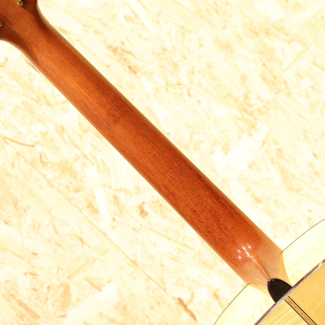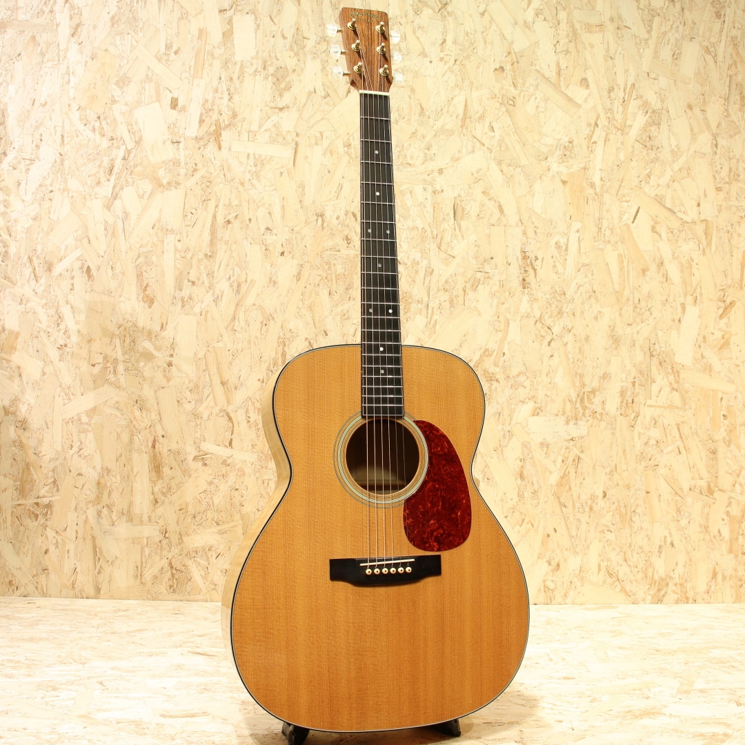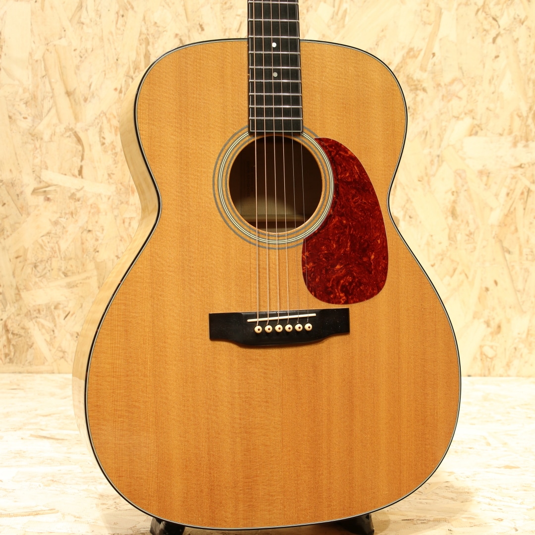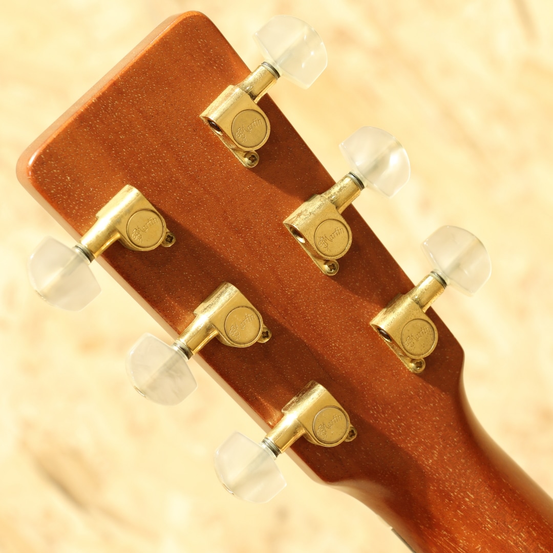 1985年に発表された、マーチン社の中では比較的新しいボディシェイプ"J(ジャンボ)"。本器はメイプルをサイドバックに使用した”J-65M”。1988年製USED品です。シトカスプルーストップ、フレイムメイプルサイド&バック、マホガニーネック、エボニー指板&ブリッジ、べっ甲柄ボディ&指板バインディング、シャーラーゴールドペグパーロイドつまみ、ドット指板インレイ、べっ甲柄ピックガード、モザイクバックストリップ、スキャロップドXブレイシング。1977年に発売された”M(OOOO)”サイズ、OOOを一回り大きくしたようなシェイプ。元を辿ると1930年代に作られていたアーチトップモデルのF-7とF-9をフラットトップへコンバージョンし、ロングスケールへとする改造から生まれた経緯を持ちます。その後1985年にMサイズを基にしてボディ厚をDサイズと同等にしたのが”J”です。当時のJサイズのレギュラーラインナップ上の最上位はJ-65M。製造期間はおよそ10年程と少ない本数の製造のみでラインナップから消えてしまったモデルとなります。基となったMシェイプが優秀だったこともあり、本モデルも厚みが増えたとしても抱え易さは健在です。ドレッドに比べてくびれが深く、肩に負荷が掛かりにくい形状。それでも厚みはしっかりとあるので深い響きを生み出してくれます。サウンドもドレッドより若干引き締まったトーン、OOOよりもレンジ感が広く迫力のある低音感を体感することが出来ます。サウンドバランスはOOO寄りで整った響きを感じやすく、DとOOOの特徴をミックスしたかのようなトーン。メイプルのフラットな特性と甘さを感じさせる音色も合わさり、演奏者のタッチに合わせてトーンが変わる1本。ダークに、はたまた快活に、そしてメロウに、弾きごたえのある1本と言えるでしょう。意外と見かけないものの、優秀さを隠し持っているダークホース。ボディトップ面両くびれとバック面1弦側くびれ箇所にバインディング剥がれの修正跡が見られるモノの、丁寧に作業がされており使用する上で問題はありません。ピックガードの薄い弾きキズ、ボディトップ面に細々とした薄い当てキズ、ボディバック面のバックルキズのような擦れキズやボディサイド6弦側のくびれ付近の爪が当たったような当てキズなど若干の使用感は見られますが、40年近くを経た個体としてはキレイな状態をキープされている個体。トラスロッドは若干硬めの手応えですがまだ回り、サドルの削り代も残した状態。ネックの状態は良好にキープされた1本です。意外と出物の少ないマーチン”J”、オールマイティに使えるポテンシャルを与えられたモデル。80年代の新たな挑戦を行っていた頃に生み出された意欲作です。マーチンではあまり見られないメイプルを使用した作風もその一環、珍しい仕様、サイズのギターです。是非一度お試し下さいませ。