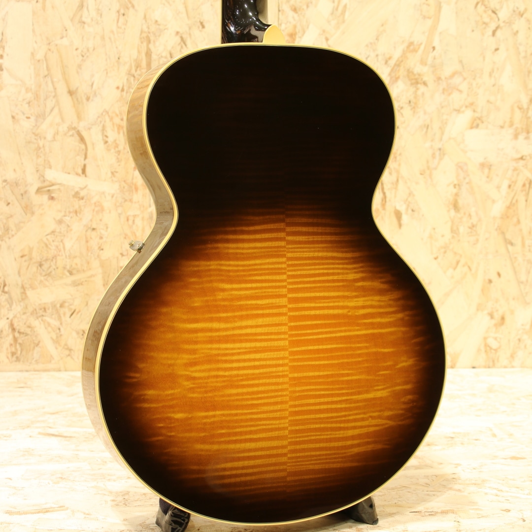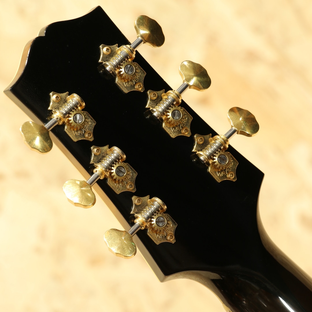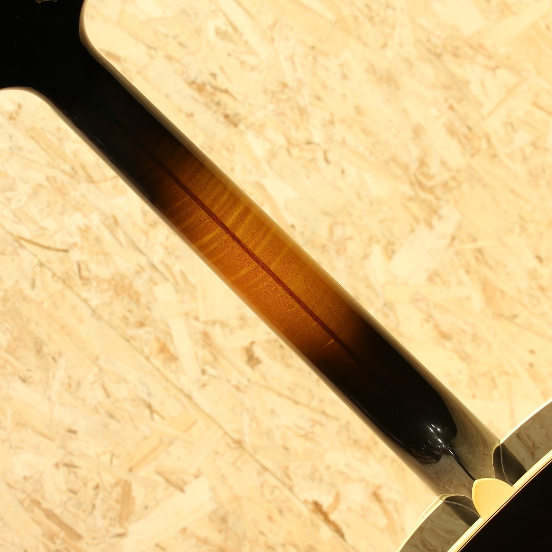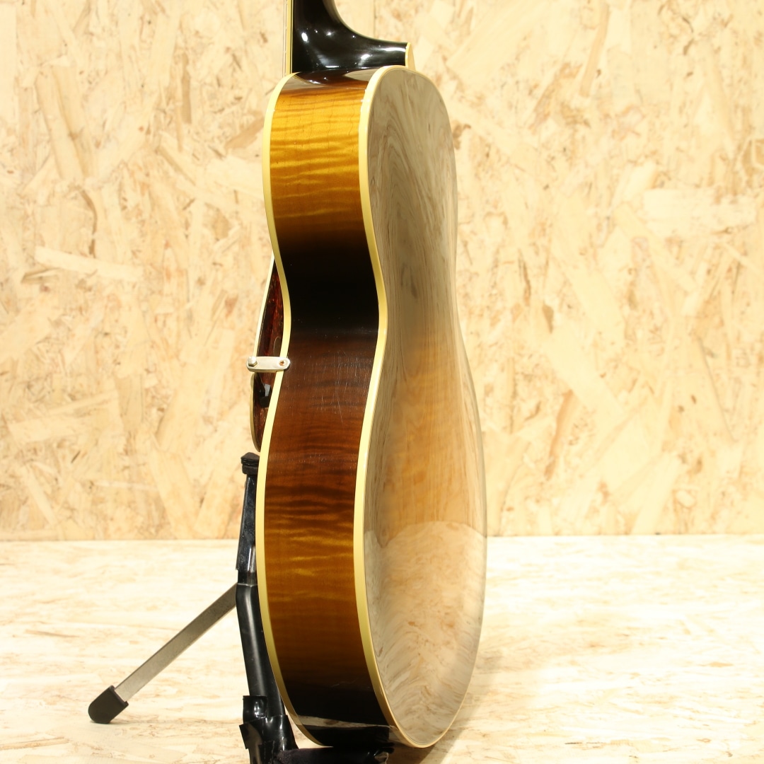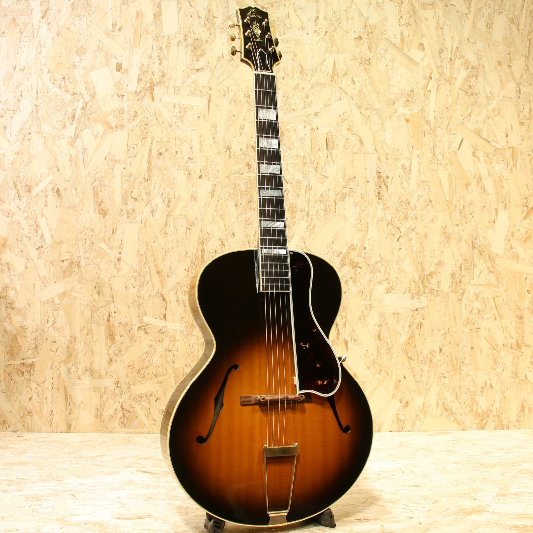 今でこそフラットトップの印象が強いですが元々はアーチトップギターやマンドリン、バンジョー等を製作するところから始まっているギブソン。その中でもL-5は1922年から製作されており、当時の最上位機種として君臨していたモデルとなります。その後1934年にはSuper400が発売されたことで最上位の地位は譲りますが、依然上位機種として構えていたモデルとなります。現在では17インチのピックアップ付きのモデルの方を目にする機会の方が多いですが、発売当初は16インチで製作が行われていました。本器はその1934年仕様で製作が行われた”1934 L-5”。1995年製USED品。16インチボディ、スプルーストップ、カーリーメイプルサイド&バック、左右にメイプル&センターにローズウッドを挟んだ3Pネック、エボニー指板、ローズウッドブリッジ、ブロック指板、3プライボディバインディング、3プライバインディング付きべっ甲柄ピックガード、ウェバリーゴールドチューナー、ナット幅約45ミリ、オリジナルナット。元々ギブソンアーチトップは楕円形のオーバルホールから始まっていますが、ロイドロア―によってこのL-5は世に生み出されました。マンドリンにバイオリンのデザインを取り入れたF-5、その後アーチトップにも採用すべくチェロのデザインをギターに落とし込んだ設計。Fホール、14Fジョイント、16インチボディとしたその設計は、ギブソンアーチトップの基礎にまで昇華された秀逸なデザインでした。L-5は1934年頃に17インチへと仕様変更されますが、本器はその直前である16インチの最終期を参考としたリイシュー。当時ナッシュビルのカスタムショップにて製作が行われた1本です。30年代程のVシェイプや太さのあるグリップではなく、比較的丸みの強いCシェイプグリップ。ナット幅に反して握り込んだグリップにも不便しないグリップとなっています。クラシカルなルックスと現代的な操作性を両立させたハイブリッド仕様です。アーチトップ特有のガランとしたトーン、プレーン弦を強く弾いた際のかすれるようなハスキーな音色、刻む際の金属的な響き。もたつく低音は無く弦の輪郭の聴こえやすい音作り、艶感のあるクリスピーなトーンを響かせてくれます。ノスタルジックな雰囲気を感じさせる音色、アーチトップ特有の魅力を存分に体感できる1本です。ピックガードが内側から反応しているのかクラックが見られ、その付近には拭くと取れるモヤのようなものが見られます。拭いた跡しばらくすると再度発生しますが、ヴィンテージギターのピックガードでも同様の症状はしばしば見られます。ヘッドバインディングに沿ってウェザーチェックが入っているものの、全体を通して使用感は非常に少なく、極最近作られたモノと錯覚するほどキレイな状態をキープ。ネックコンディションも良し、ブリッジの上げ下げ幅も充分と、使用する上で憂いの無い状態の極上USED品です。古き良きギブソンアーチトップの流れを汲む近年リイシューモデル。トラッドなスタイルを求める方にはうってつけの1本です。是非お手元でご体感下さいませ。汎用ボブレン製のハードケースが付属します。