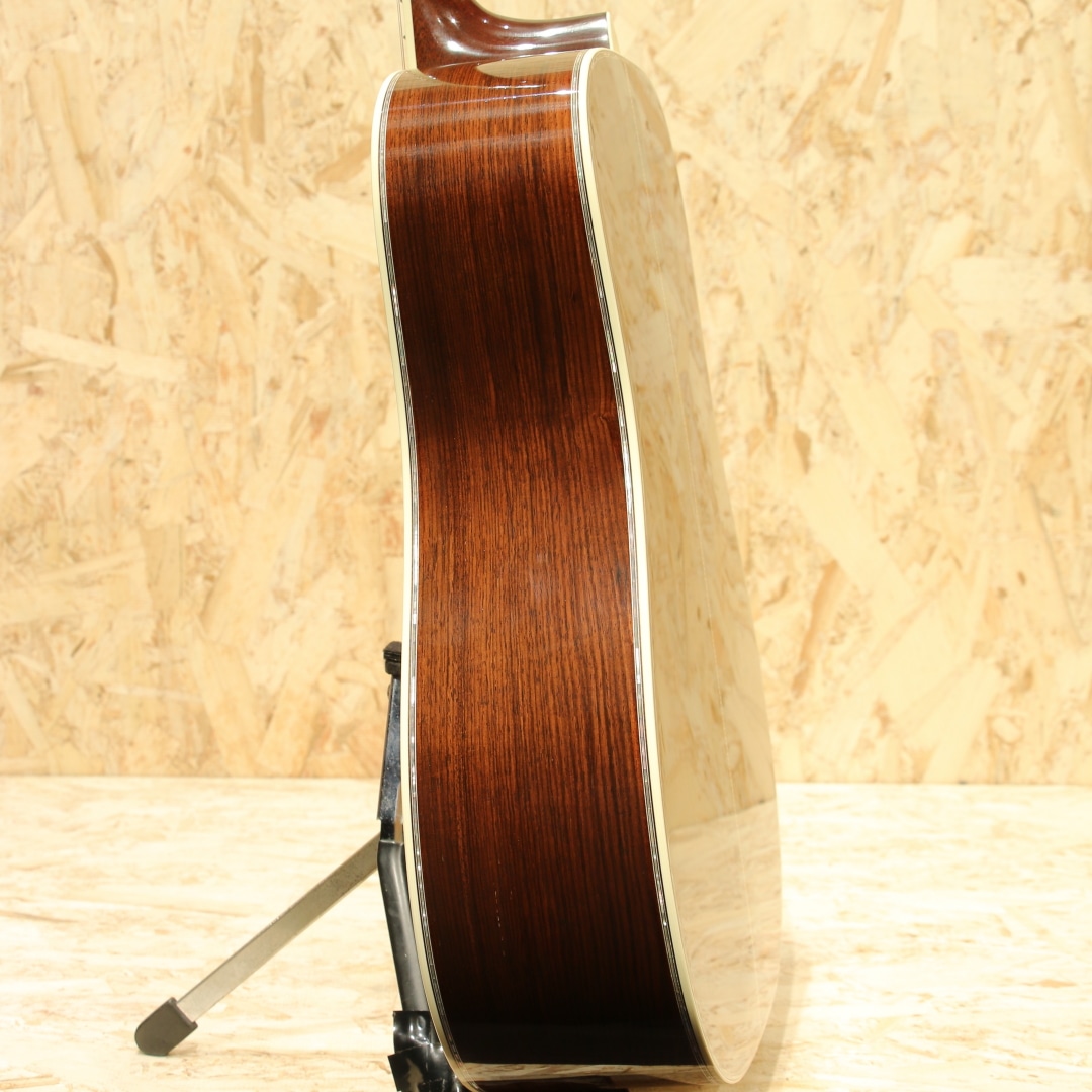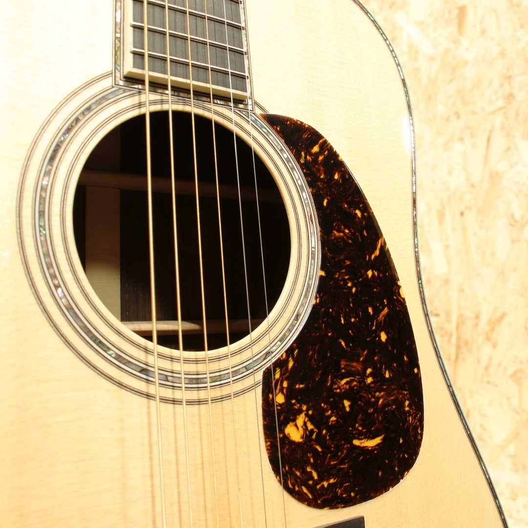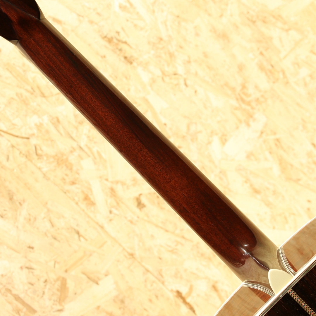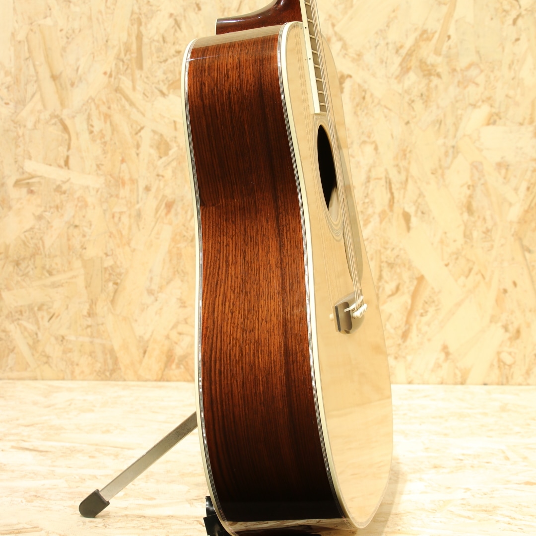 四国/愛媛はエム・シオザキ弦楽器工房の塩崎雅亮氏。日本におけるビンテージギター研究家・製作家の先駆け的存在とも呼べる巨匠ながら、今なおその研究熱心な姿勢に陰りを見せない進化する国内有数・ベテランルシアー。これまであらゆる年代の特徴を忠実に再現したMartin Guitarレプリカの製作や、自身の解釈や発展を大きく取り入れたオリジナルモデルの製作など多岐にわたえる作品を産み出しています。本器は、1968年製スタイル45のサウンドにフォーカスしながら、外観を1938年製スタイルに仕上げたユニークな1本、”D-5 1968/1938Style“。トップには杢目揺らめく目幅の詰まった極上のマスターグレードジャーマンスプルース、サイド&バックには濃淡美しくセンターにしっかりと柾目を拝した極上アマゾンローズウッドを使用。ホンジュラス・マホガニー・ネック、スクエアネックロッド、エボニー指板&ブリッジ、ロングサドル、Waverly4060Gペグ、アマゾンローズウッド天神板/アバロントーチインレイ、スノウフレイクス指板インレイ、塗り込みべっ甲柄セルロイドピックガード、メキシコ貝&日本アワビの45スタイル・ロゼッタ&トリム、アイボロイド・バインディング、モザイクバックストリップ、ニカワ接着。ノンスキャロップドXブレイシングや14度ヘッド角、42.9mmナット幅、スクエアロッドなど、サウンドは68年仕様を狙いながら、プリウォー45の外観を盛り込んだユニークな逸品。芯がありキレのある骨太なノンスキャサウンド。レンジ感が広く、透明度の高いきらびやかな響きは、まさにあの頃の音色。ゴスンと楽器全体で響きながらもたつきのない輪郭を帯びたトーンは、インドローズでは味わえない極上サウンドです。淡いヘッド角から得られるこの時期ならではのテンション感とサスティンは、他のどのモデルとも異なる唯一無二で、ビンテージを知り尽くした塩崎氏でしか体現できない夢の融合モデルです。爪弾けば軽やかに美しく、掻き鳴らせば迫力に轟く。ドレッドに求められる魅力を存分に詰め込んだ1本に仕上がっています。68年仕様の構造を持ちながら38年式の外観をまとった逸品。是非お手元でご体感ください。