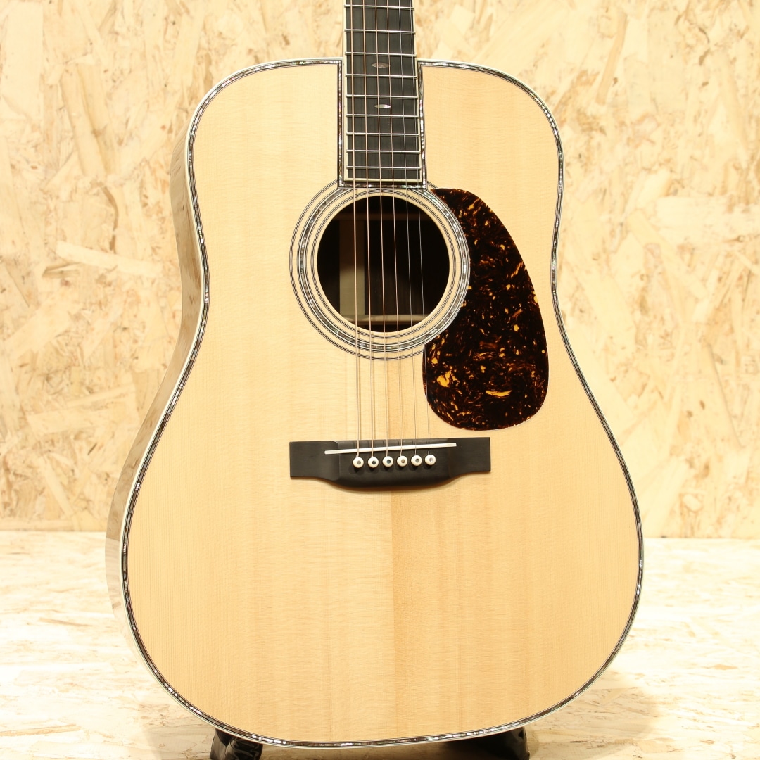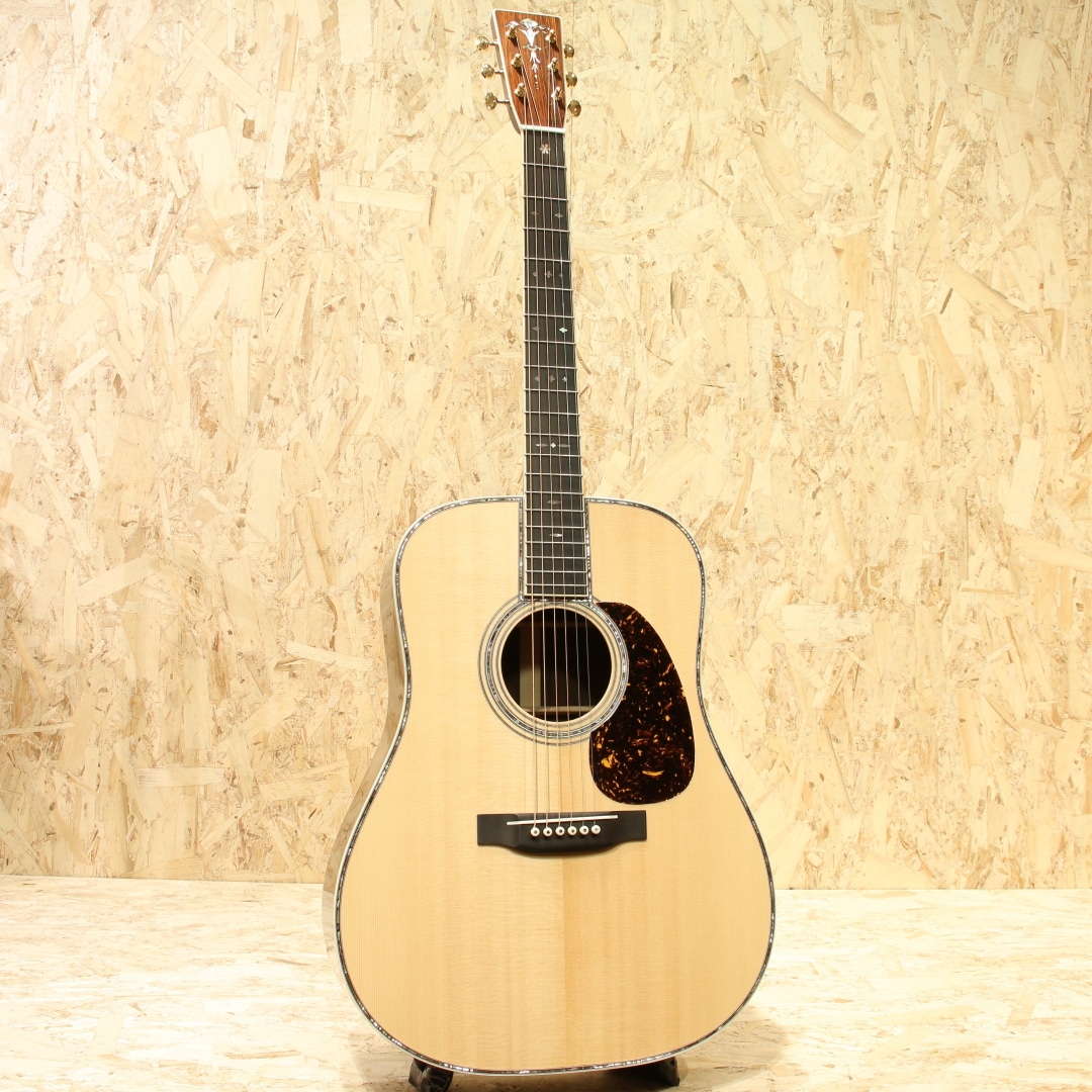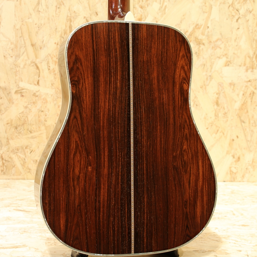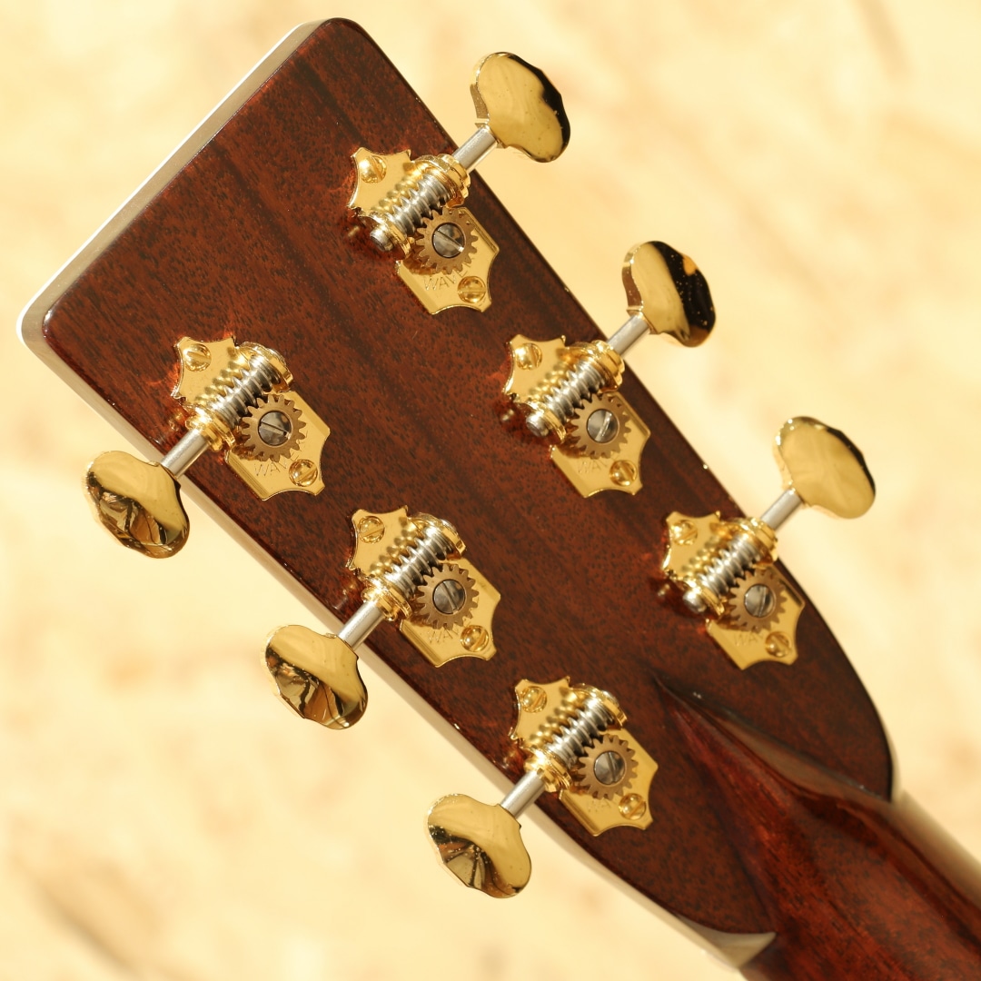 四国/愛媛はエム・シオザキ弦楽器工房の塩崎雅亮氏。日本におけるビンテージギター研究家・製作家の先駆け的存在とも呼べる巨匠ながら、今なおその研究熱心な姿勢に陰りを見せない進化する国内有数・ベテランルシアー。これまであらゆる年代の特徴を忠実に再現したMartin Guitarレプリカの製作や、自身の解釈や発展を大きく取り入れたオリジナルモデルの製作など多岐にわたえる作品を産み出しています。本器は、1968年製スタイル45のサウンドにフォーカスしながら、外観を1938年製スタイルに仕上げたユニークな1本、”D-5 1968/1938Style“。トップには杢目揺らめく目幅の詰まった極上のマスターグレードジャーマンスプルース、サイド&バックには濃淡美しくセンターにしっかりと柾目を拝した極上アマゾンローズウッドを使用。ホンジュラス・マホガニー・ネック、スクエアネックロッド、エボニー指板&ブリッジ、ロングサドル、Waverly4060Gペグ、アマゾンローズウッド天神板/アバロントーチインレイ、スノウフレイクス指板インレイ、塗り込みべっ甲柄セルロイドピックガード、メキシコ貝&日本アワビの45スタイル・ロゼッタ&トリム、アイボロイド・バインディング、モザイクバックストリップ、ニカワ接着。ノンスキャロップドXブレイシングや14度ヘッド角、42.9mmナット幅、スクエアロッドなど、サウンドは68年仕様を狙いながら、プリウォー45の外観を盛り込んだユニークな逸品。芯がありキレのある骨太なノンスキャサウンド。レンジ感が広く、透明度の高いきらびやかな響きは、まさにあの頃の音色。ゴスンと楽器全体で響きながらもたつきのない輪郭を帯びたトーンは、インドローズでは味わえない極上サウンドです。淡いヘッド角から得られるこの時期ならではのテンション感とサスティンは、他のどのモデルとも異なる唯一無二で、ビンテージを知り尽くした塩崎氏でしか体現できない夢の融合モデルです。爪弾けば軽やかに美しく、掻き鳴らせば迫力に轟く。ドレッドに求められる魅力を存分に詰め込んだ1本に仕上がっています。68年仕様の構造を持ちながら38年式の外観をまとった逸品。是非お手元でご体感ください。
