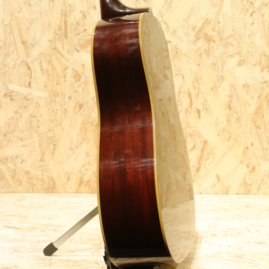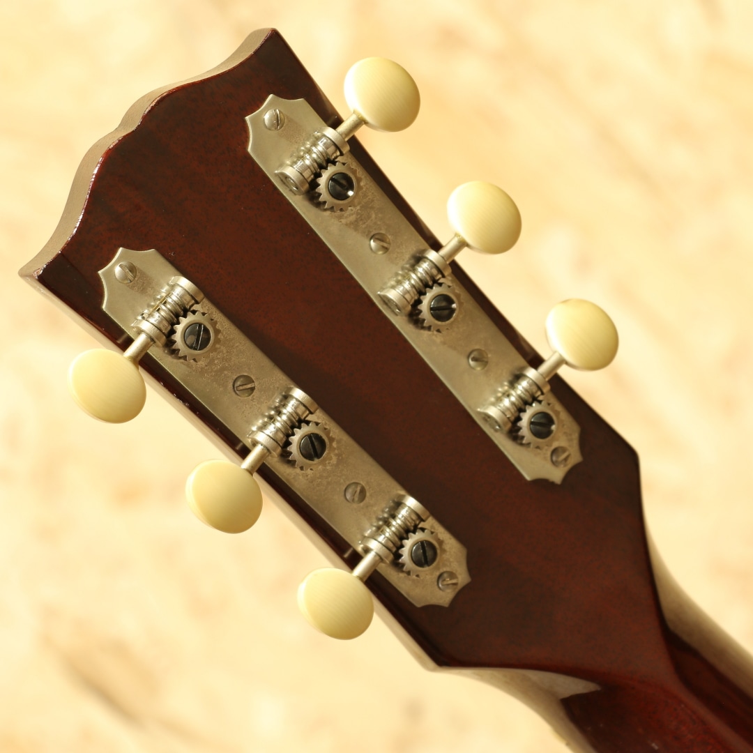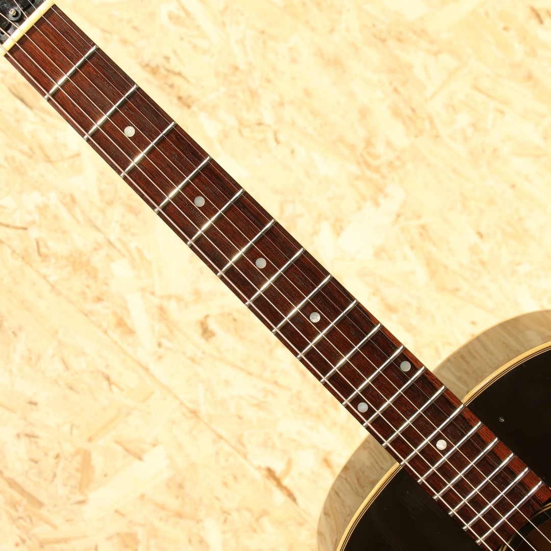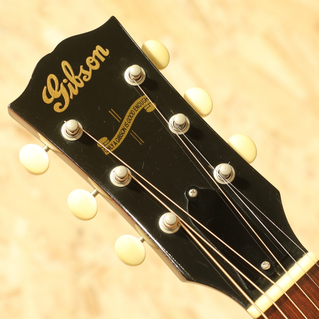 世界中のミュージシャンが愛用するギブソンフラットトップの銘器、"J-45"。発売当時からの伝統的なスタイルを踏襲しながら、時代ごとのニーズに合わせた仕様変更を繰り返し製造を続けています。本器は初年度の1942年J-45を忠実に復刻した、当時のカスタムショップ製ヒストリックコレクション”HC 1942 J-45”。2006年製のUSED品です。アディロンダックレッドスプルーストップ、ホンジュラスマホガニーサイド&バック、マダガスカルローズウッド指板&レクタングルブリッジ、ロングサドル、ワンピースホンジュラスマホガニーネック、塗り込みファイアストライプピックガード、スクリプト&バナーロゴ、チューナーはこのモデルのために用意された特別なスキャロップドベースプレートのオープンギア三連タイプ、先端へ向かって高さがテーパー状になっているXブレイシング。材料はモンタナギブソンのレジェンドルシアー"レン・ファーガソン"が直接ハンドピックしたものが使われています。40年代でも初期を象徴とするスクリプトロゴやバナーロゴ、スキャロップされたベースプレートのオープンギア3連ペグ。40年代のベースボールバットとも称される太いネックを再現し、このグリップでしか出し得ないサウンドを生み出しています。更にはブレイシングまで拘り、ニカワ接着、力木の幅、高さ、形状、これらを手作業でリアルに復刻。現行品と比べてかなり薄く、当時の形状に近しく仕上げられています。何よりもスキャロップではなくノンスキャロップとも言い難い、高さがテーパーになっている形状、通常のラインで作っていない形状の為これだけでも拘り様が窺えます。フィニッシュには当時としては特殊なコンパウンド材を使い、できるだけ薄くマットな仕上がりに。それらの効果なのか、近年のレギュラーJ45とは明らかに異なり、輪郭感のある響きとラウドなサウンド。タイトさのある輪郭と箱で増幅されるふくよかなトーン。太く面で響くような感覚なのにしっかりと弦の音が聞こえる、あの響きに近しいサウンド。ボリューム感もあり音圧のある響きには驚かされることでしょう。現行カスタムショップ製に比べて膨らみ感のある暴れる感覚はやや薄く、その分タイトでクリアなサウンドが出る辺りがポイント。四十年代サウンドに限りなく近づいた現代品、流通の少ない人気のヒストリックコレクションレプリカモデルです。ピックガード外周に経年による収縮の影響なのか一部塗り込みの塗装にウェザーチェックと塗装チップ跡、ボディトップ面サウンドホール6弦側に米粒大の当てキズ、1弦側ボトムに2か所程の小さな当てキズ、ボディ角の当てキズによる塗装欠け等見られますが、全体を通して使用感の少ない個体です。元より特殊なコンパウンドによって半艶に仕上げられているため、薄い擦れキズのようなものが全体に見られますが元々なのか後年入ったのか見分けがつかないほど自然に溶け込んでいます。ネックコンディションも整えられ、演奏する上で問題の無い状態。ロッドは若干締め気味ですが、サドルの高さは充分に稼げており好みによる調整も可能な状態です。フレットも充分残した演奏性良好な逸品。現行のカスタムショップ”1942 Banner J-45”の前身機種”J-45 Legend”、その更に前身機種に当たる再現モデル。何よりここまでの拘りを魅せるモデルはさほど多くありません。究極とも言える拘り、1942リイシューとして完成度の高いモデルです。お見逃しなく。