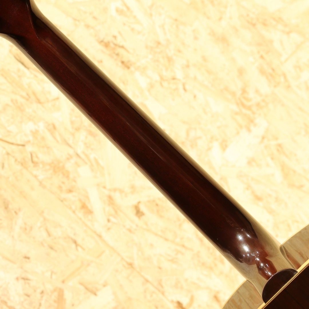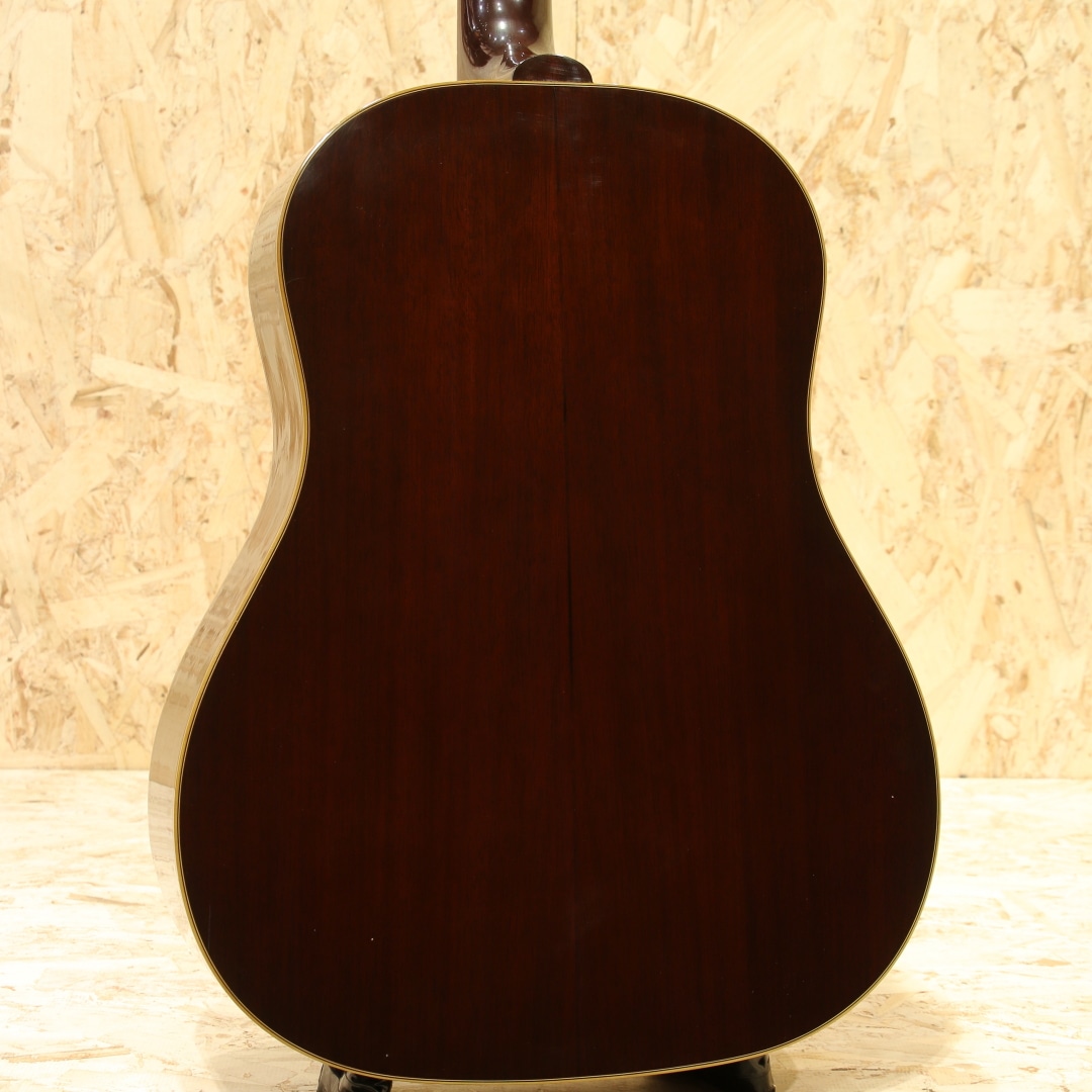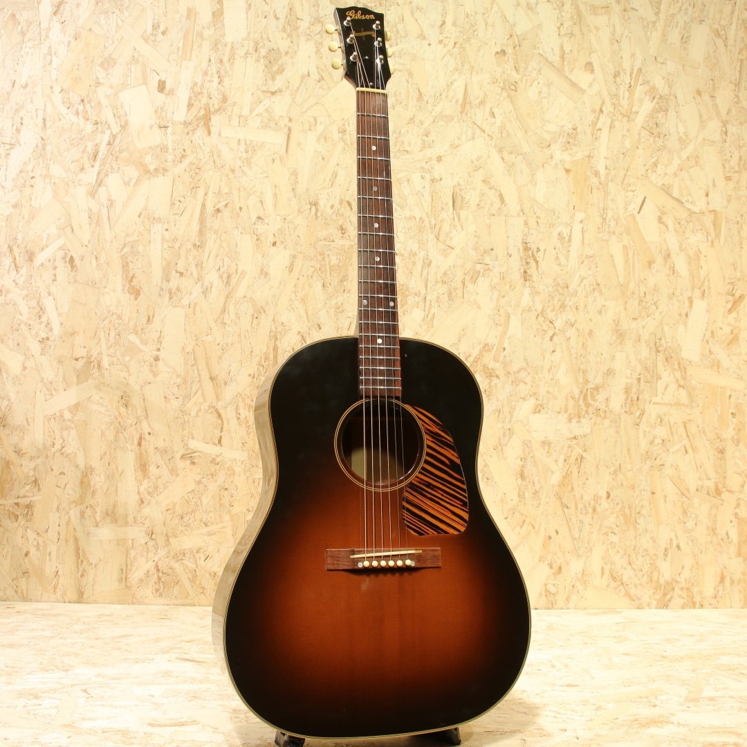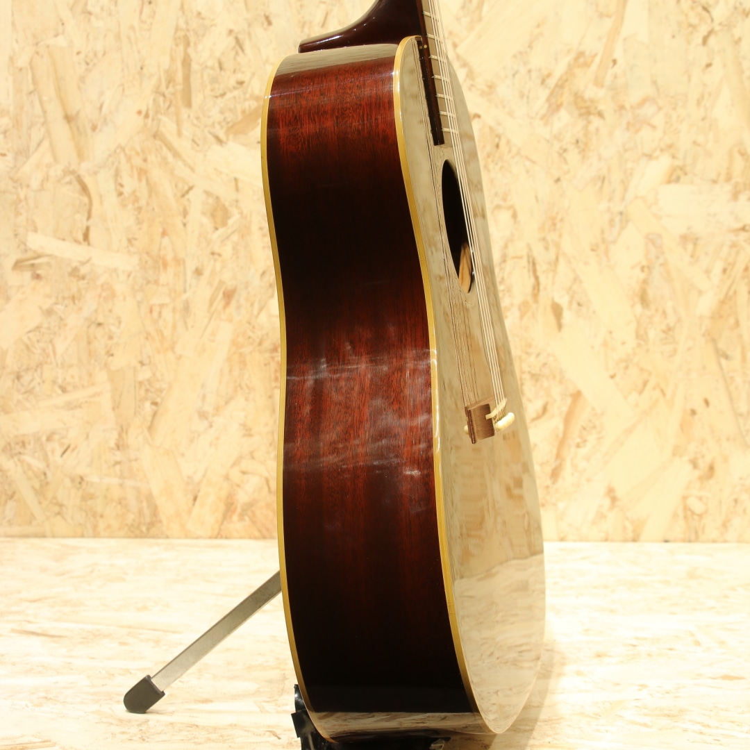 世界中のミュージシャンが愛用するギブソンフラットトップの銘器、"J-45"。発売当時からの伝統的なスタイルを踏襲しながら、時代ごとのニーズに合わせた仕様変更を繰り返し製造を続けています。本器は初年度の1942年J-45を忠実に復刻した、当時のカスタムショップ製ヒストリックコレクション”HC 1942 J-45”。2006年製のUSED品です。アディロンダックレッドスプルーストップ、ホンジュラスマホガニーサイド&バック、マダガスカルローズウッド指板&レクタングルブリッジ、ロングサドル、ワンピースホンジュラスマホガニーネック、塗り込みファイアストライプピックガード、スクリプト&バナーロゴ、チューナーはこのモデルのために用意された特別なスキャロップドベースプレートのオープンギア三連タイプ、先端へ向かって高さがテーパー状になっているXブレイシング。材料はモンタナギブソンのレジェンドルシアー"レン・ファーガソン"が直接ハンドピックしたものが使われています。40年代でも初期を象徴とするスクリプトロゴやバナーロゴ、スキャロップされたベースプレートのオープンギア3連ペグ。40年代のベースボールバットとも称される太いネックを再現し、このグリップでしか出し得ないサウンドを生み出しています。更にはブレイシングまで拘り、ニカワ接着、力木の幅、高さ、形状、これらを手作業でリアルに復刻。現行品と比べてかなり薄く、当時の形状に近しく仕上げられています。何よりもスキャロップではなくノンスキャロップとも言い難い、高さがテーパーになっている形状、通常のラインで作っていない形状の為これだけでも拘り様が窺えます。フィニッシュには当時としては特殊なコンパウンド材を使い、できるだけ薄くマットな仕上がりに。それらの効果なのか、近年のレギュラーJ45とは明らかに異なり、輪郭感のある響きとラウドなサウンド。タイトさのある輪郭と箱で増幅されるふくよかなトーン。太く面で響くような感覚なのにしっかりと弦の音が聞こえる、あの響きに近しいサウンド。ボリューム感もあり音圧のある響きには驚かされることでしょう。現行カスタムショップ製に比べて膨らみ感のある暴れる感覚はやや薄く、その分タイトでクリアなサウンドが出る辺りがポイント。四十年代サウンドに限りなく近づいた現代品、流通の少ない人気のヒストリックコレクションレプリカモデルです。ピックガード外周に経年による収縮の影響なのか一部塗り込みの塗装にウェザーチェックと塗装チップ跡、ボディトップ面サウンドホール6弦側に米粒大の当てキズ、1弦側ボトムに2か所程の小さな当てキズ、ボディ角の当てキズによる塗装欠け等見られますが、全体を通して使用感の少ない個体です。元より特殊なコンパウンドによって半艶に仕上げられているため、薄い擦れキズのようなものが全体に見られますが元々なのか後年入ったのか見分けがつかないほど自然に溶け込んでいます。ネックコンディションも整えられ、演奏する上で問題の無い状態。ロッドは若干締め気味ですが、サドルの高さは充分に稼げており好みによる調整も可能な状態です。フレットも充分残した演奏性良好な逸品。現行のカスタムショップ”1942 Banner J-45”の前身機種”J-45 Legend”、その更に前身機種に当たる再現モデル。何よりここまでの拘りを魅せるモデルはさほど多くありません。究極とも言える拘り、1942リイシューとして完成度の高いモデルです。お見逃しなく。