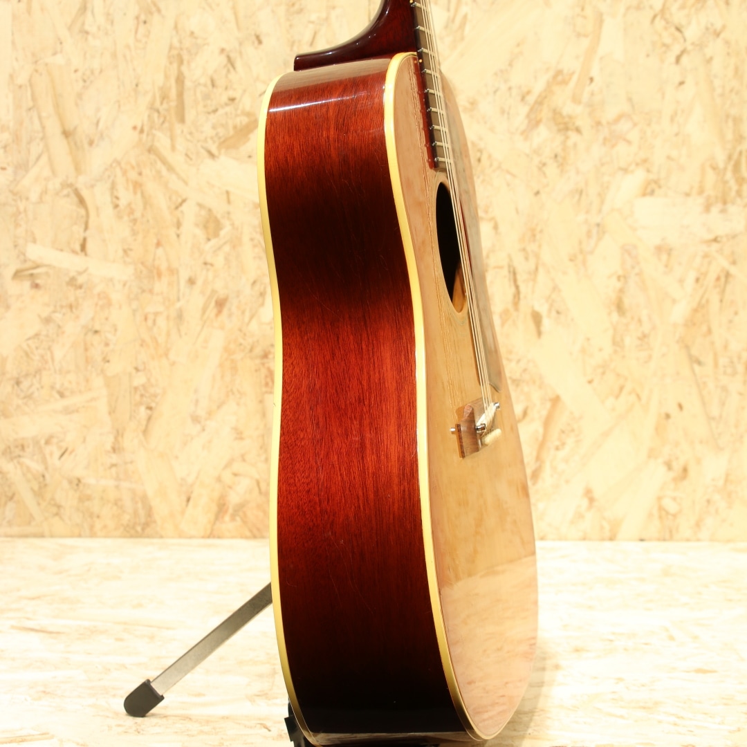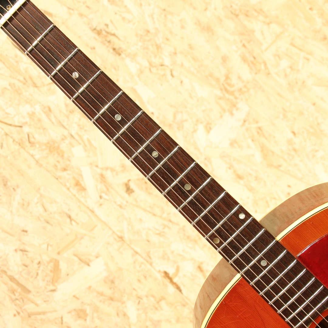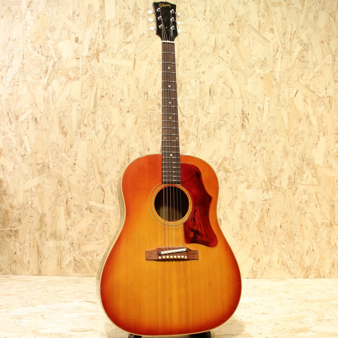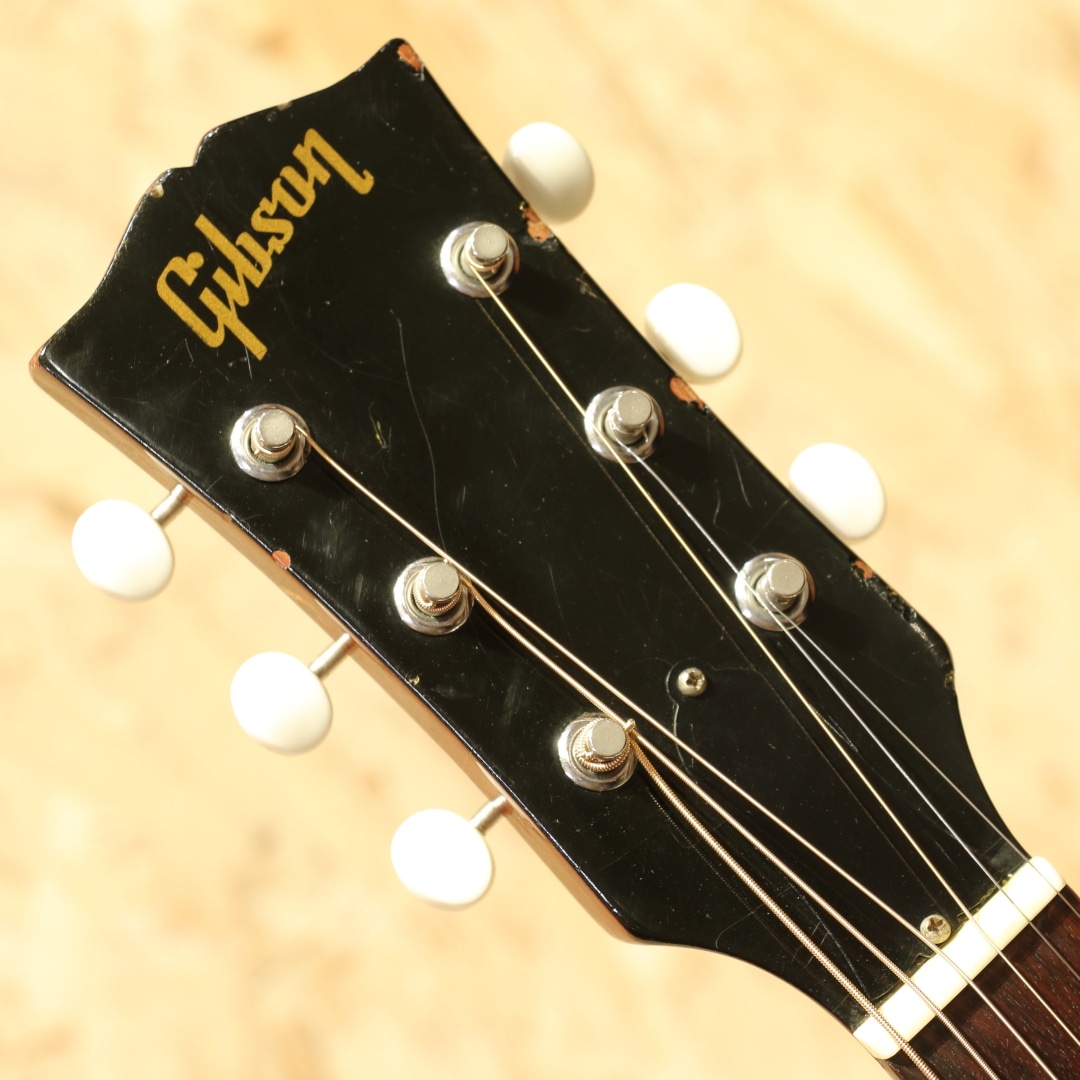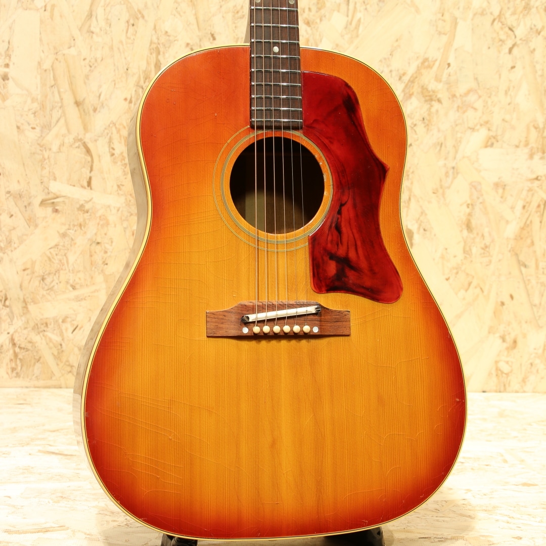 1942年にギブソンが発売を開始した機種J-45、通称ワーキング・ホース。説明不要のギブソンベストセラーモデルです。本器は1966年に製造された淡いチェリーサンバーストカラーの1本。スプルーストップ、マホガニーサイド&バック、マホガニーネック、ハカランダ指板、ローズウッドブリッジ、オリジナル艶なしセラミックサドル、指板ドットインレイ、オリジナルの厚手ラージセルロイドピックガード、ダブルリングロゼッタ、ノンスキャロップドXブレイシング、ナット幅約40ミリナローネック、14度ヘッド角。ペグはクルーソンタイプ1ラインへリプレイスされています。1960年からサンバーストカラーが色味の濃いダークチェリーサンバーストへ変わり、50年代に引き続き薄手のラージガードを備えていたJ45。1964年頃からは淡い色合いのチェリーサンバーストへと変更となり、ピックガードも厚手のモノへ。1965年途中にはナローネックへと変更となり、ヘッド角度も14度へと変わっていきます。本器もこの時代のギブソンらしいカラーリング、お馴染みのルックスを持った60年代後半スペック。ヘッドの角度がやや浅くなったことで、音色も緩くメロウなトーンへ。ナローネックとなることで弦間ピッチが狭まり、各弦がバラつかない纏まったサウンドへと変化します。レンジ感はミドルの方へ寄り、ドライブ感のあるトーン、そしてADJの代名詞とも言えるパーカッシブな響き。同時期のウッドサドルの個体に比べてサクサクとした軽快さを感じられ、トーンも明るい印象。とりわけカッティングでの歯切れの良さやコンプがかったサウンド、フィンガーでの素朴で繊細、メロウなトーンを響かせてくれます。歌い手に寄り添ってくれるワークホース、この時代のJ-45を愛用するミュージシャンが多いことも頷けます。ボディトップ面のみオーバーラッカーがされておりますが、薄く吹かれており質感を損なう程ではありません。ボディバック面の6弦側くびれ付近に硬いもので擦ったような14cm程の凹み跡が見られ、ボディ内部に割れた跡が見られないことからクラックではないと推察されます。サイドとバックとオリジナルのフィニッシュをキープし、ヘッド角やボディ全体に細やかな当てキズが見られますが、大きく気になるほどのキズではなくキレイなコンディションを保たれてきた個体。ネックの状態も良く、ナローネック特有の操作性を存分に味わえる1本。ADJの調整幅もあり、トラスロッドにも余裕があります。今後の使用にも応えてくれそうなLate 60’s J-45。握り込んだコードフォームはこの時代のグリップでしか出来ないこともあります。細かな操作性、スリムなグリップとナローなレンジ感、お手本のような60年代後半サウンドを体感できる1本。是非ご体感下さいませ。