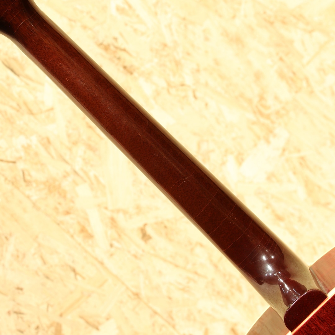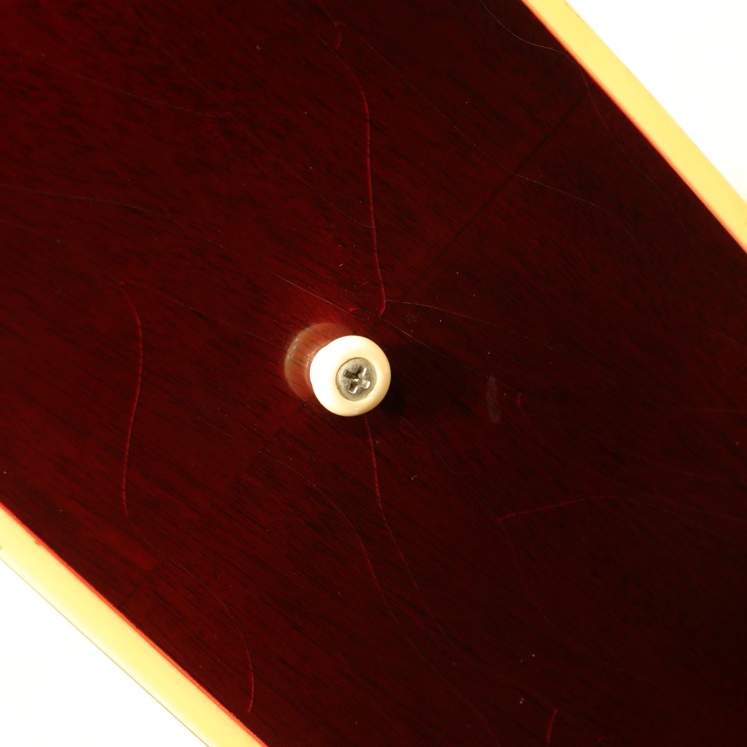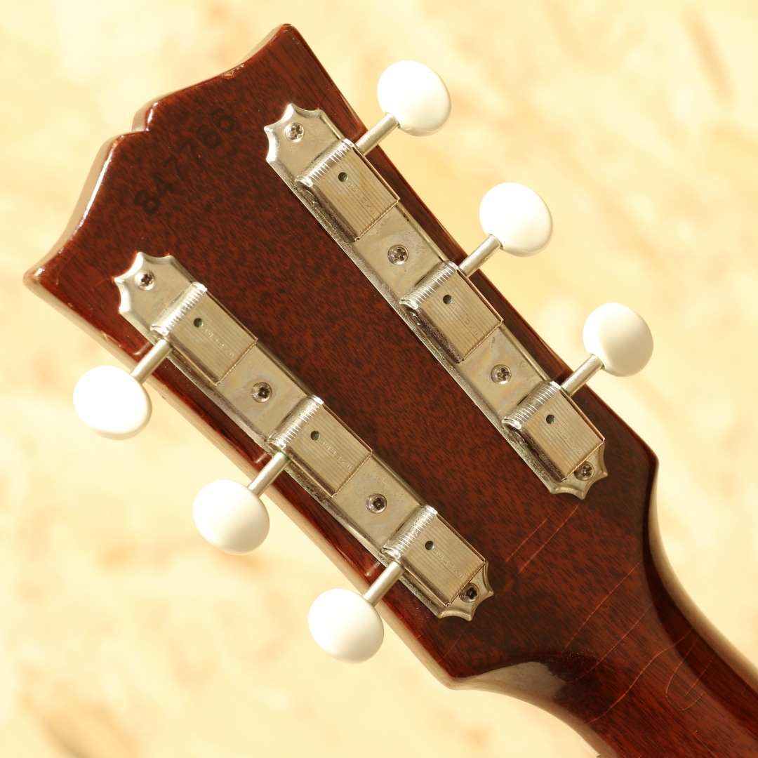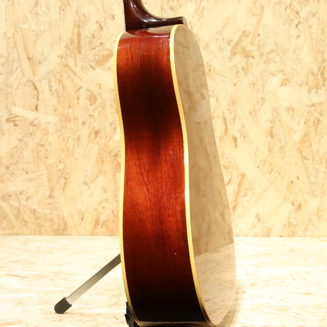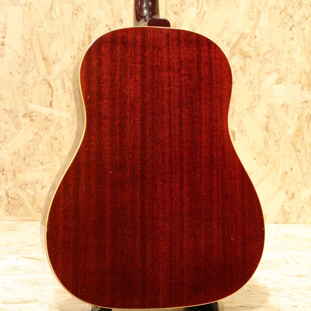 1942年にギブソンが発売を開始した機種J-45、通称ワーキング・ホース。説明不要のギブソンベストセラーモデルです。本器は1966年に製造された淡いチェリーサンバーストカラーの1本。スプルーストップ、マホガニーサイド&バック、マホガニーネック、ハカランダ指板、ローズウッドブリッジ、オリジナル艶なしセラミックサドル、指板ドットインレイ、オリジナルの厚手ラージセルロイドピックガード、ダブルリングロゼッタ、ノンスキャロップドXブレイシング、ナット幅約40ミリナローネック、14度ヘッド角。ペグはクルーソンタイプ1ラインへリプレイスされています。1960年からサンバーストカラーが色味の濃いダークチェリーサンバーストへ変わり、50年代に引き続き薄手のラージガードを備えていたJ45。1964年頃からは淡い色合いのチェリーサンバーストへと変更となり、ピックガードも厚手のモノへ。1965年途中にはナローネックへと変更となり、ヘッド角度も14度へと変わっていきます。本器もこの時代のギブソンらしいカラーリング、お馴染みのルックスを持った60年代後半スペック。ヘッドの角度がやや浅くなったことで、音色も緩くメロウなトーンへ。ナローネックとなることで弦間ピッチが狭まり、各弦がバラつかない纏まったサウンドへと変化します。レンジ感はミドルの方へ寄り、ドライブ感のあるトーン、そしてADJの代名詞とも言えるパーカッシブな響き。同時期のウッドサドルの個体に比べてサクサクとした軽快さを感じられ、トーンも明るい印象。とりわけカッティングでの歯切れの良さやコンプがかったサウンド、フィンガーでの素朴で繊細、メロウなトーンを響かせてくれます。歌い手に寄り添ってくれるワークホース、この時代のJ-45を愛用するミュージシャンが多いことも頷けます。ボディトップ面のみオーバーラッカーがされておりますが、薄く吹かれており質感を損なう程ではありません。ボディバック面の6弦側くびれ付近に硬いもので擦ったような14cm程の凹み跡が見られ、ボディ内部に割れた跡が見られないことからクラックではないと推察されます。サイドとバックとオリジナルのフィニッシュをキープし、ヘッド角やボディ全体に細やかな当てキズが見られますが、大きく気になるほどのキズではなくキレイなコンディションを保たれてきた個体。ネックの状態も良く、ナローネック特有の操作性を存分に味わえる1本。ADJの調整幅もあり、トラスロッドにも余裕があります。今後の使用にも応えてくれそうなLate 60’s J-45。握り込んだコードフォームはこの時代のグリップでしか出来ないこともあります。細かな操作性、スリムなグリップとナローなレンジ感、お手本のような60年代後半サウンドを体感できる1本。是非ご体感下さいませ。