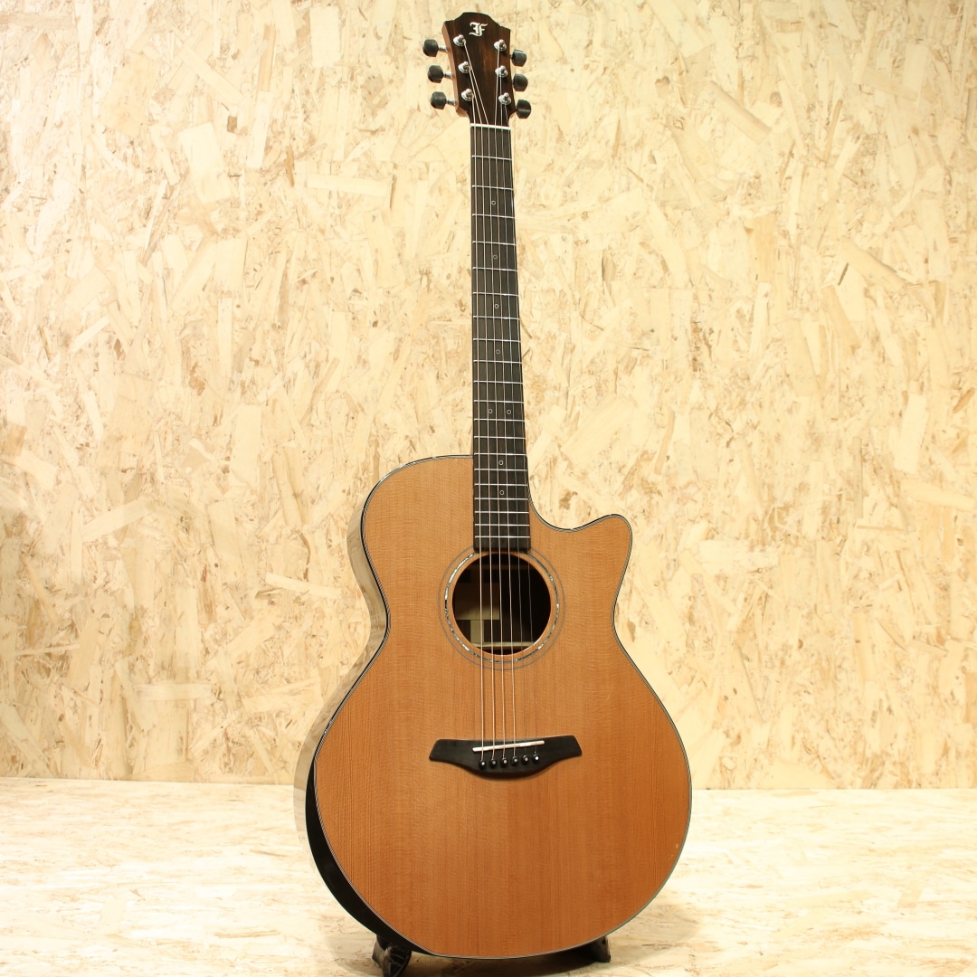 1981年、チェコスロバキア社会主義共和国時代、ブルーグラスプレイヤーであったFrantisek Furch(フランティセク フォルヒ)氏が自らとその仲間の為にギターを製作を開始。その後の試行錯誤により徐々に品質を高め、プロ・アマ問わず地元プレイヤーの高い評価を得るまでになり、93年時点で20名ほどのスタッフを抱えるギターメーカーに成長。その開拓者精神あふれる父親からフォルヒギターズを引き継いだ息子のPetr Furch(ピーター・フォルヒ)は、伝統的な手工技術に近代的な生産技術を合わせ、自ら考案したアイデアでフォルヒギターの品質向上を絶えず考え続け今や多くのプロギタリストにも愛用されるブランドとなっております。本器は通常のイエローシリーズとは異なる仕様が組み込まれたデラックスモデル”Yellow Deluxe Gc-CR ”。2010年代製USED品です。ウエスタンレッドシダートップ、インディアンローズウッドサイド&バック。マホガニーネック、エボニー指板&ブリッジ、ゴトー製510ペグ、ダブルリングロゼッタ、べっ甲柄バインディング、クリアピックガード、ベネチアンカッタウェイ、スキャロップドXブレイシング。 さらに通常のYellowシリーズには使用されていないBevel Duo(べヴェルデュオ)と称した、エルボー&バックコンターを搭載。通常シリーズよりも抱えやすくなり、演奏性が向上されております。シンプルながらも大変上品なルックス。低音から高音までのバランスに優れたグランドオーディトリアムサイズボディは音量もあり、レンジの幅も充分。どのポジションでも決してもたつかず安定したトーンで発音されるサウンド。レスポンスとサスティーンの良さ、プレイアビリティの高さからソロギタリスト向けとも言われています。トップ面下部に米粒程の当てキズと同じ大きさの擦れキズ、バックコンター部に1cmにも満たない白濁痕、ヘッド6弦側ペグ付近にも米粒にも満たない程度の当てキズと細部に実戦で使用されていたであろう歴戦の痕跡が見受けられますがどれも演奏や使用には問題なく、ネック・プレイコンディションも良好で即戦力で活躍を期待できます。チェコ製ハイクオリティーブランド”フォルヒ”。まだ触れたことのない方は是非一度お試しください。オリジナルハードケースが付属します。