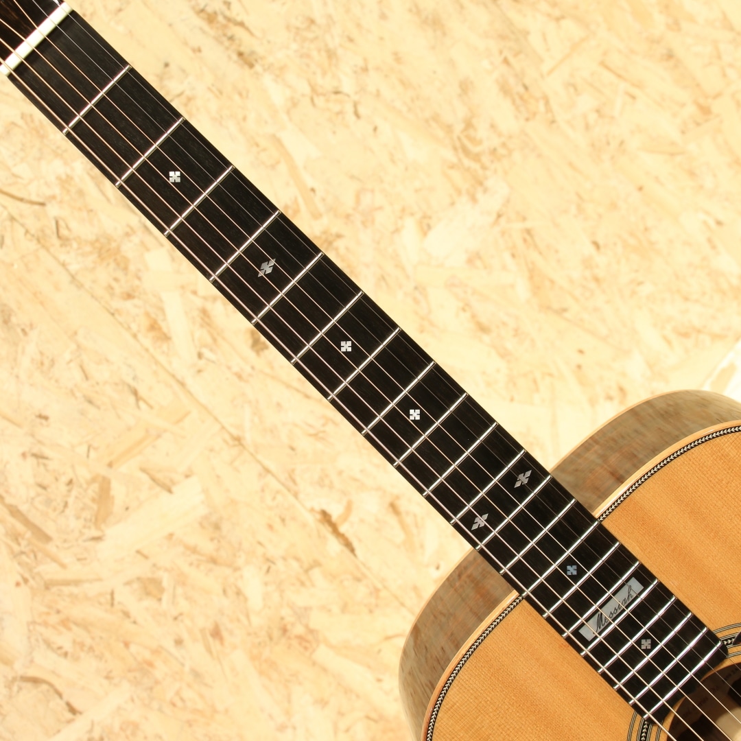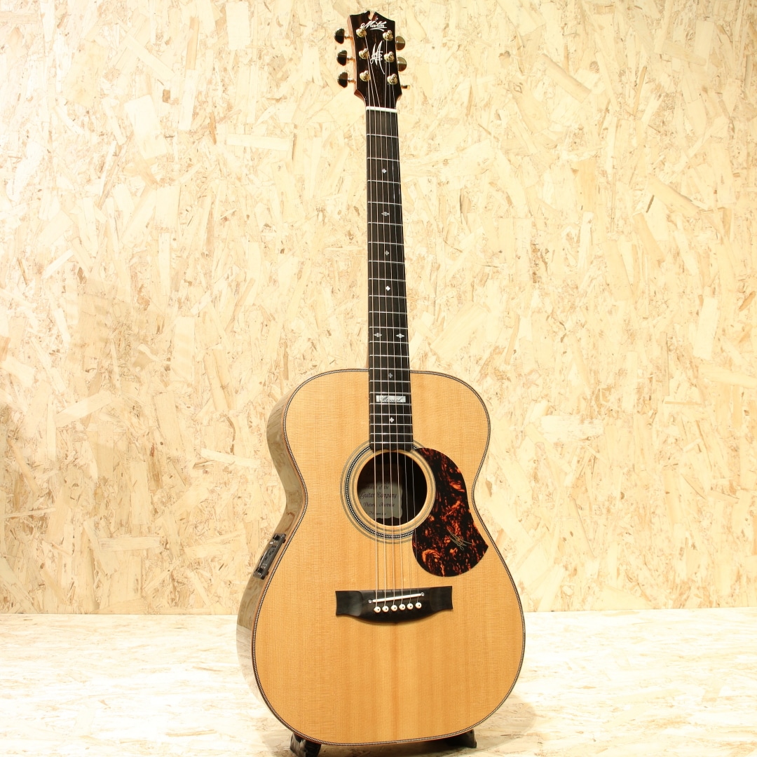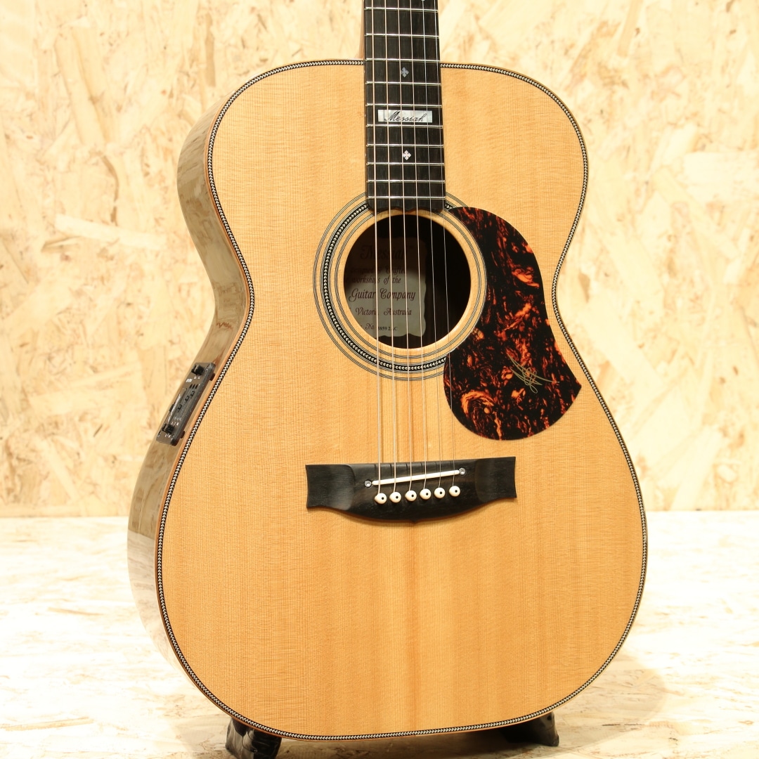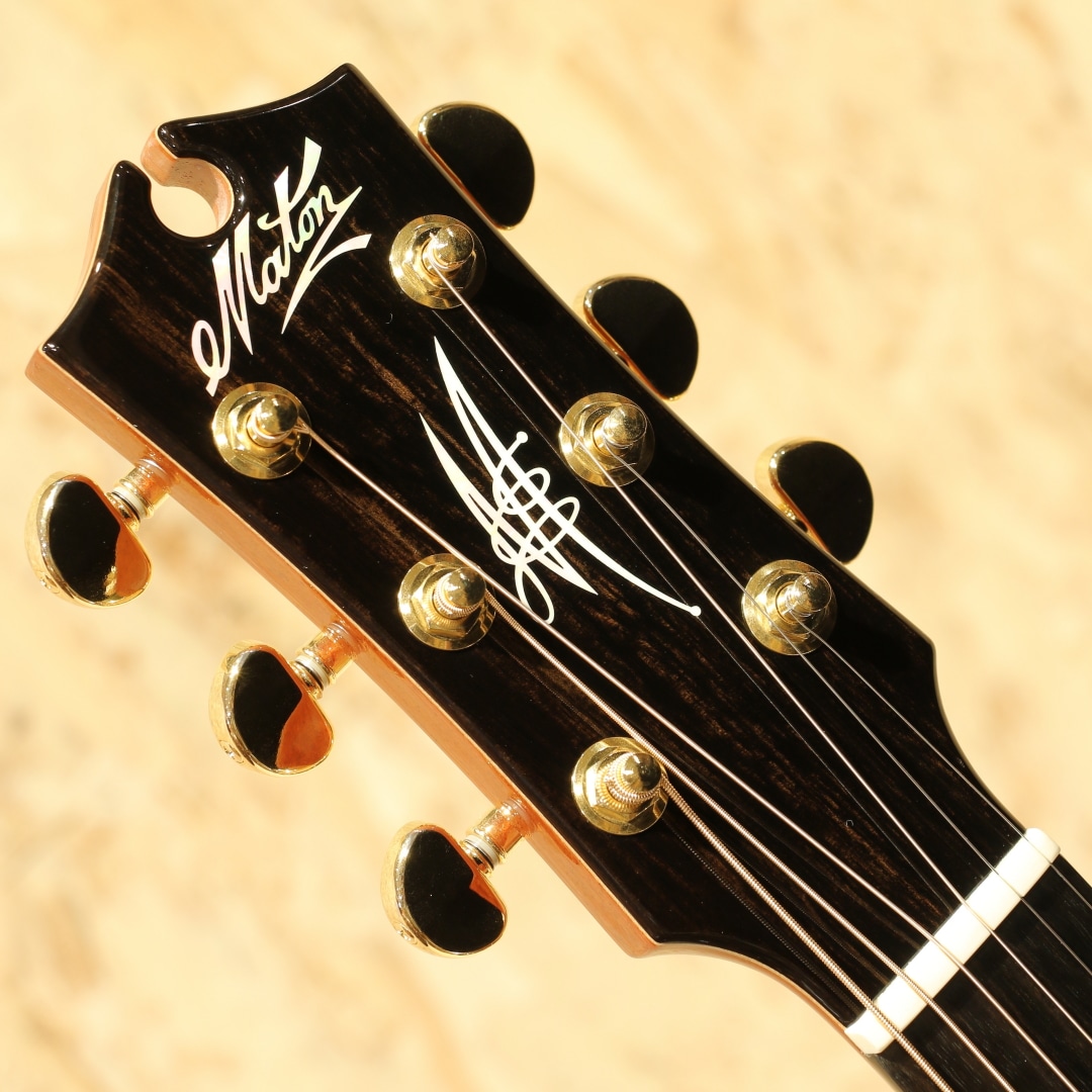 1946年に創業されたオーストラリアの老舗ブランド「メイトンギター」。特に地元オーストリアでは高いシェア率を誇り、トミーエマニュエルを始め、ジョーロビンソンやキーランマーフィーなど世界で活躍するトッププレイヤーが使用しています。本器はレギュラーラインのフラッグシップモデル”EM100-808”。2020年代製USED品。AAAグレードシトカスプルーストップ、インディアンローズウッドサイド&バック、マホガニーネック、エボニー指板&ブリッジ、ヘリンボーントリム&ロゼッタ、グローバーロトマチックゴールドペグ、べっ甲柄ピックガード、スノーフレイクパール指板インレイ、メイトン独自のスキャロップドXブレイシング、AP5Proプリアンプシステム搭載。メイトンの永い歴史の中で808が最初に登場したのは1978年の事。小型なOOサイズに相当するボディ幅と深胴のボディ、そこにロングケールを組み合わせたオリジナルモデルとして開発が行われました。今ではメイトンを代表する機種として日本でも馴染みの深いモデルです。その小型さから取り回しの良さ、抱え易さを武器としやすい秀逸器。本器もその特徴を受け継ぎつつ、レギュラーラインの最上位として世界最高峰のトーンウッドを集結、ふんだんに使用した仕様で作り出されています。シトカスプルース+インディアンローズウッドのトラディショナルな組み合わせ、この仕様は現地の材を使用することの多いメイトンでは珍しく気合の入り様が窺えます。メイトンの薄いグリップと浅いヘッド角による左手の操作性の高さ、44mmのナット幅でのフィンガースタイルに対応し易い点からも同ジャンルのミュージシャンによる愛用が頻繁に見られます。既存のモデルに比べてもやや広いレンジ感を持つ辺りは材によるものでしょうか。高級感を感じさせる艶やかな音色、それなのにどこかオーストラリアの乾いた雰囲気を感じさせる響き。ヘッド角の影響か、やや柔らかい音色を持っているところにはメイトンらしさを覚えるでしょう。分かりやすく高級なサウンドを持っているメイトンフラッグシップの1モデル。更には2011年から採用されている世界最高峰とも名高いP.U.システム"AP5Pro"を搭載。アンダーサドルピエゾとコンデンサーマイクのブレンドにより、アコギ本来の空気感から鋭くパワフルなピエゾサウンドまでフレキシブルに操作と出力出来ます。プリアンプの操作自体も直感的、トレブル/ベースのEQに加えミドル/フリケンシーも備えられており、非常に幅広い実用的なセットアップが可能。汎用性と実用性を高次元で融合させた秀逸なピックアップシステムとなっています。ボディトップ面1弦側のボトム角にぶつけてしまったのか塗装の割れと欠け、ヘッドサイド1弦側に当てキズによる塗装表面のヒビと凹みが見られますが、その点を除くと非常に使用感の少ない個体。ネックの状態も非常に良好で、メイトンの演奏性の高さを存分に発揮してくれるであろう1本です。繊細なタッチ感を求めるフィンガースタイルプレイヤーからの評価も高いメイトン。歌モノでも使用できるポテンシャルを持つ辺り汎用性の高さが最大のウリと言えます。レギュラーライン最高峰、他機種と異なる艶やかなサウンドを是非ご体感下さいませ。