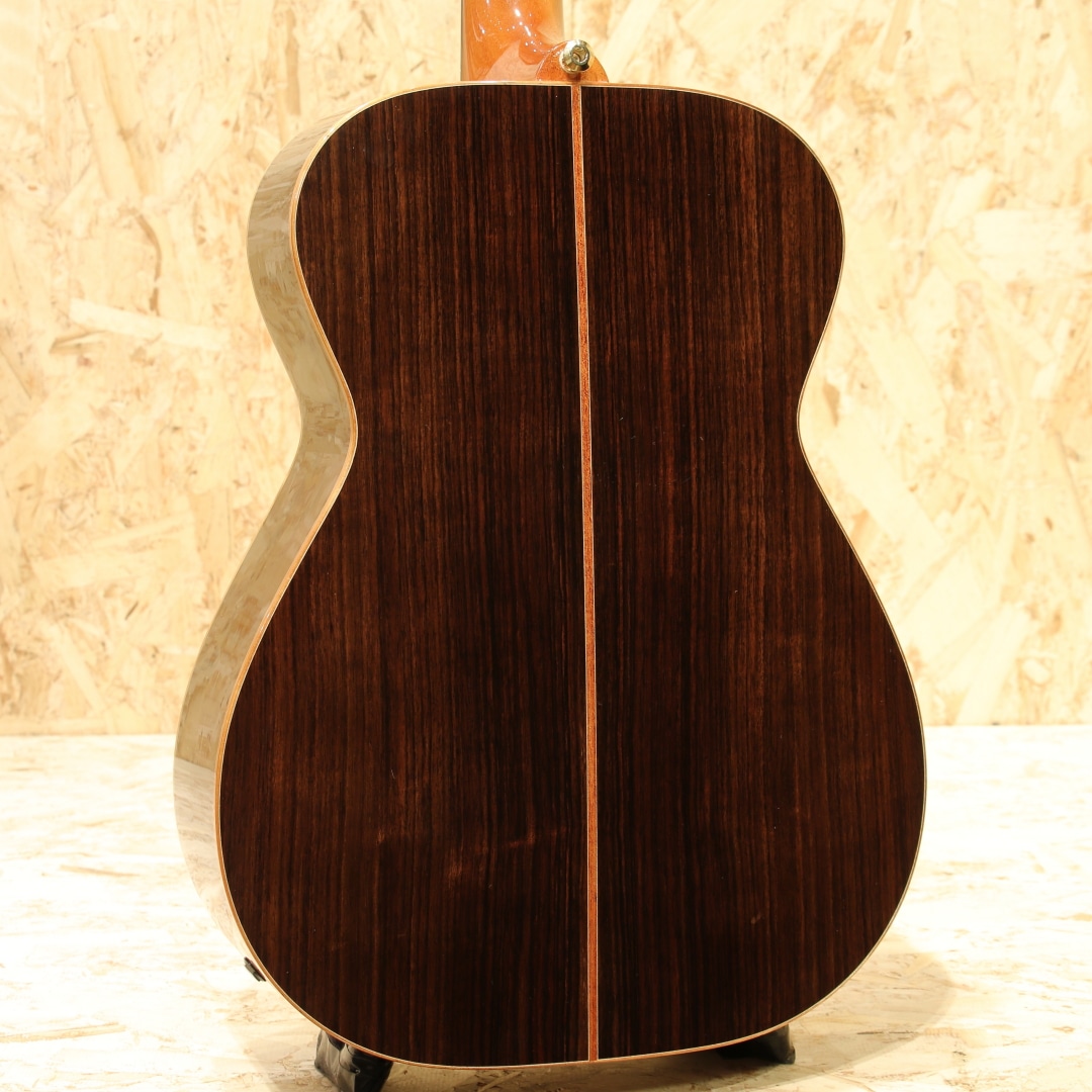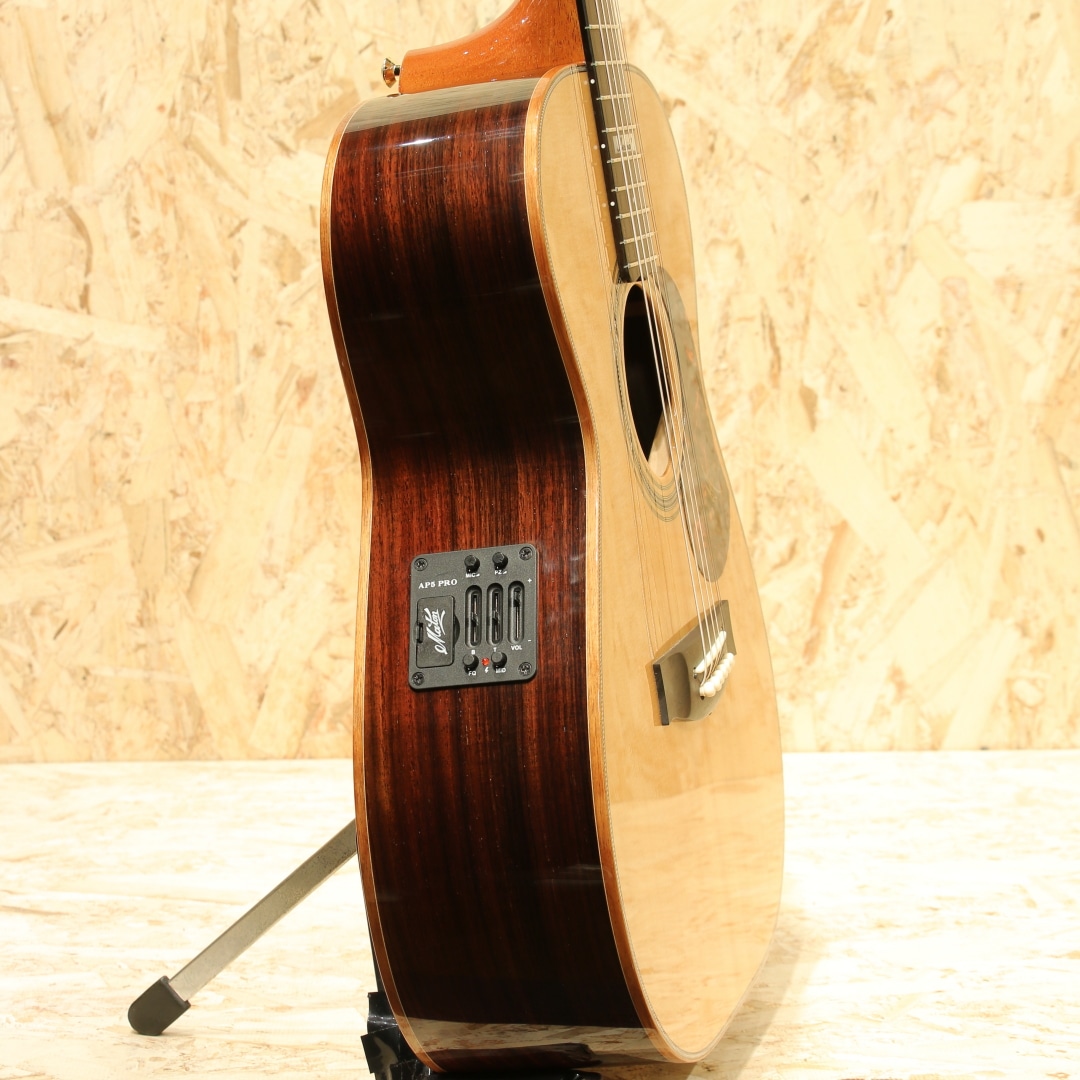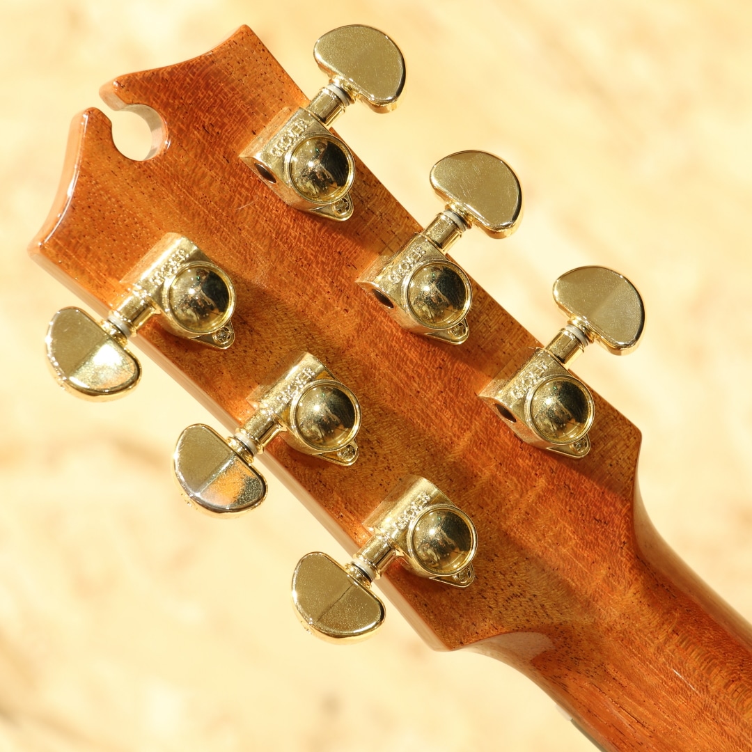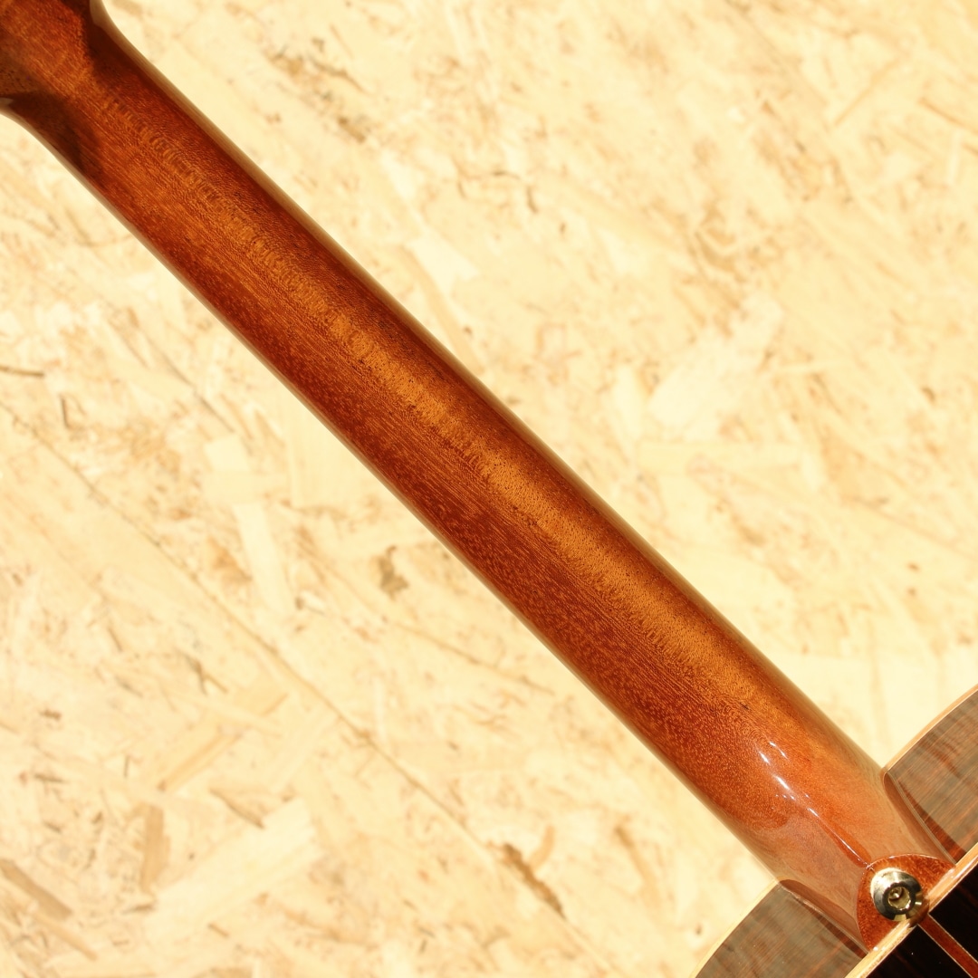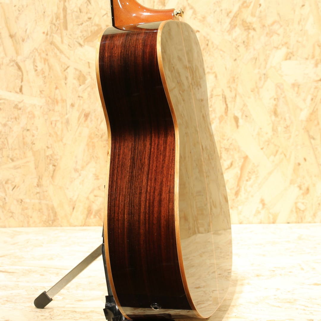 1946年に創業されたオーストラリアの老舗ブランド「メイトンギター」。特に地元オーストリアでは高いシェア率を誇り、トミーエマニュエルを始め、ジョーロビンソンやキーランマーフィーなど世界で活躍するトッププレイヤーが使用しています。本器はレギュラーラインのフラッグシップモデル”EM100-808”。2020年代製USED品。AAAグレードシトカスプルーストップ、インディアンローズウッドサイド&バック、マホガニーネック、エボニー指板&ブリッジ、ヘリンボーントリム&ロゼッタ、グローバーロトマチックゴールドペグ、べっ甲柄ピックガード、スノーフレイクパール指板インレイ、メイトン独自のスキャロップドXブレイシング、AP5Proプリアンプシステム搭載。メイトンの永い歴史の中で808が最初に登場したのは1978年の事。小型なOOサイズに相当するボディ幅と深胴のボディ、そこにロングケールを組み合わせたオリジナルモデルとして開発が行われました。今ではメイトンを代表する機種として日本でも馴染みの深いモデルです。その小型さから取り回しの良さ、抱え易さを武器としやすい秀逸器。本器もその特徴を受け継ぎつつ、レギュラーラインの最上位として世界最高峰のトーンウッドを集結、ふんだんに使用した仕様で作り出されています。シトカスプルース+インディアンローズウッドのトラディショナルな組み合わせ、この仕様は現地の材を使用することの多いメイトンでは珍しく気合の入り様が窺えます。メイトンの薄いグリップと浅いヘッド角による左手の操作性の高さ、44mmのナット幅でのフィンガースタイルに対応し易い点からも同ジャンルのミュージシャンによる愛用が頻繁に見られます。既存のモデルに比べてもやや広いレンジ感を持つ辺りは材によるものでしょうか。高級感を感じさせる艶やかな音色、それなのにどこかオーストラリアの乾いた雰囲気を感じさせる響き。ヘッド角の影響か、やや柔らかい音色を持っているところにはメイトンらしさを覚えるでしょう。分かりやすく高級なサウンドを持っているメイトンフラッグシップの1モデル。更には2011年から採用されている世界最高峰とも名高いP.U.システム"AP5Pro"を搭載。アンダーサドルピエゾとコンデンサーマイクのブレンドにより、アコギ本来の空気感から鋭くパワフルなピエゾサウンドまでフレキシブルに操作と出力出来ます。プリアンプの操作自体も直感的、トレブル/ベースのEQに加えミドル/フリケンシーも備えられており、非常に幅広い実用的なセットアップが可能。汎用性と実用性を高次元で融合させた秀逸なピックアップシステムとなっています。ボディトップ面1弦側のボトム角にぶつけてしまったのか塗装の割れと欠け、ヘッドサイド1弦側に当てキズによる塗装表面のヒビと凹みが見られますが、その点を除くと非常に使用感の少ない個体。ネックの状態も非常に良好で、メイトンの演奏性の高さを存分に発揮してくれるであろう1本です。繊細なタッチ感を求めるフィンガースタイルプレイヤーからの評価も高いメイトン。歌モノでも使用できるポテンシャルを持つ辺り汎用性の高さが最大のウリと言えます。レギュラーライン最高峰、他機種と異なる艶やかなサウンドを是非ご体感下さいませ。