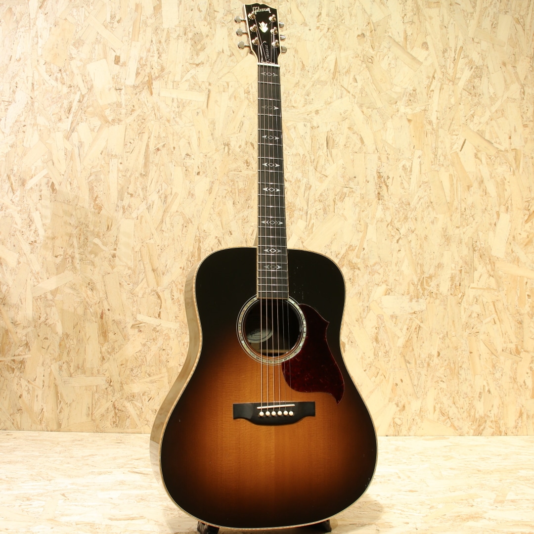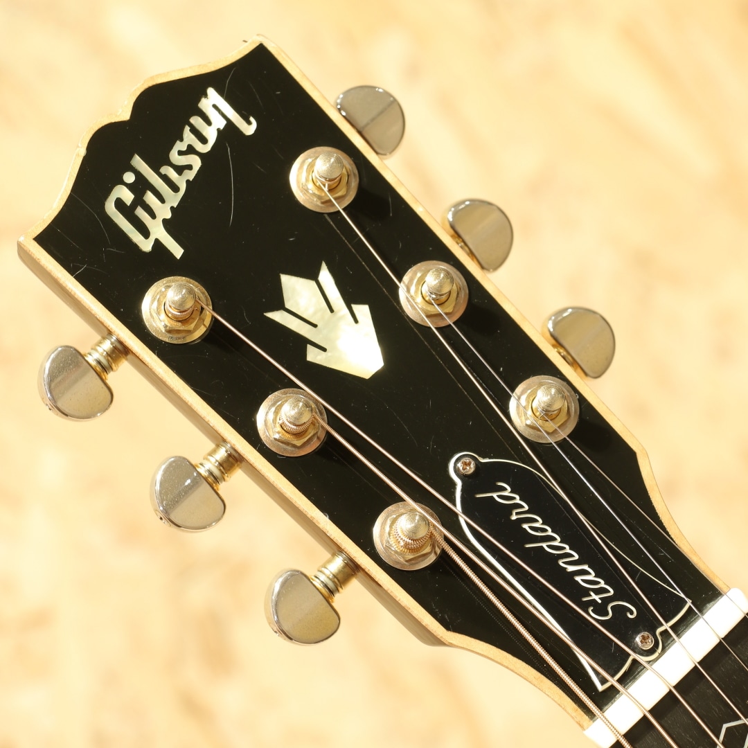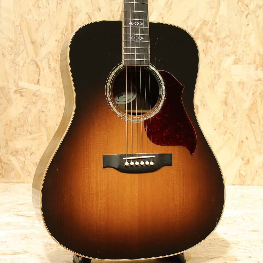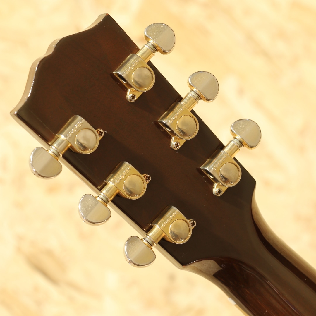 ギブソンラインナップの中でも比較的近年に生まれた機種”Songwriter”。米国や欧州ではベストセラーを誇りスクエアショルダーボディのニュースタンダードとして人気の機種ですが、惜しくも廃盤となってしまった機種です。本器は1930年代のアドバンスド・ジャンボをベースにモダンとヴィンテージの要素を融合させた”Songwriter DLX Standard”。2012年製USED品です。スプルーストップ、インディアンローズウッドサイド&バック、マホガニーネック、エボニー指板&ブリッジ、オリジナルグローバーペグ、アロー&ダイアモンド指板インレイ、オリジナルピックガード、アバロンロゼッタ、メイプルバインディング、ウッドバックストリップ、フィッシュマン社Ellipse Auraピックアップ搭載。トップ構造はアドバンスド・ジャンボに採用されていたようなX部の角度が広いスキャロップブレイシングで、表板のブリッジ付近がアクティブに振動するため、広がりのあるボリューミーなサウンドに一役買う構造です。耳当たりの良い明瞭な高音から重すぎずクリアに聴こえる低音まで幅広いレンジ感で音色にパワー感があり、サステインも長く幅広いスタイルをカバーできる万能型といえます。1930年代のアドバンスド・ジャンボをベースに装飾にも拘られたリッチなデザインの機種。指板インレイはスタンダード機種のダブルパラレログラムからベースモデルのアドバンスドジャンボに採用されているアロー&ダイアモンドを採用。ピックガードはソングライターの象徴な形状。バインディングはメイプル材が使用されており、両機種のデザインが見事にマッチングしております。ピックアップにはFishman Ellipse Auraを搭載。アンダーサドルとプリセットイメージのミックスが可能で、専用のAURAイメージ・ギャラリー・ソフトウェアでプリセットイメージを4つまで保存しておくことが可能。アンダーサドルピックアップにはアコースティック・マトリックスが使用されております。ハウリングを検知・除去するフィードバックキャンセル機能やフィードバック抑制に有効なフェイズ・スイッチ、バッテリーの消耗を視覚的に確認できる LED、ロー・ブースト /ノーマルの切替可能な低音域ボイシング・スイッチなど様々な機能が搭載されておりステージ上でも信頼のおけるワンランク上のピックアップシステムです。全体を通して、実戦で活躍してきたであろう痕跡が多々見受けられる本器、サウンドホール1弦側にはピックにより削れた痕跡がございますが黒く着色がされており目立ちにくくなっております。トップ面ピックガード上部あたりに縦方向の小傷が複数、下部付近1弦側には2cmほどの当てキズが数か所、6弦側には米粒台の当てキズ、バック面にも米粒にも満たない当てキズが複数個所ございますがどれも木部には達しておらずまだまだ現役で活躍の期待できるコンディションです。ブリッジピンの周りに溝が彫られており、へこみや経年による削れにも見えますが標準仕様でございます。Gibson社で人気を誇る2機種のマリアージュ品。是非お手元に如何でしょうか。オリジナルハードケースが付属します。
