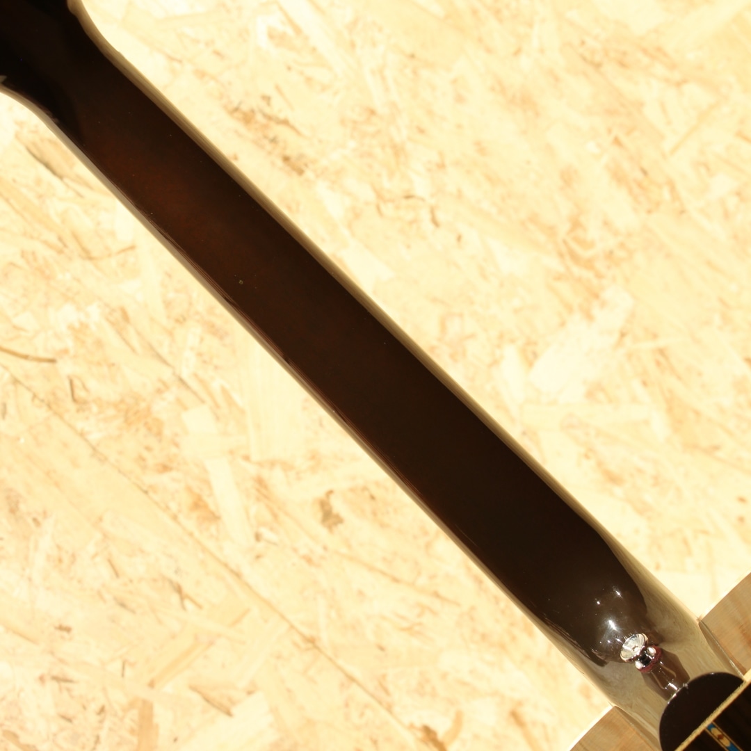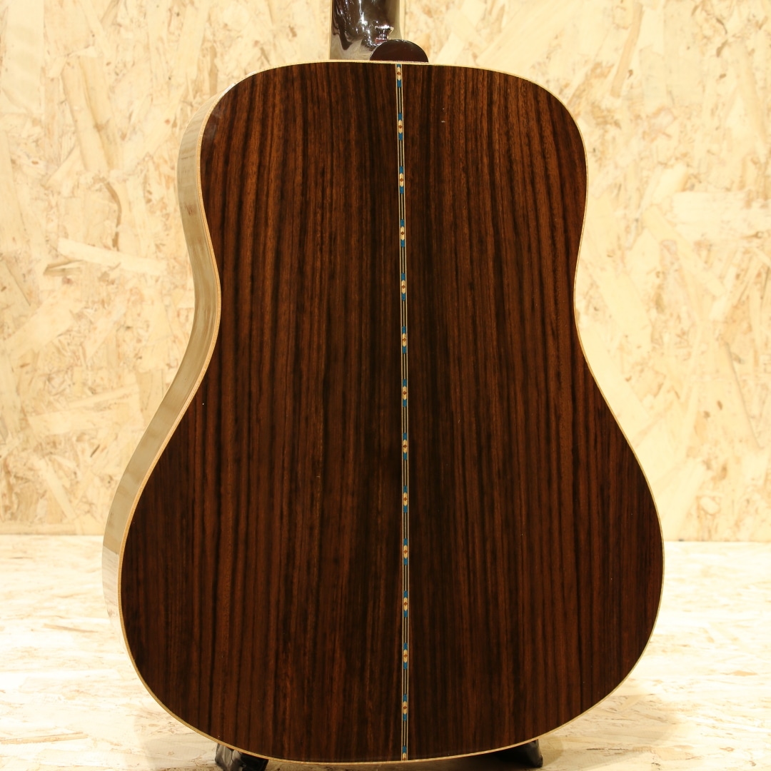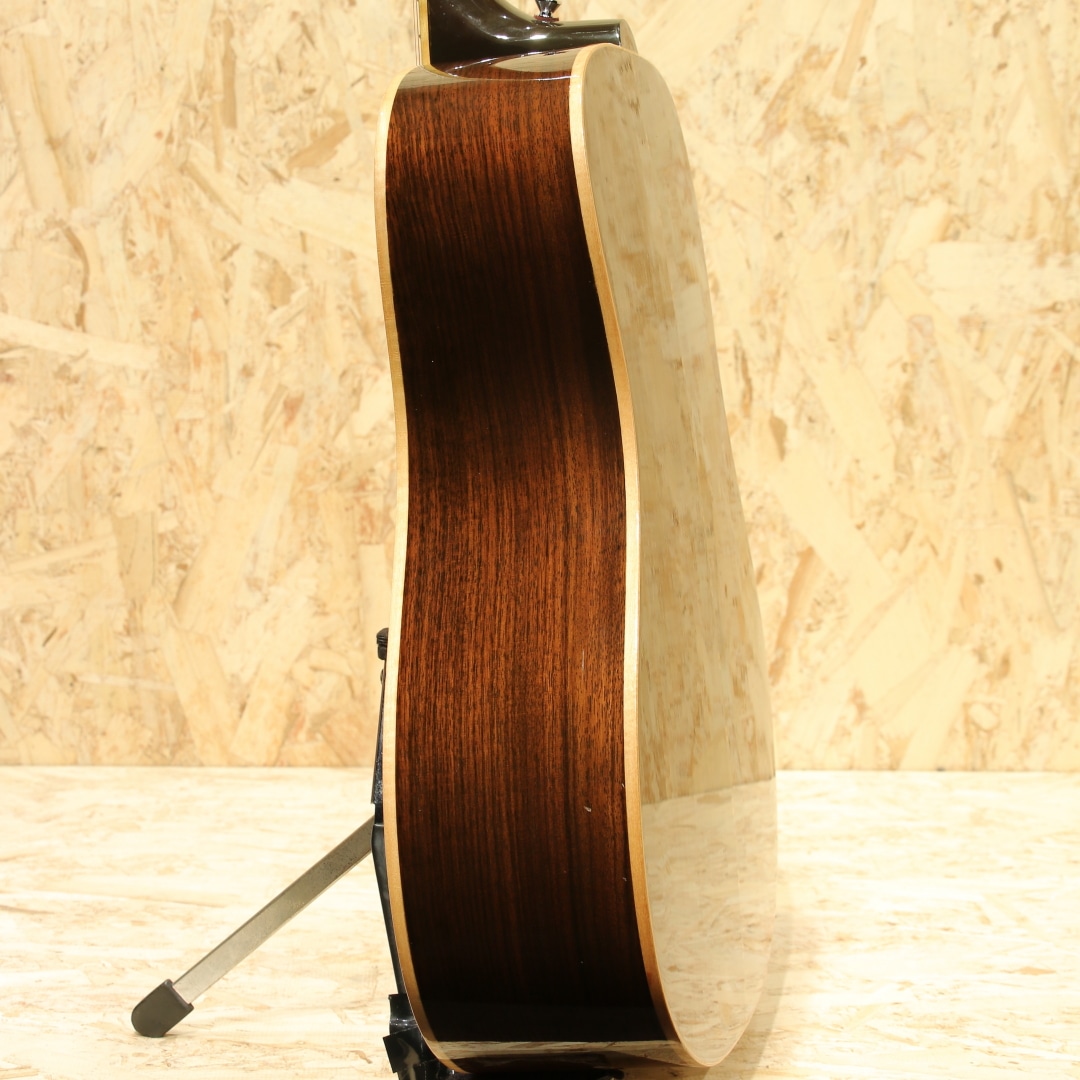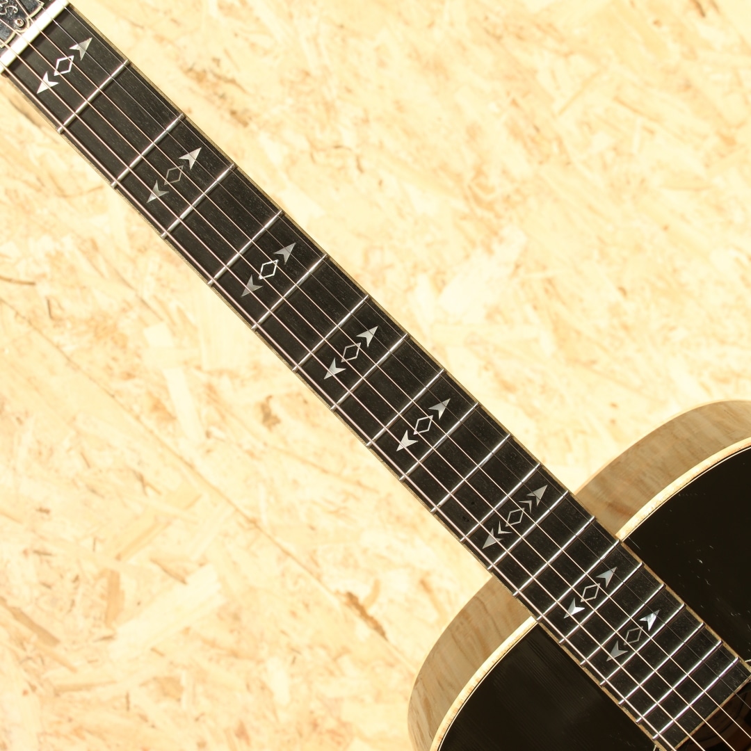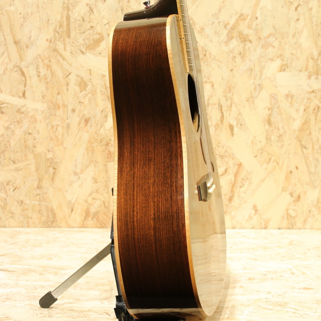 ギブソンラインナップの中でも比較的近年に生まれた機種”Songwriter”。米国や欧州ではベストセラーを誇りスクエアショルダーボディのニュースタンダードとして人気の機種ですが、惜しくも廃盤となってしまった機種です。本器は1930年代のアドバンスド・ジャンボをベースにモダンとヴィンテージの要素を融合させた”Songwriter DLX Standard”。2012年製USED品です。スプルーストップ、インディアンローズウッドサイド&バック、マホガニーネック、エボニー指板&ブリッジ、オリジナルグローバーペグ、アロー&ダイアモンド指板インレイ、オリジナルピックガード、アバロンロゼッタ、メイプルバインディング、ウッドバックストリップ、フィッシュマン社Ellipse Auraピックアップ搭載。トップ構造はアドバンスド・ジャンボに採用されていたようなX部の角度が広いスキャロップブレイシングで、表板のブリッジ付近がアクティブに振動するため、広がりのあるボリューミーなサウンドに一役買う構造です。耳当たりの良い明瞭な高音から重すぎずクリアに聴こえる低音まで幅広いレンジ感で音色にパワー感があり、サステインも長く幅広いスタイルをカバーできる万能型といえます。1930年代のアドバンスド・ジャンボをベースに装飾にも拘られたリッチなデザインの機種。指板インレイはスタンダード機種のダブルパラレログラムからベースモデルのアドバンスドジャンボに採用されているアロー&ダイアモンドを採用。ピックガードはソングライターの象徴な形状。バインディングはメイプル材が使用されており、両機種のデザインが見事にマッチングしております。ピックアップにはFishman Ellipse Auraを搭載。アンダーサドルとプリセットイメージのミックスが可能で、専用のAURAイメージ・ギャラリー・ソフトウェアでプリセットイメージを4つまで保存しておくことが可能。アンダーサドルピックアップにはアコースティック・マトリックスが使用されております。ハウリングを検知・除去するフィードバックキャンセル機能やフィードバック抑制に有効なフェイズ・スイッチ、バッテリーの消耗を視覚的に確認できる LED、ロー・ブースト /ノーマルの切替可能な低音域ボイシング・スイッチなど様々な機能が搭載されておりステージ上でも信頼のおけるワンランク上のピックアップシステムです。全体を通して、実戦で活躍してきたであろう痕跡が多々見受けられる本器、サウンドホール1弦側にはピックにより削れた痕跡がございますが黒く着色がされており目立ちにくくなっております。トップ面ピックガード上部あたりに縦方向の小傷が複数、下部付近1弦側には2cmほどの当てキズが数か所、6弦側には米粒台の当てキズ、バック面にも米粒にも満たない当てキズが複数個所ございますがどれも木部には達しておらずまだまだ現役で活躍の期待できるコンディションです。ブリッジピンの周りに溝が彫られており、へこみや経年による削れにも見えますが標準仕様でございます。Gibson社で人気を誇る2機種のマリアージュ品。是非お手元に如何でしょうか。オリジナルハードケースが付属します。