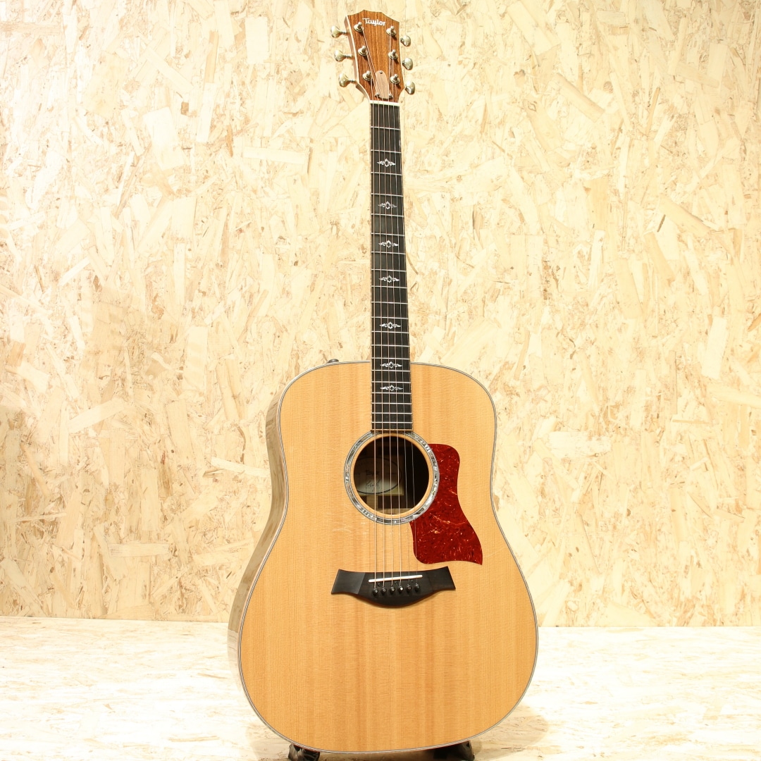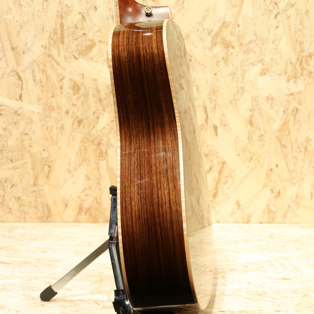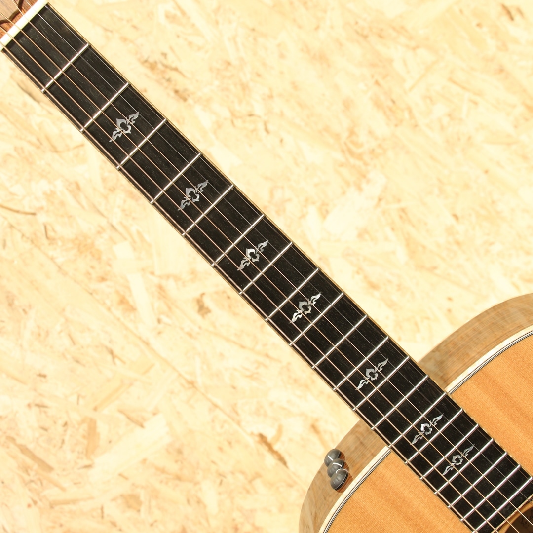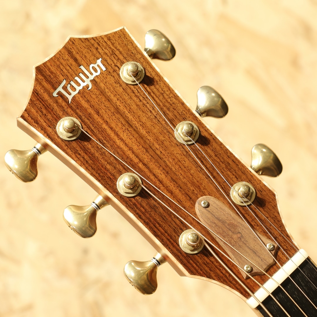 1974年にボブ・テイラーとカート・リスタグの2人によって創立されたテイラー・ギター。革新的なアイデアと高い技術力、ハイセンスなマーケティングで2000年代より急速に成長し、今や世界のトップアコースティックブランドとして、一般ユーザーからプロミュージシャンまで、幅広い層から確固たる支持を得ています。本器はテイラーレギュラーラインナップの中でもフラッグシップに当たる800番台、限定モデルの"810e LTD"。2016年製USED品です。シトカスプルーストップ、インディアンローズウッドサイド&バック、トロピカルマホガニーネック、エボニー指板&ブリッジ、アバロンロゼッタ、メイプルバインディング、ゴトー製510ペグ、Xブレーシング仕様、ES2ピックアップ搭載。フラッグシップに位置する800番台、もちろん木材のランクも厳選されたものを使用して製造されています。900番台と比較しても装飾部分などの違いはあるものの、コストパフォーマンスに優れた仕様。指板の装飾やバインディング、ロゼッタなど手間のかかる仕様を惜しみなく搭載しておりフラッグシップの名に恥じない仕上がり。型番の一桁0はドレッドノートサイズを表し、大きなサイズだからこその音の広がりや豊潤な低音成分を味わえます。真ん中の1は比較的柔らかい材の6弦モデルを表し、スプルーストップである事を表しています。やはり安定感のあるトーン、スプルースとローズの組み合わせは古くから定番となっている為安心感を覚えます。スプルーストップ特有の乾いた響き、キンと響きすぎない柔らかさを伴った音色。ローズでレンジ感広く煌びやかな倍音感を覚え、音色にも重厚さを与えてくれます。テイラーのサウンド自体も上品さがあり、癖の無いサウンドから扱うジャンルを選ばないところも様々なミュージシャンに愛用されている一因です。歌モノからソロギターまでこなせるオールラウンダー。どのジャンルやスタイルでも得手不得手を感じさせない柔軟さ、バランスの良さは随一です。ピックアップにはES2ピックアップシステムを搭載。テイラー独自のシステムでサドル横にピエゾを仕込むことで、よりナチュラルなラインサウンドを出力する事が出来ます。コントローラーはボディサイドに3つ、Bass,Treble,Volとシンプルなため操作に迷うこともありません。生でもラインでも活躍できる、現代では宅録配信までこなせる優秀なギターです。サウンドホール周りにピックでの演奏キズやピックの先端や爪が当たったような細やかな凹み跡、ボディトップ面1弦側下部のボディ縁に薄い当てキズ、ボディサイド1弦側のボトム箇所に薄っすらと当て擦りキズ、ボディバック面には極々薄い線キズと若干の当てキズが見られますが、およそ10年程の経年を考えると板の割れなどは無く比較的キレイなコンディションをキープされています。ネック周りの演奏性も整えられ、テイラーの薄めのグリップによる扱いやすさを実感しやすい1本となっています。現行品のVブレーシングの個体とはまた異なるテイストのテイラー800番台。テイラーフラッグシップのクオリティ、是非お手元でご体感ください。
