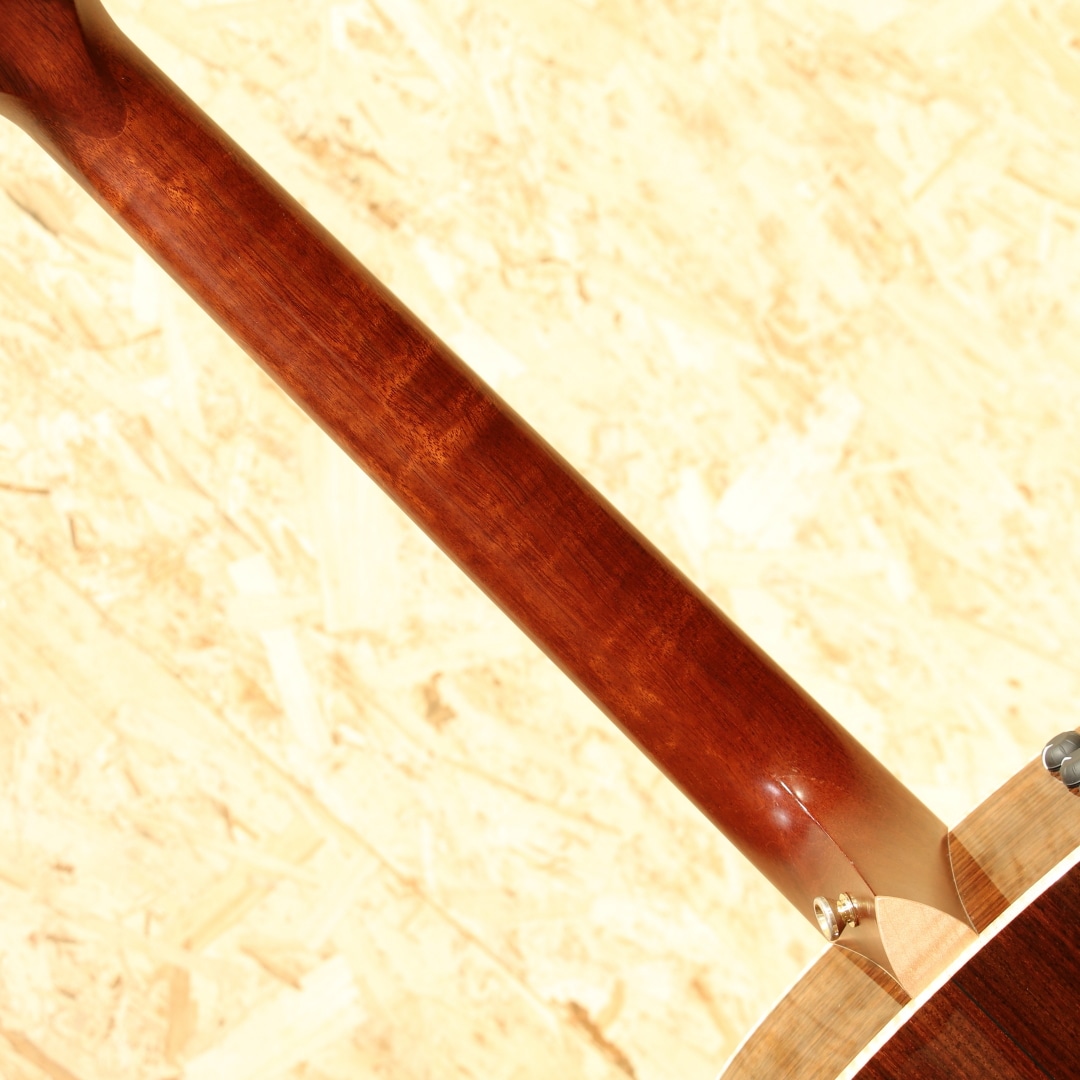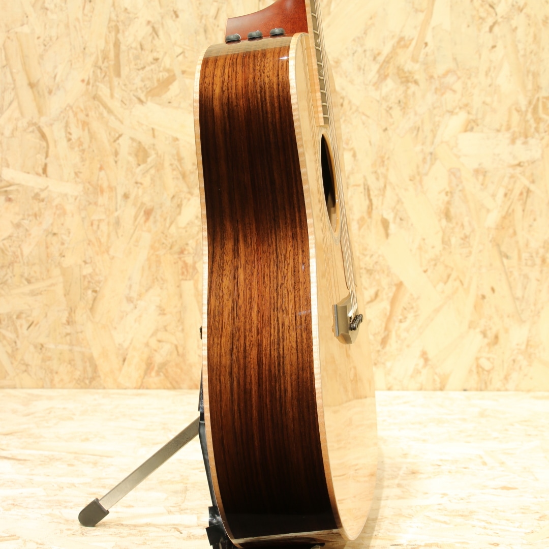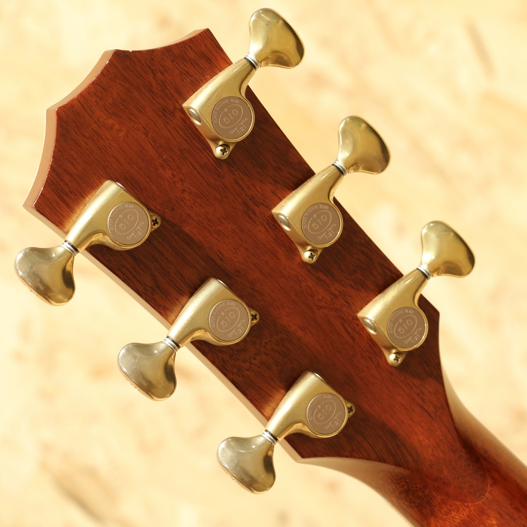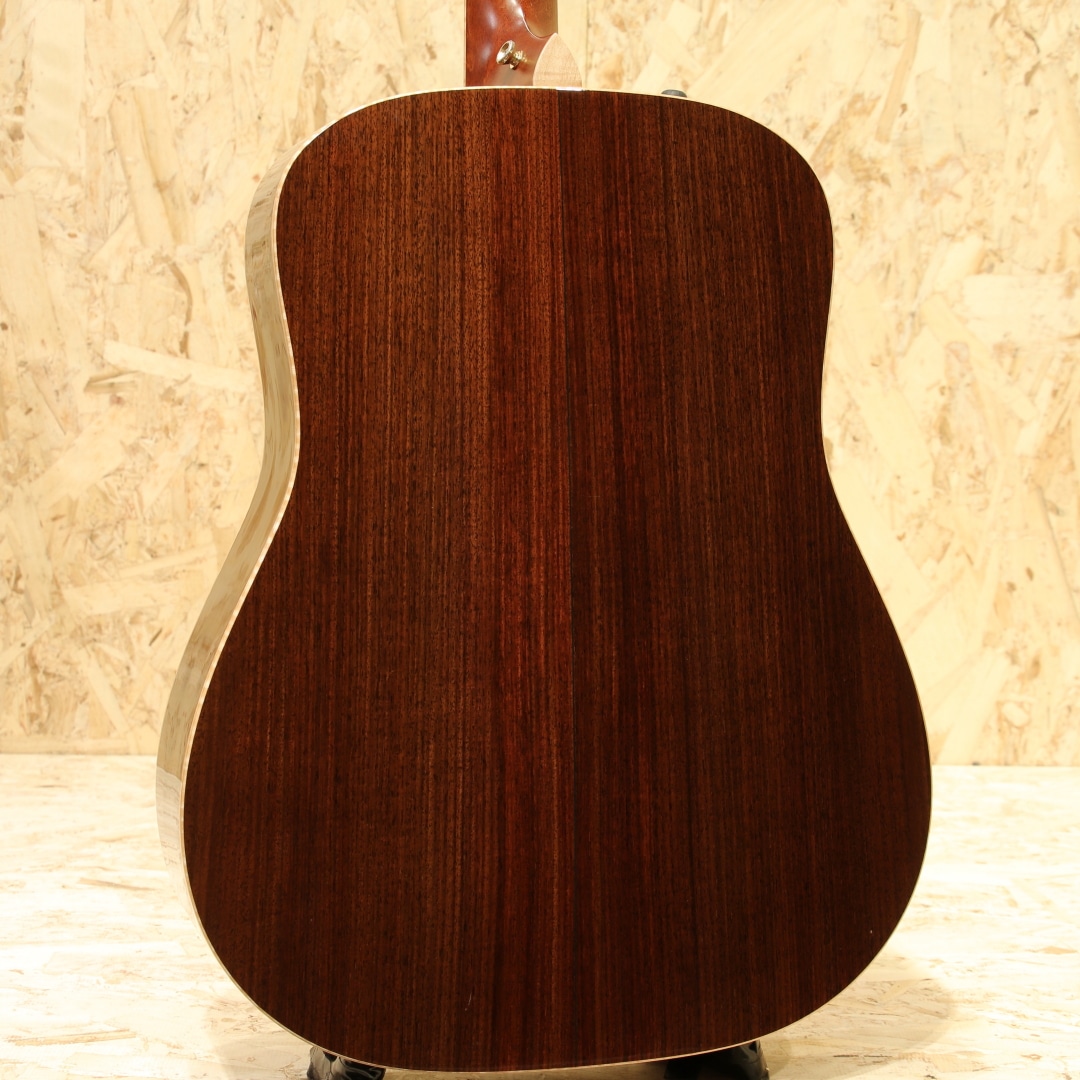 1974年にボブ・テイラーとカート・リスタグの2人によって創立されたテイラー・ギター。革新的なアイデアと高い技術力、ハイセンスなマーケティングで2000年代より急速に成長し、今や世界のトップアコースティックブランドとして、一般ユーザーからプロミュージシャンまで、幅広い層から確固たる支持を得ています。本器はテイラーレギュラーラインナップの中でもフラッグシップに当たる800番台、限定モデルの"810e LTD"。2016年製USED品です。シトカスプルーストップ、インディアンローズウッドサイド&バック、トロピカルマホガニーネック、エボニー指板&ブリッジ、アバロンロゼッタ、メイプルバインディング、ゴトー製510ペグ、Xブレーシング仕様、ES2ピックアップ搭載。フラッグシップに位置する800番台、もちろん木材のランクも厳選されたものを使用して製造されています。900番台と比較しても装飾部分などの違いはあるものの、コストパフォーマンスに優れた仕様。指板の装飾やバインディング、ロゼッタなど手間のかかる仕様を惜しみなく搭載しておりフラッグシップの名に恥じない仕上がり。型番の一桁0はドレッドノートサイズを表し、大きなサイズだからこその音の広がりや豊潤な低音成分を味わえます。真ん中の1は比較的柔らかい材の6弦モデルを表し、スプルーストップである事を表しています。やはり安定感のあるトーン、スプルースとローズの組み合わせは古くから定番となっている為安心感を覚えます。スプルーストップ特有の乾いた響き、キンと響きすぎない柔らかさを伴った音色。ローズでレンジ感広く煌びやかな倍音感を覚え、音色にも重厚さを与えてくれます。テイラーのサウンド自体も上品さがあり、癖の無いサウンドから扱うジャンルを選ばないところも様々なミュージシャンに愛用されている一因です。歌モノからソロギターまでこなせるオールラウンダー。どのジャンルやスタイルでも得手不得手を感じさせない柔軟さ、バランスの良さは随一です。ピックアップにはES2ピックアップシステムを搭載。テイラー独自のシステムでサドル横にピエゾを仕込むことで、よりナチュラルなラインサウンドを出力する事が出来ます。コントローラーはボディサイドに3つ、Bass,Treble,Volとシンプルなため操作に迷うこともありません。生でもラインでも活躍できる、現代では宅録配信までこなせる優秀なギターです。サウンドホール周りにピックでの演奏キズやピックの先端や爪が当たったような細やかな凹み跡、ボディトップ面1弦側下部のボディ縁に薄い当てキズ、ボディサイド1弦側のボトム箇所に薄っすらと当て擦りキズ、ボディバック面には極々薄い線キズと若干の当てキズが見られますが、およそ10年程の経年を考えると板の割れなどは無く比較的キレイなコンディションをキープされています。ネック周りの演奏性も整えられ、テイラーの薄めのグリップによる扱いやすさを実感しやすい1本となっています。現行品のVブレーシングの個体とはまた異なるテイストのテイラー800番台。テイラーフラッグシップのクオリティ、是非お手元でご体感ください。