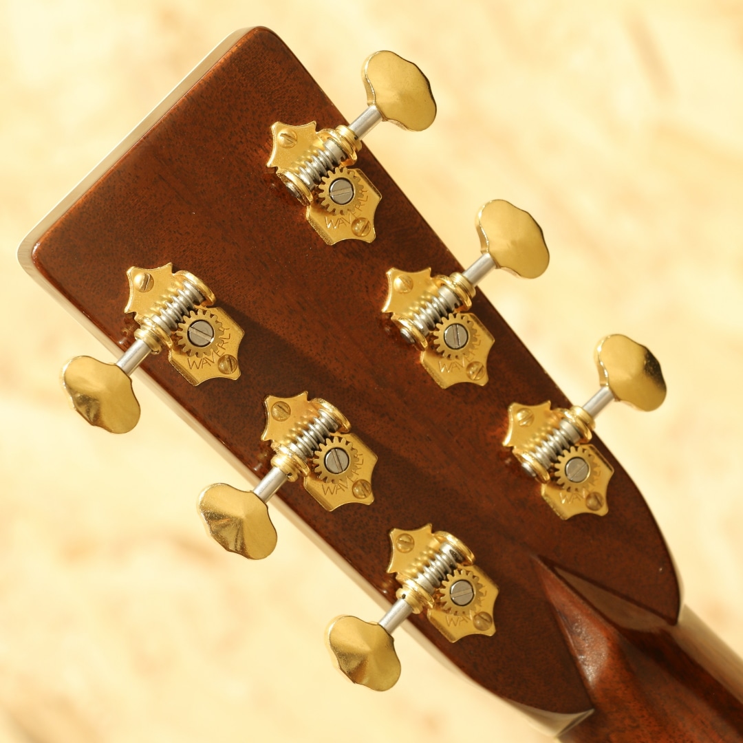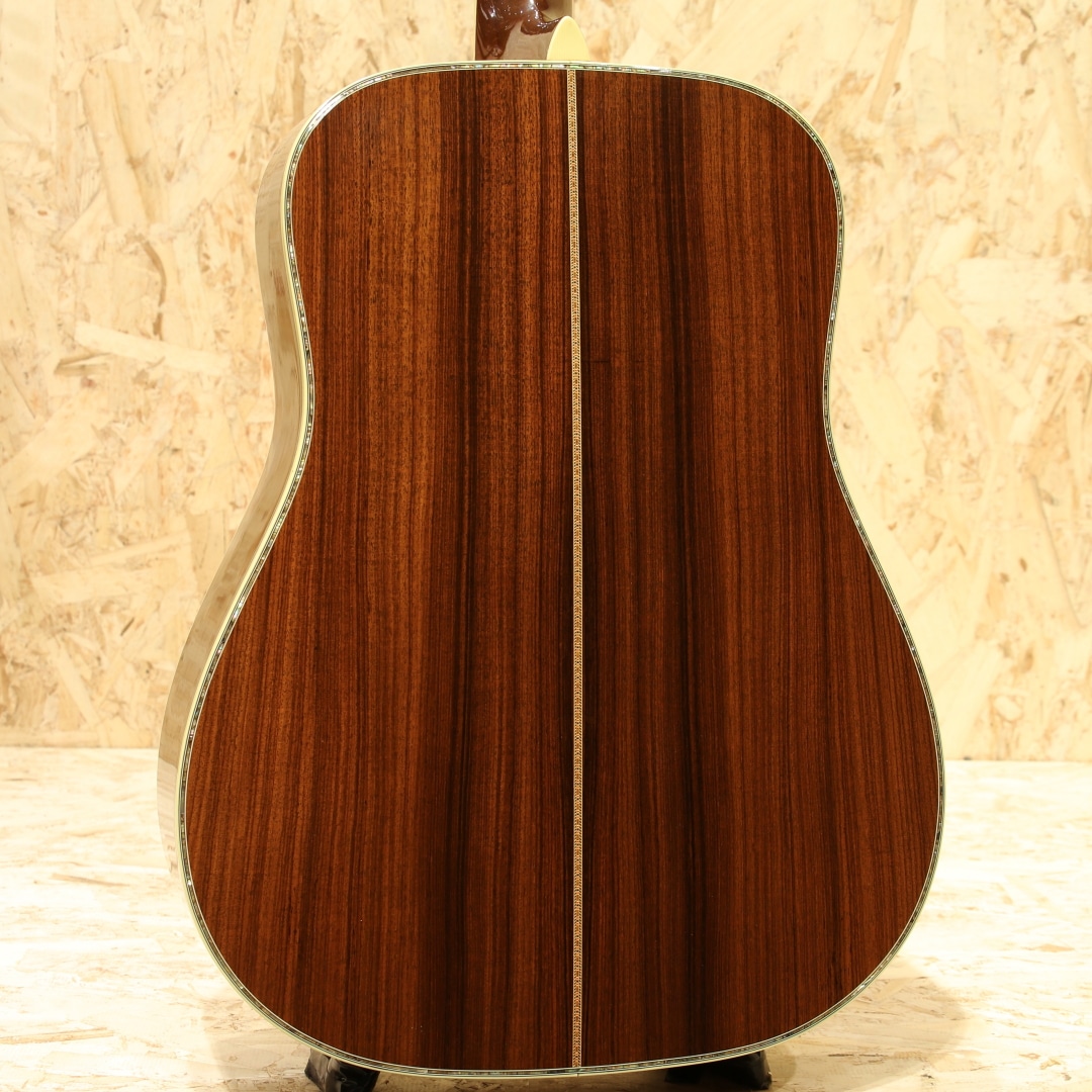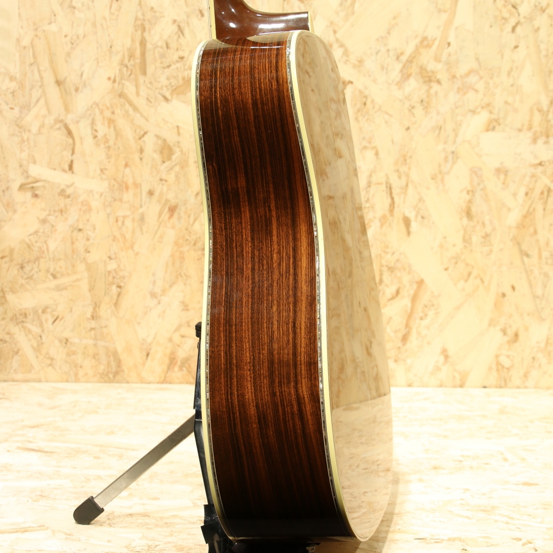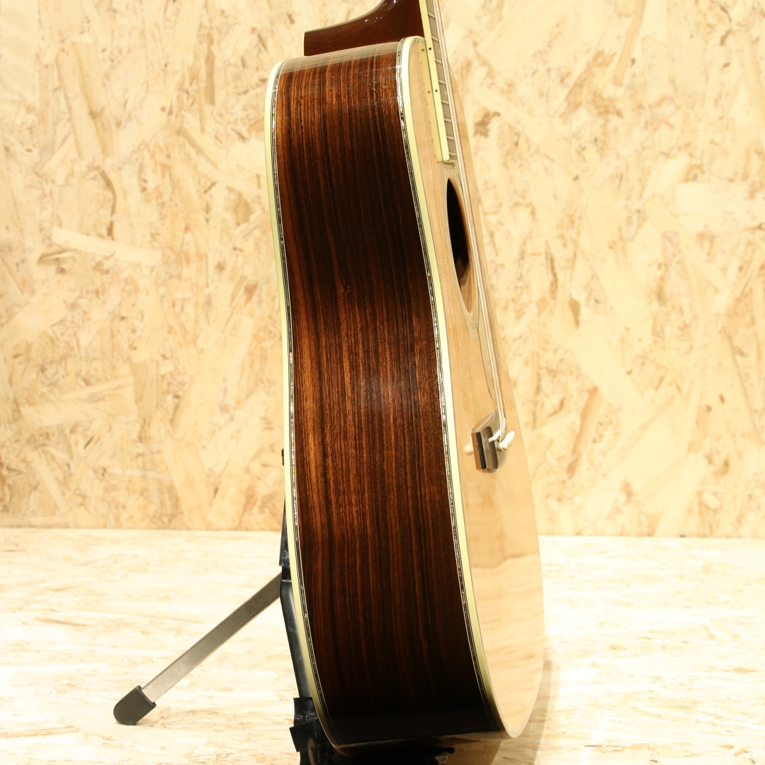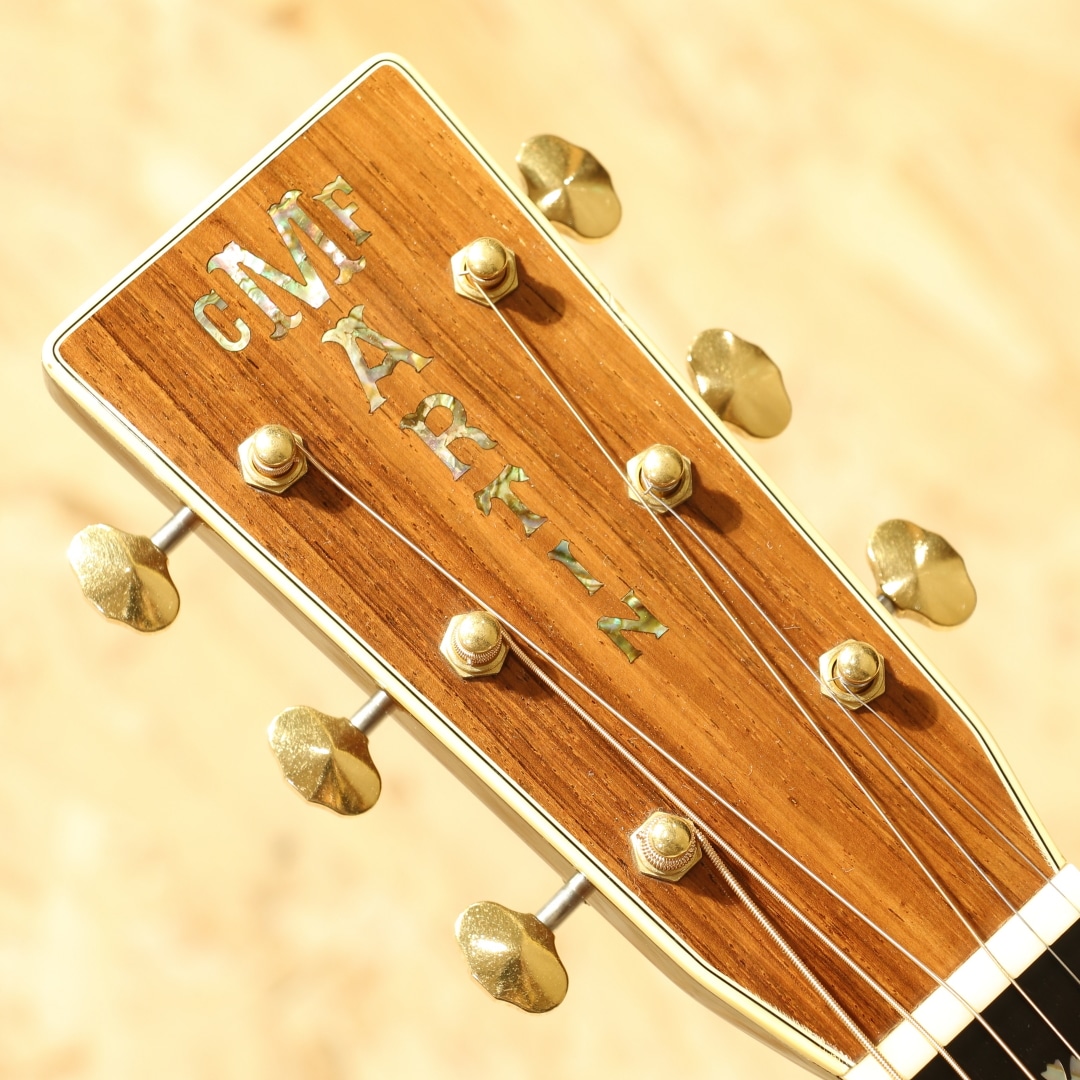1933年から1942年までに91本のみ製作されたオリジナル"D-45"。ジーン・オートリーの特注から始まったこの機種は、現在では市場で見ることも無く幻のヴィンテージギターの代表格に挙がるギターです。現在ではオーセンティックシリーズでの復刻モデルもありますが、数も少なく中々手にすることも少ないモデルです。本器は1996年にカスタムにて製造されたプリウォースタイルの"D-45"。現在のオーセンティックへと続く復刻モデルの先駆けとなった、均整の取れた木目の材を使用された貴重な1本です。キメ細かい木目のスプルーストップ、端正な杢のインディアンローズウッドサイド&バック、マホガニーネック、ムラの無いブラックエボニー指板&ブリッジ、ウェバリーゴールドペグ、バーチカルヘッドロゴ、スノーフレークアバロン指板インレイ、80sを感じさせる塗り込み薄い色合いのべっ甲柄ピックガード、メイプルブリッジプレート、アイボロイドバインディング、SQロッド、フォワードシフテッドスキャロップドXブレイシング。プリウォースタイルの復刻にてカスタムで造られた本器。現在ではヘキサゴン指板インレイのイメージが強いですが、当初はスノーフレーク指板インレイ。14Fジョイントの特徴も併せるとこれは1934-1938年までの間を狙った仕様です。もちろんロングサドル仕様で製作されており、現行品とはルックス面で一線を画す再現度を誇ります。ネックは当時のイメージでVシェイプネック、そして握り込みやすい42.9mmナット幅仕様。やや厚みを感じやすいグリップをナット幅でカバーし、握り込んだフォームにも対応し易い演奏性を獲得しています。トラスロッドにはADJではなく、SQ仕様としトラディショナルな太い響きを生み出す仕様へ。この仕様でしか出せない音色は確かにあり、この仕様に拘る方がおられるのも納得の違いがあります。そして現行品こそ仕様が近づきましたが、本器もフォワードシフトのスキャロップブレイシング仕様。ボリューム感も感じやすいですが、なによりもトーンの変化が大きく、ふくよかさや空気感を含み抱擁感のある音色。音の厚み感や軽いタッチでの反応性にも特徴を感じられ、太い音色は同時期のADJロッドでは出し得ないトーンです。そして45でしか体感できない独特のコーラス感とリバーブ感のある響き。基音の出力から後々に湧き出る倍音はこれぞ45サウンドです。流石の風格と音色を生み出すカスタムD45、演奏スタイルを選ばない1本です。ボディサイド1弦側に2か所程僅かな当てキズが見られますが、全体を通しても塗装表面上の極々薄い線キズ程で非常にキレイな状態をキープ。30年近くの経年を感じさせない程のキレイさを保たれています。ネック周りの演奏性もグッド、サドルの高さも充分残されておりこれからも使用していけるD45カスタムです。拘りを持って復刻された、現代のオーセンティックへと続く復刻モデルの先駆けともなった1本。美しいルックスと魅力的なサウンドの逸品です。"D-45"でも人とは違う1本をお求めの方に。是非一度ご体感下さいませ。