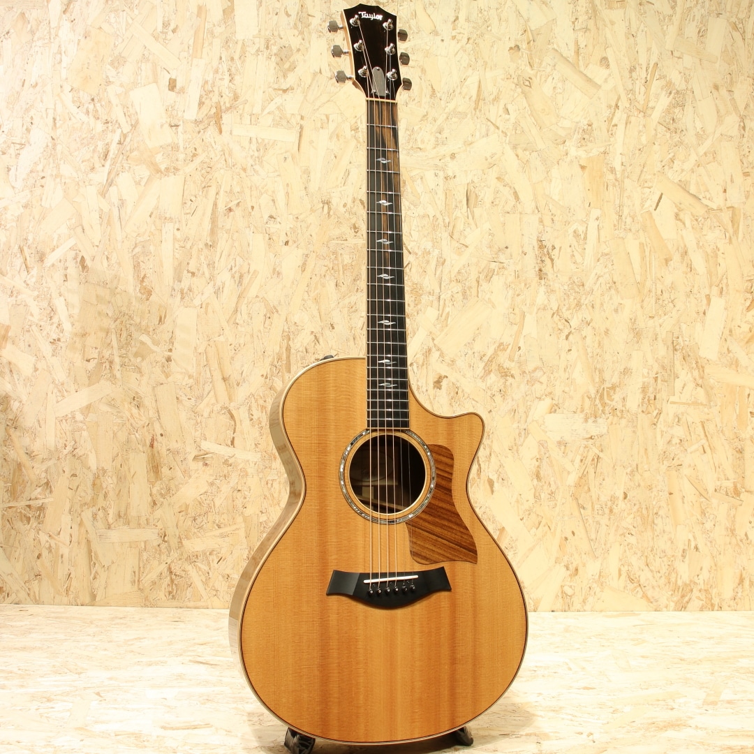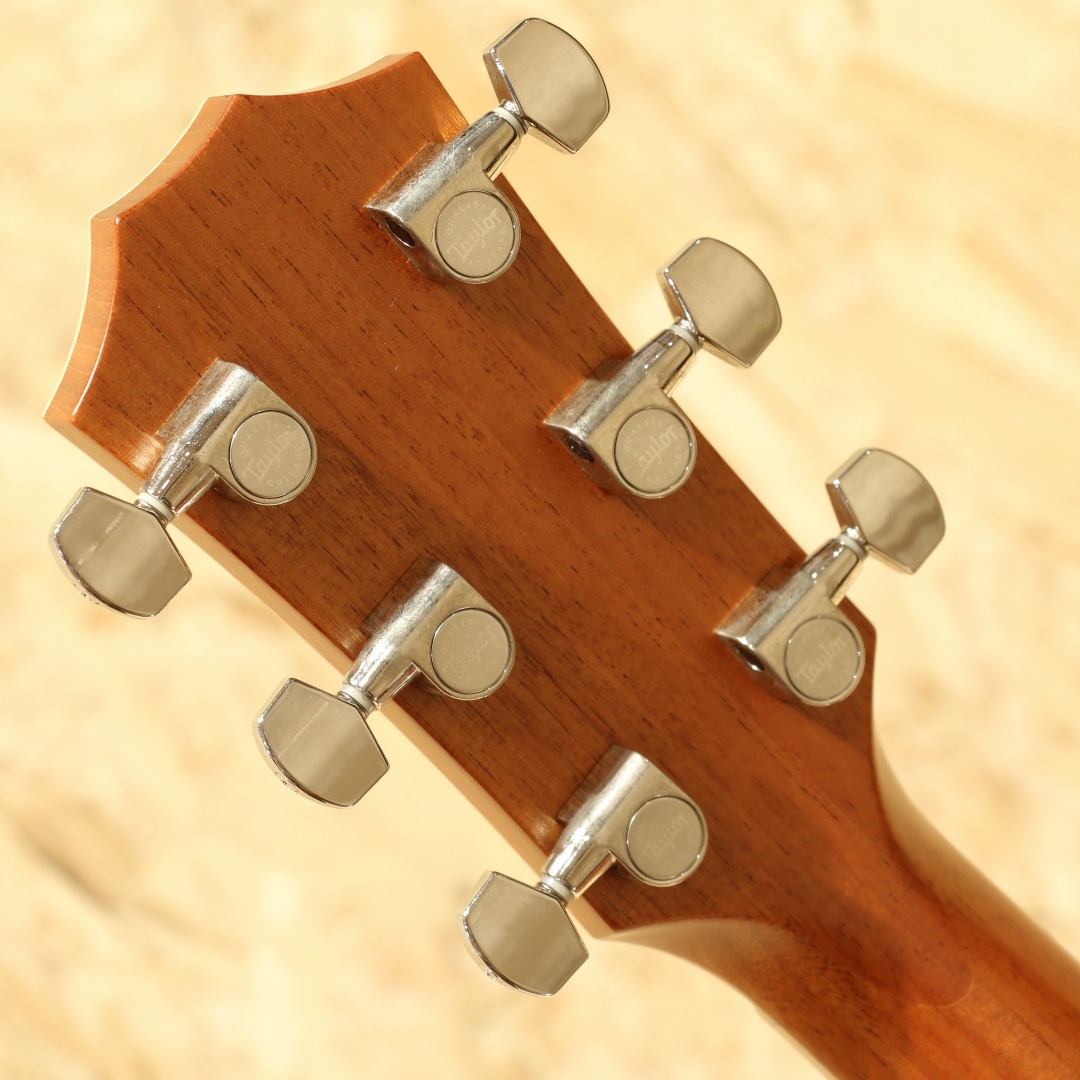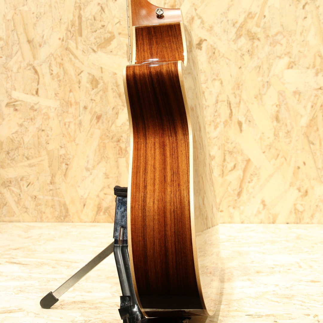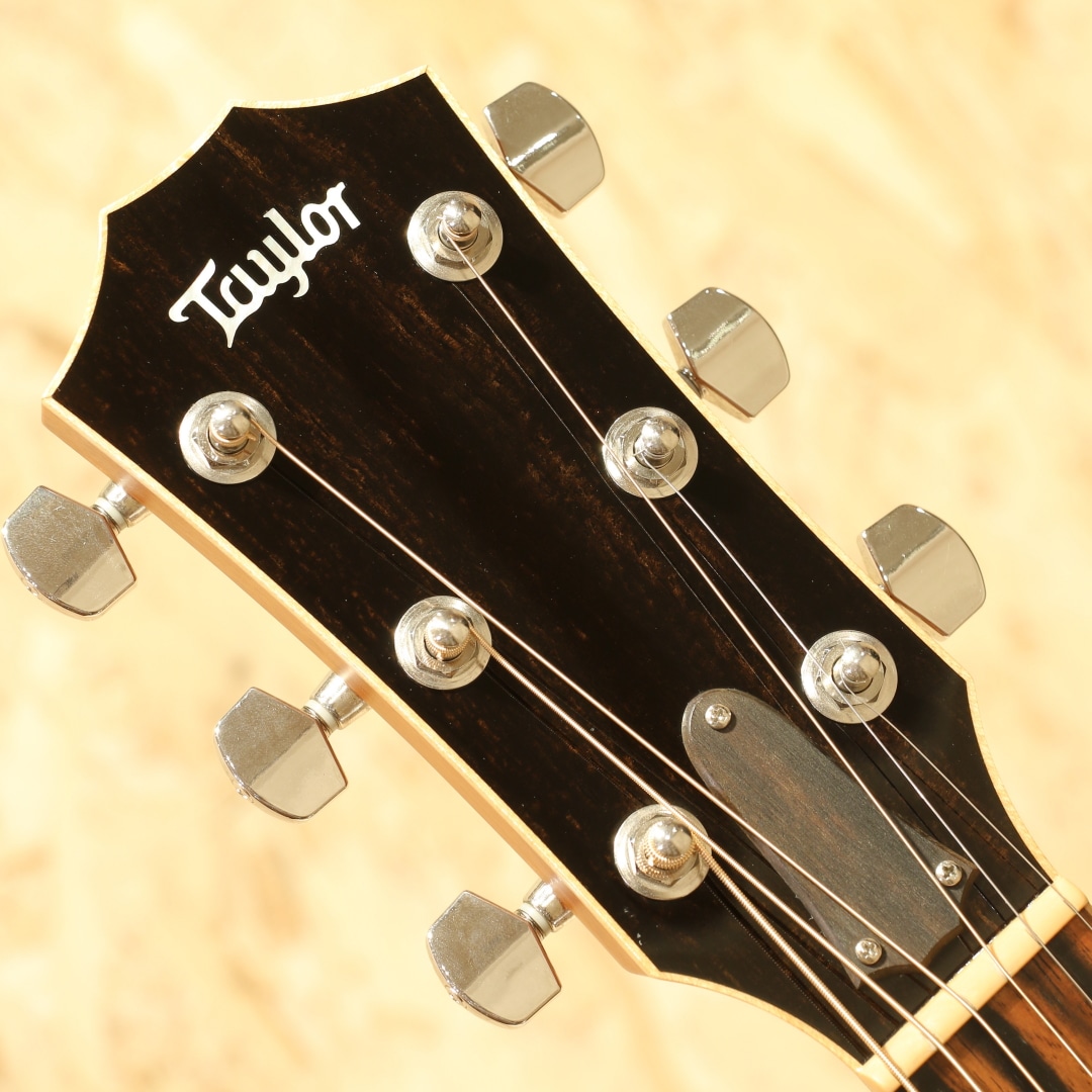 1974年にボブ・テイラーとカート・リスタグの2人によって創立されたテイラー・ギター。革新的なアイデアと高い技術力、ハイセンスなマーケティングで2000年代より急速に成長し、今や世界のトップアコースティックブランドとして、一般ユーザーからプロミュージシャンまで、幅広い層から確固たる支持を得ています。本器はテイラーレギュラーラインナップの中でもフラッグシップに当たる800番台、小ぶりなサイズ感"812ce"。2017年製USED品です。シトカスプルーストップ、インディアンローズウッドサイド&バック、トロピカルマホガニーネック、エボニー指板&ブリッジ、アバロンロゼッタ、メイプルバインディング、ゴトー製510ペグ、ウッドピックガード、Xブレーシング仕様、ES2ピックアップ搭載。フラッグシップに位置する800番台、もちろん木材のランクも厳選されたものを使用して製造されています。900番台と比較しても装飾部分などの違いはあるものの、コストパフォーマンスに優れた仕様。指板の装飾やバインディング、ロゼッタなど手間のかかる仕様を惜しみなく搭載しておりフラッグシップの名に恥じない仕上がり。型番の一桁グランドコンサートサイズを表し、小型特有の音の立ち上がり速度の速さや密度感のある中域を得意とします。真ん中の1は比較的柔らかい材の6弦モデルを表し、スプルーストップである事を表しています。本器はV-Classとなる少し前の仕様で、バックブレイシングが斜め、トップはXブレイシングの仕様です。やはり安定感のあるトーン、スプルースとローズの組み合わせは古くから定番となっている為安心感を覚えます。スプルーストップ特有の乾いた響き、キンと響きすぎない柔らかさを伴った音色。ローズでレンジ感広く煌びやかな倍音感を覚え、音色にも重厚さを与えてくれます。テイラーのサウンド自体も上品さがあり、癖の無いサウンドから扱うジャンルを選ばないところも様々なミュージシャンに愛用されている一因です。歌モノからソロギターまでこなせるオールラウンダー。どのジャンルやスタイルでも得手不得手を感じさせない柔軟さ、バランスの良さは随一です。整理された倍音感から音色のバランスが良く、軽めのタッチ感でも反応しやすい点からフィンガーピッカーにもオススメできる1本です。ピックアップにはES2ピックアップシステムを搭載。テイラー独自のシステムでサドル横にピエゾを仕込むことで、よりナチュラルなラインサウンドを出力する事が出来ます。コントローラーはボディサイドに3つ、Bass,Treble,Volとシンプルなため操作に迷うこともありません。生でもラインでも活躍できる、現代では宅録配信までこなせる優秀なギターです。ボディトップ面カッタウェイ付近やブリッジ1弦側付近、くびれ付近の縁に僅かな当てキズが見られるものの、全体を通して使用感は非常に薄く、キレイなコンディションをキープ。ネック周りの状態、サドル残、弦高と弾きやすい状態に整えられており、このサイズならではの演奏性を存分に発揮してくれる個体です。現行品のVブレーシングの個体とはまた異なるテイストのテイラー800番台。テイラーフラッグシップのクオリティ、是非お手元でご体感ください。
