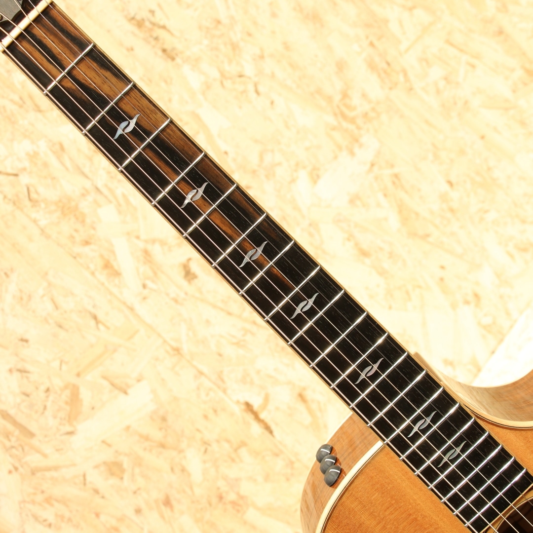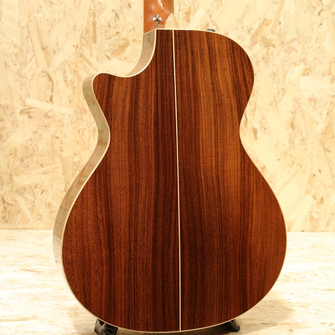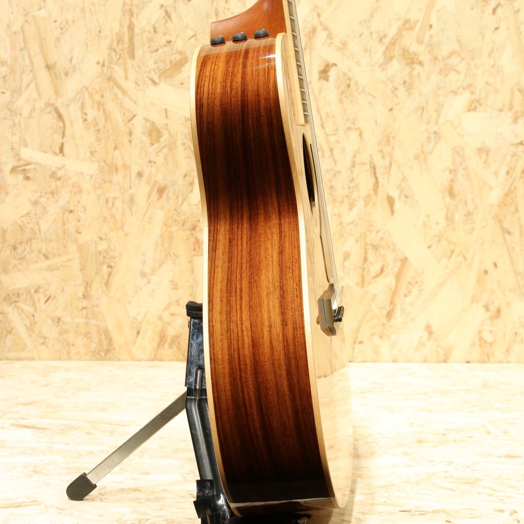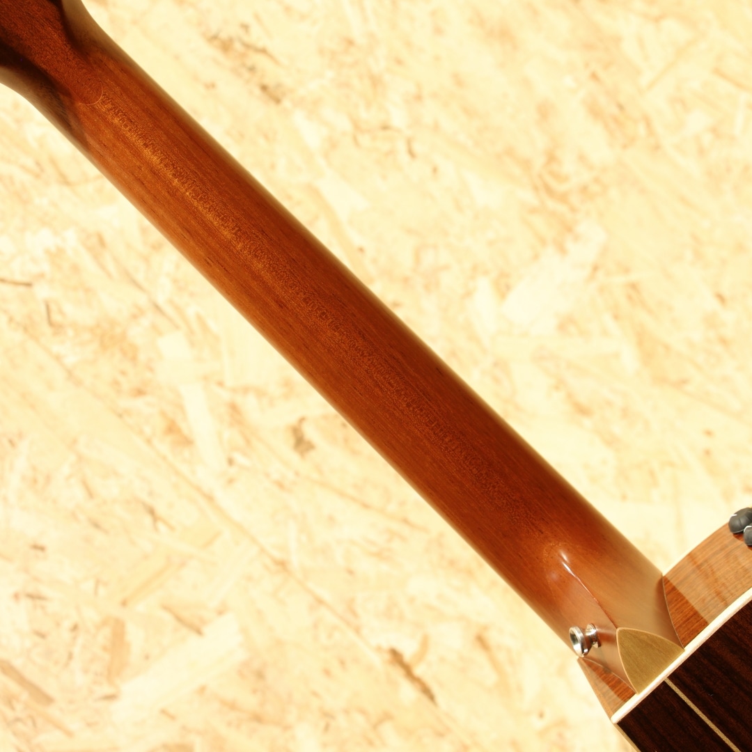 1974年にボブ・テイラーとカート・リスタグの2人によって創立されたテイラー・ギター。革新的なアイデアと高い技術力、ハイセンスなマーケティングで2000年代より急速に成長し、今や世界のトップアコースティックブランドとして、一般ユーザーからプロミュージシャンまで、幅広い層から確固たる支持を得ています。本器はテイラーレギュラーラインナップの中でもフラッグシップに当たる800番台、小ぶりなサイズ感"812ce"。2017年製USED品です。シトカスプルーストップ、インディアンローズウッドサイド&バック、トロピカルマホガニーネック、エボニー指板&ブリッジ、アバロンロゼッタ、メイプルバインディング、ゴトー製510ペグ、ウッドピックガード、Xブレーシング仕様、ES2ピックアップ搭載。フラッグシップに位置する800番台、もちろん木材のランクも厳選されたものを使用して製造されています。900番台と比較しても装飾部分などの違いはあるものの、コストパフォーマンスに優れた仕様。指板の装飾やバインディング、ロゼッタなど手間のかかる仕様を惜しみなく搭載しておりフラッグシップの名に恥じない仕上がり。型番の一桁グランドコンサートサイズを表し、小型特有の音の立ち上がり速度の速さや密度感のある中域を得意とします。真ん中の1は比較的柔らかい材の6弦モデルを表し、スプルーストップである事を表しています。本器はV-Classとなる少し前の仕様で、バックブレイシングが斜め、トップはXブレイシングの仕様です。やはり安定感のあるトーン、スプルースとローズの組み合わせは古くから定番となっている為安心感を覚えます。スプルーストップ特有の乾いた響き、キンと響きすぎない柔らかさを伴った音色。ローズでレンジ感広く煌びやかな倍音感を覚え、音色にも重厚さを与えてくれます。テイラーのサウンド自体も上品さがあり、癖の無いサウンドから扱うジャンルを選ばないところも様々なミュージシャンに愛用されている一因です。歌モノからソロギターまでこなせるオールラウンダー。どのジャンルやスタイルでも得手不得手を感じさせない柔軟さ、バランスの良さは随一です。整理された倍音感から音色のバランスが良く、軽めのタッチ感でも反応しやすい点からフィンガーピッカーにもオススメできる1本です。ピックアップにはES2ピックアップシステムを搭載。テイラー独自のシステムでサドル横にピエゾを仕込むことで、よりナチュラルなラインサウンドを出力する事が出来ます。コントローラーはボディサイドに3つ、Bass,Treble,Volとシンプルなため操作に迷うこともありません。生でもラインでも活躍できる、現代では宅録配信までこなせる優秀なギターです。ボディトップ面カッタウェイ付近やブリッジ1弦側付近、くびれ付近の縁に僅かな当てキズが見られるものの、全体を通して使用感は非常に薄く、キレイなコンディションをキープ。ネック周りの状態、サドル残、弦高と弾きやすい状態に整えられており、このサイズならではの演奏性を存分に発揮してくれる個体です。現行品のVブレーシングの個体とはまた異なるテイストのテイラー800番台。テイラーフラッグシップのクオリティ、是非お手元でご体感ください。