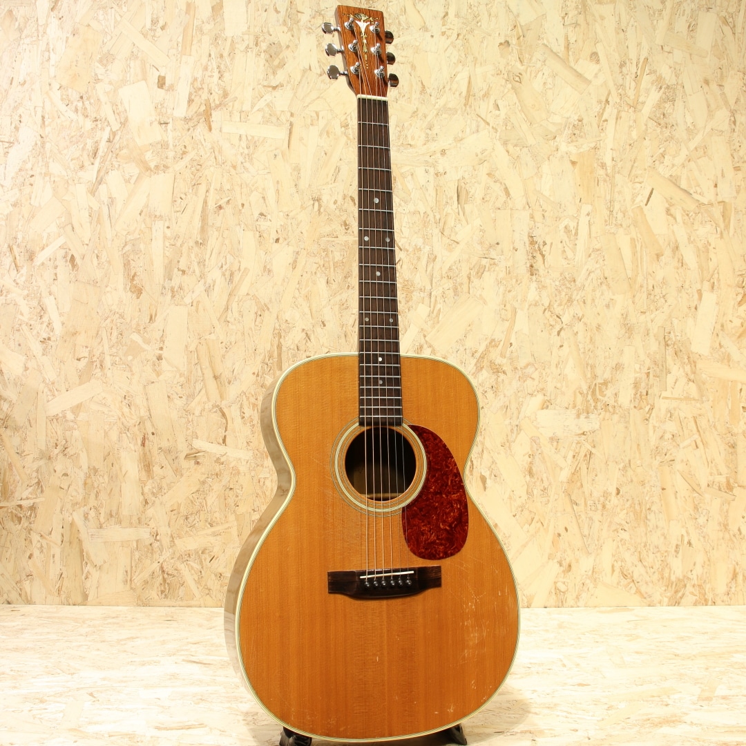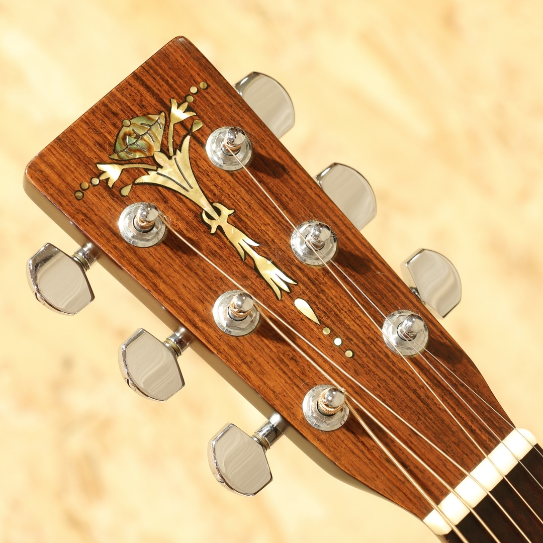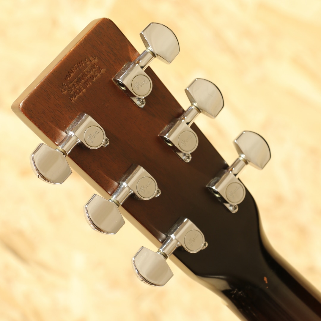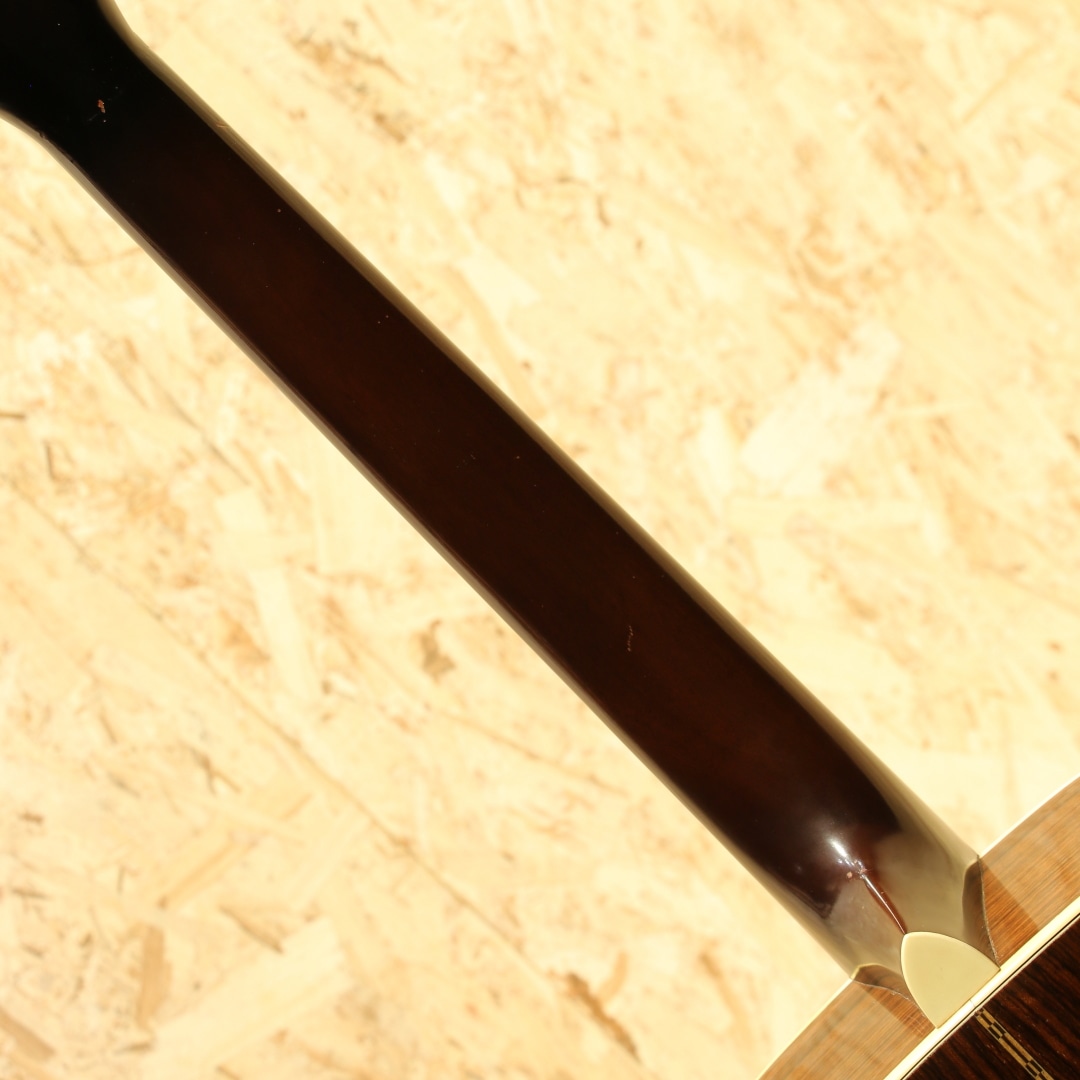 1983年より生まれたシェナンドー。当時のアコースティック不振の最中に、手頃に手に入るギターを作ろうとして立ち上げられたブランドでした。80年代は日本で製作したボディとネックを、マーチン社で組み上げと仕上げまでを行っていました。その後完全に国産で作られる時代を経て終幕を迎えたブランドです。本器はOOO-28タイプで製作を行われた”OOO-2832”。1980年代製のUSED品です。スプルーストップ、マホガニーサイド&バック、マホガニーネック、ローズウッド指板&ブリッジ、ドット指板ポジション。シェナンドーブランドは1984年から1987年までマーチンの売上の25%以上を支えたとも言われており、マーチンが苦境を乗り越えることが出来た1つの要因でもありました。マーチンのスタンダードなモデルをベースとして、合板のサイドバックを使用したスペックで製作。標準でThinline-332ピックアップとADJトラスロッドを搭載した仕様を採用されていました。このブランドで製作を行う中でピックガードの接着方式も見直され、後にマーチンブランドでもADJトラスロッドとピックガード後貼り方式は採用されていきます。更にその後には合板を使用したモデルを本家マーチンで発表し、本ブランドで培ったノウハウを活かした製作を開始しました。マーチンの歴史的にも一つの転換点となったブランドと言えますが、およそ9年程でマーチンでの製作を終了しています。本器はOOOサイズで機動性に優れた特徴と抱え易さ、そしてトーンバランスに優れたサウンドが持ち味。低音が出すぎずに高音が埋もれないことから、美味しいところを前に出しやすい点も魅力と言えます。そしてDサイズよりも音域が中域寄りとなるため、音の密度が上がり解像度の高い響きとなる点も美味しいポイント。フィンガーでのキレイな響き、アルペジオの粒立ち良いサウンド、ストロークでも音の分離感からコード感を伝えやすいメリットを持ちます。演奏スタイルを問わず扱いやすい点、ギターだけをメインで弾く方にも抱えやすく演奏性が高い点や押し出し感のある響きから好まれるであろうオールマイティな1本です。ヘッド付け根に黒い塗装が施されておりますが、割れや折れの痕跡は見られず使用上問題の無い状態となっています。やはり経年故に細かな擦れキズ、若干深めの擦れキズ、細やかな当てキズやサウンドホール周りに弾きキズ等見られますが使用上問題のある状態ではなく、板の割れは見られずでまだまだ使用していける状態です。ネックのコンディションも良好、サドル残はこの当時の楽器の為若干少なくなっていますが弦高としても現代的なセッティングで演奏性良し。廉価版として製作されていたシェナンドー、掘り下げると本家の歴史にも僅かながら影響を与えていました。アコースティック不遇の時代を乗り切るために本家マーチンを支えたブランド。その歴史を垣間見ることができ、比較的リーズナブルな点からも手に取りやすい1本。是非ご検討下さいませ。