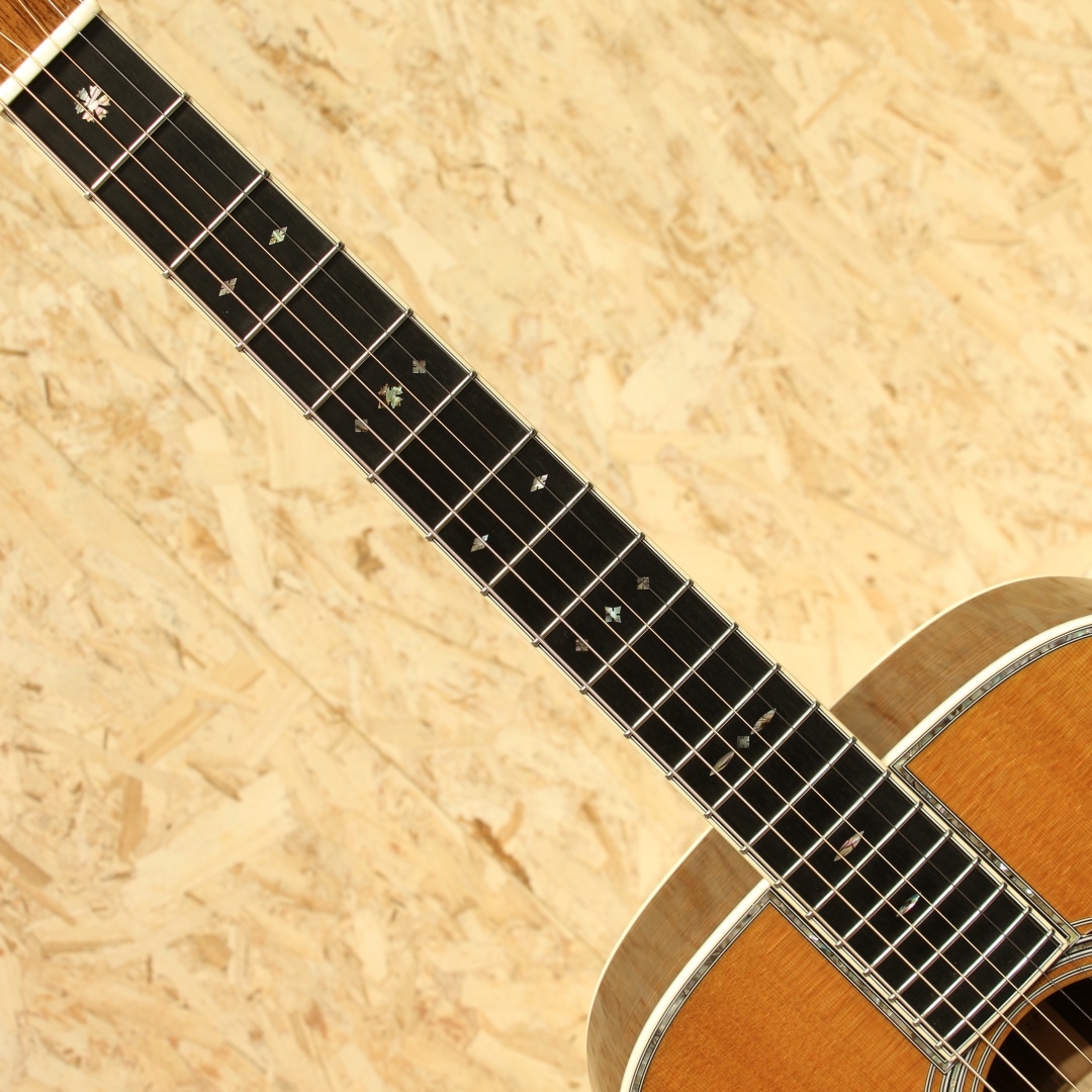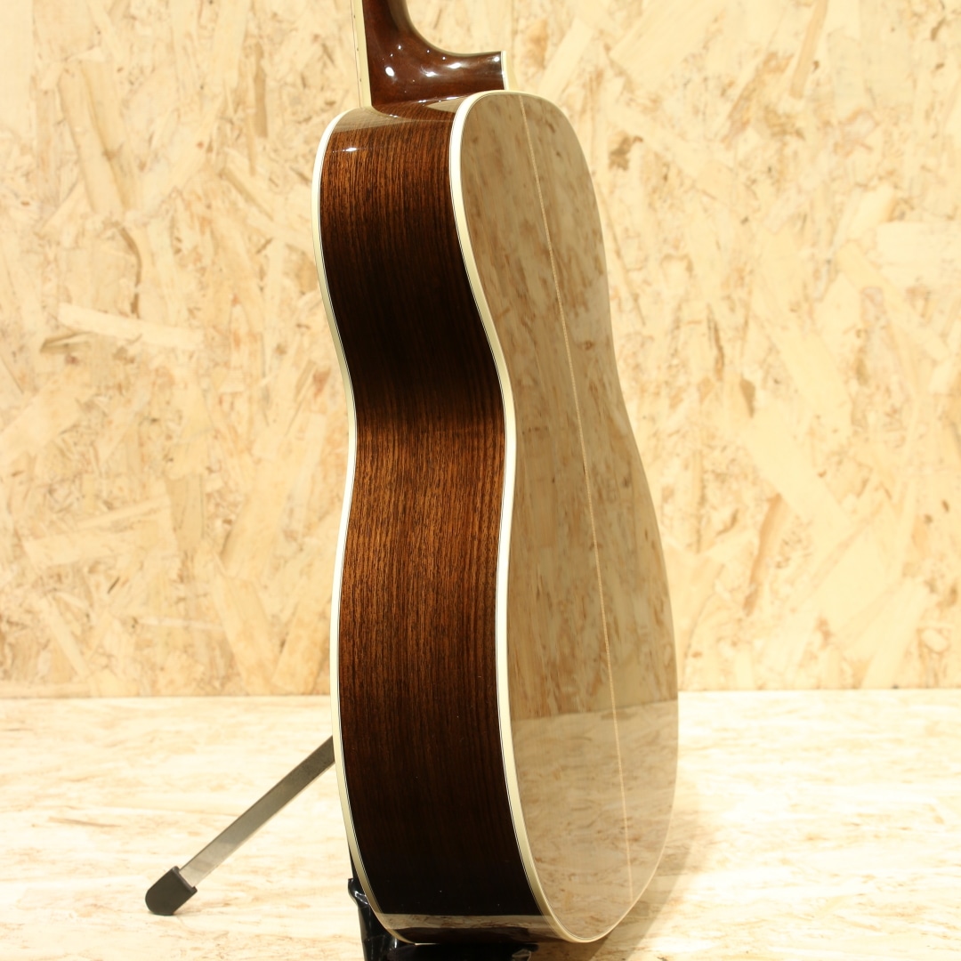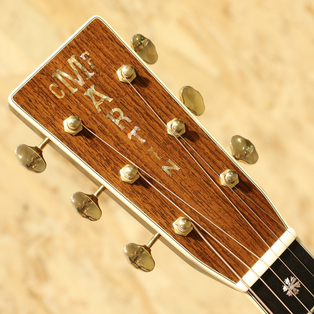 41よりも一層ファンシーなデザインで、マーチン40番台の中でも人気の高いモデル"42"。スタイル42は19世紀からある伝統のデザインで、スタイル45の元となる由緒正しいモデルです。今年に仕様変更が入りましたが、本器は2018年に仕様変更が入った後の仕様。2020年製のUSED品です。シトカスプルーストップ、イーストインディアンローズウッドサイド&バック、ジニュインマホガニーネック、エボニー指板&ブリッジ、グローバーオープンバックペグ、バーチカルヘッドロゴ、スノーフレイクス指板インレイ、ベッコウ柄ピックガード、アバロンロゼッタ&トリム、モザイクバックストリップ、スキャロップドXブレイシング。多くの方が憧れる45のすぐ下に位置しているスタイル42。45が生まれる前は42がフラッグシップとして君臨していました。指板横にも入ったインレイ、スノーフレイク指板インレイは戦前より変わりません。2018年以降は戦前のテイストをより強めた仕様として生まれ変わりました。今ではお馴染みとなった44.5mmのナット幅と薄平形状のネックシェイプ。ハイポジションまで弾き応えの変わらないネックテーパー等、ローポジションからハイポジションまで万遍なく使用しやすい仕様となっています。ブリッジはショートサドル仕様で、後のピックアップ搭載のし易さも考慮された現代仕様へ。総じてトラディショナルを押さえつつ、演奏性に関わる箇所は現代仕様へとアップデートされたモデルとなっています。40番台らしい華やかなルックス、そのルックスに見合うだけの華やかな響きを与えられており、奥から響いてくる倍音感は流石の40番台。後から湧き出てくるような出方、ゆったりと演奏をした際にその豊かな響きを堪能して頂けるでしょう。音の立体感、厚み、空気感を感じさせるサウンド。演奏スタイルはさほど選ばずストロークでゆったり演奏しても良し、フィンガーで繊細な倍音感を感じつつ演奏しても良し。音に包まれるような感覚が非常に心地よく、上品さを感じさせるそのサウンドは、やはりいつの時代も憧れとなり得ます。ボディトップ面下部6弦側にやや深めの当てキズが見られるのが惜しい点。ブリッジ6弦側端に僅かなウェザーチェックと全体に極僅かなクロスでの拭きキズが見られる程で非常にキレイな状態をキープされています。ネックのコンディションも非常に良いコンディションを保たれており、サドル残とロッド残り共に充分。弦高もやや低めで弾きやすいアクションとなっています。これからもしっかりと演奏していける1本。今年に入って若干の仕様変更こそ入りましたが、基本軸は変わらずトラッドとモダンの融合です。現代基準の演奏性で心地よく弾けるギター、憧れの縦ロゴマーチン。新品購入をお考えの方には大変魅力的な1本ではないでしょうか。