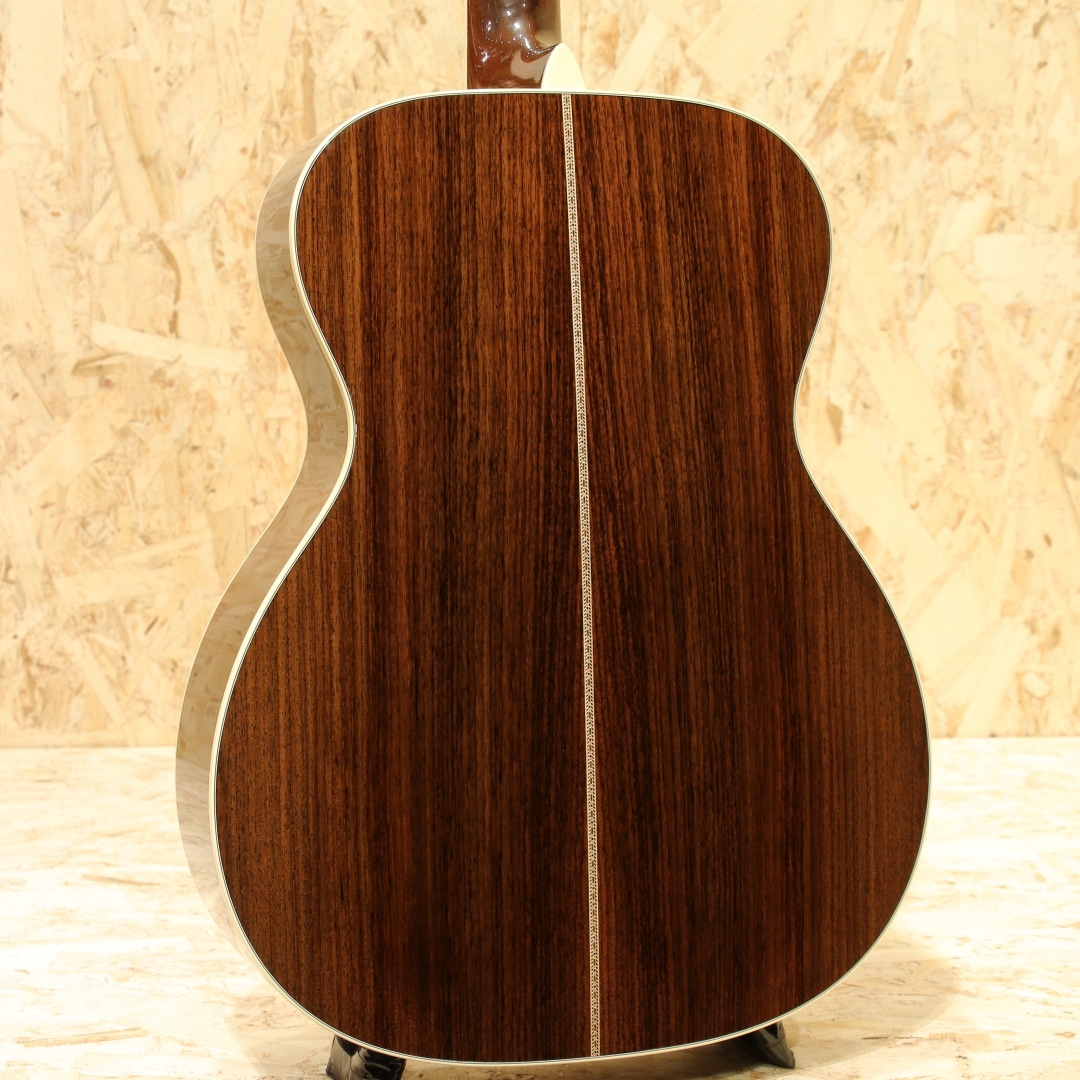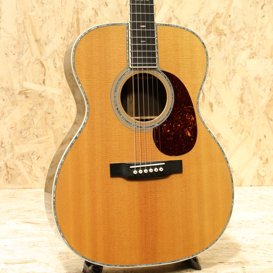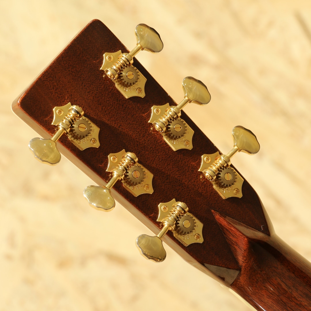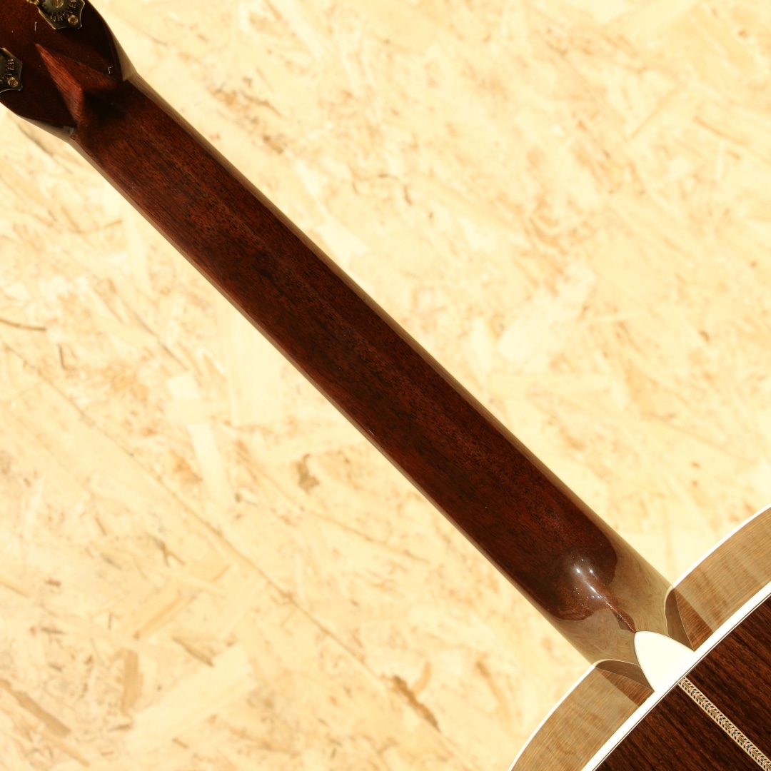 41よりも一層ファンシーなデザインで、マーチン40番台の中でも人気の高いモデル"42"。スタイル42は19世紀からある伝統のデザインで、スタイル45の元となる由緒正しいモデルです。今年に仕様変更が入りましたが、本器は2018年に仕様変更が入った後の仕様。2020年製のUSED品です。シトカスプルーストップ、イーストインディアンローズウッドサイド&バック、ジニュインマホガニーネック、エボニー指板&ブリッジ、グローバーオープンバックペグ、バーチカルヘッドロゴ、スノーフレイクス指板インレイ、ベッコウ柄ピックガード、アバロンロゼッタ&トリム、モザイクバックストリップ、スキャロップドXブレイシング。多くの方が憧れる45のすぐ下に位置しているスタイル42。45が生まれる前は42がフラッグシップとして君臨していました。指板横にも入ったインレイ、スノーフレイク指板インレイは戦前より変わりません。2018年以降は戦前のテイストをより強めた仕様として生まれ変わりました。今ではお馴染みとなった44.5mmのナット幅と薄平形状のネックシェイプ。ハイポジションまで弾き応えの変わらないネックテーパー等、ローポジションからハイポジションまで万遍なく使用しやすい仕様となっています。ブリッジはショートサドル仕様で、後のピックアップ搭載のし易さも考慮された現代仕様へ。総じてトラディショナルを押さえつつ、演奏性に関わる箇所は現代仕様へとアップデートされたモデルとなっています。40番台らしい華やかなルックス、そのルックスに見合うだけの華やかな響きを与えられており、奥から響いてくる倍音感は流石の40番台。後から湧き出てくるような出方、ゆったりと演奏をした際にその豊かな響きを堪能して頂けるでしょう。音の立体感、厚み、空気感を感じさせるサウンド。演奏スタイルはさほど選ばずストロークでゆったり演奏しても良し、フィンガーで繊細な倍音感を感じつつ演奏しても良し。音に包まれるような感覚が非常に心地よく、上品さを感じさせるそのサウンドは、やはりいつの時代も憧れとなり得ます。ボディトップ面下部6弦側にやや深めの当てキズが見られるのが惜しい点。ブリッジ6弦側端に僅かなウェザーチェックと全体に極僅かなクロスでの拭きキズが見られる程で非常にキレイな状態をキープされています。ネックのコンディションも非常に良いコンディションを保たれており、サドル残とロッド残り共に充分。弦高もやや低めで弾きやすいアクションとなっています。これからもしっかりと演奏していける1本。今年に入って若干の仕様変更こそ入りましたが、基本軸は変わらずトラッドとモダンの融合です。現代基準の演奏性で心地よく弾けるギター、憧れの縦ロゴマーチン。新品購入をお考えの方には大変魅力的な1本ではないでしょうか。