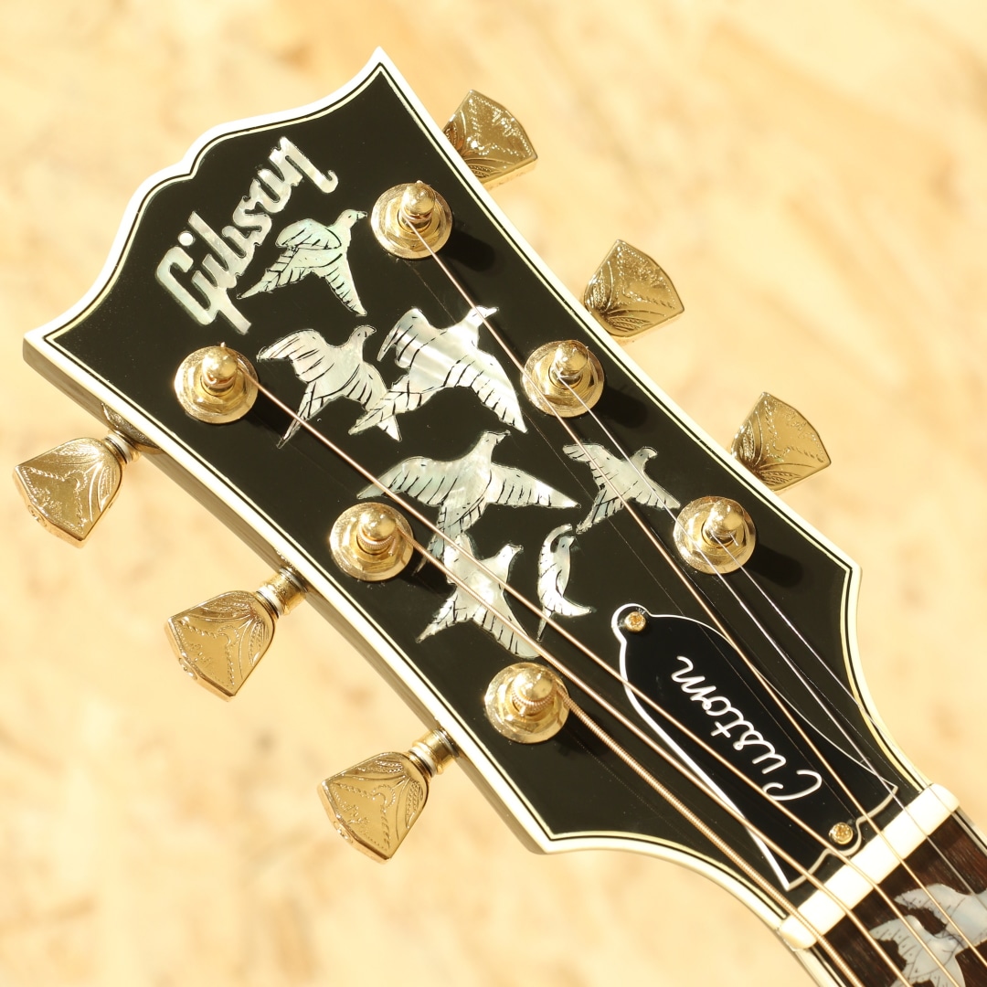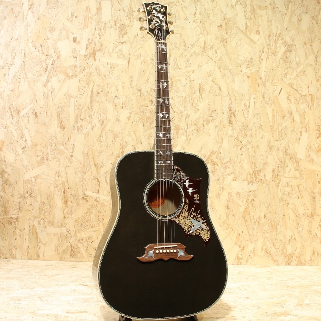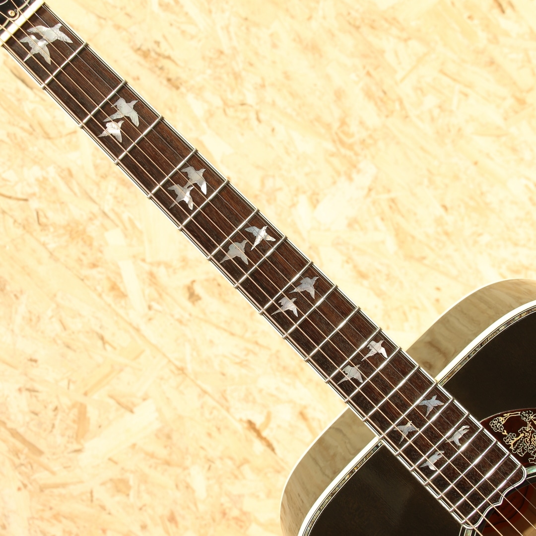 ギブソンモンタナのカスタムショップモデルにて極少数のみ生産されているDOVEの最高峰"Doves In Flight"。本器は2014年製造の1本。現在では生産されていない"トランスブラックカラー"にて当時少量限定生産されたレアな一品です。シースルーブラックの奥に映えるスプルーストップと均一で綺麗なフレイム杢のメイプルサイド&バック。ネックも同様にフレイムメイプルが採用されています。ローズウッド指板&ブリッジ、手彫りによるオリジナル装飾ピックガード、彫金グローバーゴールドペグ、アバロンロゼッタ&ボディトップトリム、スキャロップド・エックスブレイシング。本器はモンタナ期より考案されハミングバードに続くスクエアショルダー型アコースティックギターとして1962年に発売されたダブの現代期の中でも格別の華やかさを誇る一台です。現在は引退した近年ギブソンのレジェンド、"レン・ファーガソン"に氏よるインレイデザインのギターで、平和の象徴とされる鳩がややダークで落ち着いた色味のパールをすべてハンドカットでインレイされています。ドレッドノートボディから生まれるボリューミーな音で、非常にブライトなサウンドが持ち味です。一本芯の通った基音、それにさり気なく被さるしなやかな倍音。六十年代を彷彿とさせるナット幅実寸39.5ミリのナローネック仕様となっている点もこの機種の楽しい所です。良質の材料と確かな木工から成る完成度の高い一台。揺らめきのある杢に妖艶なカラーは魅力的で特別なオーラを放っています。1羽として同じデザインの物が無い28羽の鳩をフィンガーボードやピックガードなどにあしらった絶品。ボディバック面には打ちキズが少し見られます。ネック裏からヘッド裏に材の継ぎ目に沿って塗装引きが見られ、うっすらと白い筋が確認できますが表面上のものでご使用に影響はございません。ゴールドパーツの僅かなくすみや暗色の為、表面傷等は分かりますが、割れ等の補修もなく10年の経過を思えば綺麗なコンディションといえます。搭載ピックアップはFISHMAN社のアンダーサドルピエゾタイプ。パッシブ仕様で電池切れも心配はなく、ノンコントローラーの為、別途プリアンプなどのご使用でサウンドメイクの幅が広がります。もちろんそのままご使用もいただけます。昨今、新品流通の少ない本モデルですが、限定カラーとなると殆ど見かけず希少なモデルです。弾いて良し、飾って良しの人気なカスタムモデル、是非この機会をお見逃しなく。汎用ハードケースが付属します。