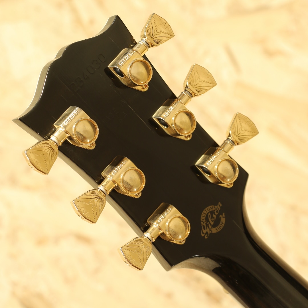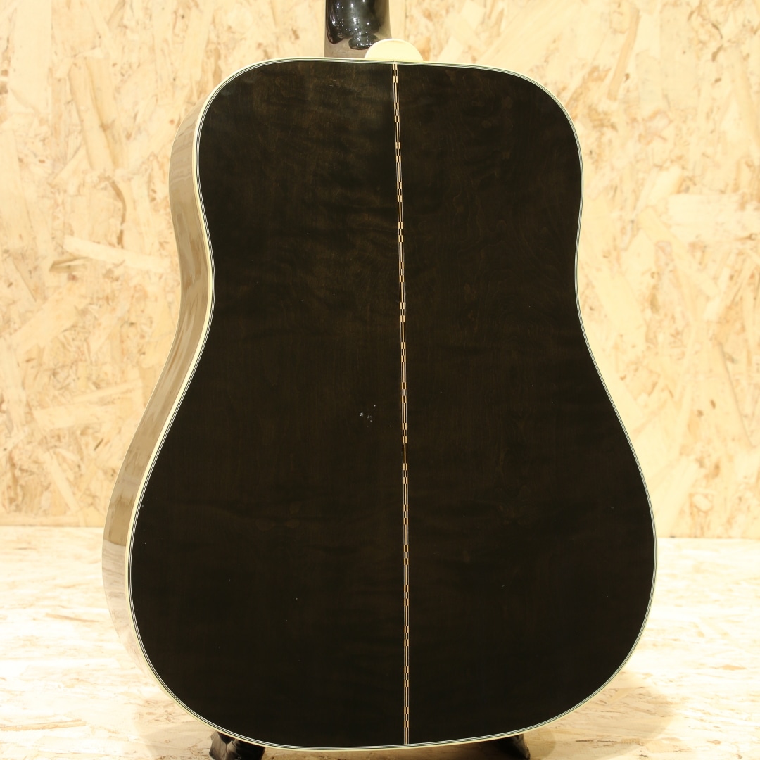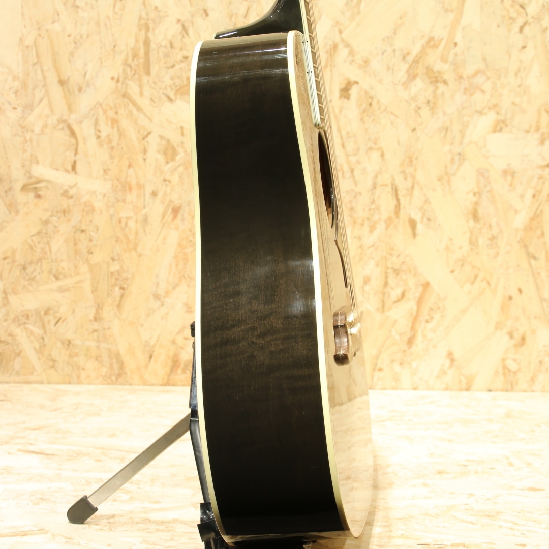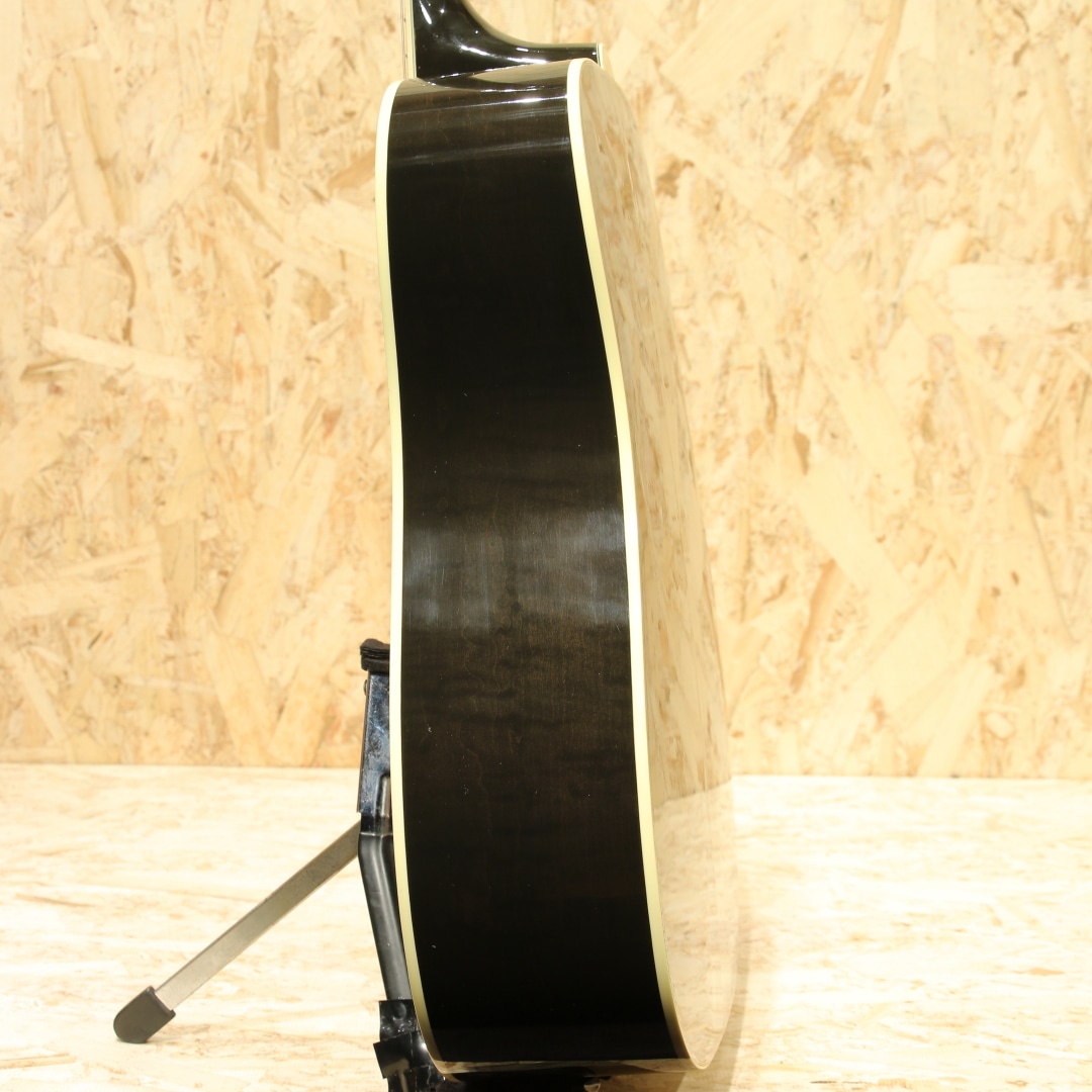 ギブソンモンタナのカスタムショップモデルにて極少数のみ生産されているDOVEの最高峰"Doves In Flight"。本器は2014年製造の1本。現在では生産されていない"トランスブラックカラー"にて当時少量限定生産されたレアな一品です。シースルーブラックの奥に映えるスプルーストップと均一で綺麗なフレイム杢のメイプルサイド&バック。ネックも同様にフレイムメイプルが採用されています。ローズウッド指板&ブリッジ、手彫りによるオリジナル装飾ピックガード、彫金グローバーゴールドペグ、アバロンロゼッタ&ボディトップトリム、スキャロップド・エックスブレイシング。本器はモンタナ期より考案されハミングバードに続くスクエアショルダー型アコースティックギターとして1962年に発売されたダブの現代期の中でも格別の華やかさを誇る一台です。現在は引退した近年ギブソンのレジェンド、"レン・ファーガソン"に氏よるインレイデザインのギターで、平和の象徴とされる鳩がややダークで落ち着いた色味のパールをすべてハンドカットでインレイされています。ドレッドノートボディから生まれるボリューミーな音で、非常にブライトなサウンドが持ち味です。一本芯の通った基音、それにさり気なく被さるしなやかな倍音。六十年代を彷彿とさせるナット幅実寸39.5ミリのナローネック仕様となっている点もこの機種の楽しい所です。良質の材料と確かな木工から成る完成度の高い一台。揺らめきのある杢に妖艶なカラーは魅力的で特別なオーラを放っています。1羽として同じデザインの物が無い28羽の鳩をフィンガーボードやピックガードなどにあしらった絶品。ボディバック面には打ちキズが少し見られます。ネック裏からヘッド裏に材の継ぎ目に沿って塗装引きが見られ、うっすらと白い筋が確認できますが表面上のものでご使用に影響はございません。ゴールドパーツの僅かなくすみや暗色の為、表面傷等は分かりますが、割れ等の補修もなく10年の経過を思えば綺麗なコンディションといえます。搭載ピックアップはFISHMAN社のアンダーサドルピエゾタイプ。パッシブ仕様で電池切れも心配はなく、ノンコントローラーの為、別途プリアンプなどのご使用でサウンドメイクの幅が広がります。もちろんそのままご使用もいただけます。昨今、新品流通の少ない本モデルですが、限定カラーとなると殆ど見かけず希少なモデルです。弾いて良し、飾って良しの人気なカスタムモデル、是非この機会をお見逃しなく。汎用ハードケースが付属します。