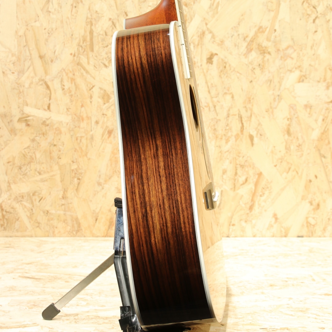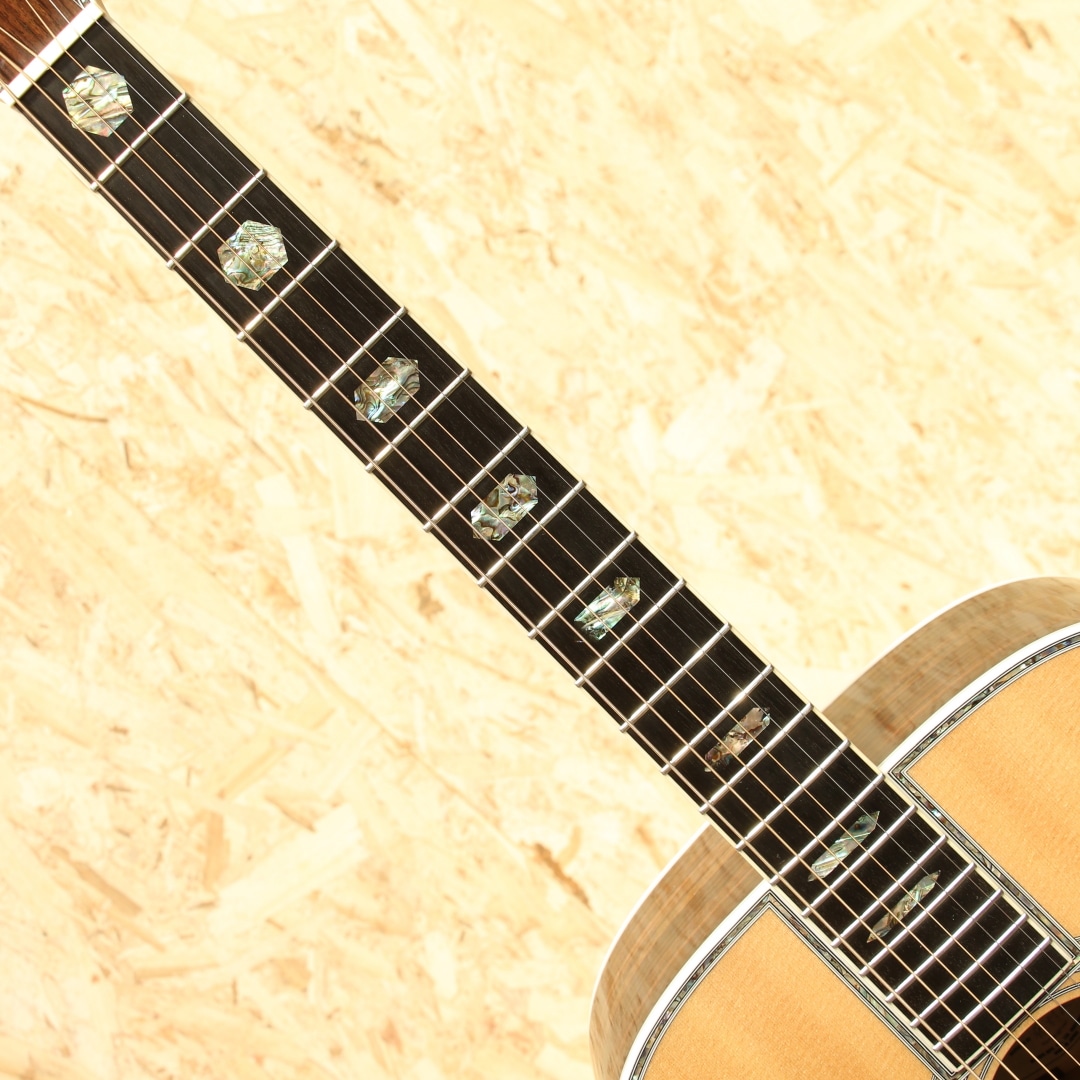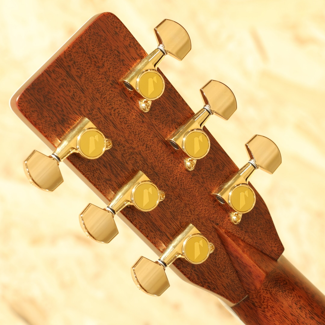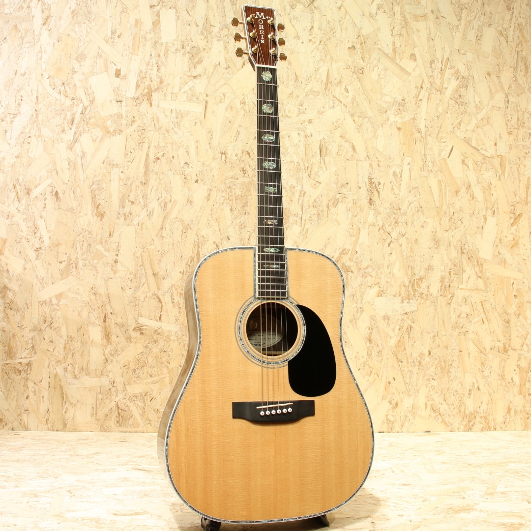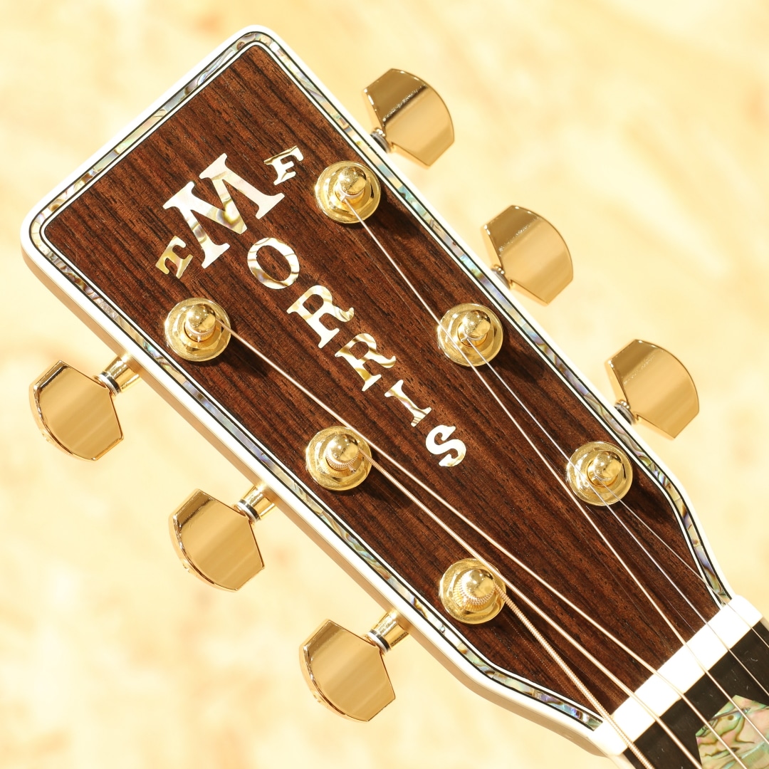 言わずと知れた国産老舗ブランド、MORRIS。本器はモーリス楽器製造株式会社と共にモーリスギターをプロデュースし続けてきた株式会社モリダイラ楽器の創業50周年を記念して企画され、50本限定で製造された特別限定モデル。”PREMIUM”2016年製USED品です。シトカスプルーストップ、インディアンローズウッドサイド&バック、エボニー指板&ブリッジ、ローズウッドバインディング、Xブレイシング、アバロントリム、オリジナルゴールドペグ。ヘッド・ピックガード・ブリッジの形状は現在のMorrisではオーダー品を含め生産されておらず、ヘッドインレイも旧タイプのロゴを採用するなど往年の名器を彷彿させつつ細部のインレイにアバロンを採用することでルックスはまさに豪華絢爛。サウンドホール内のラベルも本シリーズ限定の特別デザインとなっており、周年記念品として昇華された特別なモデルとなっています。サウンド面は高音の抜けの良さとダイナミックレンジの広さ、クリアで張りのある煌びやかな高音が特徴のスプルースと、耳当たりの心地よい煌びやかな中高音と重すぎずスッキリ聴こえるもののしっかり支えてくれる低音域を奏でるローズウッドの組み合わせにより粒立ちのハッキリとした明瞭なサウンド。フラットピックはもちろんのこと、軽いタッチでも良く鳴るので、フィンガースタイルでもドレッドノートのポテンシャルを期待できます。全体を通して見ても綺麗なコンディションが保たれている本器。ゴールドパーツによく見受けられるくすみもほぼほぼ見受けられません。ネック・プレイコンディション共に良好で即戦力間違いなしのギターです。オール単板、国産ハンドメイドのクオリティを是非お手元でご体感ください。オリジナルハードケースが付属します。