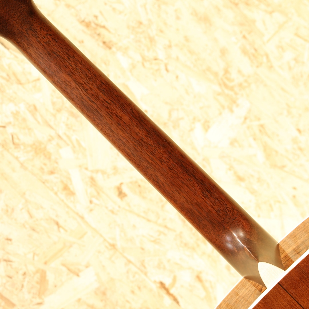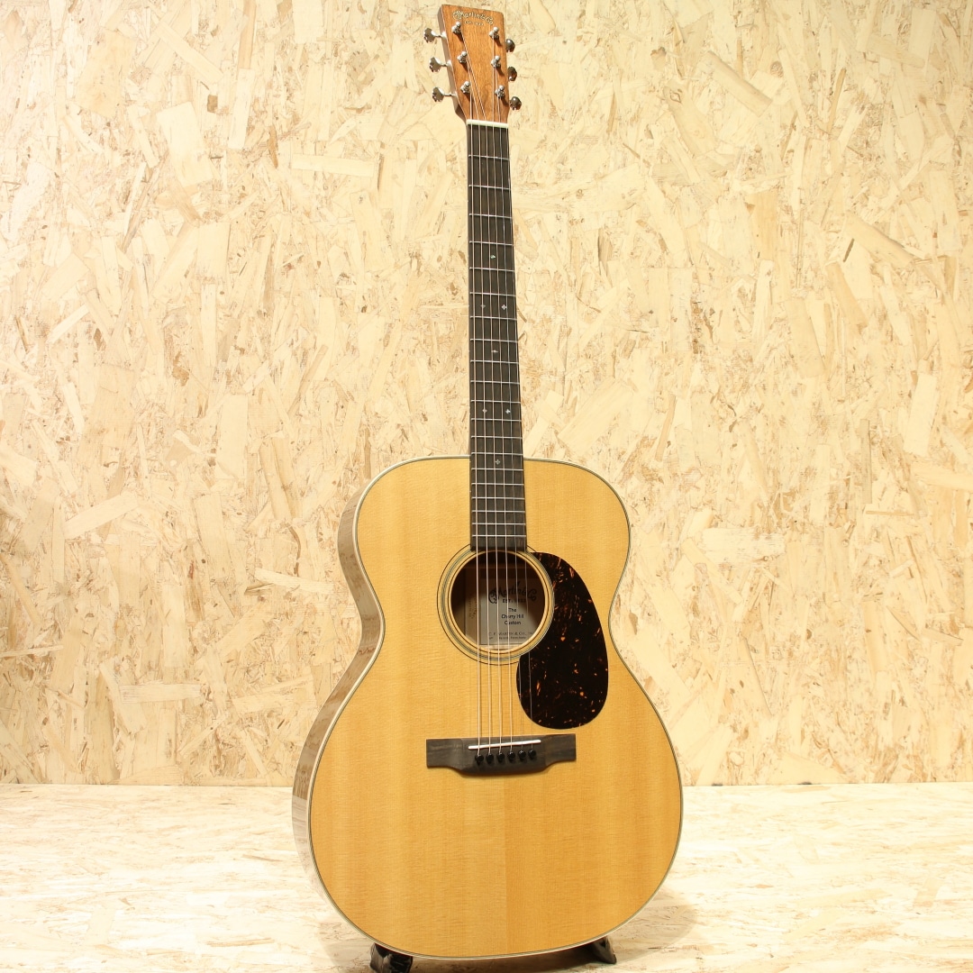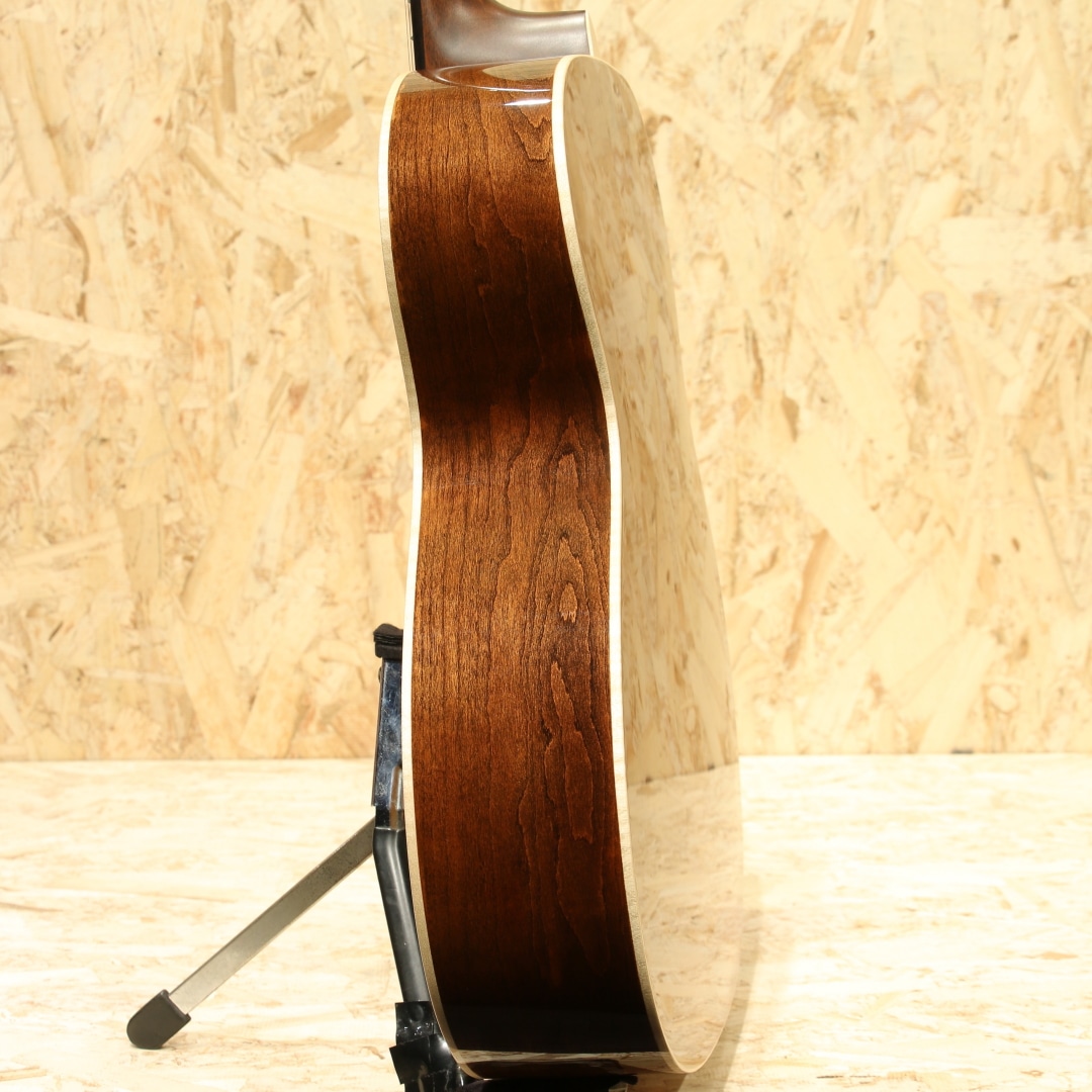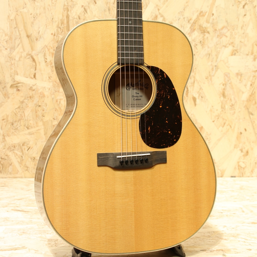 現マーチン工場の中でも、卓越した技術と豊富な経験から至極のギターを造り出す"Martin Custom Shop"。レギュラーラインの製造箇所とは全く違った、工場の一角で昔ながらの工法や製造方法で製作を行うカスタムショップ。スペックも含めレギュラーラインとは一線を画す仕上がりを誇ります。ここ数年一際話題を集めるオーセンティックシリーズの製作をはじめ、高い完成度を誇るこだわりのカスタムモデルを製造するトップクラスの部門です。本器はマーチンファクトリーツアーの際弊社スタッフにてオーダーが行われたスペシャルな1本。”CTM Cherry Hill 000”。スプルーストップ、チェリーサイド&バック、セレクトハードウッドネック、44.5mmナット幅、モディファイドロウオーバルネックシェイプ、ハイパフォーマンステーパー、エボニー指板&ブリッジ、ドロップインサドル、アバロンダイアモンドスクエア指板ポジション、グローバーオープンバックバタービンノブペグ、ベッコウ柄ピックガード、サイドバック材と同じくチェリー材をヘッド突板に使用、2wayアジャスタブルロッド、シトカスプルースを使用したスキャロップドXブレイシング。マーチンファクトリーツアーに参加したディーラーのみオーダーが出来た本器。材の名称からの名づけかと思いきや、マーチンI世が1839年にニューヨーク・マンハッタンからペンシルバニア ”チェリーヒル”に移転した事を記念した限定モデルです。000-18をベースに製作を行われており、サイドバック材以外では装飾面に変更が加えられています。バインディングやパーフリングにロゼッタ等全体的に木材を基調とした装飾に纏め上げられており、非常にオーガニックな印象を受けるルックス。指板のインレイには選定されたアバロンが使用され、ワンポイントのさりげないお洒落の如く飾りすぎない自然な絢爛さを持ちます。ネックシェイプはモディファイドローオーバルネック、ハイパフォーマンステーパーで現代的な演奏性を与えられ演奏スタイルを問わないオールマイティさを持った仕様。握り込んだ演奏スタイルから指板上を行き来するスタイルまで万遍なくフィットします。やはり特筆すべきはモデル名の一部にもなっているチェリー材。マホガニーとメイプルの中間的とも表現されることが多く、ブライトなトーンやエア感を伴った開放的なサウンドはマホガニー的、中低音の厚みがあるやや甘いサウンドやレンジ感の広さはメイプル的と言えるでしょう。元々カスタムショップ製は中域の情報量が多く上品でリッチなサウンドを響かせてくれますが、そこからタッチ感によるトーンも素直に出力するような印象です。ストロークでは快活で厚みのあるサウンド、フィンガーでは繊細なトーンからメロウなトーンまで強弱によって見せる表情を変える演技派。スキャロップによって柔らかいタッチにも追従しやすい反応性を与えられており、空気感を伴った上品な音色はカスタムショップ製であることを実感できます。ストロークやフィンガー問わず対応できる万能性を持ち、得手不得手を感じさせない辺りは流石の一言。扱いやすさと上質なサウンドを両立したマーチンの歴史にちなんだ記念モデルです。使用感はほとんど見られず、ピックガードに薄い擦れキズが見られる程と非常にキレイなコンディションをキープされている個体。ネック周りの演奏性も全く問題無し、やや低めにセッティングされフィンガーピッキングでの演奏にも追従出来る演奏性とされています。弾きやすいアクションの為ストロークで歌モノバックに使っても良し、オールマイティなポテンシャルを持った限定モデルの1本です。現代マーチン最高峰の部門で製作されていることも含め、自身を持ってオススメできる1本。日本の入荷は数本ほどと貴重なモデル、是非お手元でご堪能ください。