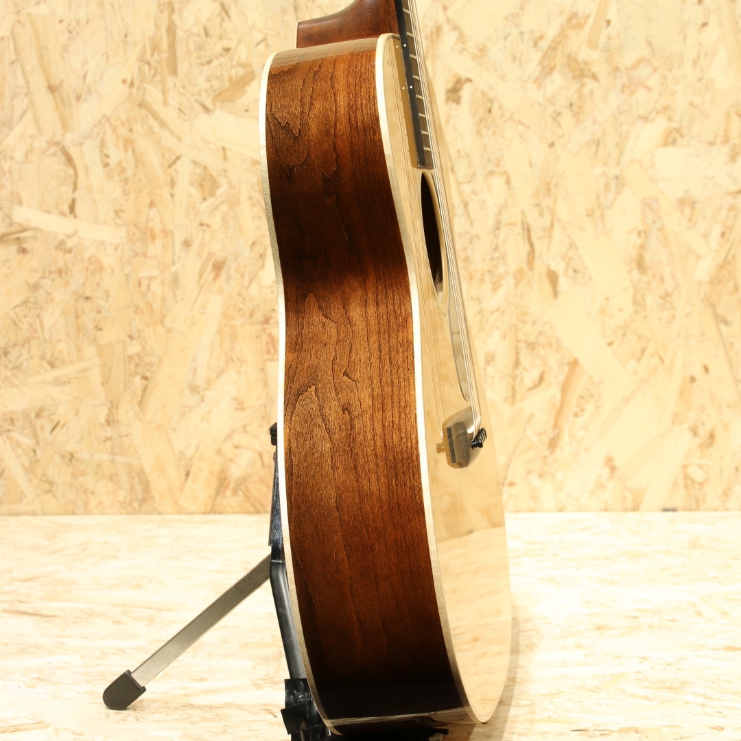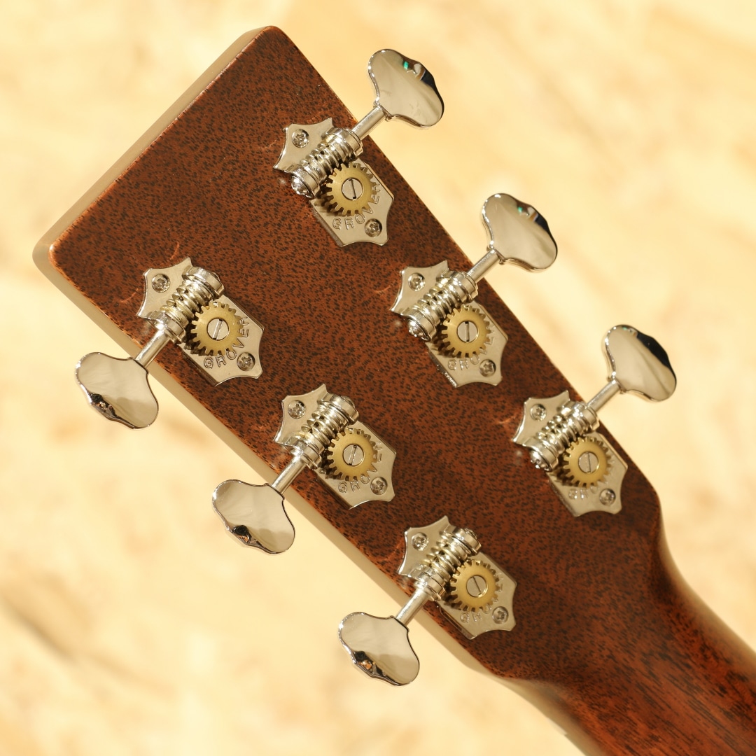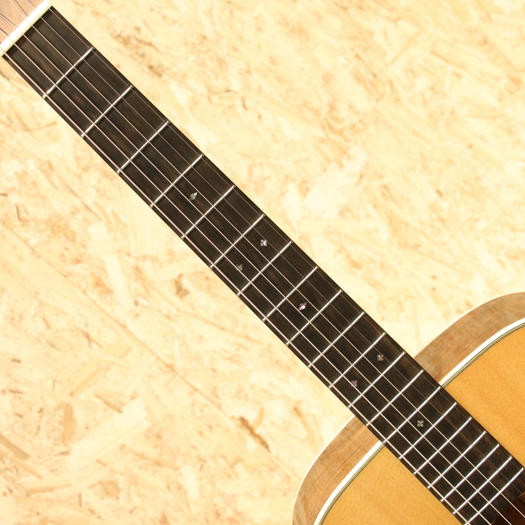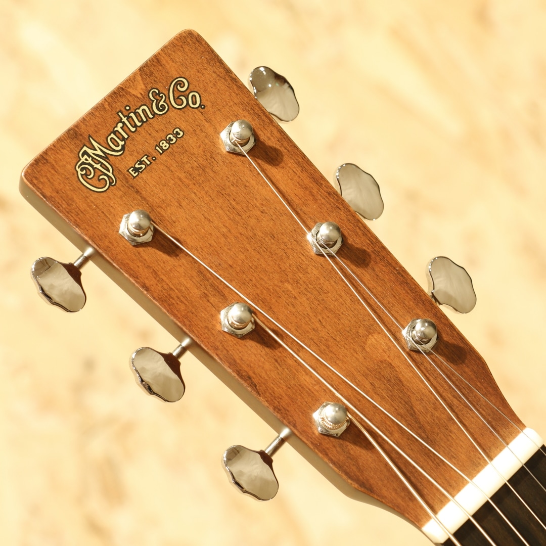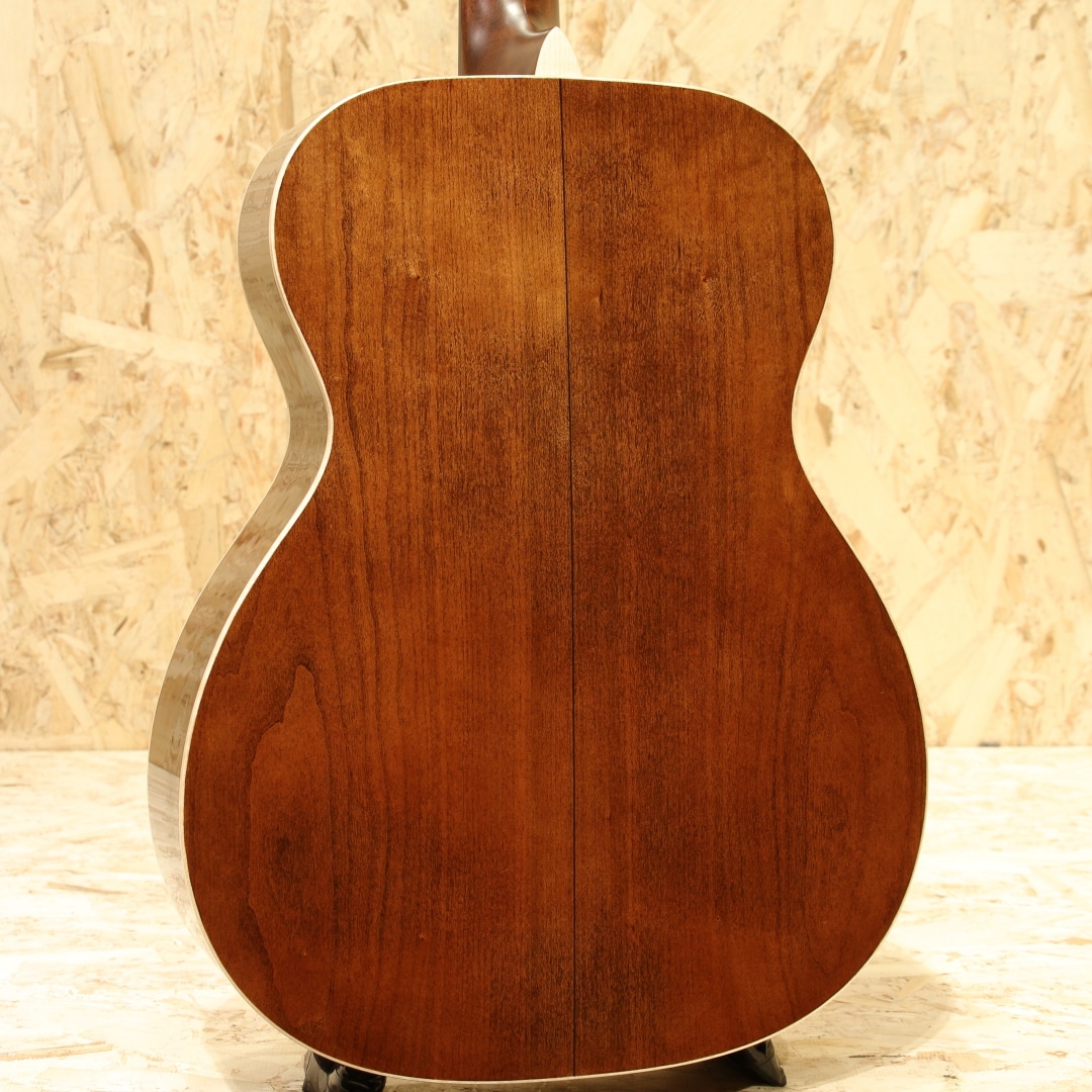 現マーチン工場の中でも、卓越した技術と豊富な経験から至極のギターを造り出す"Martin Custom Shop"。レギュラーラインの製造箇所とは全く違った、工場の一角で昔ながらの工法や製造方法で製作を行うカスタムショップ。スペックも含めレギュラーラインとは一線を画す仕上がりを誇ります。ここ数年一際話題を集めるオーセンティックシリーズの製作をはじめ、高い完成度を誇るこだわりのカスタムモデルを製造するトップクラスの部門です。本器はマーチンファクトリーツアーの際弊社スタッフにてオーダーが行われたスペシャルな1本。”CTM Cherry Hill 000”。スプルーストップ、チェリーサイド&バック、セレクトハードウッドネック、44.5mmナット幅、モディファイドロウオーバルネックシェイプ、ハイパフォーマンステーパー、エボニー指板&ブリッジ、ドロップインサドル、アバロンダイアモンドスクエア指板ポジション、グローバーオープンバックバタービンノブペグ、ベッコウ柄ピックガード、サイドバック材と同じくチェリー材をヘッド突板に使用、2wayアジャスタブルロッド、シトカスプルースを使用したスキャロップドXブレイシング。マーチンファクトリーツアーに参加したディーラーのみオーダーが出来た本器。材の名称からの名づけかと思いきや、マーチンI世が1839年にニューヨーク・マンハッタンからペンシルバニア ”チェリーヒル”に移転した事を記念した限定モデルです。000-18をベースに製作を行われており、サイドバック材以外では装飾面に変更が加えられています。バインディングやパーフリングにロゼッタ等全体的に木材を基調とした装飾に纏め上げられており、非常にオーガニックな印象を受けるルックス。指板のインレイには選定されたアバロンが使用され、ワンポイントのさりげないお洒落の如く飾りすぎない自然な絢爛さを持ちます。ネックシェイプはモディファイドローオーバルネック、ハイパフォーマンステーパーで現代的な演奏性を与えられ演奏スタイルを問わないオールマイティさを持った仕様。握り込んだ演奏スタイルから指板上を行き来するスタイルまで万遍なくフィットします。やはり特筆すべきはモデル名の一部にもなっているチェリー材。マホガニーとメイプルの中間的とも表現されることが多く、ブライトなトーンやエア感を伴った開放的なサウンドはマホガニー的、中低音の厚みがあるやや甘いサウンドやレンジ感の広さはメイプル的と言えるでしょう。元々カスタムショップ製は中域の情報量が多く上品でリッチなサウンドを響かせてくれますが、そこからタッチ感によるトーンも素直に出力するような印象です。ストロークでは快活で厚みのあるサウンド、フィンガーでは繊細なトーンからメロウなトーンまで強弱によって見せる表情を変える演技派。スキャロップによって柔らかいタッチにも追従しやすい反応性を与えられており、空気感を伴った上品な音色はカスタムショップ製であることを実感できます。ストロークやフィンガー問わず対応できる万能性を持ち、得手不得手を感じさせない辺りは流石の一言。扱いやすさと上質なサウンドを両立したマーチンの歴史にちなんだ記念モデルです。使用感はほとんど見られず、ピックガードに薄い擦れキズが見られる程と非常にキレイなコンディションをキープされている個体。ネック周りの演奏性も全く問題無し、やや低めにセッティングされフィンガーピッキングでの演奏にも追従出来る演奏性とされています。弾きやすいアクションの為ストロークで歌モノバックに使っても良し、オールマイティなポテンシャルを持った限定モデルの1本です。現代マーチン最高峰の部門で製作されていることも含め、自身を持ってオススメできる1本。日本の入荷は数本ほどと貴重なモデル、是非お手元でご堪能ください。