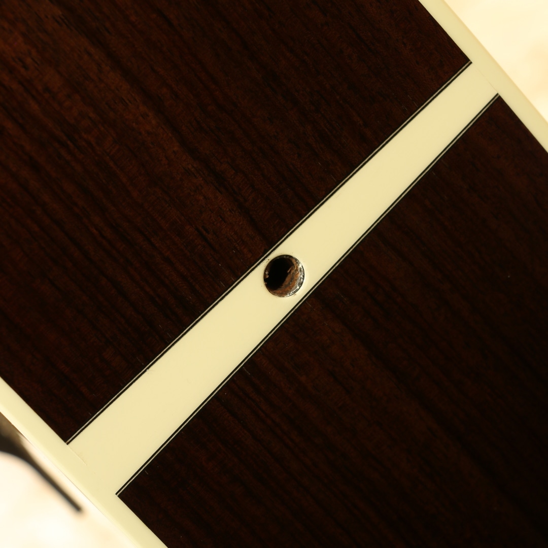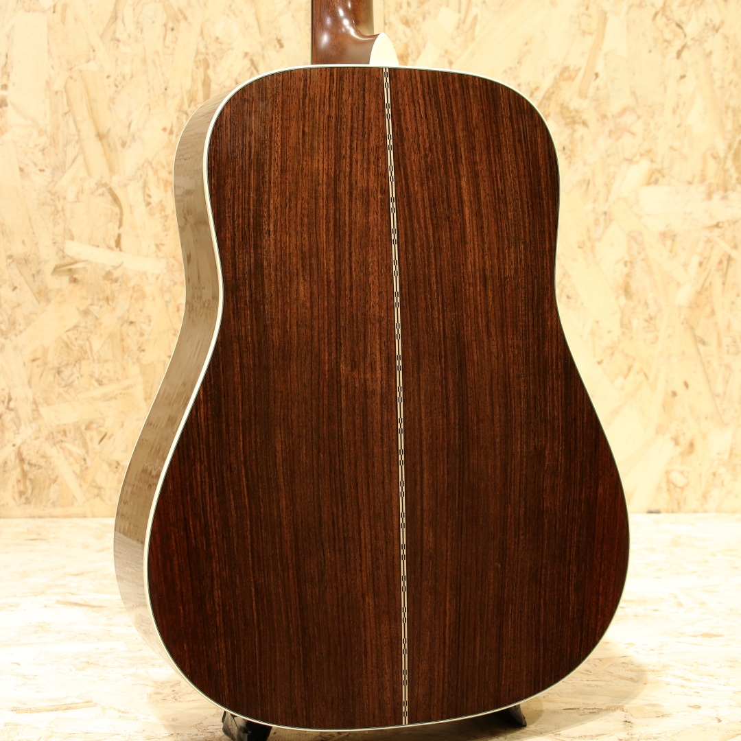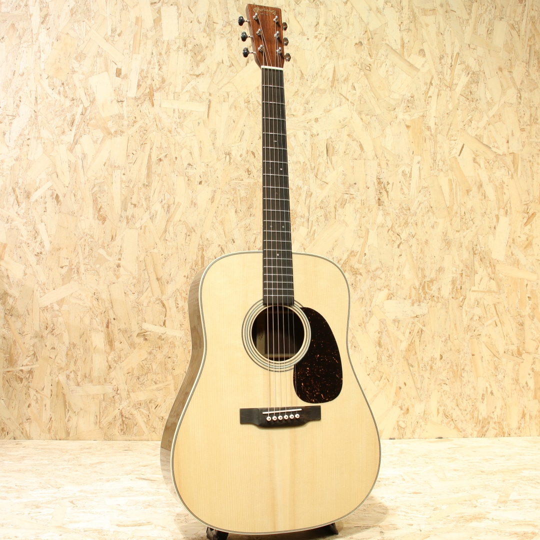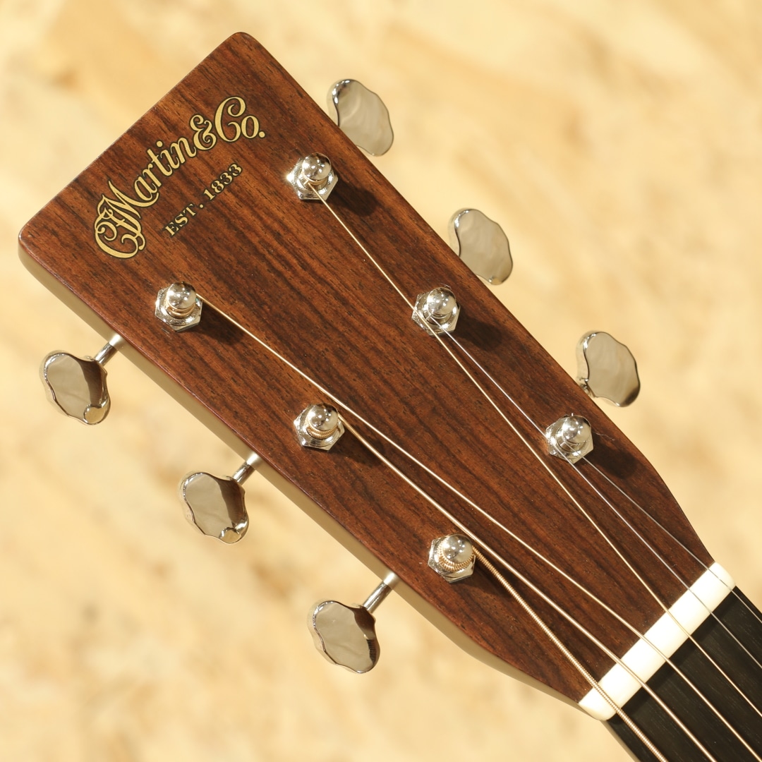 現マーチン工場の中でも、卓越した技術と豊富な経験から至極のギターを造り出す"Martin Custom Shop"。ここ数年一際話題を集めるオーセンティックシリーズの製作をはじめ、高い完成度を誇るこだわりのカスタムモデルを製造するトップクラスの部門です。本器はディーラー向けのマーチンファクトリーツアー企画品"Promotionモデル"、”CTM D-28 Adirondack Spruce Custom Promo 2022-Factory Special”。2023年製のUSED品。トップにはアディロンダックスプルース、イーストインディアンローズウッドサイド&バック、ジェニュインマホガニーネック、42.9mmナット幅、ロープロファイルネックシェイプ、スタンダードテーパー、ブラックエボニー指板&ブリッジ、ドロップインサドル、アバロンダイアモンドスクエア指板ポジション、グローバーオープンバックバタービンノブペグ、ベッコウ柄ピックガード、ゴールデンエラスタイルヘッドロゴ、2wayアジャスタブルロッド、アディロンダックスプルースを使用したリアシフテッドスキャロップドXブレイシング。レギュラーラインの製造箇所とは全く違った、工場の一角で昔ながらの工法や製造方法で製作を行うカスタムショップ。スペックも含めレギュラーラインとは一線を画す仕上がりを誇ります。”Promotion”モデルはカスタムショップのプロモーションのため通常では高額となってしまいがちなスペックのギターを、カスタムショップ職人からのプレゼント品とも呼べる価格で提供する限定モデルです。ネック形状やネックのテーパー具合は旧仕様のD-28と同じくでナット幅は42.9mm。薄めのネックで肉付きの比較的少ないネックシェイプ、握り込みやすく旧仕様のものと近しい感覚で演奏することが出来ます。また作る環境や工程が違えばやはり音も変化が生まれ、造りの精度の高さから情報量の多いレンジの広いサウンドや透明感のある音色を獲得しています。本器においてはレギュラーで採用されていない仕様を織り込まれているため、違いを体感しやすいでしょう。アディロンダックで跳ねる様な膨らむサウンドの爆発力を持ち、リアシフトでそれを制御した粒立ちの良さやクリアなサウンド、スキャロップで空気感を含んだトーンを生み出しバランスを取られています。この構造は実際に1938年頃から1944年辺りまで採用されており、フォワード期とも違った魅力を持った仕様です。弦の分離感を出しやすく1音1音をクリアを響かせる点、トーンバランスの良さ等はこの構造ならでは。硬くなりやすいところをスキャロップで柔らかさのあるサウンドにされている点なども扱いやすさに貢献しています。立ち上がりも早く、ニュアンスのつけやすさや細やかなフレージングにも対応できるポテンシャルを持っています。得手不得手を感じさせない辺りは流石のカスタムショップでしょう。ヘッド表に僅かな擦れキズこそ見られますが、全体を通しても擦れキズはほぼ見られずで非常にキレイなコンディションをキープされている個体。パッと見では新品と見間違えそうな状態です。付随してネックも非常に良好、新品時と変わらないであろうサドル残、弾きやすい弦高と操作性も申し分なしです。D-28らしいオールマイティさを持ちワンランク上を実感できるギター。高い演奏性、ハイランクのサウンド、弾き込み度の高い実力派の1本に仕上がっています。トラッドかつモダンな現在の技術の粋を集めた、自信を持ってオススメできるクオリティの1本です。是非、お手元でご堪能ください。