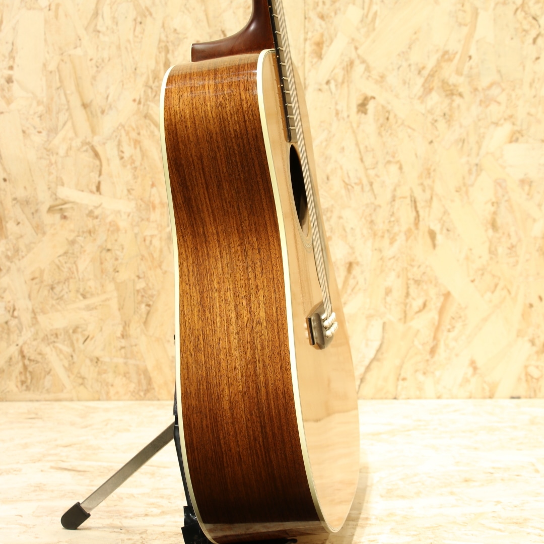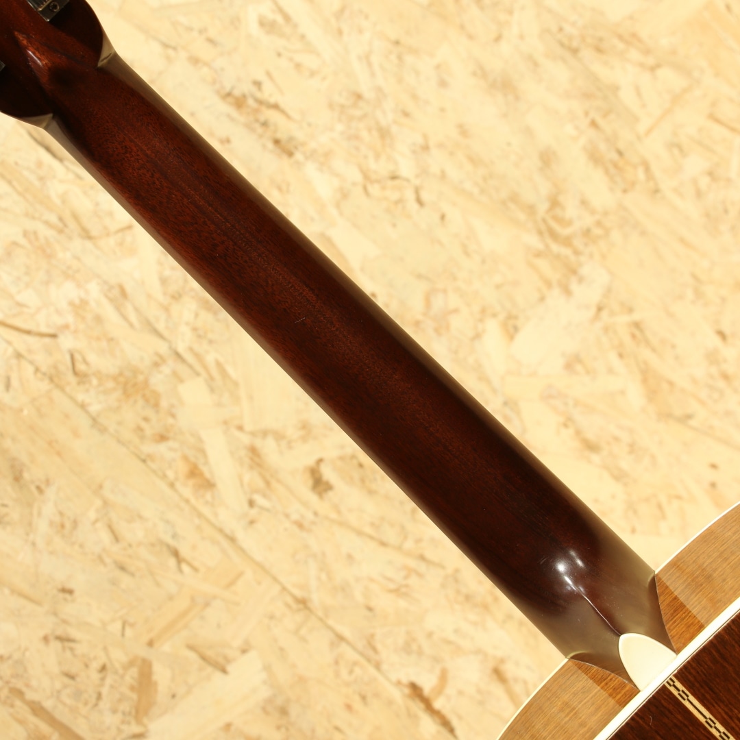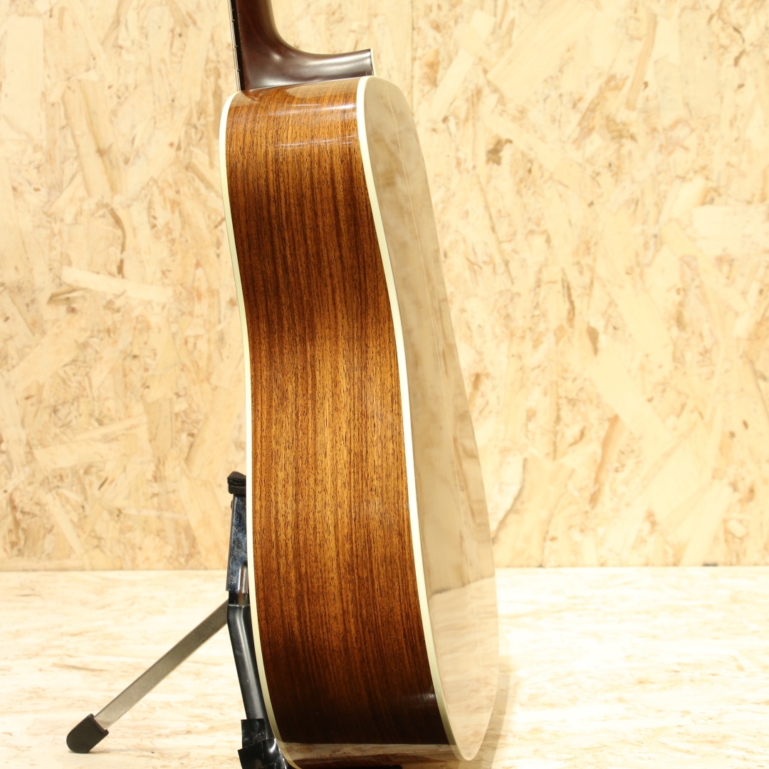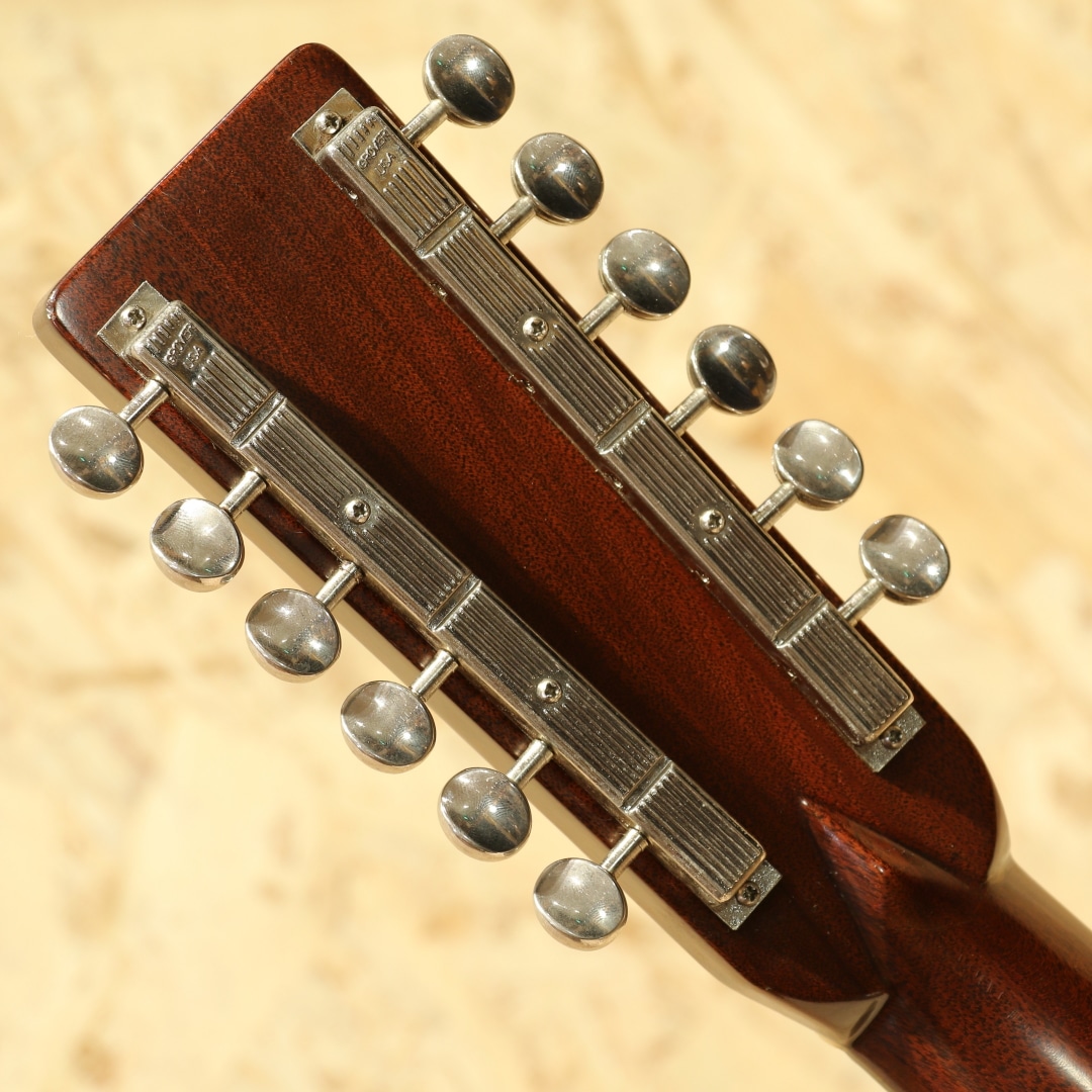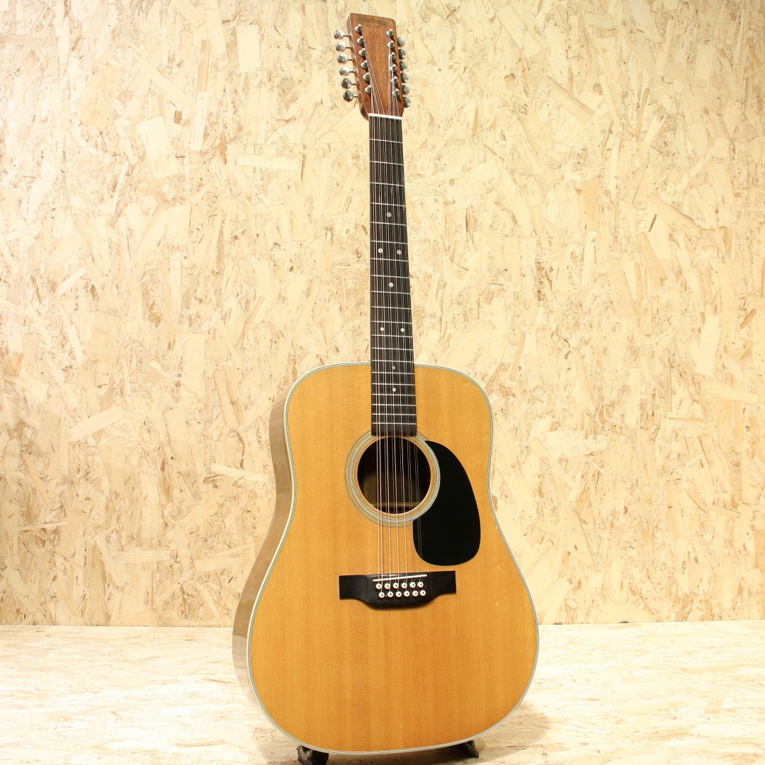 マーチンギターの中で最も有名なモデル"D-28"。1931年に12Fジョイント仕様で誕生してから1934年に現在でも馴染みのある14Fジョイント仕様となりました。その後も時代に合わせて様々な仕様変更を施しながら、時を超え今もなお愛されるワールドスタンダードモデルです。そのD28を12弦化して1970年から発売されたのが”D12-28”。本器は1973年製のUSED品です。スプルーストップ、インディアンローズウッドサイド&バック、エボニー指板&ブリッジ、オリジナルグローバークロームペグ、ドット指板インレイ、ブラックピックガード、47mmナット幅、632.4mmスケール、ノンスキャロップドXブレイシング。独特の響きから熱心なファンを惹き付ける12弦ギター。独特のコーラスサウンドや音の広がり方は6弦では出せず、そのサウンドに魅了された方はいつしか手に取ってしまう魅力を持つギターです。12弦仕様の為ナット幅47mm程と広くなりますが、グリップの幅広さは大きくは感じずで程よい握り心地。しっかりとした手応えで演奏を支えてくれそうな雰囲気を感じさせます。トラスロッドは当時の標準であるSQロッド仕様。重量感があるものの、音の芯の太さやソリッドなサウンド、その重量感からくる重厚なサウンドは通なファンにはたまらないでしょう。現行品では採用されていないため、欲しい場合は中古品から探すしかないところも通な楽しみです。ブリッジはショートサドル仕様とすることでピックアップの搭載もしやすい仕様。現代においてはライブやレコーディングも含め、宅録配信を見込んだ際にも好みに応じてピックアップの選択が充分に出来る仕様です。ブレイシングは12弦のテンションを考慮してスタンダードXのノンスキャロップに。6弦であれば芯の強い無骨な響きとなりやすいですが、12弦のコーラス感や音の広がり方からそのようなイメージは持ちにくくなっています。華やか、そして空間に広がる響き。弦と弦がボディを通じて相互干渉するが故の馴染み合った音色。エフェクターのコーラスのように別の音がぶつかり合っているような違和感も感じにくいです。この響きは12弦ギターでしか出し得ず、イーグルスのホテルカリフォルニアのイントロなどでこのような12弦サウンドを体感することが出来ます。あのサウンドを出すならばやはり12弦でしか成し得ないでしょう。現行品の12弦モデルと比べてもよりコシのある響きは当時の楽器ならでは。一味違った12弦ギターを求めていた方には正解となり得るポテンシャルを持っている個体です。ヘッド付け根に過去ネック折れが発生し修理した跡が見られます。接着自体はしっかりとされており、上からネック全体にオーバーラッカーが施されぱっと見では目立ちにくくなっています。使用する上では問題が無く、チューニングをしても動くような形跡は見られません。ネックリセットも行われ、プレイコンディションは非常に良好。弾きにくさは感じさせず現代基準での演奏性を確保されています。上記修理跡を除けば全体に薄い擦れキズや細かな当てキズこそ見られるもののキレイなコンディションをキープ。プレイヤーズコンディションとも言える1本ですが、マーチンの12弦サウンドが欲しかった人にはアリではないでしょうか。市場全体で見ても数の少ない12弦ギター、現在では作られていない仕様の1本です。音重視で修理跡などを気にされない方には是非ともオススメしたい個体。是非ご検討下さいませ。詳細等はお気兼ねなくお問い合わせ下さい。