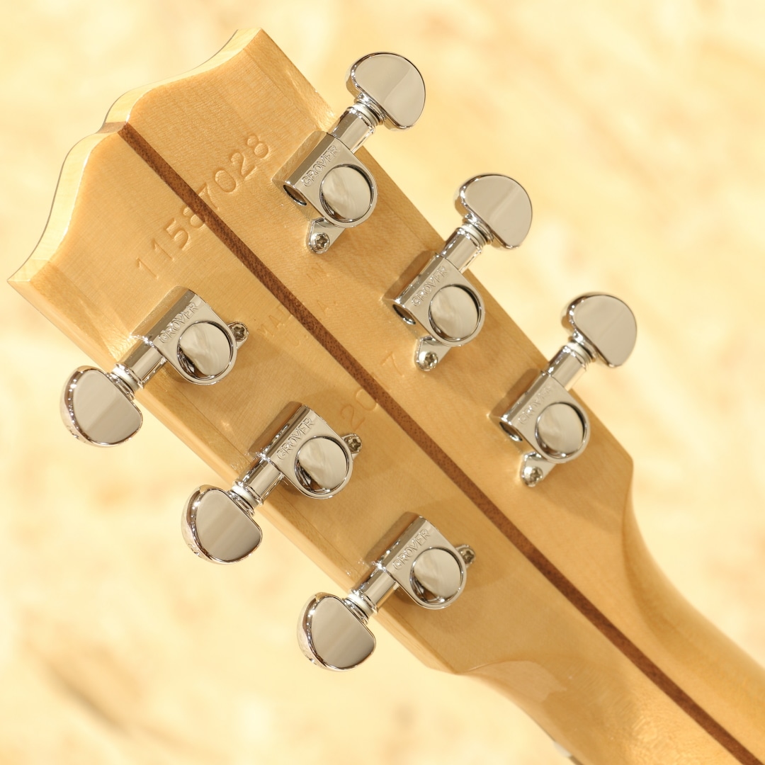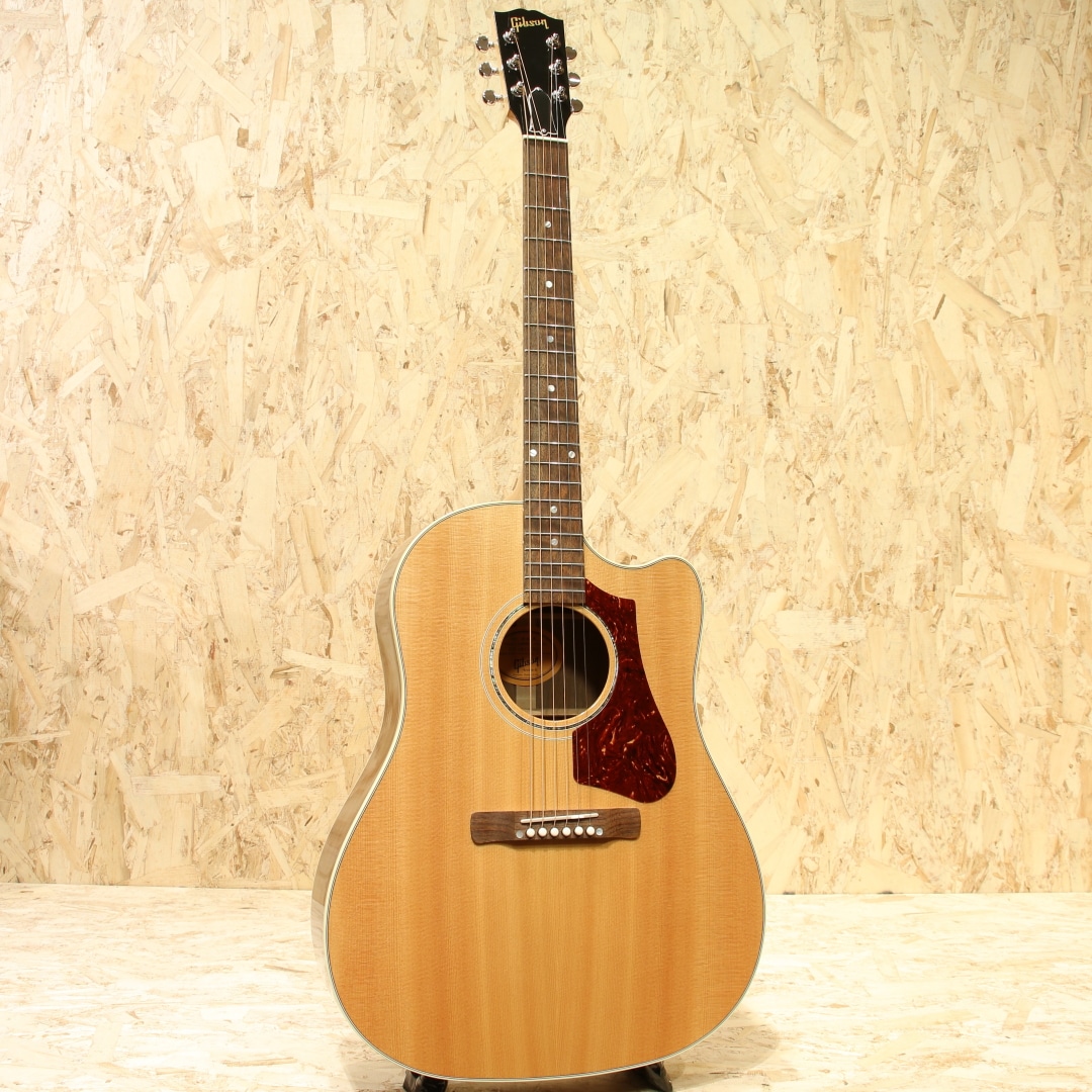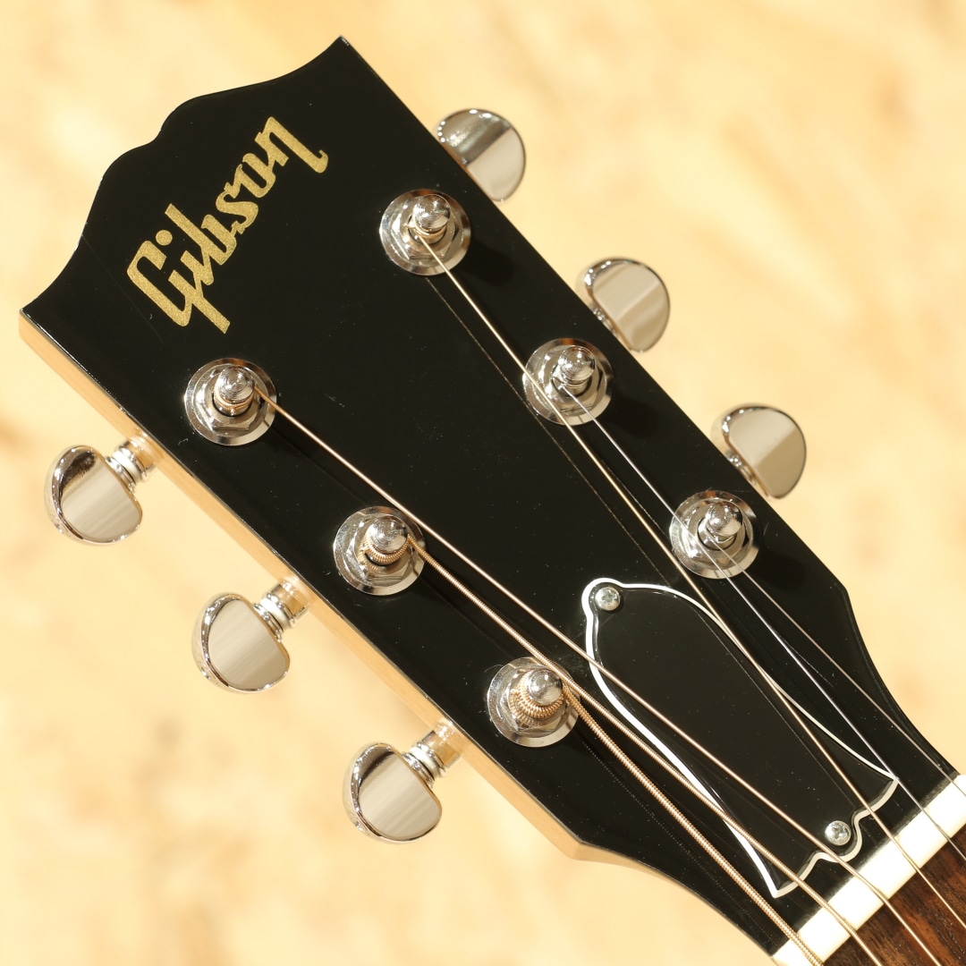 2016年に発売されたHP(High Paformance)シリーズ。やや薄胴のボディ、ハイポジションまで厚みが変わりにくいネックテーパー、当時の従来モデルに比べ指板Rはややフラット気味、そしてカッタウェイを備えた仕様としてラインナップされていました。その上レギュラーラインの製造を行うUSAモンタナ工場での生産を行っている等、後のStudioやGシリーズにも共通するコストパフォーマンスの高さをウリとしていたモデル群となります。本器はその中でもラウンドショルダーシェイプ”HP415W”。2017年製のUSED品です。シトカスプルーストップ、ウォルナットサイド&バック、メイプル&ウォルナットの3Pネック、ウォルナット指板&ブリッジ、ドット指板インレイ、グローバークロームペグ、スキャロップドXブレイシング、アンティークナチュラルフィニッシュ、L.R Baggs Element搭載。伝統的なモデルを基にしてモダン化したようなラインナップのHPシリーズ。ウォルナットを使用したトーンの変化もユニークで、後のモデルにもウォルナットは採用されていました。ギブソンラインナップでは珍しく、ネックをメイプルとしている点もユニーク。これまでと違ったアプローチを試みた意欲作となっています。モダンな設計故に現代的な演奏性への追従性が高い点も大きなメリットでしょう。ポジションを問わない演奏性を確保するための工夫を各所に凝らされております。何よりもカッタウェイによるハイポジションまでの滑らかな運指が可能な点は、プレイヤーを選ばず現代的な演奏やエレキギターを普段弾く方にも扱いやすい点でしょう。ボディが若干薄い点もエレキプレイヤーとしては嬉しい点でしょう。肩や腹部への圧迫感も少なく、他のアコースティックと比べて比較的違和感を覚えにくい仕様とも言えます。そしてウォルナットのサウンド。J-45などのマホガニーよりもローズウッドのようにレンジ感が広く、中高音にピークを持つ材。音の質感としてはマホガニーのような乾いた響きを特色としています。歯切れが良く音が前に出るような響き、シャキッとした爽やかなサウンドが魅力。軽いタッチでも音が前に出やすくなるため、パワフルに弾かずとも鉄弦らしい煌びやかさを出せるレスポンスの良さも特色の一つです。単音での音抜けも良く、まさにプレイスタイルを問わないギター、扱いやすい1本と言えるでしょう。ピックアップにはL.R Baggs Elementを搭載。アンダーサドルタイプのピエゾピックアップを内蔵しており、音の芯を捉えたサウンドの出力が出来るシステムです。操作はボリューム1発で非常にシンプル、難しい操作は要りません。アクティブタイプで出力も充分、繋いですぐに使えるロングセールのピックアップシステムです。全体を通しても使用感は非常に少なく、新品と見紛う程の状態をキープされている個体。よくよく見ると薄っすらクロスでの拭き跡が僅かに見られる程となっています。ネックのコンディションも良いままにキープされており、弦高は若干低めで弾きやすい演奏性へとセットアップされています。エレキユーザーの方でも弾きやすく感じられるであろう1本。家弾きからステージにと活躍の見込めるモダンなギター。J-45などの製造を行うギブソンモンタナ工場製である事を考えると、非常にコストパフォーマンスの高いモデルだと言えます。本格的に使えるエレアコをお探しだった方、手頃なギブソンをお探しだった方は必見です。是非ご検討下さいませ。