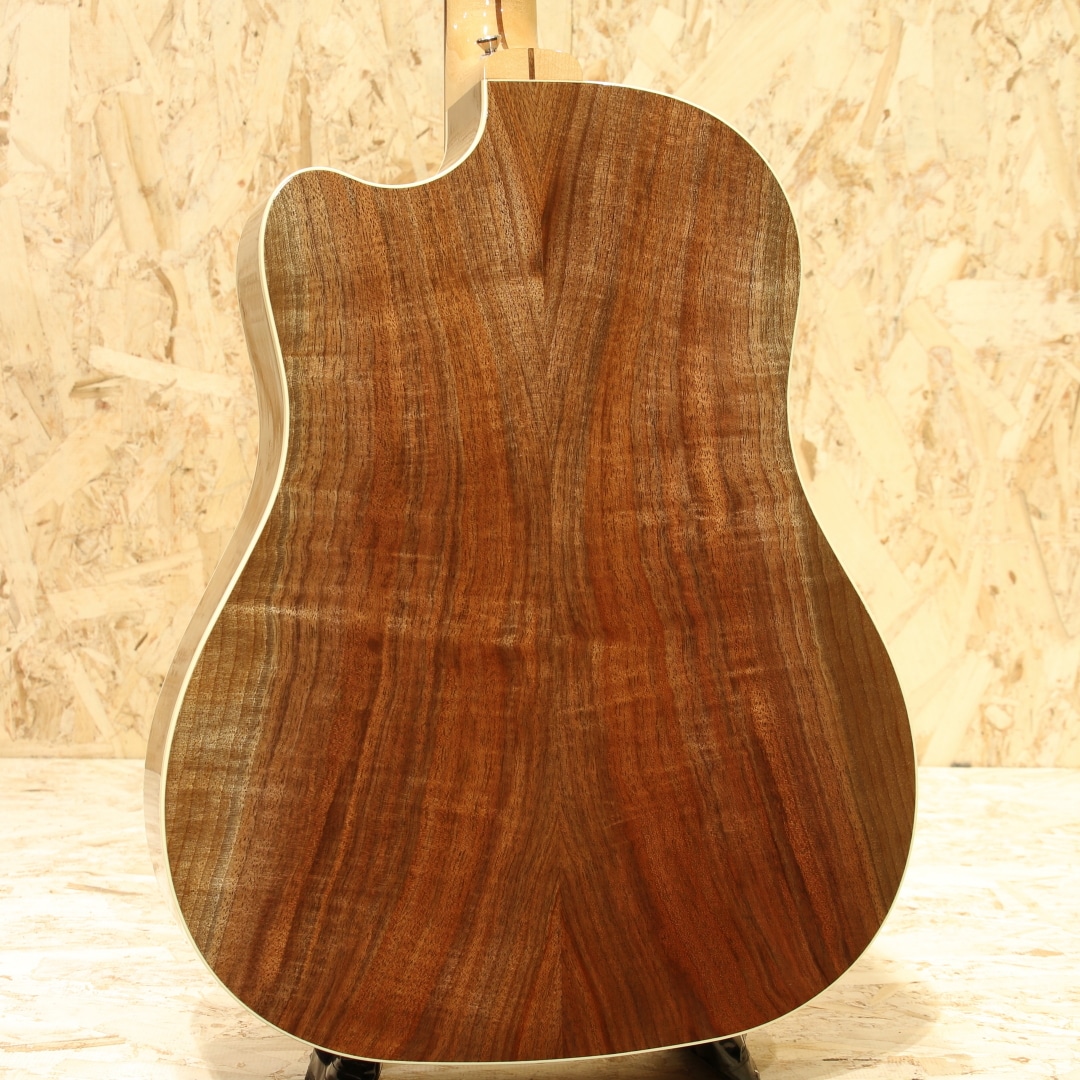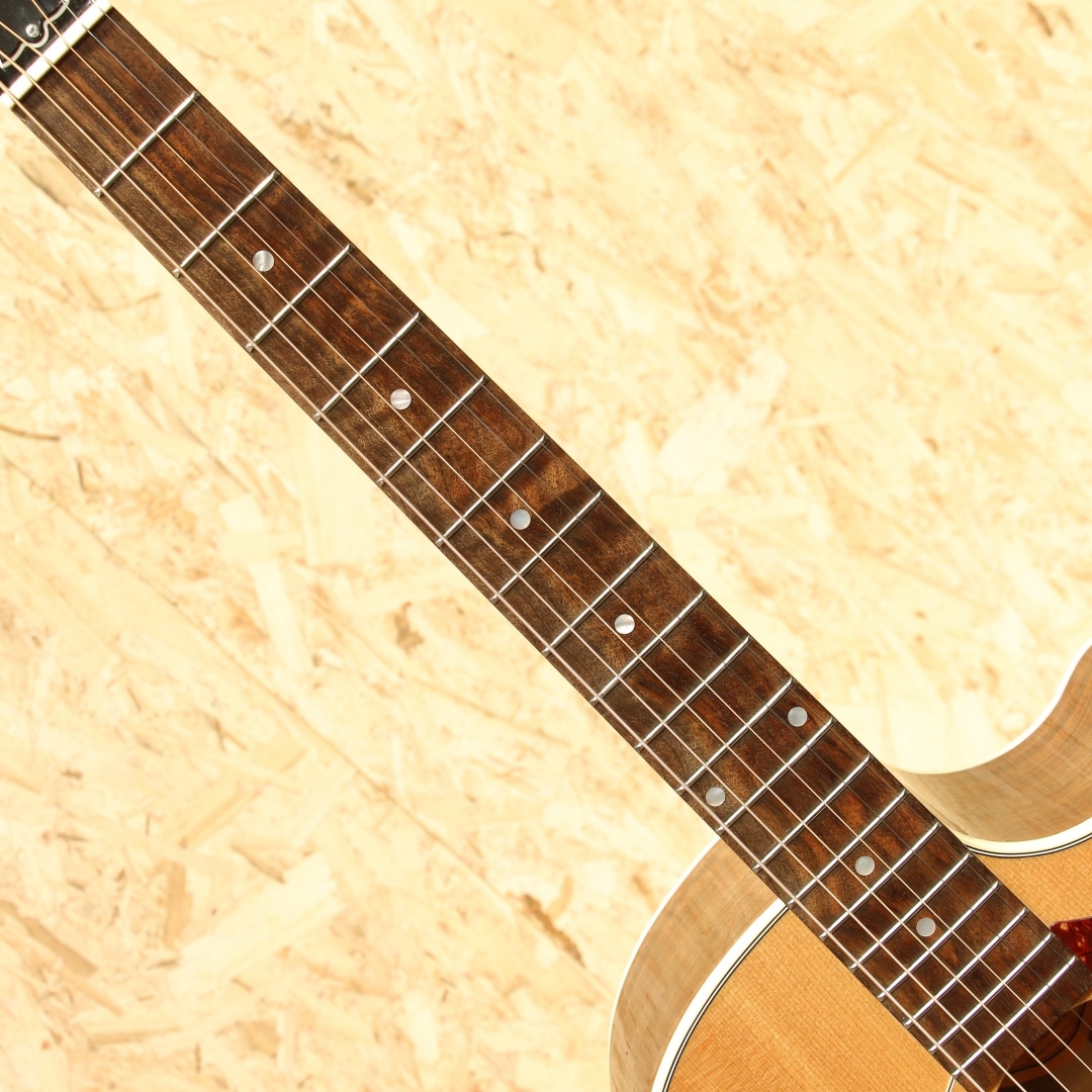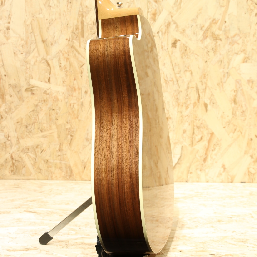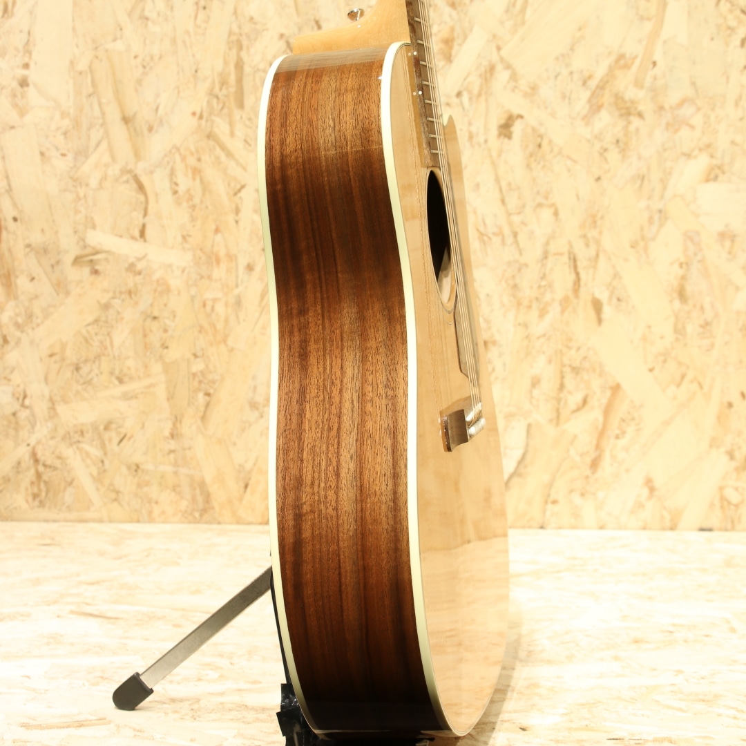 2016年に発売されたHP(High Paformance)シリーズ。やや薄胴のボディ、ハイポジションまで厚みが変わりにくいネックテーパー、当時の従来モデルに比べ指板Rはややフラット気味、そしてカッタウェイを備えた仕様としてラインナップされていました。その上レギュラーラインの製造を行うUSAモンタナ工場での生産を行っている等、後のStudioやGシリーズにも共通するコストパフォーマンスの高さをウリとしていたモデル群となります。本器はその中でもラウンドショルダーシェイプ”HP415W”。2017年製のUSED品です。シトカスプルーストップ、ウォルナットサイド&バック、メイプル&ウォルナットの3Pネック、ウォルナット指板&ブリッジ、ドット指板インレイ、グローバークロームペグ、スキャロップドXブレイシング、アンティークナチュラルフィニッシュ、L.R Baggs Element搭載。伝統的なモデルを基にしてモダン化したようなラインナップのHPシリーズ。ウォルナットを使用したトーンの変化もユニークで、後のモデルにもウォルナットは採用されていました。ギブソンラインナップでは珍しく、ネックをメイプルとしている点もユニーク。これまでと違ったアプローチを試みた意欲作となっています。モダンな設計故に現代的な演奏性への追従性が高い点も大きなメリットでしょう。ポジションを問わない演奏性を確保するための工夫を各所に凝らされております。何よりもカッタウェイによるハイポジションまでの滑らかな運指が可能な点は、プレイヤーを選ばず現代的な演奏やエレキギターを普段弾く方にも扱いやすい点でしょう。ボディが若干薄い点もエレキプレイヤーとしては嬉しい点でしょう。肩や腹部への圧迫感も少なく、他のアコースティックと比べて比較的違和感を覚えにくい仕様とも言えます。そしてウォルナットのサウンド。J-45などのマホガニーよりもローズウッドのようにレンジ感が広く、中高音にピークを持つ材。音の質感としてはマホガニーのような乾いた響きを特色としています。歯切れが良く音が前に出るような響き、シャキッとした爽やかなサウンドが魅力。軽いタッチでも音が前に出やすくなるため、パワフルに弾かずとも鉄弦らしい煌びやかさを出せるレスポンスの良さも特色の一つです。単音での音抜けも良く、まさにプレイスタイルを問わないギター、扱いやすい1本と言えるでしょう。ピックアップにはL.R Baggs Elementを搭載。アンダーサドルタイプのピエゾピックアップを内蔵しており、音の芯を捉えたサウンドの出力が出来るシステムです。操作はボリューム1発で非常にシンプル、難しい操作は要りません。アクティブタイプで出力も充分、繋いですぐに使えるロングセールのピックアップシステムです。全体を通しても使用感は非常に少なく、新品と見紛う程の状態をキープされている個体。よくよく見ると薄っすらクロスでの拭き跡が僅かに見られる程となっています。ネックのコンディションも良いままにキープされており、弦高は若干低めで弾きやすい演奏性へとセットアップされています。エレキユーザーの方でも弾きやすく感じられるであろう1本。家弾きからステージにと活躍の見込めるモダンなギター。J-45などの製造を行うギブソンモンタナ工場製である事を考えると、非常にコストパフォーマンスの高いモデルだと言えます。本格的に使えるエレアコをお探しだった方、手頃なギブソンをお探しだった方は必見です。是非ご検討下さいませ。