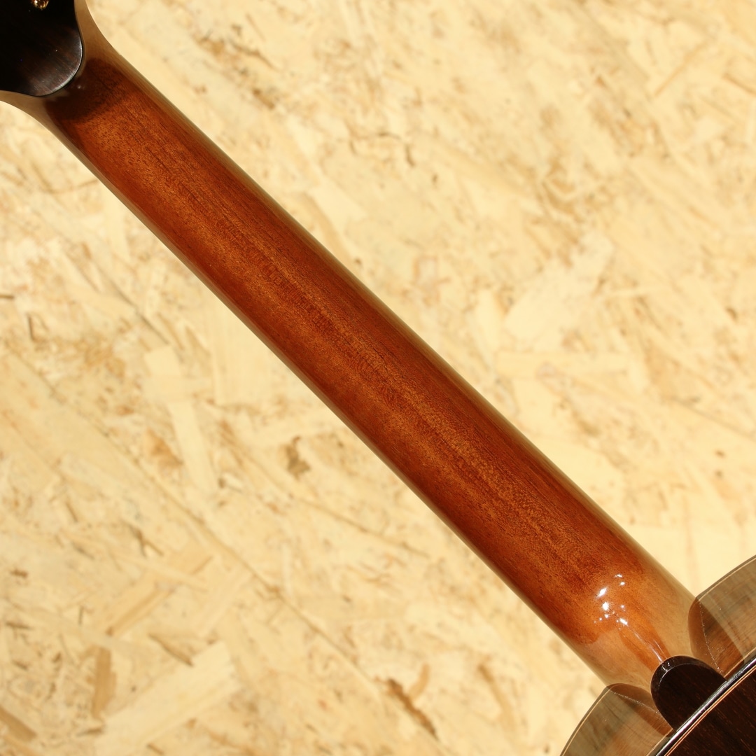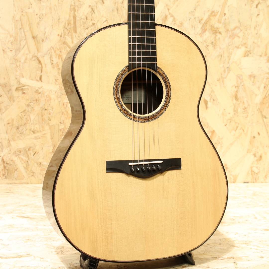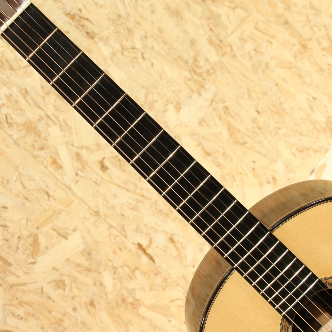 広島・似島にて自身の工房を構える向江良太氏。カナダのマスタールシアーSergei de Jonge(サーゲ・デ・ヤング)の工房でノウハウを学び帰国。現在は自身の屋号でギター製作を勤しむ新鋭ルシアーです。本器はMukae Guitarsオリジナルシェイプ、約15インチのボトム幅を持つOOO/OM相当サイズの”RC Swiss moon Spruce ×Brazilian Rosewood”。2021年製作のUSED品です。トップ材には目のキメ細かい整ったスイスムーンスプルース、ワイルドな杢目のブラジリアンローズウッドをサイド&バックに使用。ホンジュラスマホガニー1Pネック、エボニー指板&ブリッジ、ゴトーSGL510Zゴールドペグ、カリンバール&アバロンロゼッタ、エボニーバインディング。トップ構造にはエックスを軸としたオリジナルテーパードXXブレイシング、サーゲ直伝の質の高いフレンチポリッシュ塗装。木材の組み合わせだけでなく緻密な造り、各部品に違和感の無い一体感のある仕上がりは確かな木工技術の顕れでしょう。滑らかな面取りによる手当たりの良さ、エッジを利かせた形状からはきっちりとした印象を、メリハリの効いたデザインは作品と呼ぶにふさわしい美しさを魅せます。それでいて華美さというよりは自然が生み出す美しさを表すような木材を基調としたデザイン。離島の自然の中で生活をしている向江氏だからこそ、素の表情が生み出す自然な美しさを引き出せているように思われます。その表情の一端にはフレンチポリッシュによる仕上げも大きなところでしょう。古くより塗装として使用されてきた伝統的な手法ですが、その技術の習得には時間と経験を要します。薄く仕上げることが可能な点からも木材の風合い、そしてサウンドへの影響もその特徴の1つ。塗装を薄く仕上げることが出来る分よりオープンに響き、演奏してからすぐに音が立ち上がるスピーディーさ。レンジ感も広く、しなやかさやふくよかさも持ち合わせています。それでいて芯の通った艶やかなトーン。希少な木材自体のポテンシャルも高く、氏の創るサウンドと合わさり一味も二味も異なった音色を魅せてくれます。生楽器だからこその生き生きとした響きからは弾き応えを感じさせるでしょう。やはりフィンガースタイルで繊細さを活かしつつ、自然なサウンドを楽しみたくなる作品です。フレンチポリッシュ仕上げゆえ、1弦側サイド下部に僅かな反応跡や若干の小傷や打痕は見られますがキレイなコンディションをキープされている個体。ネック周りの演奏性も抜群に良く、向江氏の技術が光る1本です。製作の度に積極的な志を持ち、益々の完成度を誇るMukae Guitars。日本作家には少ないサウンドキャラクターで、組み上げや仕上げ、フレットワーク、セッティングなども確実。ワンランク上の弾き込めるギターでステップアップをお探しの方にオススメです。
