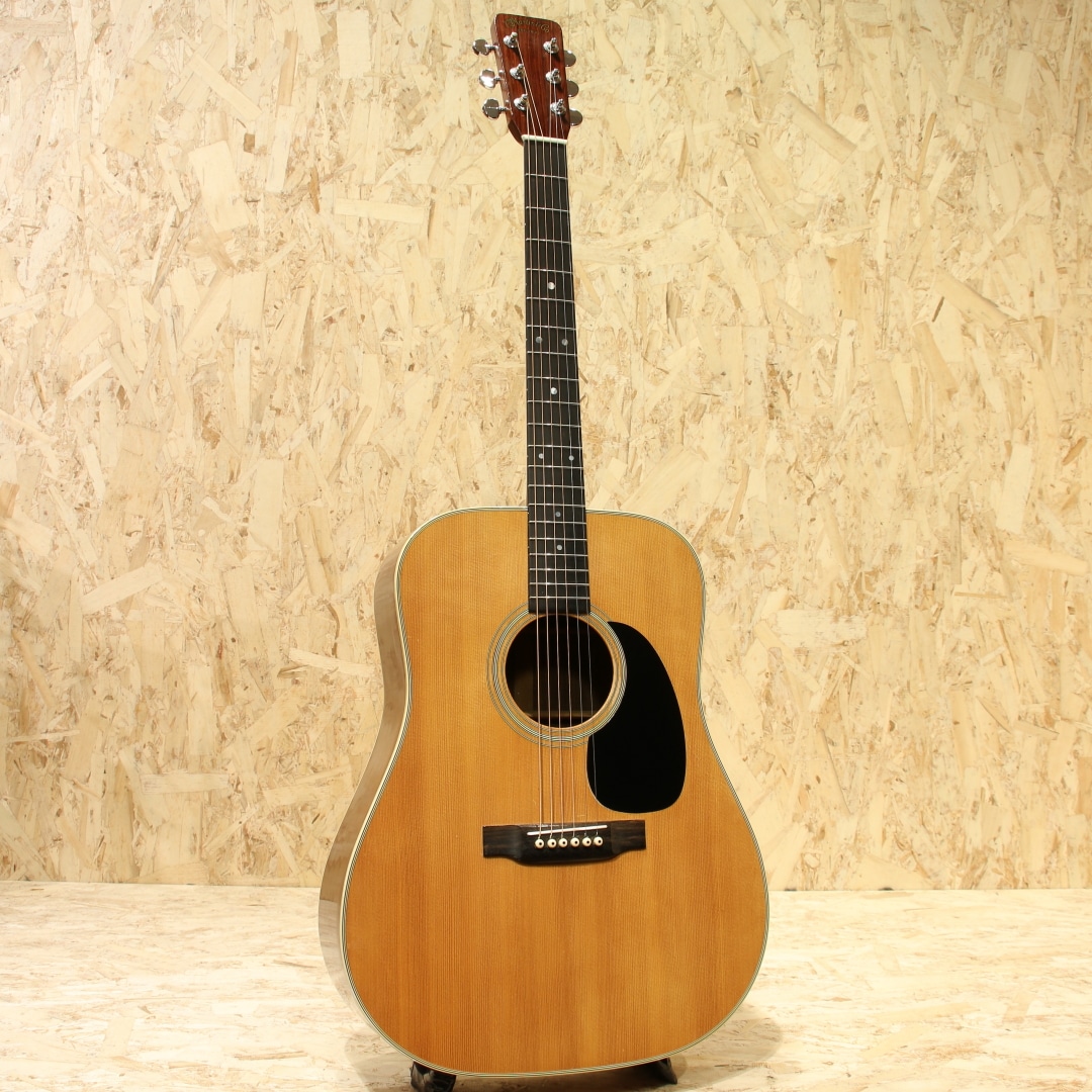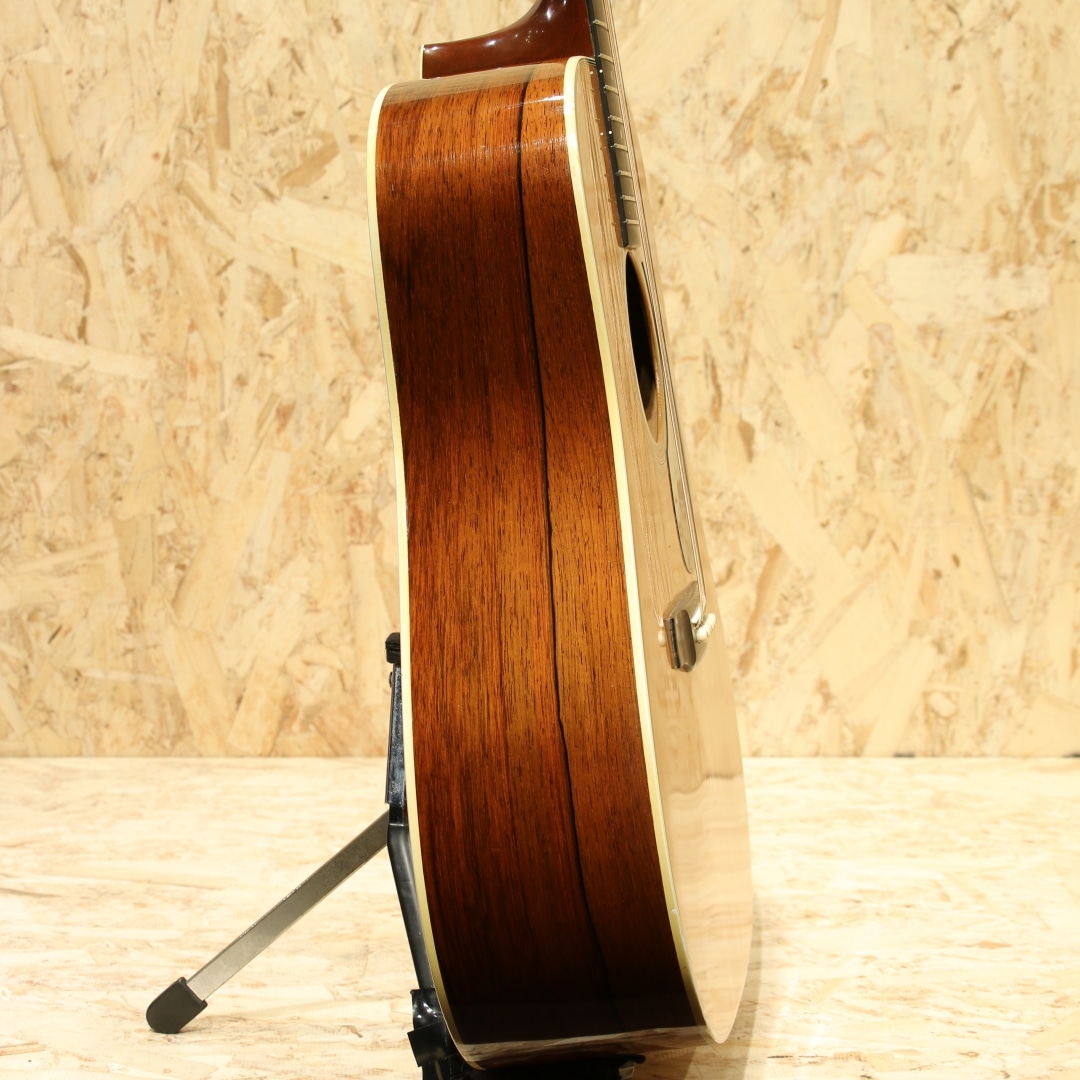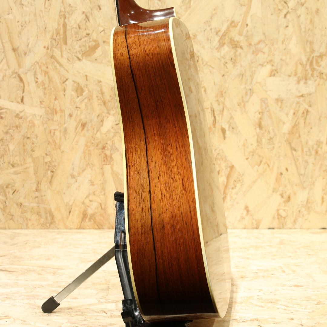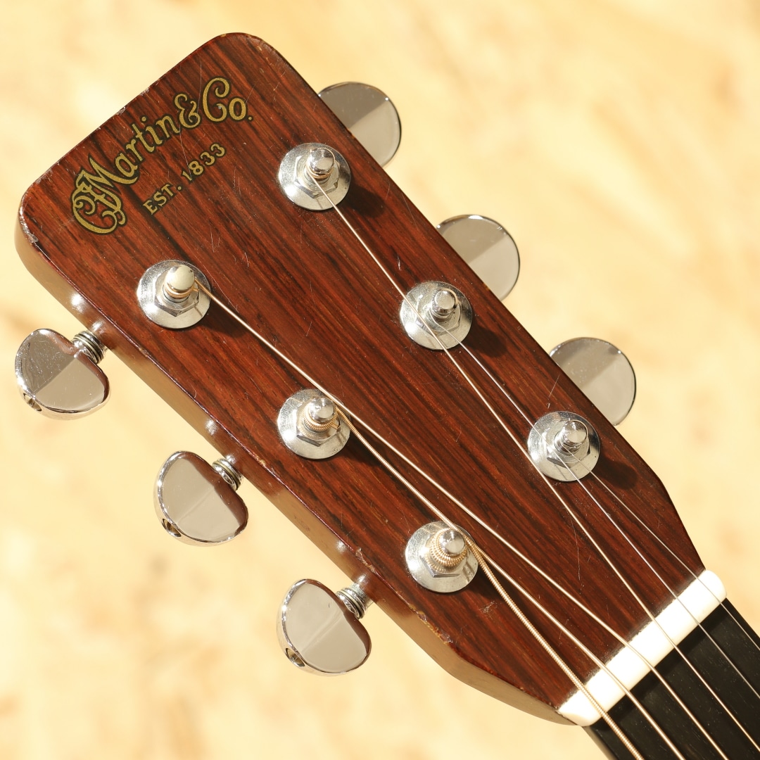 マーチンギターの中で最も有名なモデルと言えば、”D-28”。アメリカントラッドミュージックで数々の名演を残し、今なお多くを魅了し続けるモデル。世界で最も愛されるアコースティックギターの1つです。本器は1968年製Vintage美品。杢の揃ったスプルーストップに、サイド&バックはキレイな柾目杢のハカランダが使われています。マホガニーネック、エボニー指板&ブリッジ、オリジナルミルクボトルグローバーペグ、ピックガードは同サイズでフィニッシュも施されたオリジナルと見紛うブラックガードに交換、スモールローズウッドブリッジプレート、スクエアネックロッド、チェッカーバックストリップ、ハカランダ化粧板、ノンスキャロップドXブレイシング。この時期の特徴にもなる骨太で少しコンプがかったような立ち上がりが弾けるようなパンチのあるサウンド。深みがありつつも重たくなりすぎない低音感、何より圧倒的な音量やはり後のインディアンローズウッドの仕様とは完全に一線を画しハカランダマーチンならではの品格です。ピック弾きでのパフォーマンスに特に力を発揮し、分離よくクリアでアルペジオなども明瞭です。サウンドホール寄り、ほぼガード下のためぱっと見ではあまりわからないレベルのマーチンクラックの補修、その他クラックなどは見られず、わずかな小傷やウェザーチェックが部分的にみられる程度で半世紀経たことを感じさせないとてもキレイな外観を保った美しい1本。ネックはリセット、リフレット済み、ナットサドルなどの消耗品は交換されています。プレイコンディションも良好です。年々高騰を見せながら、良品の玉数が少なくなっているハカランダマーチン。是非お手元でお楽しみください。汎用ハードケース付属