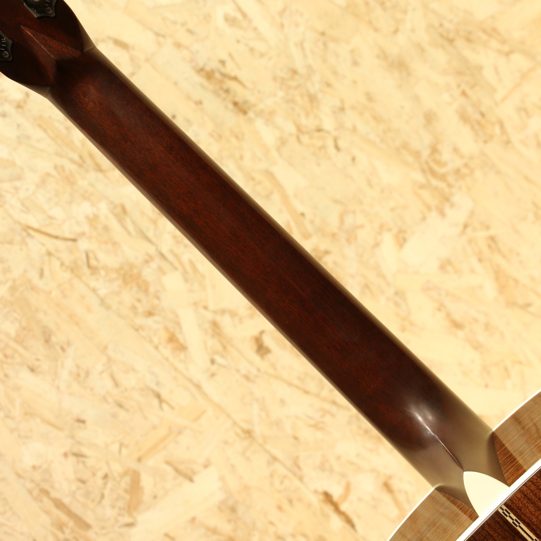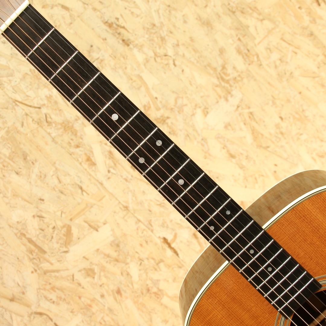 マーチンギターの中で最も有名なモデル"D-28"。現在同様の14fジョイントのドレッドモデルとして1934年に誕生してから、時を超え今もなお愛されるワールドスタンダードモデルです。本器は2021年製の1本。程よく焼けた飴色のスプルーストップ、イーストインディアンローズウッドサイド&バック、エボニー指板&ブリッジ、グローバーオープンバックペグ、パール指板ドット、べっ甲柄ピックガード、ノンスキャロップド・フォワードシフテッドXブレイシング。2017年からはギヤの見えるペグにべっ甲柄のピックガード等のオールドマーチンを思わせる外観。そこに様々なスタイルに対応できる演奏性や汎用性などを織り交ぜた現代的なアプローチ。戦前スペックと現代スペックを織り交ぜ、ハイブリッドな仕様にブラッシュアップされました。特筆すべきはブレイシング構造の変更、ブレイシングの交点をサウンドホール側にずらすフォワードシフトとブレイシングを削り込まないノンスキャロップ。これまでフォワードシフトはスキャロップが施されており、ノンスキャロップはスタンダードXかリアシフトの構造のみでした。それ等をミックスさせマーチンの歴史上これまで無かった新たな試みのパターンです。ネックはローオーバルシェイプで、直前のモデルに比べて少し薄目でしっかりした弧の字型になっています。指板幅が広くなったおかげでハイポジションまで弦間の広がりギャップが少なく、指板上を大きく行き来するフィンガースタイルプレイヤーにもストレスが掛かりにくくなっています。D28の特徴とも言うべきパワフルな低音やクリアな高音、それらを継承しながら深化したサウンド。より押し出し感の強い出音、ドライブ感のあるトーンはD-28ならでは。そこから前述の構造によりふくよかさを与えられ、空気感を含んだ音色を響かせてくれます。アタックの強いパンチ感やサウンドレンジの広さも健在、多彩なシチュエーションで対応できるオールマイティさや表現幅の広い仕様に仕上がっています。バックバインディングの両くびれに接着修正跡が見られますが、しっかりとリペアされています。ボディトップ面下部に細かな当てキズ、6弦側サイド面にいくつかのへこみキズ、バック面には細々とした擦れキズやバックルキズ、ヘッドの角にも僅かな当てキズや金属パーツのくすみなど若干の使用感こそ見られますが、全体を通してキレイなコンディションがキープされた個体です。ネックの状態は整えられ、現状扱いやすいセッティング。ゴールデンエラ期の良いところと現代に要求される演奏性を掛け合わせた現代のスタンダード。現在の最新仕様とも異なるこの時期ならではのクリアで芯のある音色。是非お手元でご体感ください。オリジナルハードケースが付属します。