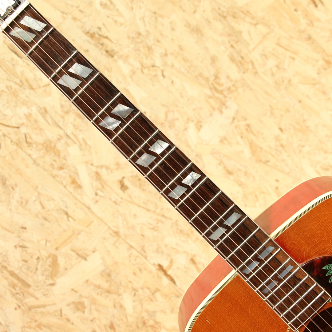 貫禄の外観と味わいあるインレイPGが印象的なフラッグシップモデル"Dove"。ギブソンとしては初となるスクエアショルダ型のハミングバードが好調だった理由で1962年にリリースが決まったが、フタを開けてみるとその生産規模はとても小さいものでした。本器は1965年までの17度ヘッド角を持つ人気の高い前期スペック1964年製。スプルーストップ、カーリーメイプルサイド&バック、マホガニーネック、ハカランダ指板&ブリッジ、チューンOマチックサドルは金属パーツ部分のみ特別に製作されたアタッチメントパーツで埋められノーマルスロットサドルへ交換、クルーソンワッフルバックペグ、クラウンヘッドインレイ、ダブルパラレログラム指板インレイ、オリジナルパールダブインレイセルロイドピックガード、7プライバインディング、ノンスキャロップドXブレイシング、ナット幅43mm、ヘッド角17度淡いチェリーサンバーストカラー。生産台数が少ないことで知られるオリジナルダブ、オリジナルピックガードの鳩も手彫りで趣きのある時代です。背丈の低いブレイシングが採用されていて、歯切れが良く、力強いブライトなトーンが持ち味の本器。ノーマルスロットサドルへの変更はトッププロも愛用する定番の改造で振動がしっかりとトップに伝わる腰のある低音と抜け、そして今後のピックアップマウントへのアプローチの幅が広がりポジティブな内容と言えます。ネックヒールにストラップピンマウント、ピックガードの外側付近に2か所、内側の上面サウンドホールから指板にかけた部分に1cmほど軽微なガードクラック修正あとがありますが、これもビンテージでは定番の補修といえます。ボディー全体にはびっしりと細かいウェザーチェック、点々とみられる多少の打痕やこすり傷、ネック裏の特にローポジションの範囲に表層の剥がれ跡がありますがオリジナルフィニッシュをキープ。年代を考えると使用感は比較的薄く、上記に触れた部分以外の木部割れなどもない素晴らしい状態をキープ。ネックは良いアングルと状態をキープしており、演奏性も抜群。レギュラーグリップ、17度ヘッド期の格別なDOVEサウンド、1960年代後半のダヴとはこれまた一線を画した音色で野太く伸びのある低音でコアなダヴファンが求める骨太さは前期モノならではです。つま弾いて一聴、これが正解だったという気持ちに連れて行ってくれる、そんな気分の高まるサウンドです。多少の手入れがありますがとても丁寧に使用されてきた個体でDOVE愛を感じる一本。初期ものは価格高騰も見られ、選びも難しくなりつつあります。お探しだった方には是非オススメしたいFine Vintageです。汎用ハードケース付属。