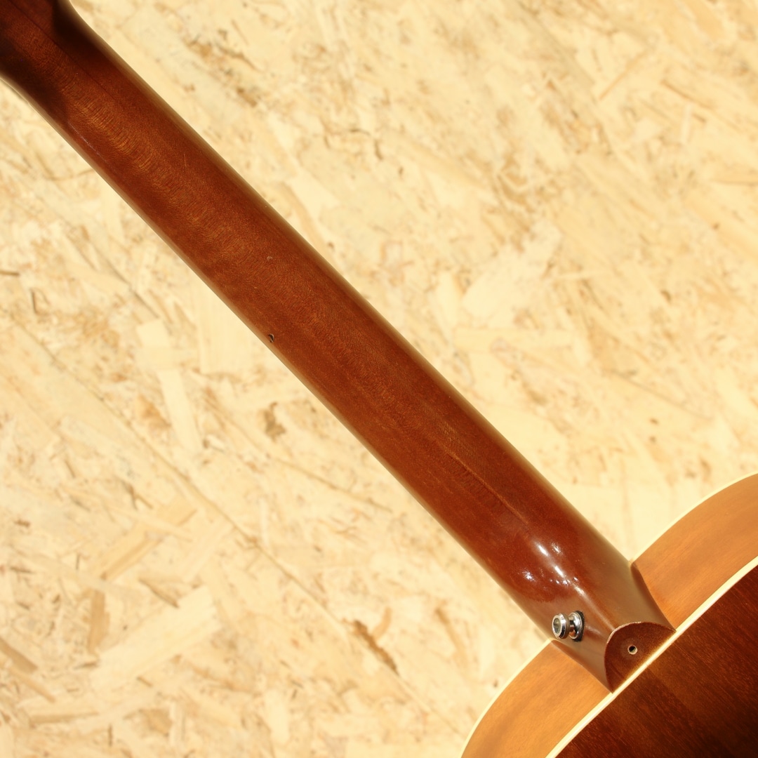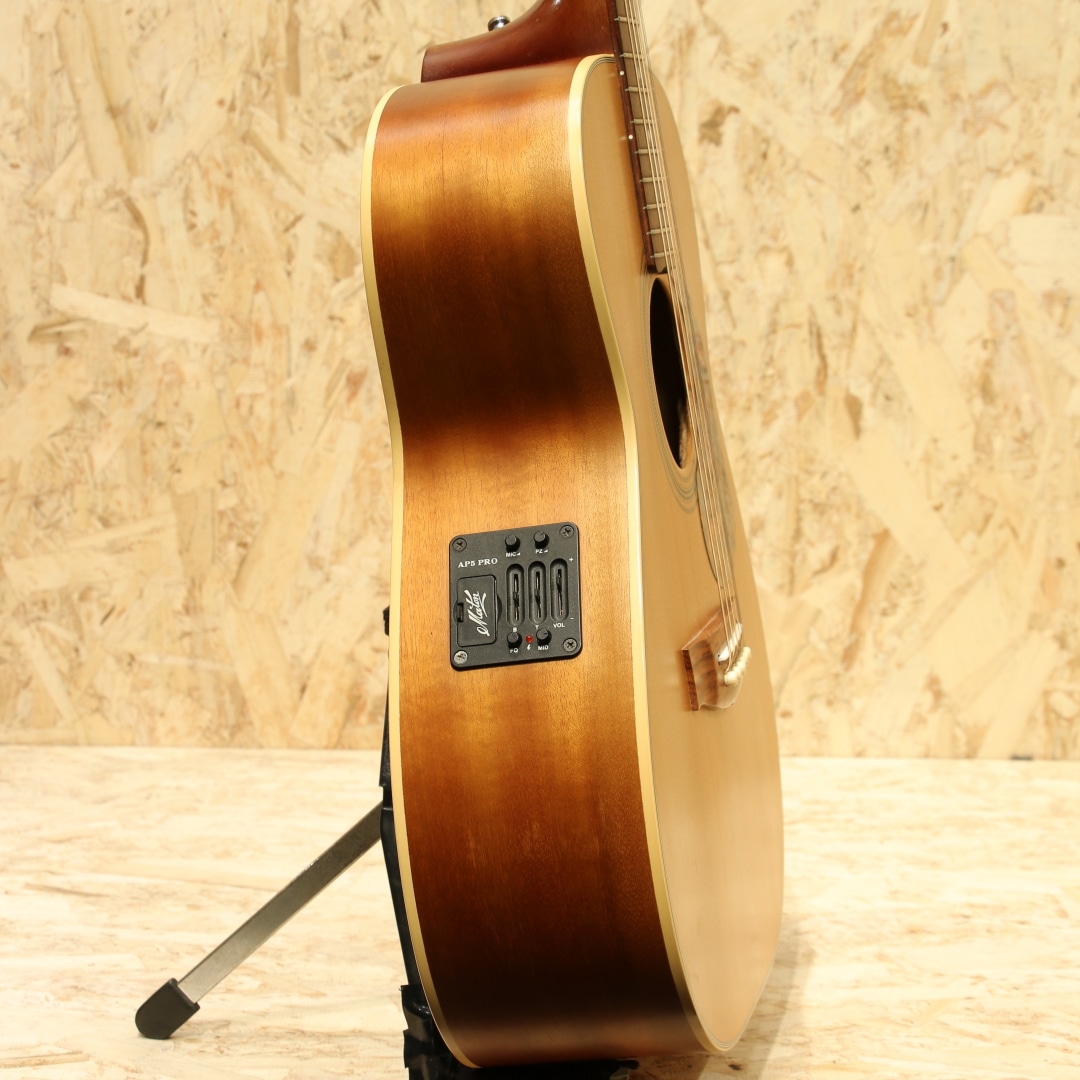 オーストラリアを代表する老舗ギターメーカー"MATON"。1946年、ギター製造会社がそれまでは存在しなかったオーストラリアに設立され、古くから地元ミュージシャンがこぞって愛用するブランドです。現在では世界を魅了するスーパーギタリスト"トミー・エマニュエル"が実践を通じてその高いポテンシャルを露呈し、音に煩いソロギタリストやスタジオ系ミュージシャンを中心に世界中で高く評価されています。本器は"トミーエマニュエル"のシグネイチャーモデル"EBG808 TE"。トミーが使用するモデルでも最も印象が深いノンカッタウェイ仕様。AAAグレードシトカスプルーストップ、クイーンズランドメイプルサイド&バック、クイーンズランドメイプルネック、ローズウッド指板&ブリッジ、ヘリンボーンロゼッタ、アイボロイドバインディング、オリジナルグローバーペグ、プリアンプシステム"AP5 Pro"内蔵。00サイズよりも少しだけ幅広なボトムと深めの胴厚が特徴のメイトンを代表する808ボディ。マホガニーに近い特性をもつクイーンズランドメイプルをS&Bに使用、ふくよかで切れの良いトーンと小振りなサイズ感が持つタッチレスポンスの早さの相性は抜群です。テクニカルなプレイにもしっかりと追従する抜群の操作性も魅力の1つです。搭載マイクは"AP5Pro"。アンダーサドルピエゾとコンデンサーマイクのブレンドシステムで、ピエゾ/マイクの各ボリュームに加え、マスターボリュームを装備。テレブル/ベースのEQに加えミドル/フリケンシーが備えられており、簡単操作で幅の広い実用的なセットアップが可能になっています。よりアグレッシブなアタック音から倍音の繊細さまでリアルにアウトプットしてくれるラインサウンドです。ペグの交換歴が見られ、ヘッド裏にはネジ穴が開けられています。良く弾き込まれてきたのかサウンドホール周りの弾きキズ、ボディトップやバック、ヘッドなどにもいくつかのへこみ傷や当てキズ、擦り傷が散見されます。経年の焼けも相まって貫禄のある1本へ仕上がっています。ネック裏や抱えた際に衣服等が当たる個所に経年使用による若干の艶が見られます。ネックコンディションも大変良好、プレイコンディションもしっかりセットアップされておりますのですぐにでも活躍できる1本です。人気モデルの中古品ですので、気になられた方は是非お早めにご検討ください。オリジナルハードケースが付属します。(ケースにはややべたつきが見られます)