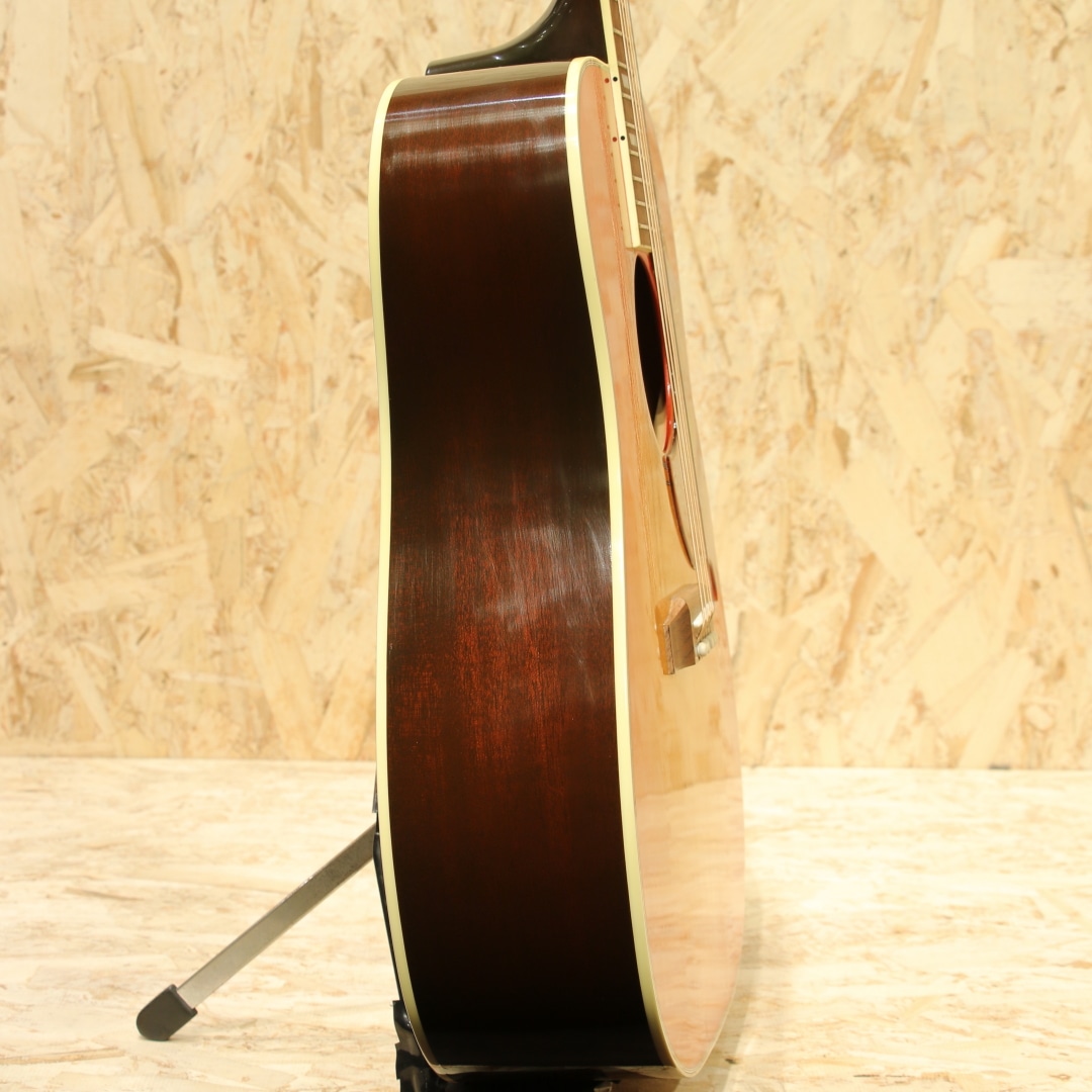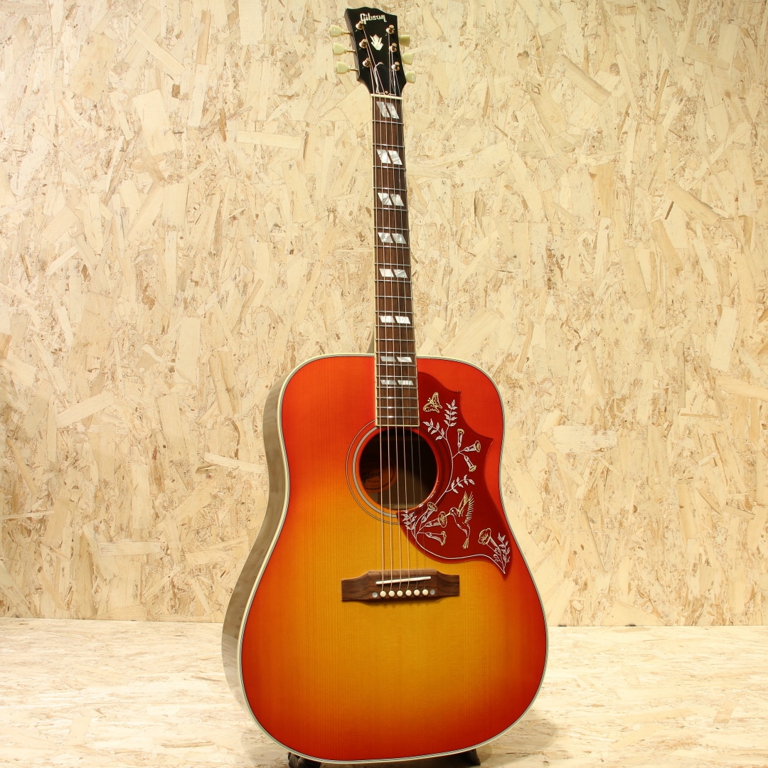 ハチドリをモチーフとした斬新なピックガードデザインで1960年の登場当時から注目と人気を集めた"ハミングバード"。日本においてもギブソン定番機種として今だにJ-45と肩を並べるモデルです。本器はトップにアディロンダックスプルースを用いたマンスリーリミテッドモデル"Hummingbird Red Spruce"。2015年製USED品です。アディロンダックレッドスプルーストップ、マホガニーサイド&バック、マホガニーネック、ローズウッド指板&ブリッジ、彫り込みを入れたトラディショナルハミングバードピックガード、MOPダブルパラレログラム指板インレイ、MOPクラウンヘッドインレイ、クルーソンペグ、ヴィンテージチェリーサンバーストVOSフィニッシュ、L.R.Baggs Element Plusピックアップ搭載。レギュラーとは異なりハチドリはプリントではなく、60年代の質感を再現した厚手のピックガードを使用しています。半ツヤに仕上げられたVOSフィニッシュは、ヴィンテージライクな質感のルックスもさることながら、ハミングバードらしい明るく快活な歯切れの良いサウンドを基本に、アディロンダックならではのパワー感や躍動感を持った太いサウンドを出力。まとまりの良さやブライトなサウンド故にコードストロークが特に気持ち良く響いてくれます。フィンガーでは一転して素朴な甘いトーンで響き、歌に寄り添うトーンを魅せ、あらゆる面でスタンダードとは一線を画す1つ上の良質感があります。ピックアップにはL.R.Baggs Element Plusを搭載。1ボリューム1トーンのシンプル操作かつパワフルでナチュラルなアクティブシステムでステージでの活躍はもちろん宅録や配信など様々なシーンで活躍が期待できます。使用感によるトップ面の艶やバック面に何かが擦れたようなキズはあるものの目立つ打痕などは無く細かな擦れキズもVOSフィニッシュのおかげでうまく馴染んでくれています。ネック・プレイコンディション共に良好で生音でももちろん、ルックスも相まりステージでも活躍してくれること間違いなしの1本。是非お手元でお確かめくださいませ。オリジナルハードケースが付属します。