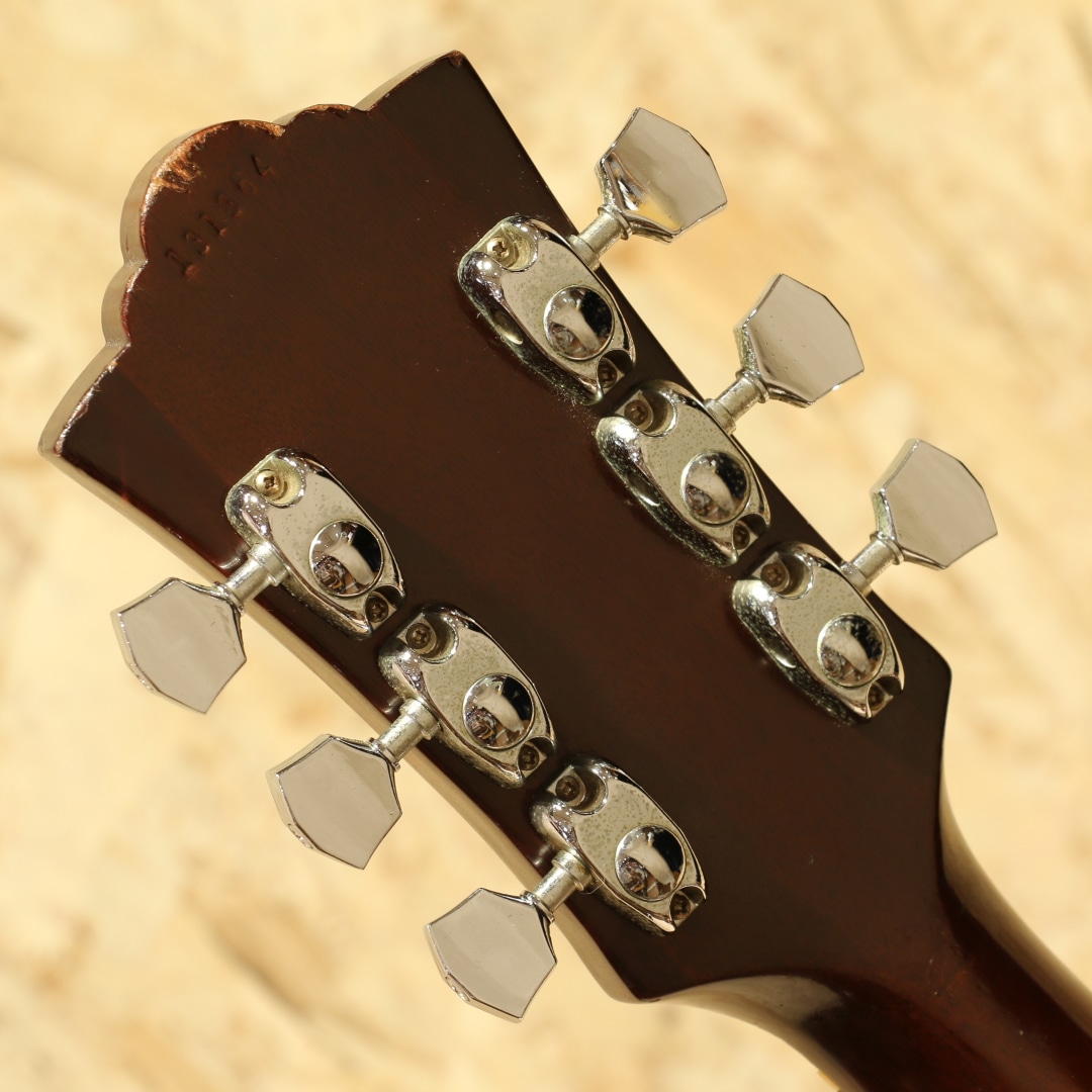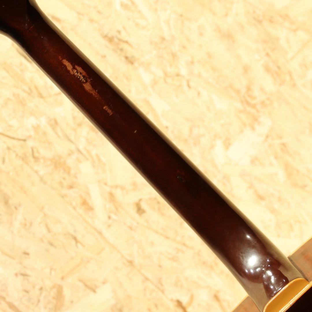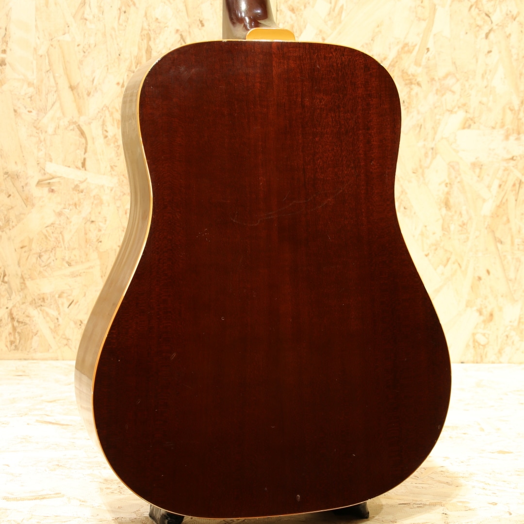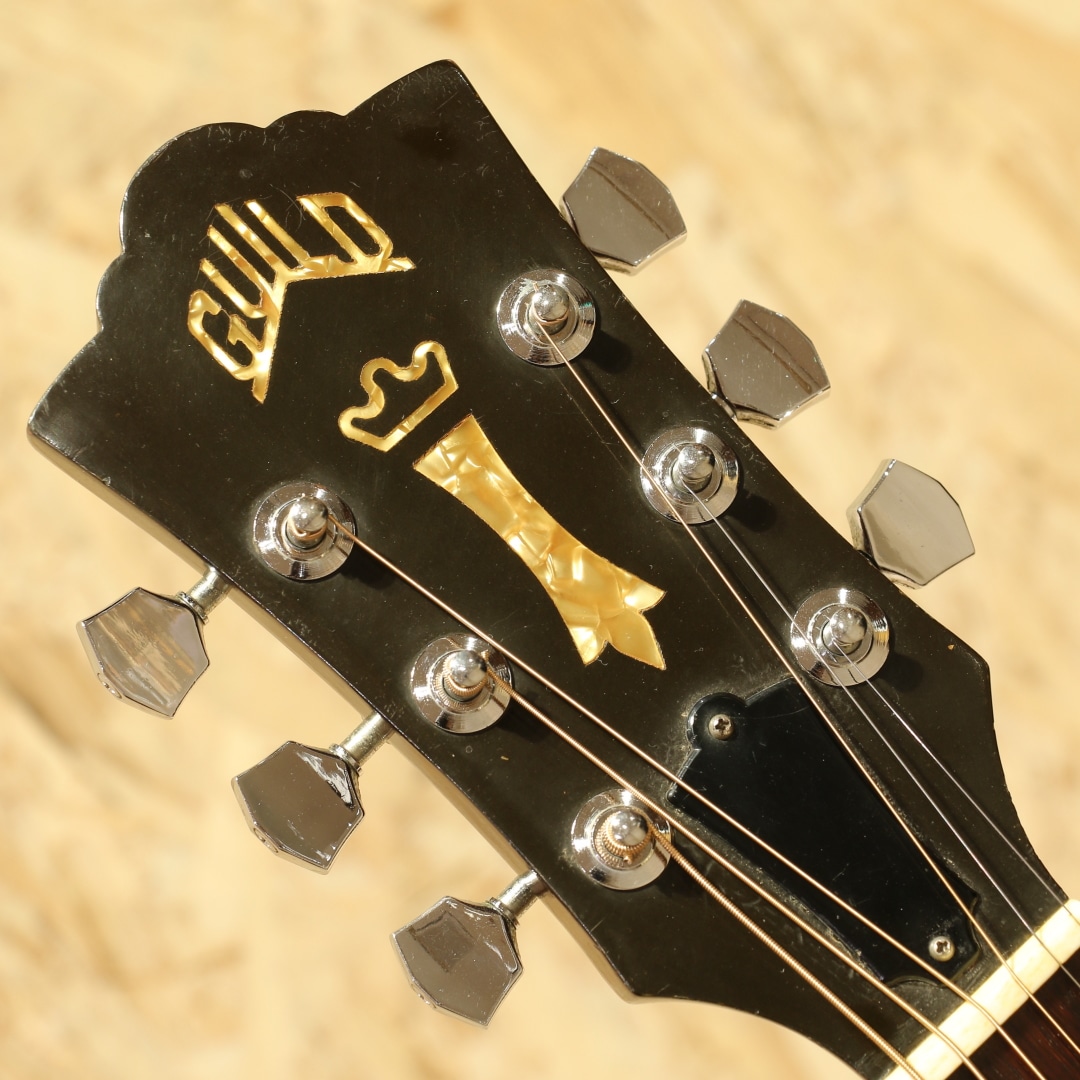 かつてのアコースティックギター御三家ブランドの一つギルド。1952年、ニューヨーク・エピフォン時代の職人達により産声を上げたギルド・ギター。多くのミュージシャンと契約をし、表舞台で活躍するメイドインUSAの古き良きブランドとして名を馳せていました。"Paul Simon (ポール・サイモン)やJohn Denver (ジョン・デンバー)、Nick Drake (ニック・ドレイク)等、数多のフォークシンガー達が愛したギターブランドです。本器はマホガニーS&B仕様の"D-40"1976年製のUSED品。1963年より製造開始された同社初のドレッドノートモデルとしてフラッグシップモデルの"D-50"とともに同ブランドの知名度を確立したモデルとしても知られています。スプルーストップ、マホガニーサイド&バック、マホガニーネック、ローズウッド指板&ブリッジ、クロームロトマチックペグ、べっこう柄ラージピックガード、ノンスキャロップドXブレイシング。フラッグシップモデルでもあるD55などのローズウッドモデルとは異なる、快活で抜けが良く、乾いた中にも芯を感じさせるサウンド。音の立ち上がりも軽やかで、軽いピッキングでもカラッとした明るいトーンを奏でます。この時期としては見られる僅かなネックの元起きが確認できます。年代の特徴も重なり、フォーキーなセッティングですがその分音量もしっかり稼げており、コードストローク時のボリュームは大きな満足感を得られます。トップ面ピックガード上部とサウンドホール下部のピックガードに沿ったウッドクラックがありますがどちらもリペア済です。ヘッド裏やネック裏、バインディングの塗装剥げ、サイド面ボトム箇所の打ちキズによる塗装欠けや随所にみられる打痕や当てキズ、サウンドホール周りのピッキングウェアなど製造から約50年経過した個体ですので、それなりの使用感はございますが弾き込まれた証として眺めて楽しむのも一興です。
