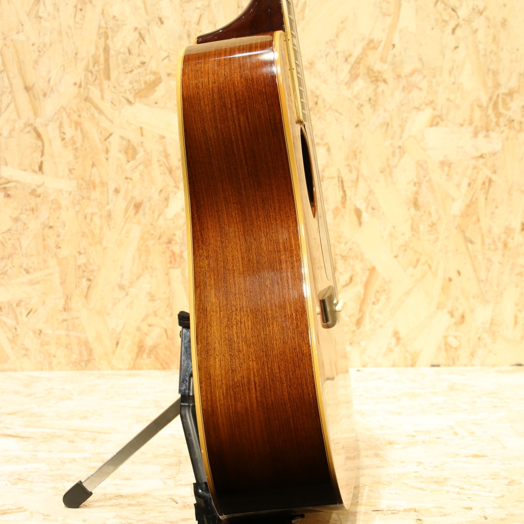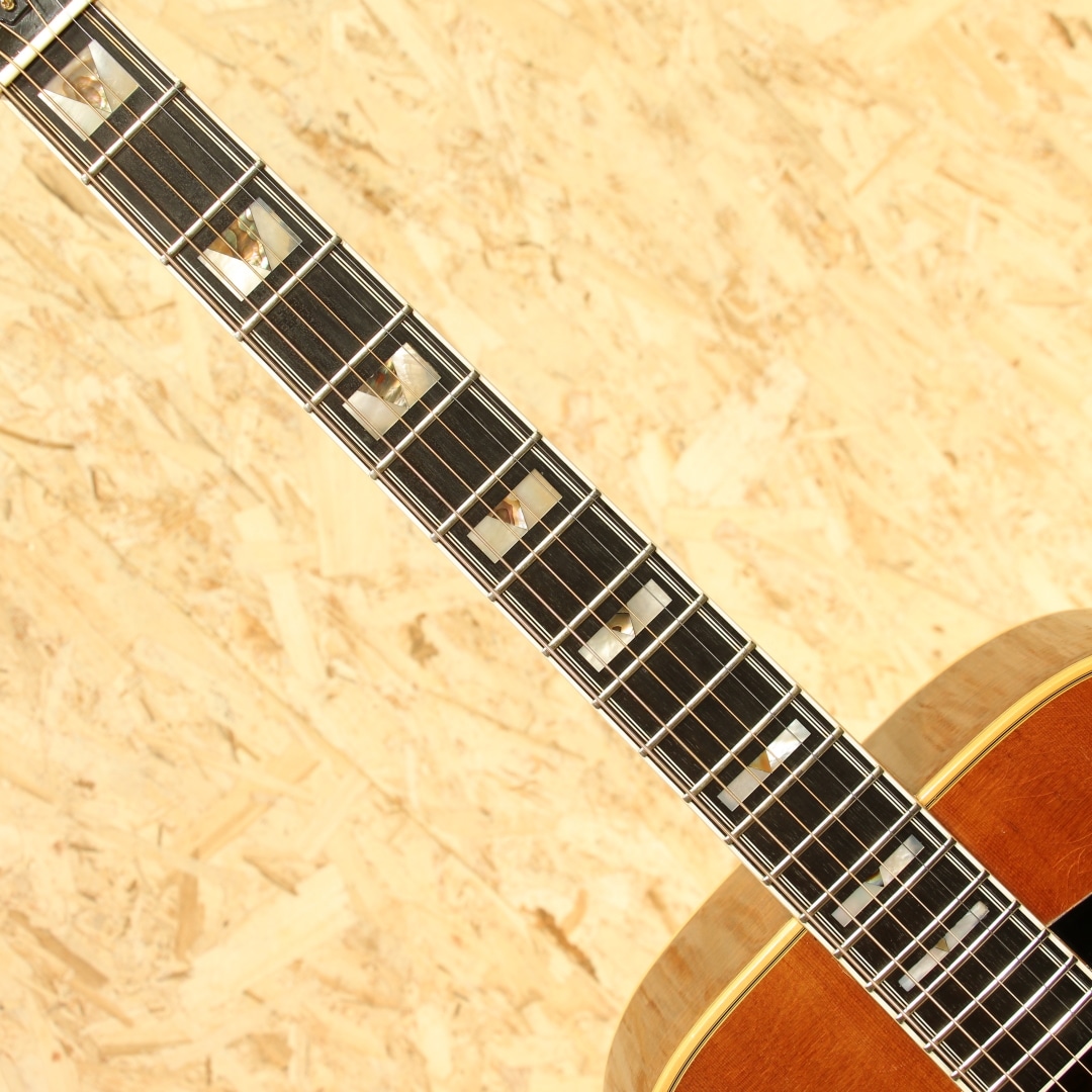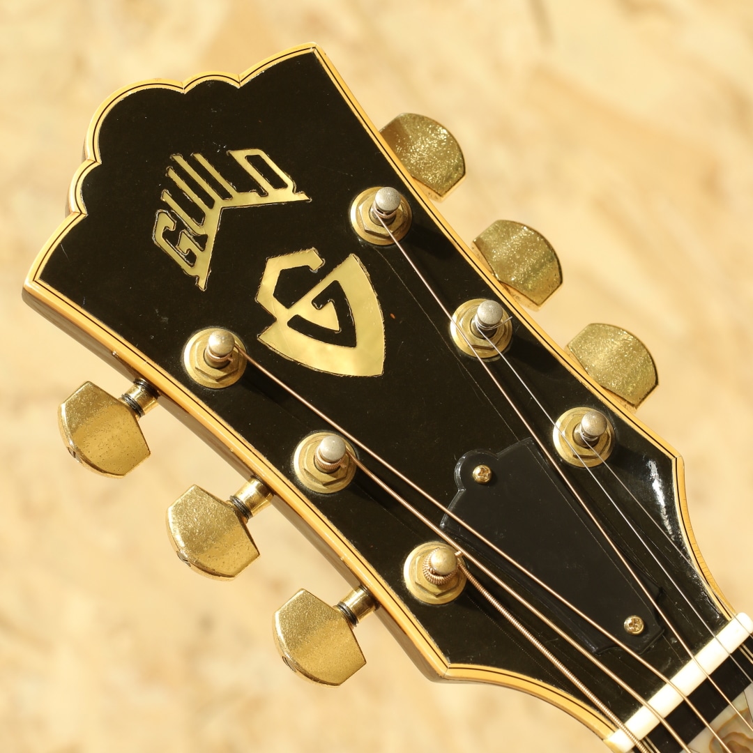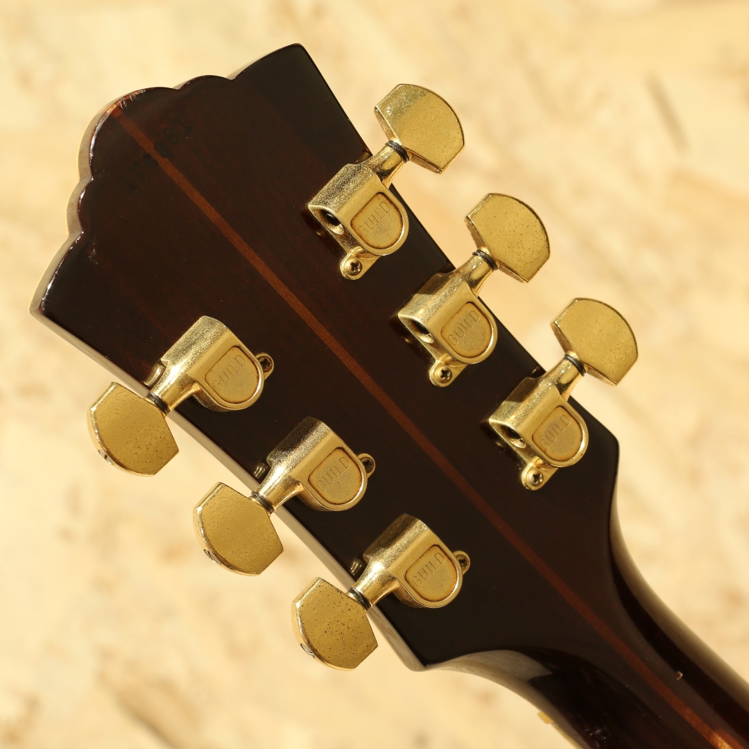 1968年にカスタムメイドモデルとして市場に登場し、1976年にレギュラーラインとなったフラッグシップモデル"D-55"。1960年代にはSmothers Brothers ShowのTommy Smothersらが使用したことで、人気を博し、Waylon Jennings、Billie Joe Armstrong、David Nailなどのアーティストたちが使用したことで数十年に渡り世界的に有名で人気なモデルとなりました。本器は1978年製、レギュラー生産が始まった比較的初期頃の1本。スプルーストップ、インディアンローズウッドサイド&バック、マホガニーネック、エボニー指板&ブリッジ、刻印入りオリジナルゴールドシャーラーペグ、パール&アバロン指板インレイ、オリジナルピックガード、ノンスキャロップドXブレイシング、ナチュラルカラー。無骨なサウンドはハードなストロークプレーにハマりますが、ギルドの最高級モデルだけあって響きにしなやかさがありますし、倍音も豊かでリッチに聴かすことのできるギターです。1952年に設立されたギルドギターはアーティストに厚く指示されている頑丈な楽器で、国内外を問わず多くのミュージシャンが使用しています。ピックガード左下部内側にガードクラックがありますが修正されておりよく見れば跡は分かるものご使用上の影響はありません。1弦側サイド面に3cm程の割れ修正跡がありますが、内部までは貫通しておらずリペア済です。バック面に棒状のようなものが押し当てられた形跡があり、塗装がやや変形しておりますがこちらも表面上のものでご使用への影響はありません。年代物ですの塗装面の打ちキズや細かな打痕等はありますが、痩せはほとんどなく厚みのある風合いの良い塗装コンディションです。ネック裏も経年使用により塗装の剥がれが見られ、この年代であれば致し方ない症状ですが触った際の不快感などはありません。サウンドホール周りのピッキングウェアなどしっかりと使い込まれてきたことのうかがえる本器。年代を象徴するややフォーキーなプレイアビリティで芯の太い大きな鳴りが特徴の1本。ネックコンディションも良好です。昨今、見かける個体も少なくなってきている"D55"、是非お早めにご検討ください。オリジナルハードケースが付属します。