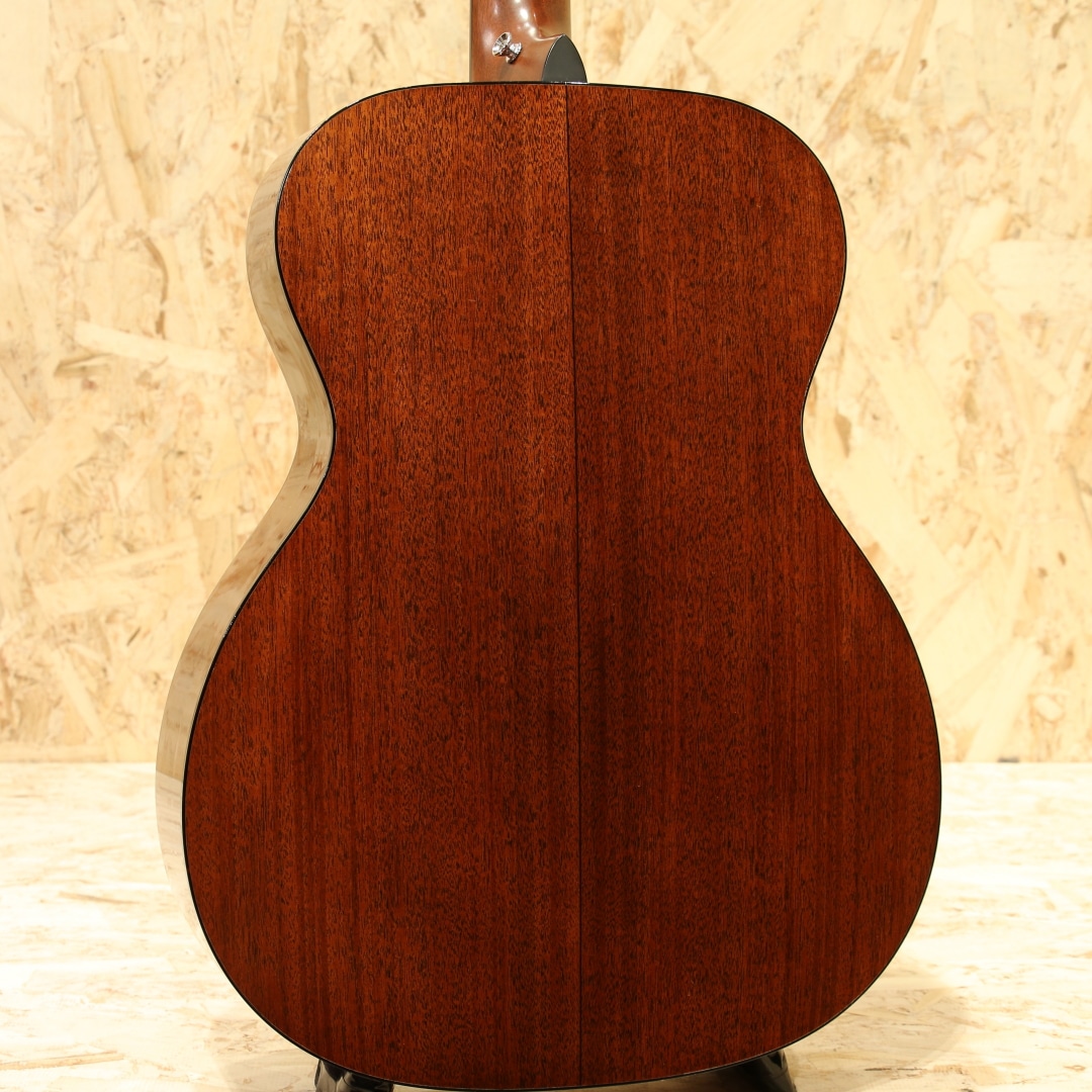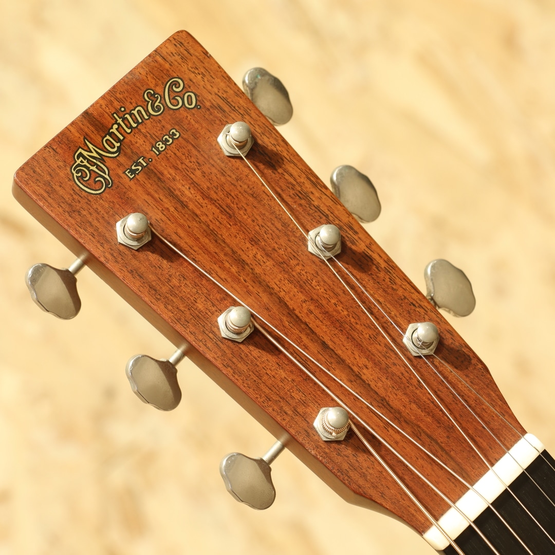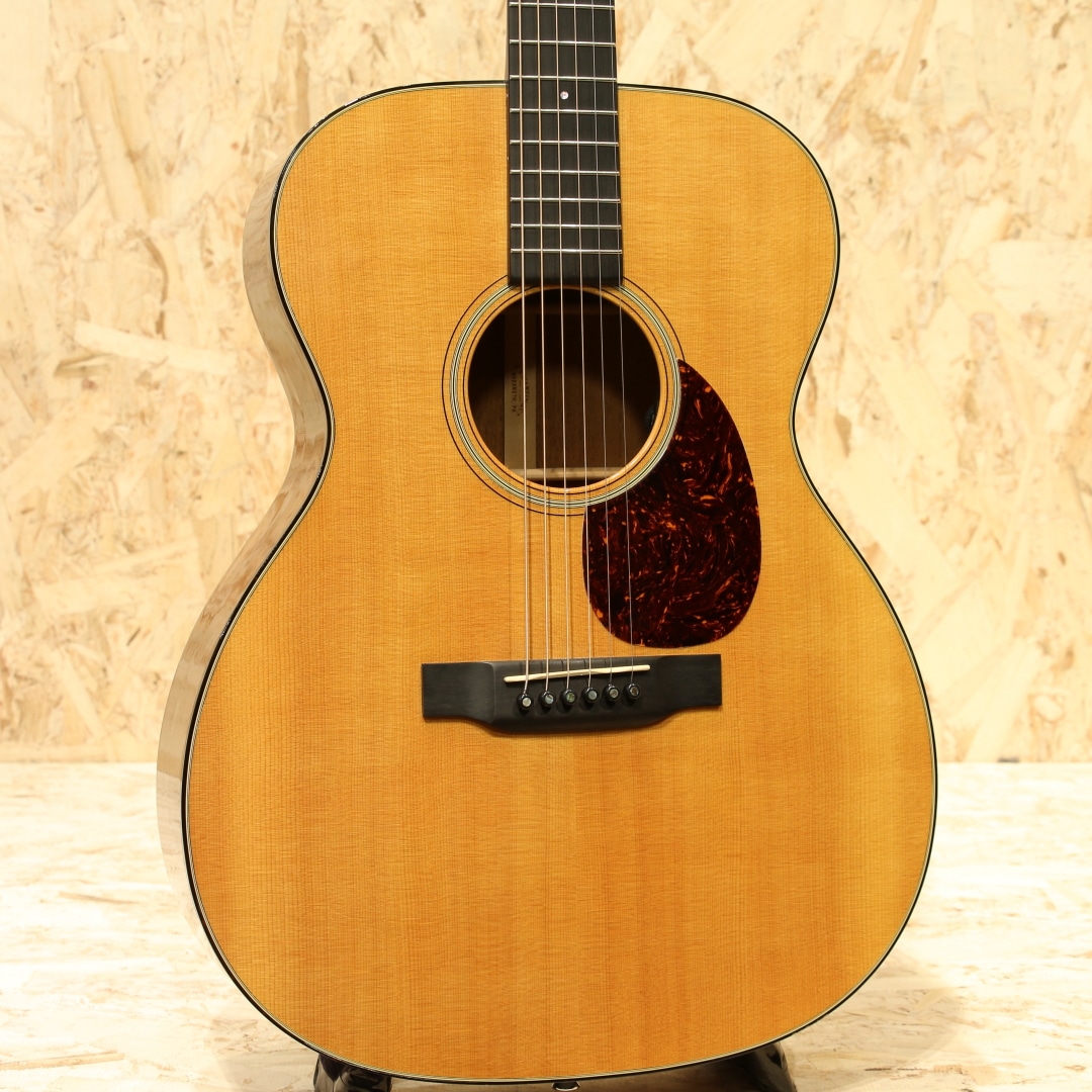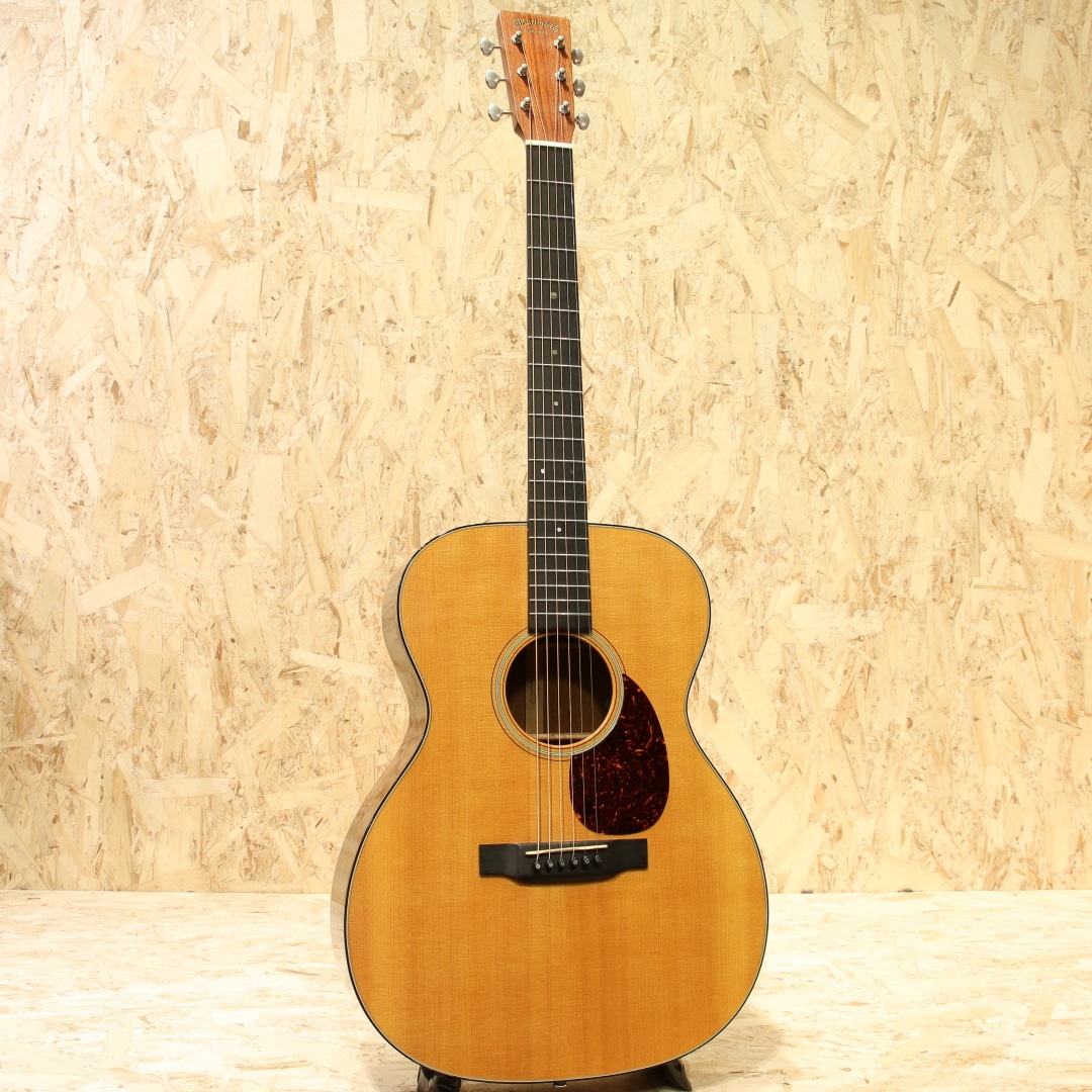 ギター・バンジョー奏者のアイデアを取り入れマーチン初の14フレットモデルとして生まれたオーケストラモデル"OM"。その後"OOO"モデルへと継続され、様々なモデルの礎となりました。当時のラインアップにも影響を与えた革新的モデルです。本器はトラッドなスタイル18を踏襲しながら実戦的なP.Uを搭載された”OM-18E”。2018年製USED品です。シトカスプルーストップ、ジニュインマホガニーサイド&バック、エボニー指板&ブリッジ、グローバーオープンバックペグ、アバロンドット指板インレイ、べっ甲柄ピックガード、44.5mmナット幅、ハイポジションまで薄くパフォーマンス力の高いハイパフォーマンステーパーネック、スリムで演奏性の高いモディファイドロウオーバルネックシェイプ、フォワードシフテッドスキャロップドXブレイシング、Fishman AURA VT ENHANCEピックアップ搭載。トラッドなルックスにモダンな演奏性、そして何よりもハイパフォーマンスなピックアップを搭載し活躍する場所を選ばない本器。本体の構造は生アコースティックで設計されているため、スタンダードモデルのOOOやOMと遜色のない生音。しかしスリムなネックの厚み、ハイポジションまで薄さを保ったネックテーパー等演奏性においてはモダン仕様で製作されているため、あらゆるスタイルにマッチするギターに仕上がっています。ナット幅も今では定番となった44.5mmナット幅、フィンガースタイルやピックでのストロークなどの演奏スタイルを問いません。トラッドとモダンを融合させたハイブリッドなスタイルです。マホガニーを使用したスタイル18らしい明るくカラッとしたサウンド。レンジ感こそローズ仕様の28に譲りますが、ギターの美味しい中域が出やすいドライで抜けの良いサウンドです。ローズ仕様に比べても音の立ち上がり速度は速く、細やかなフレーズやアクセント、強弱のつけやすさも魅力の一つ。ロングスケール特有の張り感のあるサウンド、輪郭を出しやすい点やレンジ感も含め音が前に出るような元気さも特徴。生音だけでも流石マーティンと言えるオールマイティなギターです。標準で搭載された"オーラVTエンハンス"ピックアップシステム。アンダーサドルピエゾ側プリアンプにマイクで収音したようなモデリング機能"オーラ・イメージ"を内蔵、そしてブリッジプレートに取付られたエンハンス・トランスデューサーによる生のボディの空気感を組み合わせたサウンドが可能になっています。サウンドホール6弦側にはマスターボリュームとトーンが搭載されており、同1弦側に搭載されたエンハンスボリュームでエンハンサーをブレンド出来るシステム。ピエゾ単体でもオーライメージで生音に近づけていますが、エンハンサーでより生感の強い、レンジ感の広いサウンドまで出力できる非常に優れたピックアップシステムです。過去にボディくびれ4か所の剥がれ修正がされた跡が見られますが、近年マーチンでは致し方無いでしょう。丁寧に補修がされており使用する上で問題の無い状態になっています。その他ヘッド表6弦側角や先端に極薄い当てキズ、ボディバック面の若干のバックルキズのような薄い凹みやぺグのくすみなどが見られますが、その他はボディ表面に薄い擦りキズが見られる程度とキレイなコンディションをキープされている本器。ネックコンディションも非常に良い状態を保たれており、実戦仕様らしい演奏性を確保された1本です。伝統と最新の融合、トラッドなスタイル18に実戦的なピックアップシステムを内蔵した、ステージでも生でも所構わず活躍してくれる頼れる1本。ガシガシ使える相棒としていかがでしょうか。
