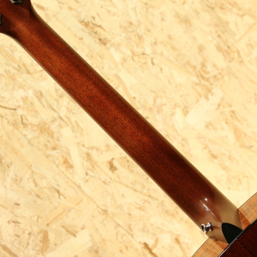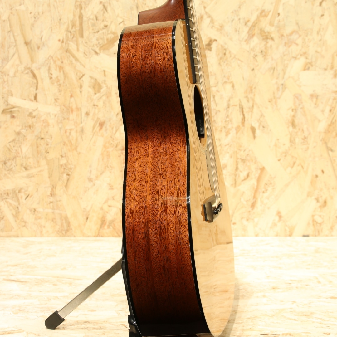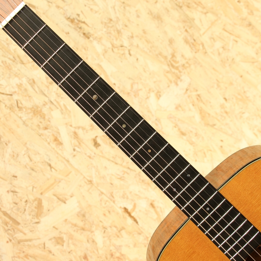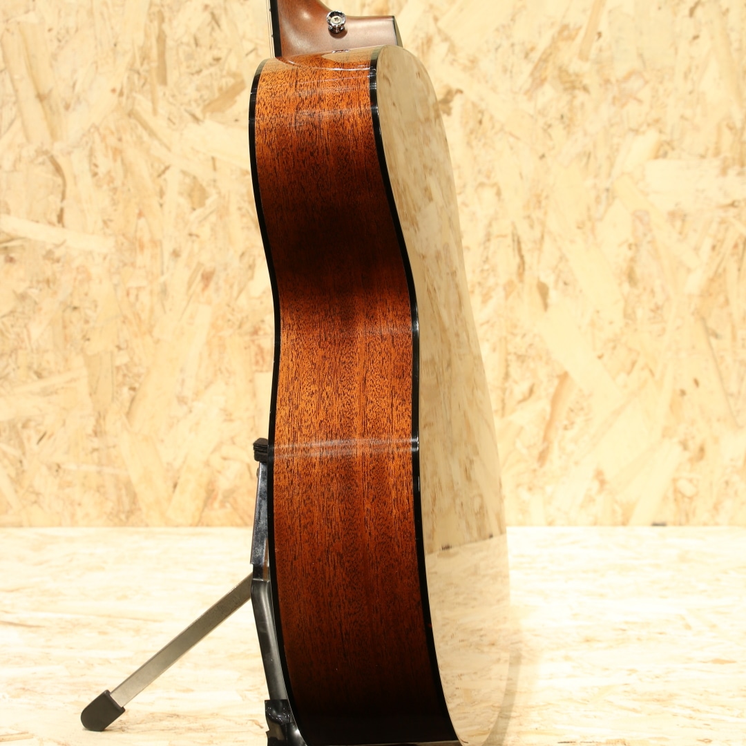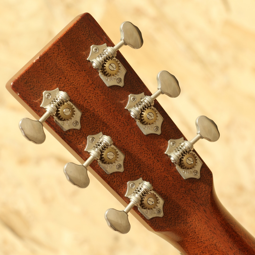 ギター・バンジョー奏者のアイデアを取り入れマーチン初の14フレットモデルとして生まれたオーケストラモデル"OM"。その後"OOO"モデルへと継続され、様々なモデルの礎となりました。当時のラインアップにも影響を与えた革新的モデルです。本器はトラッドなスタイル18を踏襲しながら実戦的なP.Uを搭載された”OM-18E”。2018年製USED品です。シトカスプルーストップ、ジニュインマホガニーサイド&バック、エボニー指板&ブリッジ、グローバーオープンバックペグ、アバロンドット指板インレイ、べっ甲柄ピックガード、44.5mmナット幅、ハイポジションまで薄くパフォーマンス力の高いハイパフォーマンステーパーネック、スリムで演奏性の高いモディファイドロウオーバルネックシェイプ、フォワードシフテッドスキャロップドXブレイシング、Fishman AURA VT ENHANCEピックアップ搭載。トラッドなルックスにモダンな演奏性、そして何よりもハイパフォーマンスなピックアップを搭載し活躍する場所を選ばない本器。本体の構造は生アコースティックで設計されているため、スタンダードモデルのOOOやOMと遜色のない生音。しかしスリムなネックの厚み、ハイポジションまで薄さを保ったネックテーパー等演奏性においてはモダン仕様で製作されているため、あらゆるスタイルにマッチするギターに仕上がっています。ナット幅も今では定番となった44.5mmナット幅、フィンガースタイルやピックでのストロークなどの演奏スタイルを問いません。トラッドとモダンを融合させたハイブリッドなスタイルです。マホガニーを使用したスタイル18らしい明るくカラッとしたサウンド。レンジ感こそローズ仕様の28に譲りますが、ギターの美味しい中域が出やすいドライで抜けの良いサウンドです。ローズ仕様に比べても音の立ち上がり速度は速く、細やかなフレーズやアクセント、強弱のつけやすさも魅力の一つ。ロングスケール特有の張り感のあるサウンド、輪郭を出しやすい点やレンジ感も含め音が前に出るような元気さも特徴。生音だけでも流石マーティンと言えるオールマイティなギターです。標準で搭載された"オーラVTエンハンス"ピックアップシステム。アンダーサドルピエゾ側プリアンプにマイクで収音したようなモデリング機能"オーラ・イメージ"を内蔵、そしてブリッジプレートに取付られたエンハンス・トランスデューサーによる生のボディの空気感を組み合わせたサウンドが可能になっています。サウンドホール6弦側にはマスターボリュームとトーンが搭載されており、同1弦側に搭載されたエンハンスボリュームでエンハンサーをブレンド出来るシステム。ピエゾ単体でもオーライメージで生音に近づけていますが、エンハンサーでより生感の強い、レンジ感の広いサウンドまで出力できる非常に優れたピックアップシステムです。過去にボディくびれ4か所の剥がれ修正がされた跡が見られますが、近年マーチンでは致し方無いでしょう。丁寧に補修がされており使用する上で問題の無い状態になっています。その他ヘッド表6弦側角や先端に極薄い当てキズ、ボディバック面の若干のバックルキズのような薄い凹みやぺグのくすみなどが見られますが、その他はボディ表面に薄い擦りキズが見られる程度とキレイなコンディションをキープされている本器。ネックコンディションも非常に良い状態を保たれており、実戦仕様らしい演奏性を確保された1本です。伝統と最新の融合、トラッドなスタイル18に実戦的なピックアップシステムを内蔵した、ステージでも生でも所構わず活躍してくれる頼れる1本。ガシガシ使える相棒としていかがでしょうか。