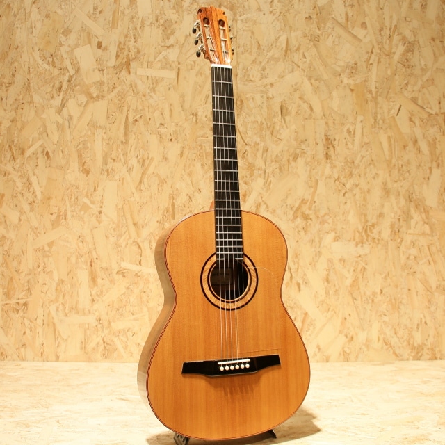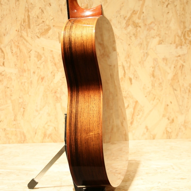 今もっとも脂の乗った製作家のひとりともいえる"Stephan Marchione(スティーブン・マルキオーネ)"のSteel String Acoustic。数々の有名ビルダーを輩出したPensa Suhr在籍後1993年に独立し、2001年からはテキサス州ヒューストンへ自身の工房を開いています。ステファン・マルキオーネはアーチトップをはじめ、ソリッド、クラシック、バイオリンまで、弦楽器のその大半を製作でき、そのすべての分野で喝采を博しています。本器はマルキオーネ製作の鉄弦フラットトップ。2015年製ニアミントUSED品。伝統的なクラシックギターサイズのボディ、プレミアムシトカスプルーストップ、マダガスカルローズウッドサイド&バック、ワンピースホンジュラスマホガニーネック、エボニー指板&ブリッジ、彫金ウェバリーペグ(エボニーノブ)、マダガスカルローズウッド化粧板、クリアピックガード、フレイムメイプルロゼッタ、CSA RWバインディング、オリジナルスキャロップブレイシング、極薄のバーニッシュフィニッシュ、オリジナルカールトンケース付属。表板は四十年物、ネックのマホガニーと指板&ブリッジのエボニーは1950年代物とかなり古い素材です。マルキオーネギターの特長とも呼べるクリスタルなトーン。今までも製作していたナイロン弦仕様と比べると、鉄弦となっている分だけ音の輝きが幾分増しています。圧倒的に太い出音で、とても美しい硬質な響きを持ったギターです。輪郭のあるブライトな音色ですが、荘厳で奥ゆかしさがあります。驚くほど明瞭な音で鳴り、指板の何処を押さえてもロス無く音が飛び出す感覚は彼の作品の魅力の一つです。作られて間もない楽器とは思えないほど豊潤でダイナミクスがあり、抑揚の表現力に素晴らしい一本です。実際に音を出してみると彼の作品がいかに個性的で、水準の高い所で釣り合いがとれて整った音色だということを感じていただけるでしょう。サウンドはもちろん、恐ろしく完成度が高いギターで、木工、装飾、塗装、すべてにおいてパーフェクトな仕上がりです。非常にキレイなままの状態をキープされており、新品同様のコンディションの個体。10年近くの経年を全く感じさせません。ネックコンディションも良好、滑らかに運指の出来る、状態が非常に良い1本。確かな技術と、稀少な素材を使って製作された本物のアコースティックギター。素晴らしい楽器なので、一生モノのギターをお探しの方には自信を持って選択肢の一つに推薦します。