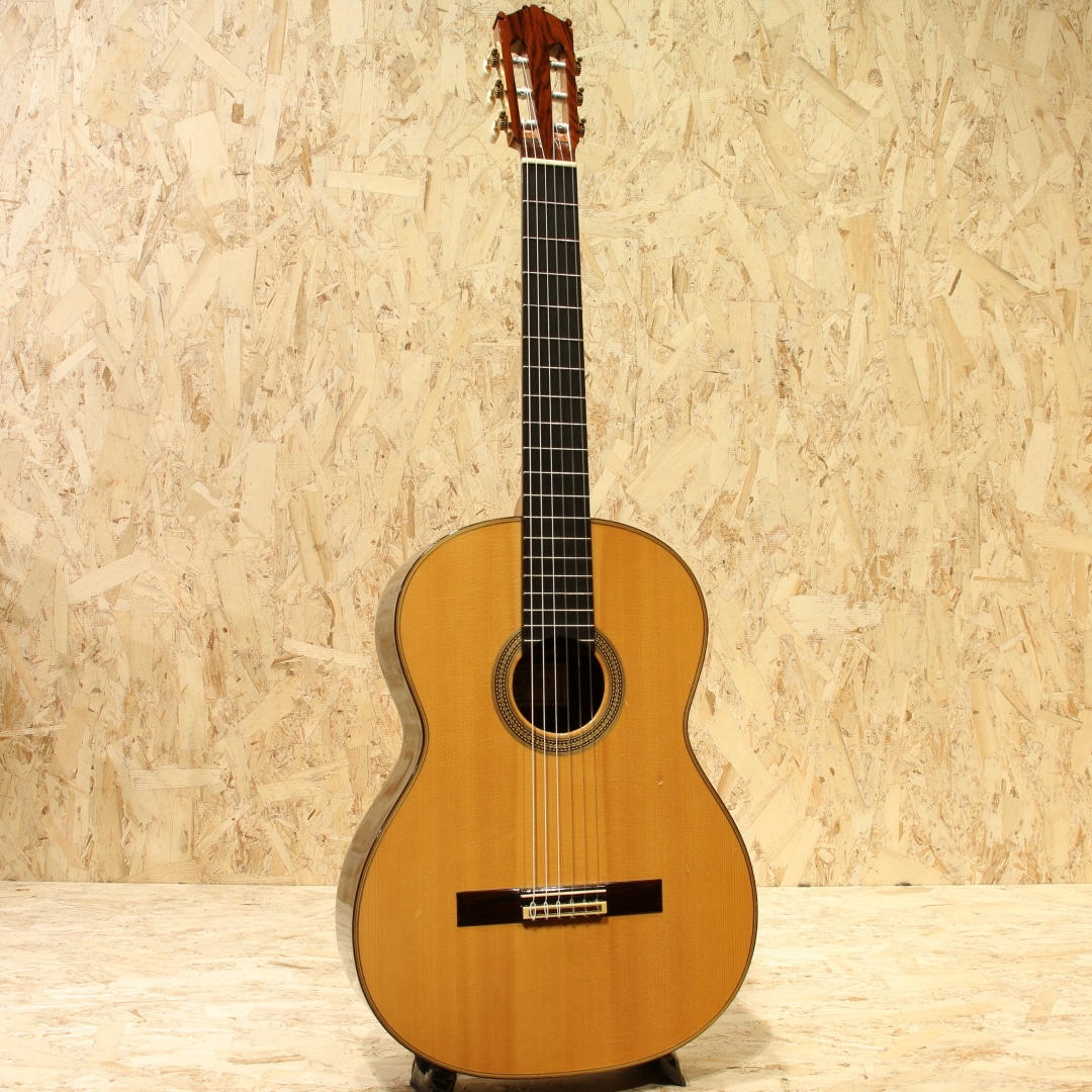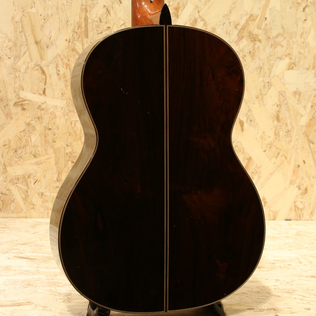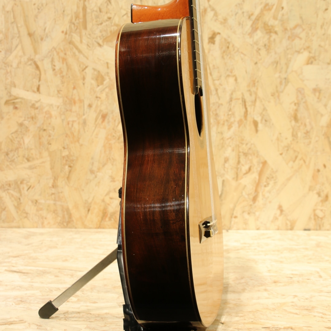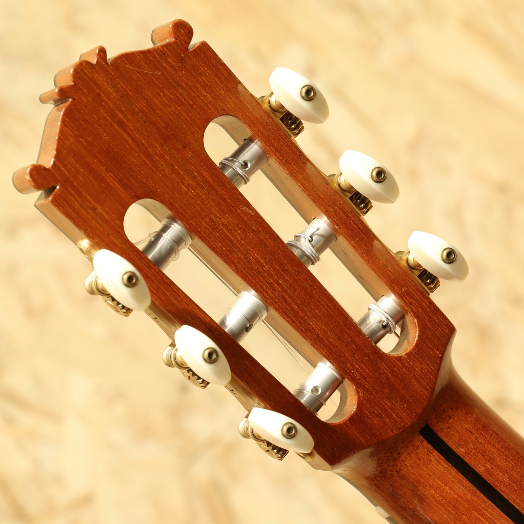 製作家"横尾俊佑"が手掛ける自身の手工ブランドS.Yokoo。国内クラシックギター製作の第一人者""河野 賢"に師事し、1972年に工房を設立。カシューを使用したクオリティの高い塗装技術、演奏性の高さ、そして軽やかさと重厚感を兼ね備えた独自の音色に定評のある人気製作家が手掛ける"POEM"2005年製USED品です。表板に松単板、側&裏板にはマダガスカルローズウッドを使用。黒檀指板、中南米ローズウッド駒、寄木細工口輪、ウッドバインディング、ナット幅52ミリ、弦長650ミリ。メロウで情緒のあるサウンドはクラシックだけでなく、ボサノバやジャズのソロギターなどにもマッチする響き。十分な音量と反応は弾き手を引き込む音色です。リバーブがかかっているかのような奥行きのあるエア感が魅力の本器。張りのある明瞭な中高音域とスッキリとした低音域のサウンドバランスも素晴らしく、いつまでも弾いていたくなる心地よさです。ボディの随所に打痕や擦り傷、トップ面1弦あたりの弦飛び跡、バック面にベルトのバックルでついたような当てキズなど経年相応の使用感はございますが、割れ補修などの致命的な傷はございません。カシュー特有の薄塗により塗装負けのような部分(チューナー取り付け跡など)もございますが、こちらも表面的なものです。ネックコンディションは良好。標準的なセッティングで多彩なジャンルで対応できる1本です。是非お手元にてご体感ください。ハードケースが付属します。