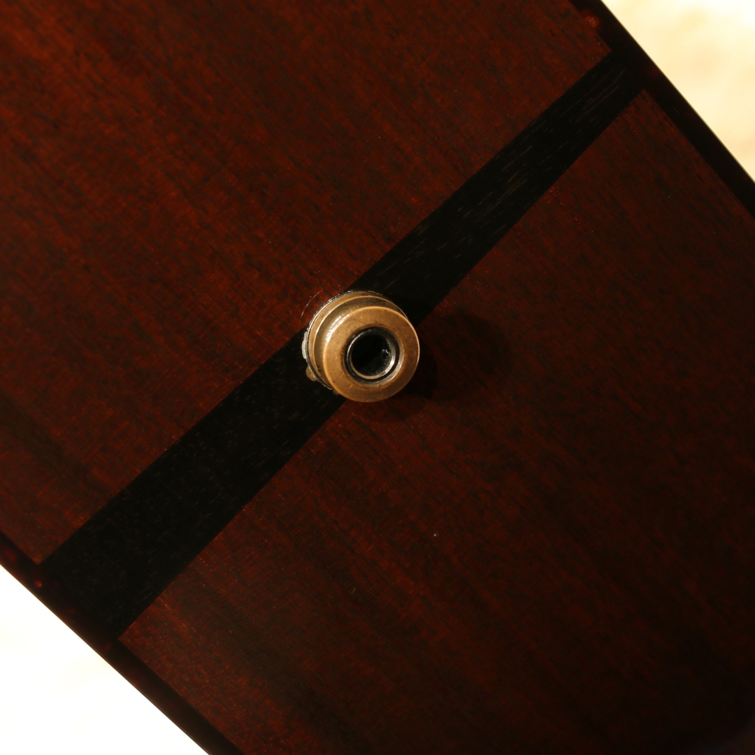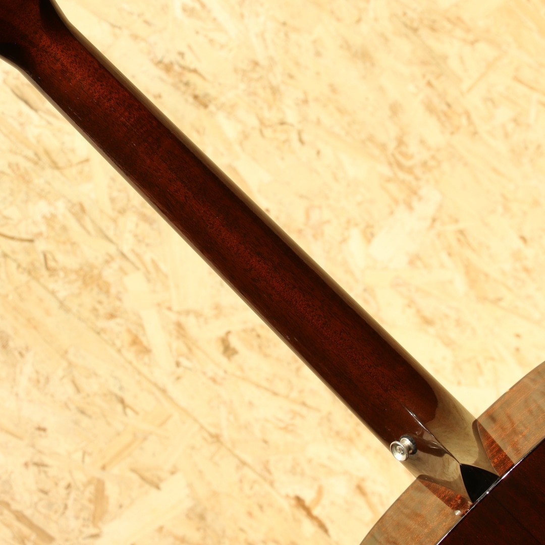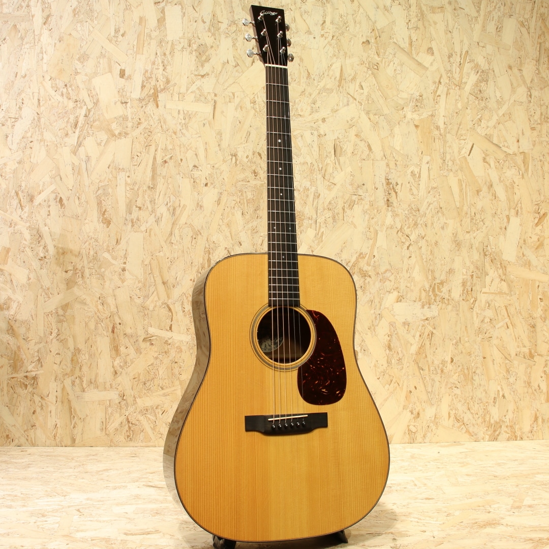 戦前トラディショナルスタイルを軸に独自のアイデンティティを確立した世界的にもっとも高い評価を得ているブランドの一つであるコリングスギター。他を凌駕したその完成度の高さ故、評価は同業製作家や一級のプロアーティスト、プレイヤーなど目が高い層に特に一目置かれた存在です。プレイヤーの憧れのブランドと言えます。本器は定番のD18スタイル、材のオプションを加えたカスタム品、2004年製のUSED品。トップに厳選されたアディロンダックスプルース、マホガニーサイド&バック、マホガニーネック、エボニー指板&ブリッジ、ウェバリー4060チューナー、ドット指板インレイ、べっ甲柄ピックガード、ベッコウセルバインディング、トップ構造はコリングス風のアレンジが加えられたアドバンスド・スキャロップド・エックスブレイシング、後付けにてL.R Baggs Dual Sourceを搭載。通常のドレッドノートは深みのサウンドが持ち味ですが、コリングスはそこに明瞭な響きとピッチ感、ボリューム感を足すようなアレンジを施して製作。音の輪郭はタイトにクリアに、ですが余韻はオープンに。音が混じり合って濁るようなことはなく非常に分離感の良い響き。レンジ感も広い為マホガニーを使用していることを忘れてしまう程のサウンドを響かせます。重苦しさが無く乾いた響き、カラッとした明るさはマホガニー由来でしょう。何よりもそのタイトな輪郭のおかげで、指板上どこを押さえても音がハッキリと出るというのはコリングスでしか体感し得ない程の特徴。指板上を上下に行き来するジャズやブルーグラスにおいて嬉しいポイントです。音量もあるためブルーグラスミュージシャンからの支持が厚いことにも頷けます。どこをとってもハイレベル、古きを押さえたニュースタンダードと言える1本です。後付けにてL.R Baggs Dual Sourceを搭載。Anthemの前身とも言えるアンダーサドルピエゾ+マイクのシステム。惜しくも現在は廃盤となっています。ボディ内に仕込む基板でモノラルアウトとステレオアウトの変更、位相を合わせるフェイズスイッチ、マイクのローカット周波数の調整などが可能です。これらの機能からマイク感を強く出すセッティングもでき、ステレオアウトで個別にEQを掛けることも出来ます。サウンドホール横のコントローラーはMaster VolとMic Volでシンプル。自由度の高いセッティングが可能、非常に優秀なシステムです。サウンドホール周りに弾きキズ、ボディトップ面ボトム箇所にはウェザーチェック、ピックガードの細かな弾きキズ、ボディトップ6弦側下部の薄い当てキズ等の使用感は見られますが、20年ほどの年月を経たことを考えるとキレイな状態をキープ。ネック周りの演奏性も整えられており、弦高調整の幅も残された状態。コリングスクオリティを存分に体感できる1本です。大胆なストロークプレイからフラットピックでのローからハイのブルーグラスやJAZZスタイルの取り回し、繊細な表現を求められるシビアなフィンガリングでの奏法まで余裕で対応できる優れたドレッドノートです。是非ご体感下さいませ。
