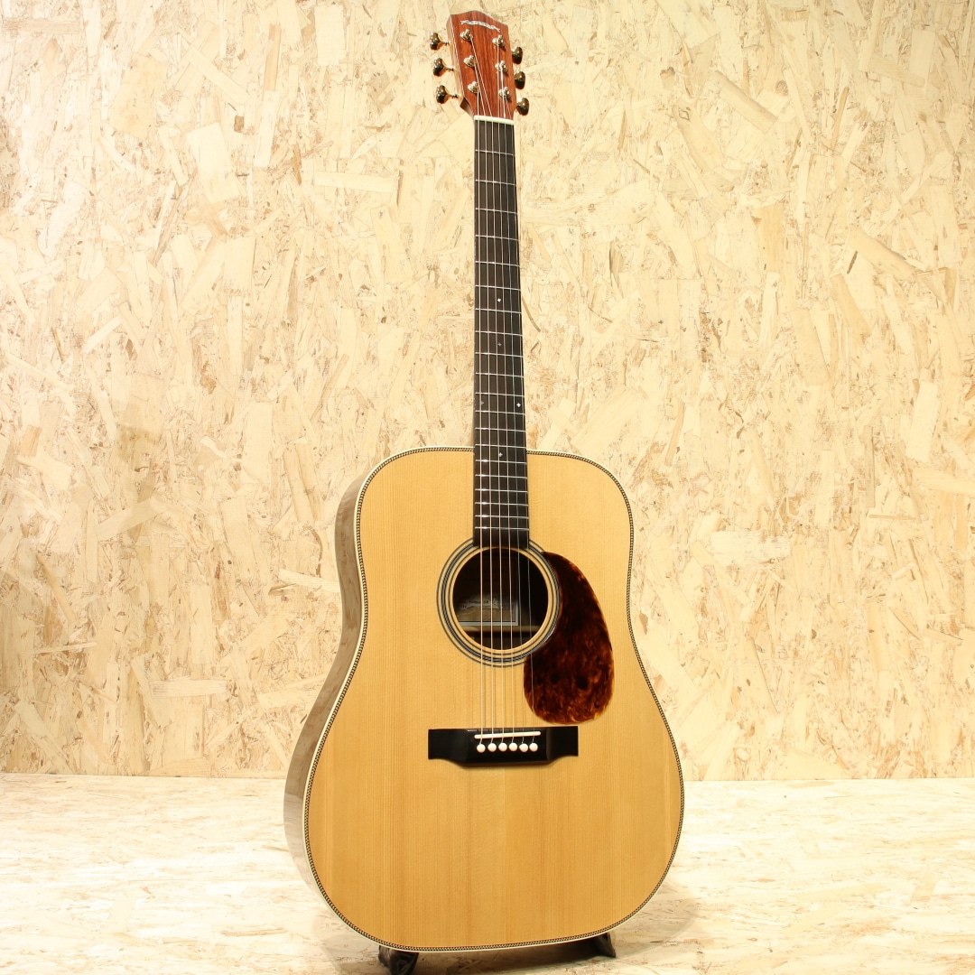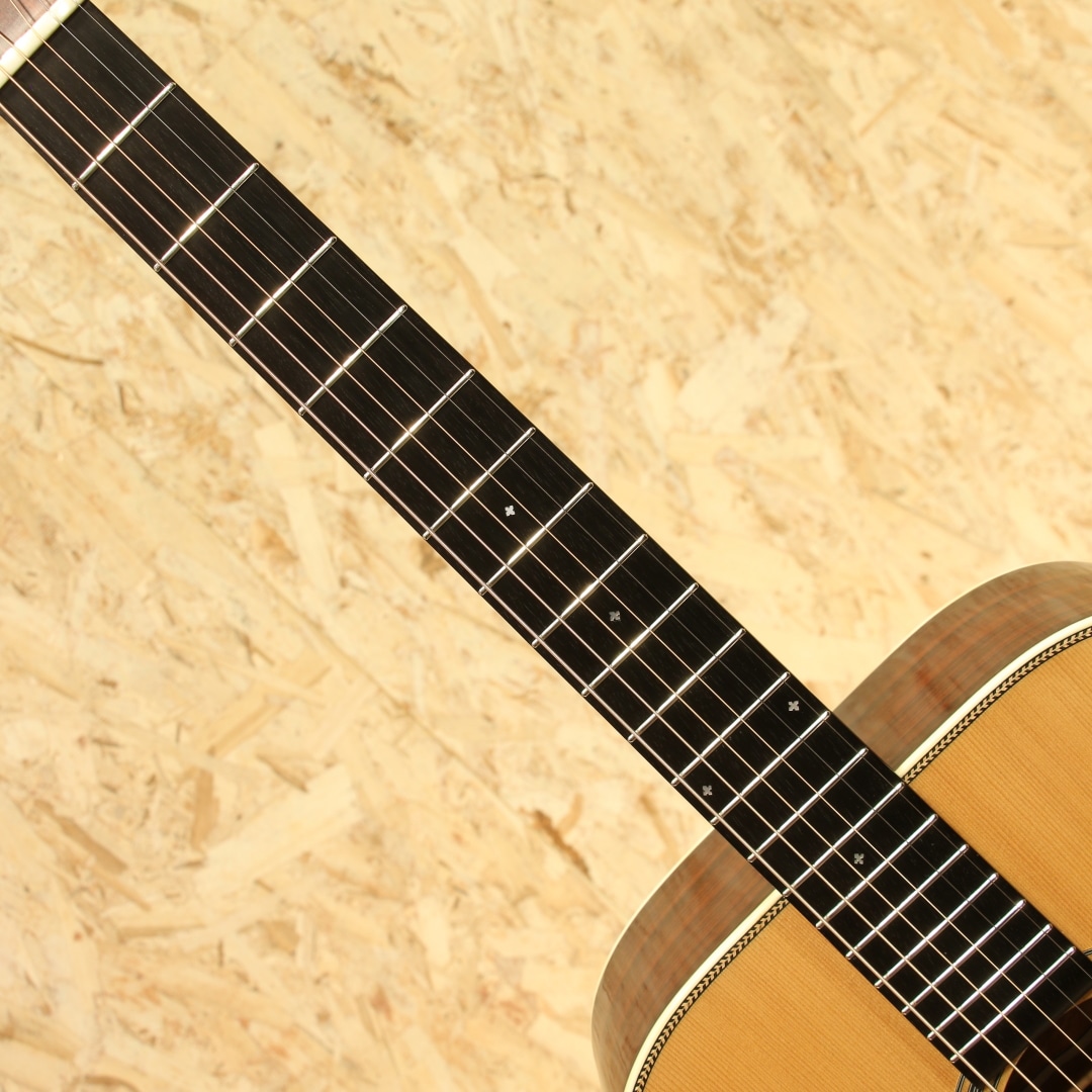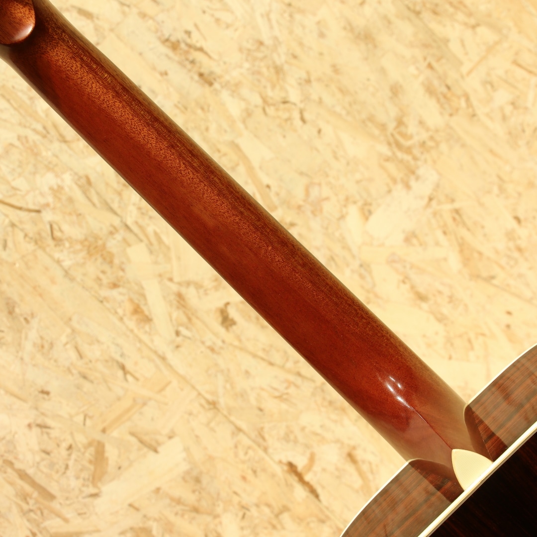 過去五十年間、世界中から選ばれたミュージシャンのためのカスタムギターを作り続けてきたアメリカの巨匠、ジョン・グレーベン氏。著名作家の中では必ず名前が挙がる、言わずと知れた名工巨匠です。本器はの2006年の作品。端正な木目のルッツスプルーストップ、インディアンローズウッドサイド&バック、マホガニーネック、エボニー指板&ブリッジ、ダイアモンドスクエア指板ポジション、ゴトー510ゴールドペグ、ベッコウ柄ピックガード、ヘリンボーントリム、アイボロイドバインディング、アバロンロゼッタ、スキャロップド・Xブレイシング。トラディショナルなDスタイルの本器。Gruhnでリペアをしていた経験があるからこそ、ヘリンボーンを備えたトラディショナルなルックスに説得力が生まれます。グレーベン氏が作るギターに共通する弦の輪郭が横の弦の音と干渉しあっているような太く甘い響き、甘いだけでなく不思議と高音が抜けていく独特の倍音感。そして優しく柔らかい、しなやかなトーン。雄大なスケール感を感じさせる深い低音が心地よいです。暗い響きには感じず、華やかなサウンドで明るく聞こえますが耳にキンと来ない優しさを含んでいます。繊細さと骨太なサウンドが同居するTheグレーベンサウンド。特段演奏スタイルを問わない響きを持ちますが、やはりフィンガースタイルでの人気が高いだけあり、繊細なタッチでの表現力、低音弦での力強い響きはつい爪弾きたくなる1本。音が溢れるような出方が気持ちよく、柔らかくメロウな曲で一際個性を感じさせてくれるでしょう。ボディサイド6弦側のボトム箇所に当てキズ、1弦側のボトム箇所に数か所の少し深めな擦れキズ、ボディバックの若干深めの擦れキズ、ピックガード上の薄い弾きキズ、ボディサイドにはケースと反応したであろう跡こそ見られますが、約20年程の年月を経過していることを考えるとキレイな状態をキープされているでしょう。ネック周りの演奏性も良し、サドルの残り、トラスロッドの残りも確保されたUSED品です。本家グレーベンの個性的な響き、他では中々体感できないトーンは沼のように心を捉える魅力を持ちます。優しい人柄を感じさせるような人間味のある響き。是非お手元でご体感下さいませ。