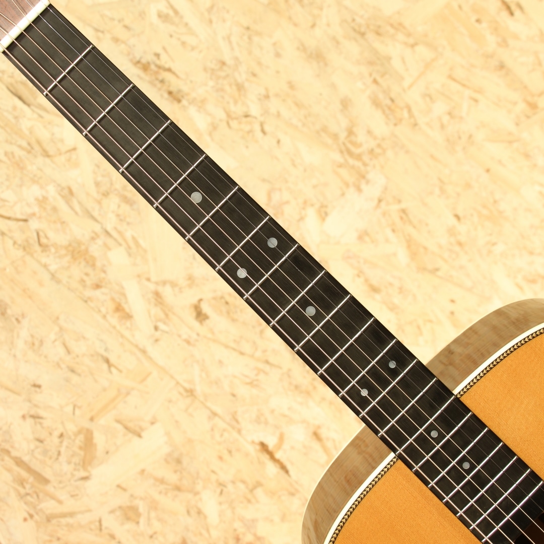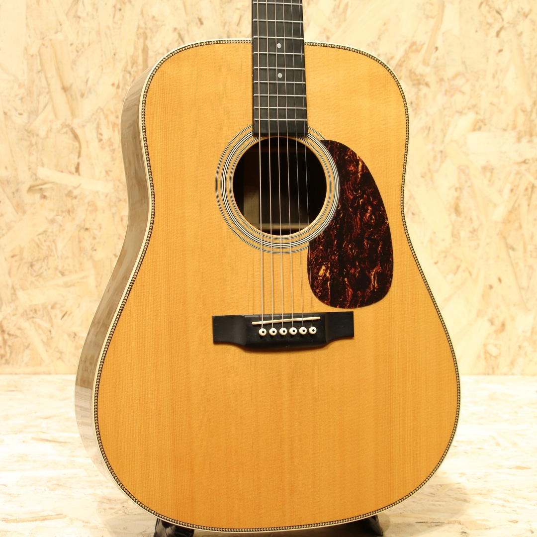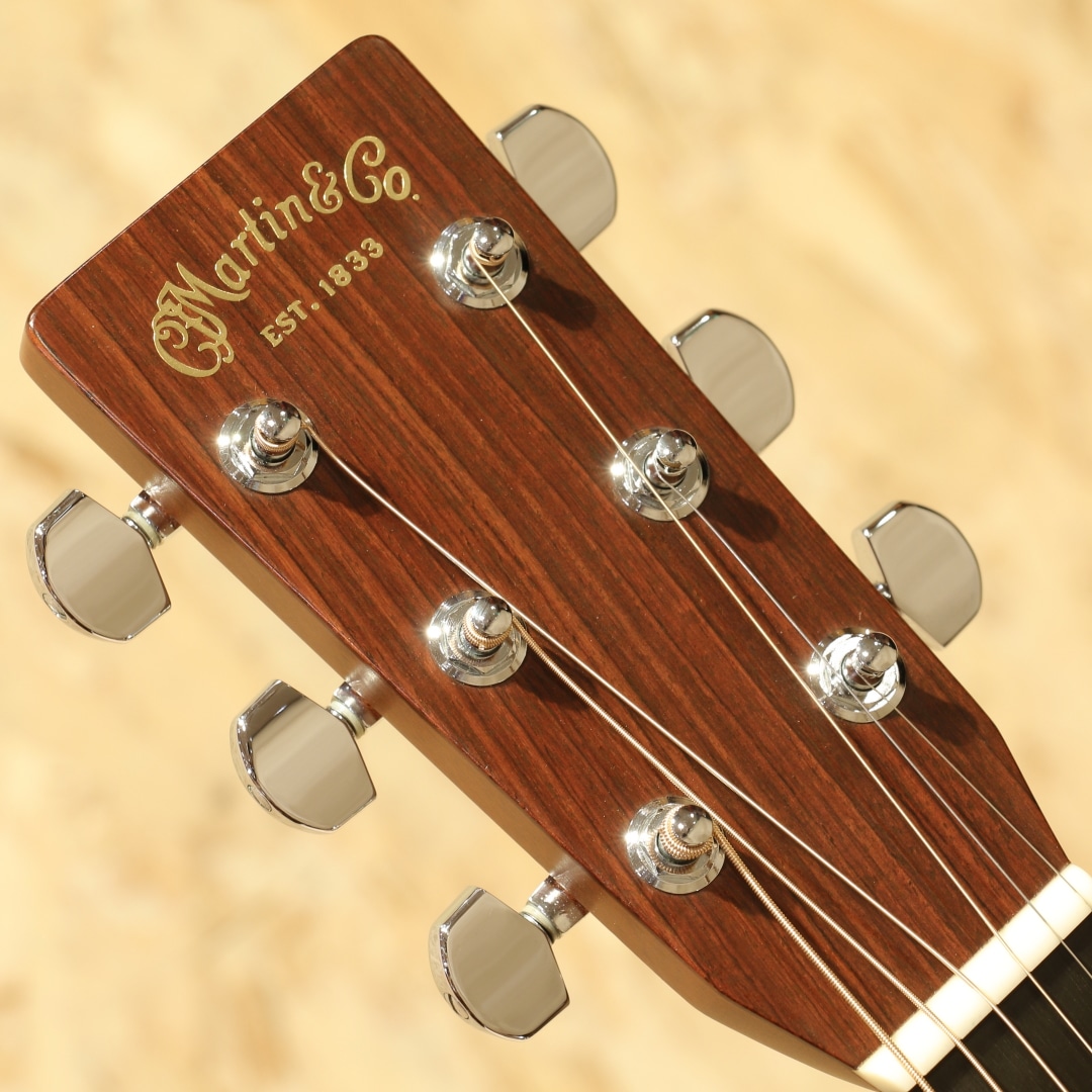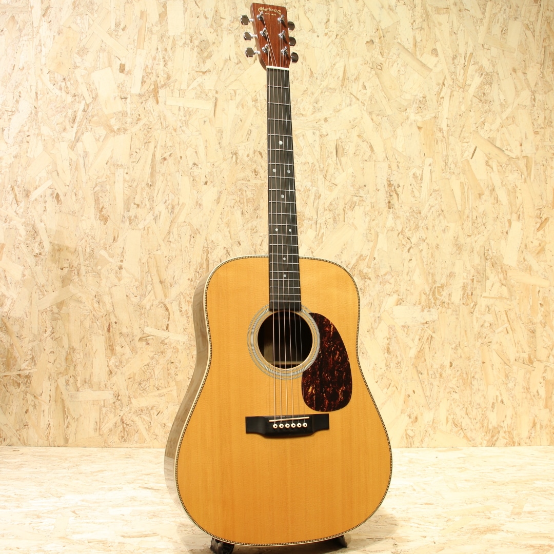 マーチンギターの中で最も有名なモデル"D-28"。現在同様の14fジョイントのドレッドモデルとして1934年に誕生してから、時を超え今もなお愛されるワールドスタンダードモデル。1944年にオリジナルスキャロップブレイシングが廃止された後、32年の時を経て現代に甦ったスキャロップブレイシング採用モデルの先駆け"HD-28"。どの時代においてもスタンダードである"D-28"を基にオールドテイストを持ったモデルとして、現在もラインナップを続けるロングセラーモデルのひとつです。本器は2000年製のUSED品。スプルーストップ、ローズウッドサイド&バック、マホガニーネック、ADJロッド、エボニー指板&ブリッジ、グローバーロトマチックペグ、ブラックピックガード、ヘリンボーントリム、ジグザグバックストリップ、スキャロップドXブレイシング。戦前期の象徴であるヘリンボーントリム、当時のD-28をベースとし、Herringbone Dreadnoughtの頭文字を取ったネーミングとして名づけられました。ナット幅は42.9mmでやや細身なCシェイプ。親指で握り込んだ演奏スタイルにも対応しやすく、手馴染みの良さにも定評があり現行品のナット幅が広いと感じられている方にはオススメのネックグリップです。当時のD-28と比較するとスキャロップブレイシングによって空気感の強い、ふくよかで華やかな響きを獲得。現行品のHD-28と比較するとブレイシングの位置が異なりフォワードではないため、芯の強く輪郭を感じやすい引き締まったサウンドが特徴です。軽く弾いてもボリューム感があり、心地よく響きます。D-28らしいパンチ感はキープされつつも、より柔軟性を高められており使用するジャンルは選びません。オールマイティに使える優秀な個体です。ボディバック面に薄いバックルキズ、ピックガード表面に極薄い弾きキズこそ見られますが、使用感は少なくキレイな状態をキープされています。ネックの演奏性も良し、ロッドはやや固いですがまだ回し幅は残っており、サドルの残りも充分で弦高調整をする余裕もあります。現行品とは異なる響きを生み出してくれるHD28。ナット幅も42.9mmで現行品に握りにくさを感じられていた方にはお試し頂きたい1本です。是非ご検討下さいませ。