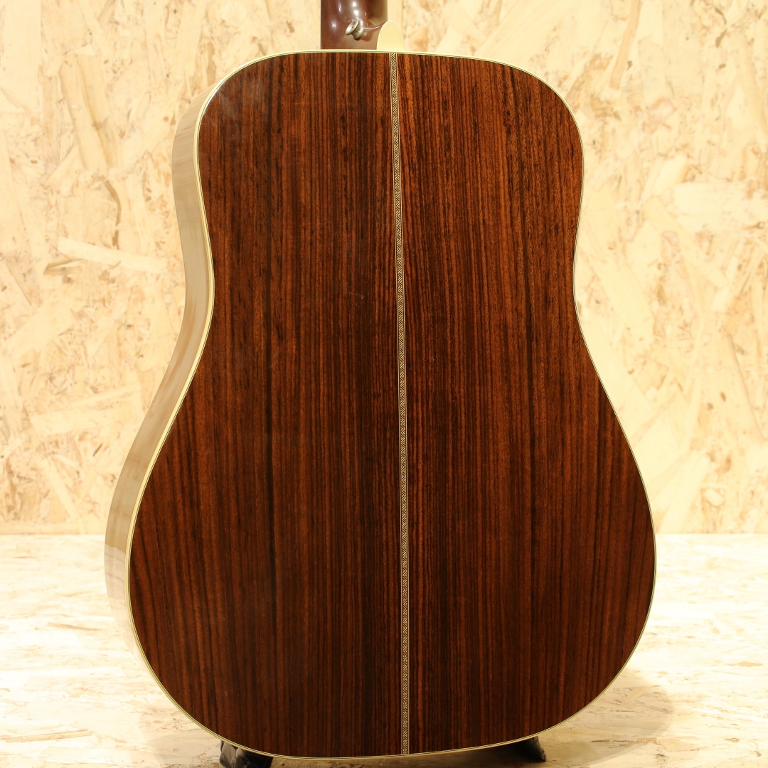マーチンギターの中で最も有名なモデル"D-28"。現在同様の14fジョイントのドレッドモデルとして1934年に誕生してから、時を超え今もなお愛されるワールドスタンダードモデル。1944年にオリジナルスキャロップブレイシングが廃止された後、32年の時を経て現代に甦ったスキャロップブレイシング採用モデルの先駆け"HD-28"。どの時代においてもスタンダードである"D-28"を基にオールドテイストを持ったモデルとして、現在もラインナップを続けるロングセラーモデルのひとつです。本器は1980年製のカスタム品。いい具合に焼けた飴色のスプルーストップ、ローズウッドサイド&バック、マホガニーネック、スクエアロッド、エボニー指板&ブリッジ、グローバーロトマチックペグ、ヘリンボーントリム、ジグザグバックストリップ、スキャロップドXブレイシング、オリジナルナット。指板ポジションがドットからスノウフレークスへカスタム、ピックガードは後年にブラックカラーのモノへ交換されています。戦前期の象徴であるヘリンボーントリム、当時のD-28をベースとし、Herringborn Dreadnoughtの頭文字を取ったネーミング。当時のD-28と比較するとスキャロップブレイシングによって空気感の強い、ふくよかな響きを獲得。現行品のHD-28と比較するとブレイシングの位置が異なりフォワードではないため、芯の強く輪郭を感じやすい締まったサウンドが特徴です。70'sらしい重厚かつ基音の太いトーン、程よく含まれる空気感を纏い、ぼやけずに軽くなり過ぎず、ふくよかなサウンドをアウトプット。やや甘く線の太い音色はこの時期を象徴といえます。もちろんニッパチを感じる整ったサウンドバランスや癖のない扱いやすさも健在です。ナット幅は42.9mmでやや細身な緩やかなVシェイプ。親指で握り込んだ演奏スタイルにも対応しやすく、手馴染みの良さにも定評があり現行品のナット幅が広いと感じられている方には一度お試し頂いたいグリップです。後付けにてL.R Baggs Anthemピックアップを搭載。音の芯を捉えるアンダーサドルピエゾ、ボディの空気感と煌びやかさを拾えるマイクの2本撮りが出来るシステム。謂わばレコーディングにも近い形式でピックアップしミックス、出力が出来ます。あらゆるミュージシャンに愛用されてきた非常に優秀な機材です。ブリッジ上部はやや削られていますが、その分サドルの出し代を確保されており、弦高は現代的な高さに整えられています。塗装表面が曇ったようになるのはこの当時の塗装であることの証拠です。ボディトップ面下部に細かな当てキズが数か所、やや大きめの当て擦りキズが2カ所、ネック裏に薄い当てキズが数か所見られますが、その点を除けば全体を通しても使用感は大きくなくキレイなコンディションをキープされている個体。ボディ表面に薄い擦れキズが見られる程で40年近くの経年を感じさせません。上記の通り弾きやすいアクションとされ、サドルの削り代も若干残した良好な演奏性。一味違ったカスタム品、70'sサウンドをお探しの方はもちろん、これから古き良きサウンドをお求めの方は是非お試しください。