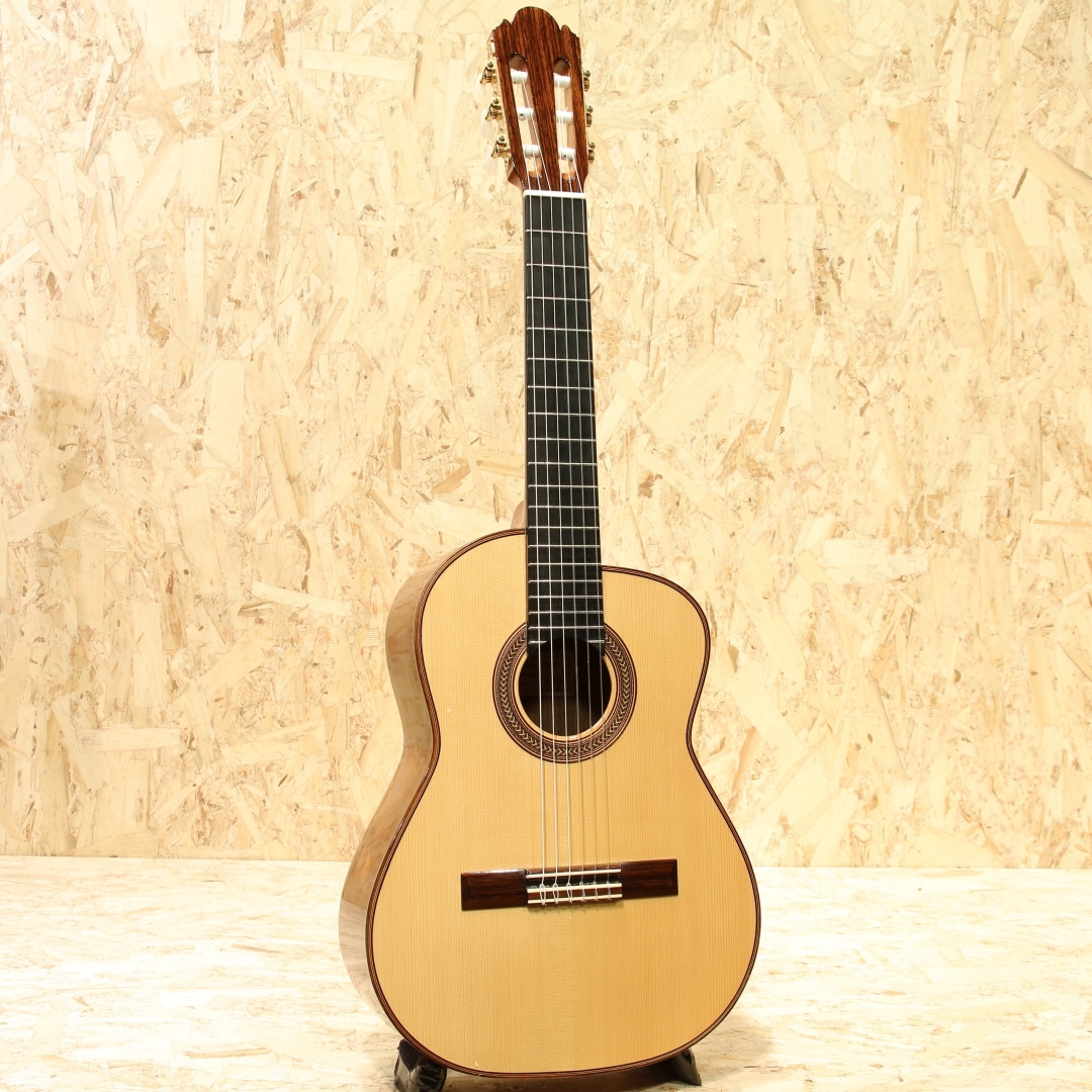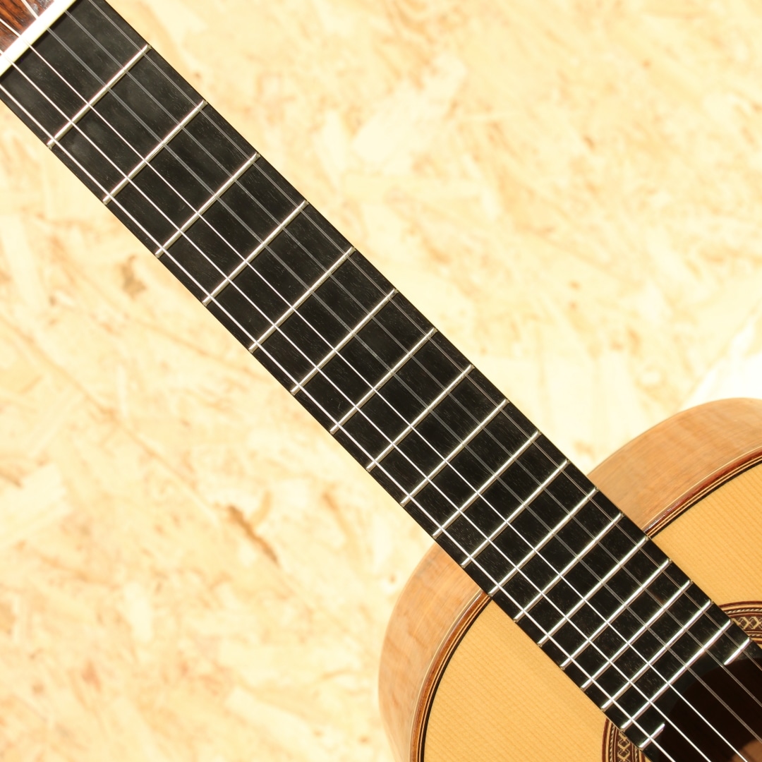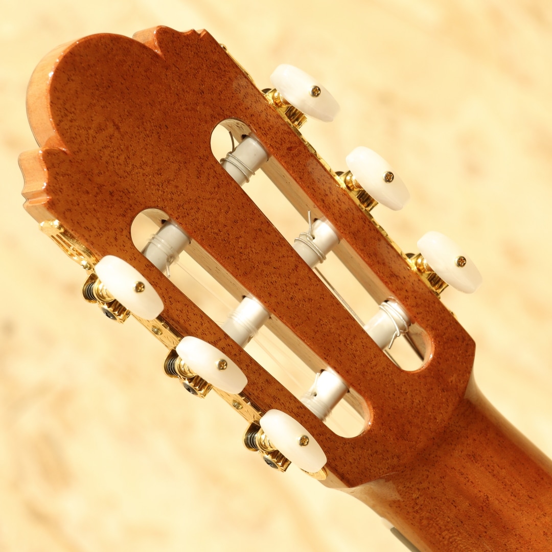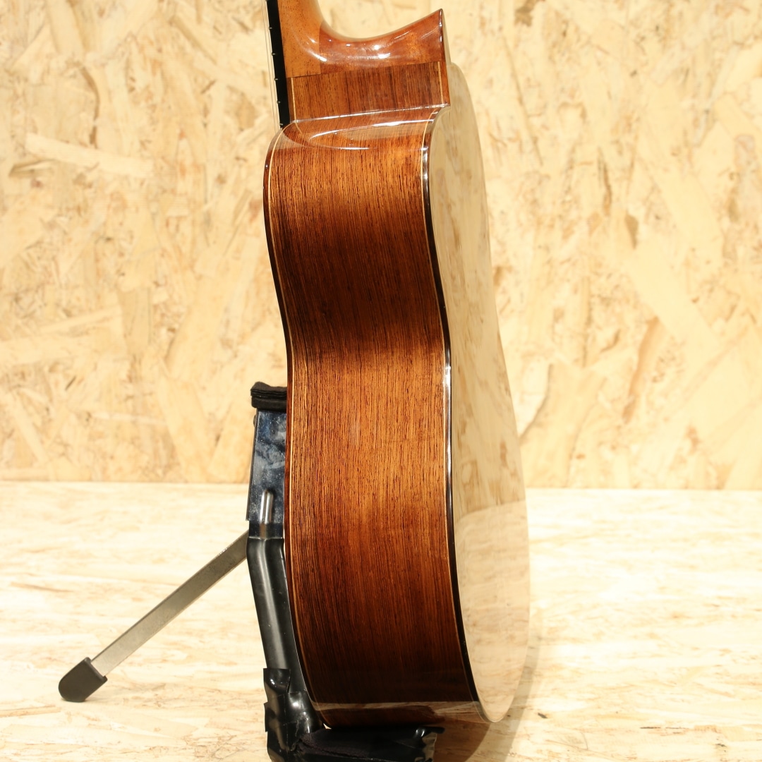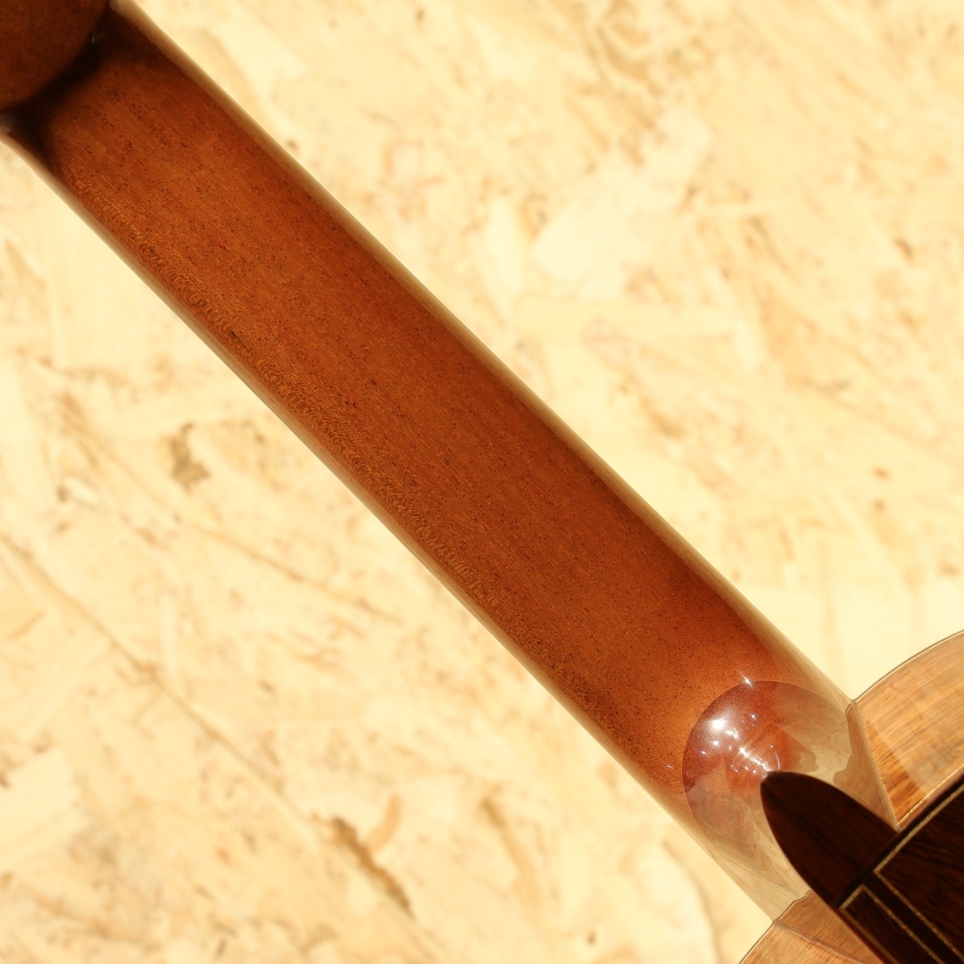 バイオリン、ギターメーカーとして有名な"茶位工房"。”茶位幸信”氏は1955年より工房を開き、2011年に亡くなられるまで数多くの作品を製作していました。氏の没後は息子の”茶位幸弘”氏が工房を引き継いでいます。本器はアルトギターで製作された”No:30”。2014年製USED品です。スプルーストップ、ローズウッドサイド&バック、マホガニーネック、エボニー指板、ローズウッドブリッジ、オリジナルモザイクロゼッタ、ローズウッドバインディング、カッタウェイ搭載。アルトギターは中々見る機会が少ない楽器ではありますが、通常のギターよりも高いチューニングで演奏する楽器となります。チューニングは6弦から順にB,E,A,D,F#,Bとなります。通常のチューニングよりは5度高く、カポ7に相当します。カッタウェイも搭載されており、ハイポジションまで悠々と演奏しやすい仕様となっています。小型で弦長が短い分音量もこじんまりとしやすいところを、弦を強く張ることでテンションを稼いでいます。その分音量も出しやすく、ハリのあるサウンドへ。芯の残った実直な響きと開放的な音色が特徴です。音程が高い分深い響きを得ることは出来ませんが、軽快で弾け感の心地よい音色。アンサンブルの中で高音担当となることもある楽器、このスタイルでしか出し得ない独特の響きがあります。もちろん一人で弾くにも良し。日本の製作家が創る可愛らしいギターです。ボディトップ面6弦側くびれ付近に当てキズが見られ、全体的に極薄い擦れキズが見られるモノの使用感は比較的少なく、キレイなコンディションをキープされています。ネックの状態も良く演奏性良好。扱いやすさをキープされた秀逸な1本です。木の暖かみを感じられるようなシンプルで落ち着いたデザイン性も魅力。良質な国産手工モノのアルトギター。お探しだった方は是非お早めにどうぞ。