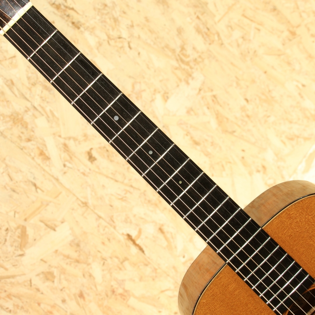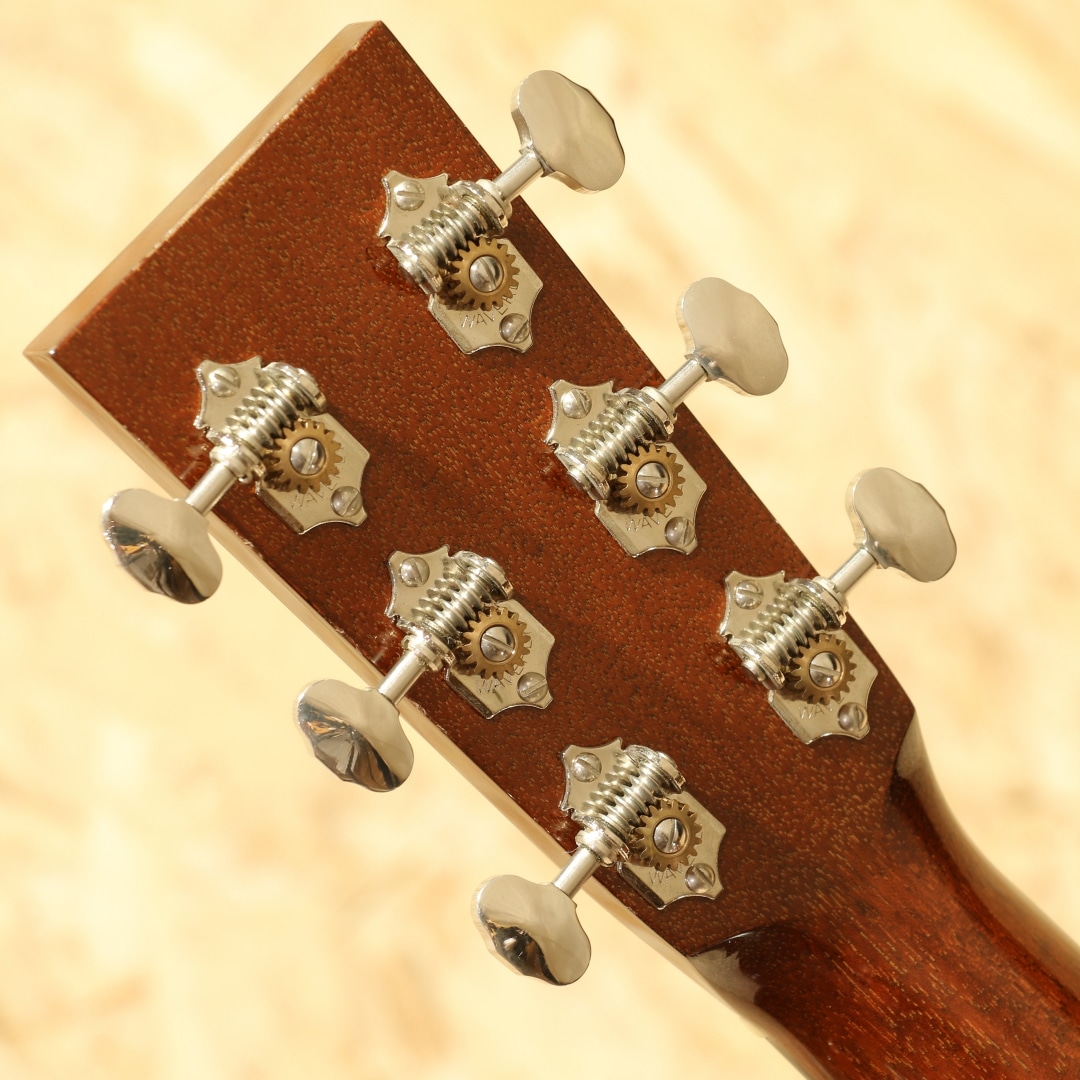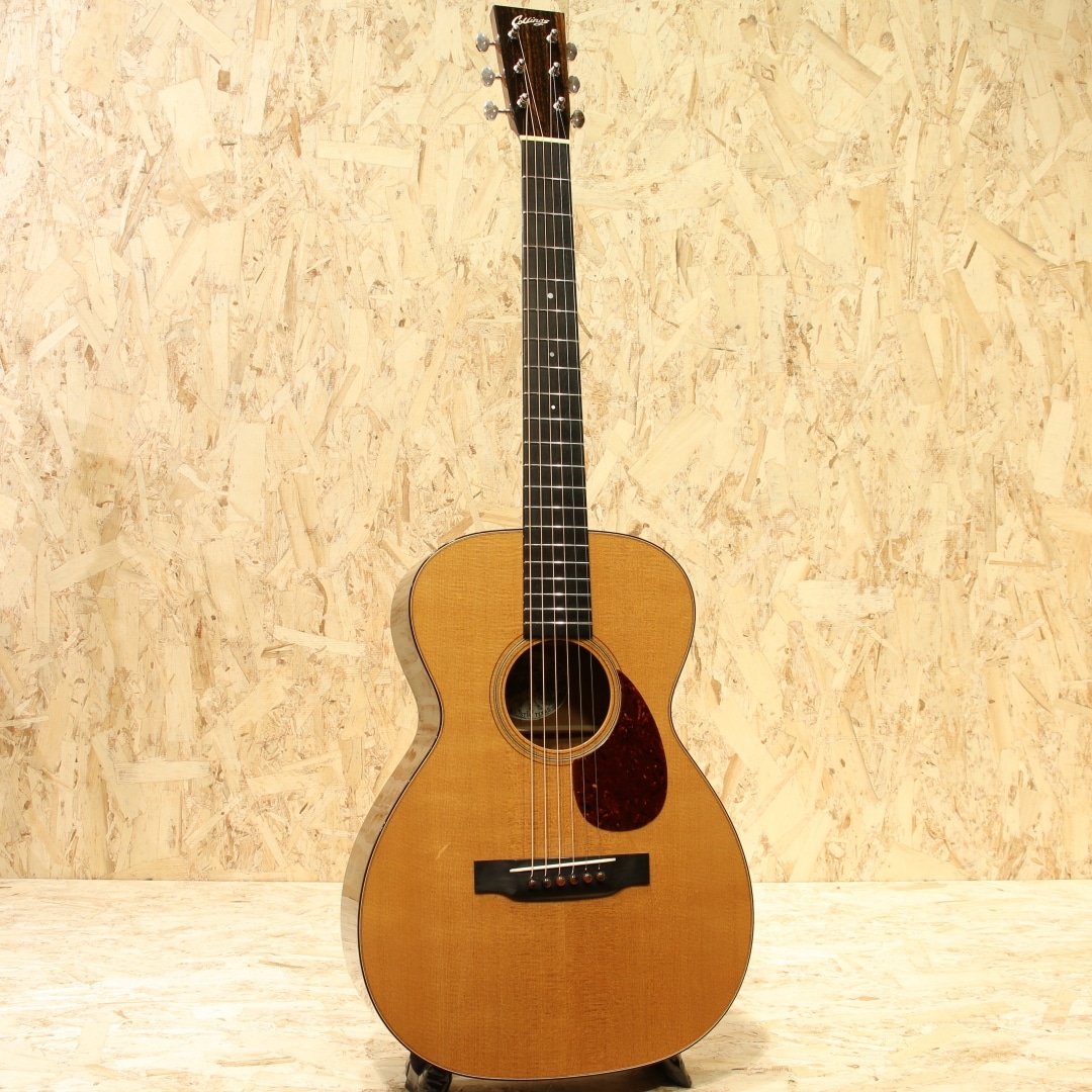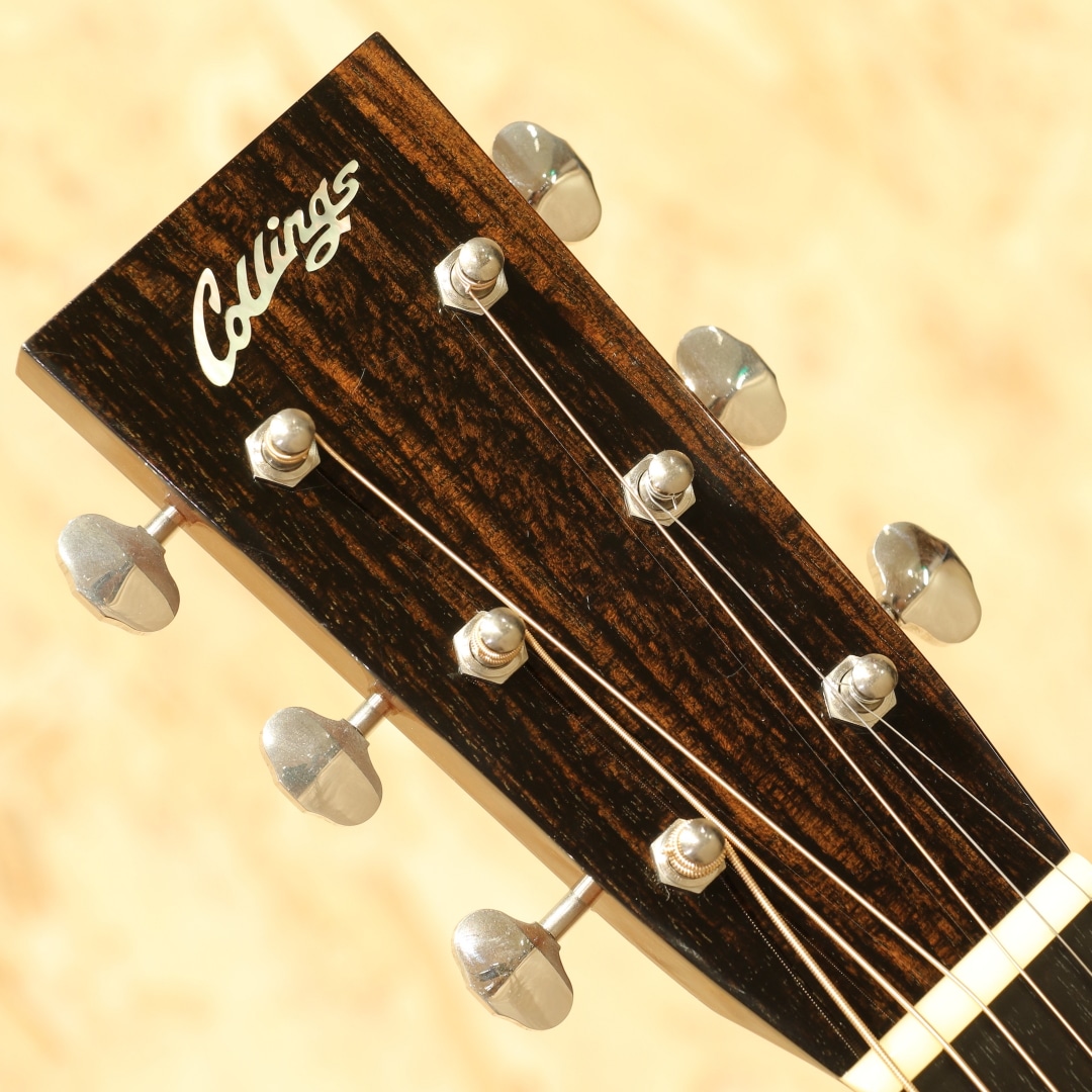 世界的にもっとも高い評価を得ているブランドの一つであるコリングスギターの新しいアイデアとしてリリースされたラインナップ"トラディショナル「T」シリーズ"。ビルのルーツに遡りコリングス・サウンドに更なるトーンバリエーションが加わったモデルとなっていて、1930年代のビンテージギターの特徴でもある強力な基音のレスポンスを備えたギターに仕上がっています。本器はOサイズ、スタイル18を基にした"O1T”。2018年製のUSED品です。シトカスプルーストップ、ホンジュラスマホガニーサイド&バック、ホンデュラスマホガニーネック、エボニー指板&ブリッジ、ウェバリーペグ、ナット幅44.45mm、MOPドット指板ポジション、べっ甲柄セルロイドピックガード、べっ甲柄バインディング、タンブレースを短縮した戦前スタイルのスキャロップドXブレイシング、極薄のニトロセルロースラッカーフィニッシュ。トラディショナルシリーズならではの指板角を丸めたネックシェイプは長年弾き続けた愛器のような安定感があり、握った瞬間にしっくり来る感覚を覚えます。組み込みには動物性接着剤を使用し、極薄のニトロセルロースラッカーフィニッシュが用いられたこだわりの造り。これによって、よりダイレクトな手応えとレスポンス、ダイナミックなサウンドを生み出しています。材は厚みから重量に至るまで調整され、より丸さと滑らかさを持ったトーンを出力。コリングス特有の輪郭感は残しながらも基音の太さや線の太さを実感できるサウンドとなっています。音と音とには確かな間隔があり、サウンドに立体感を覚えます。強弱タッチがそのままに飛び出る表現力の高さにも驚きますが、ハイポジションに至るまでコシと粘りのあるサスティーンも流石コリングス。高音域の抜けがフィーチャーされがちな小ぶりシェイプですが、豊かな中音域とサイズを超えたボリューム感が気持ちよく、OOでも充分かもと感じさせてくれます。ショートスケールながら絶妙なテンション感を持っているので、ピックストロークでもフィンガーピックでも幅広いスタイルに対応できる高ポテンシャル。ブリッジ6弦側の下やボディトップ6弦側ショルダー箇所に瞬間接着剤が付いたような跡、ボディバックやボディトップ6弦側ショルダーに光にかざすと見える程度の薄い当てキズ、ボディサイド1弦側ボトムに少し見え擦れキズ等の使用感は見られますが、全体を通してキレイな状態をキープされています。ネック周りの演奏性も非常に良いままに保たれており、この辺りは流石のコリングスでしょう。サドルの上下幅もまだ残されており、これからも使っていける1本です。量産メーカーとは生産スタイルも一線を画すスタイルを貫くコリングスならではのハイクオリティな逸品。ぜひそのお手元でご体感ください。