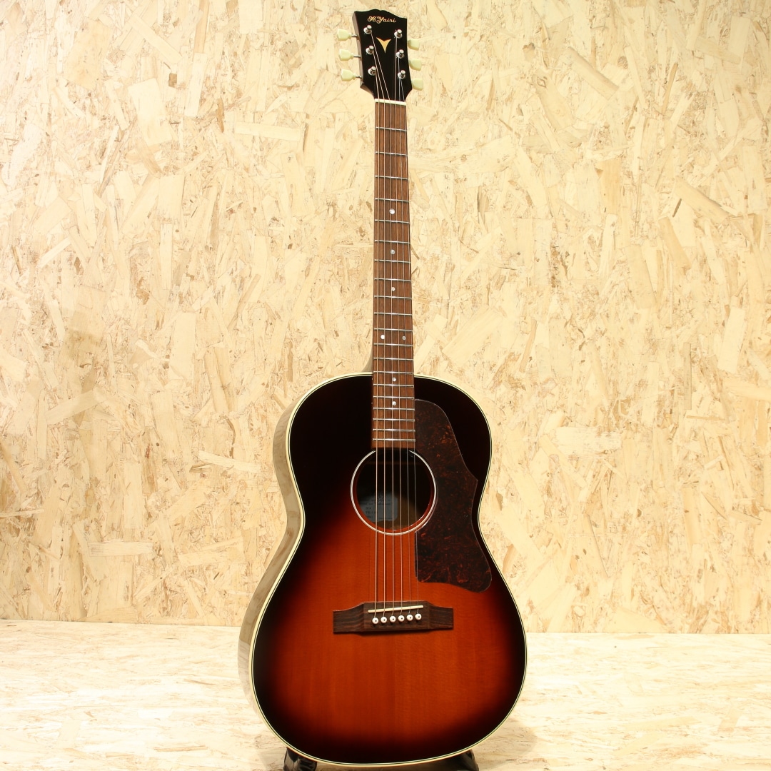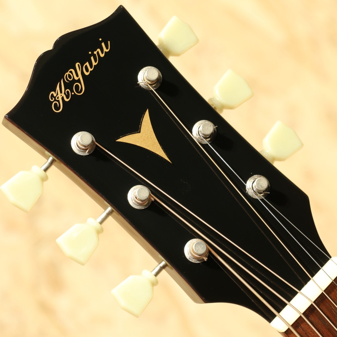 岐阜県の工房にて手作りにこだわり製造を続けるヤイリギター。世代を超えてずっと愛され続けるギター、年月を重ねても色あせないデザイン、使い込むほどに深みが増す音色をコンセプトとして現在でも約30名程の体制で1日20本程のペースで製造されています。海外の著名アーティストを始め、国内プロアーティストからも大きな支持を集めているブランドです。本器はカタログ外のモデル”YSL-1”。2014年製USED品。スプルース単板トップ、マホガニーサイド&バック、マホガニーネック、ローズウッド指板&ブリッジ、クルーソンタイプペグ、パール指板ドット、サンバーストカラー。ギブソンLG-2をイメージしたルックス。スペックとしては同ブランドのG1-Fが近しいですが、ピックガードやペグ等を変更しイメージを近づけたモデルとなります。本器は小ぶりなLGに近いサイズで製作が行われておりコンパクト、抱え易さに特徴を持つ1本。ブルースマンにも好まれそうなスペック、サンバーストの風合いも渋さを殊更に感じさせます。若干V気味のネックシェイプは握り応えがあり、強度的にもしっかりとした印象を受けられます。小型故にレンジ感は狭めなものの、暖かみを感じさせるトーンはヤイリギターならでは。全体的に中音域に音が集まった響きをしており、マホガニー材特有の乾いたトーンでジャキジャキとブライトに響いてくれます。立ち上がりの速さは小型のギターの特権。カッティングやフィンガースタイル、細やかなフレージングへの対応力も併せ持ちます。扱いやすく抱えやすい1本。ピックガード表面にはフィルムが残されており、そのフィルム上には薄い弾きキズが見られます。全体を通しても極表面的な擦れキズが僅か見られる程で非常に使用感の少ない個体。演奏性良好、サドルの高さにも余裕がある為弦高調整をする幅も残されています。これからも使えるスモールサイズのギター。国産のギターは製作した工場や工房へ送っての修理を行いやすいのも魅力の一つです。特にヤイリギターはアフターフォローが充実していることも人気の一つ。国産ならではの安心感、長く使えるポテンシャルを持ったリーズナブルな1本です。お手元に一ついかがでしょう。